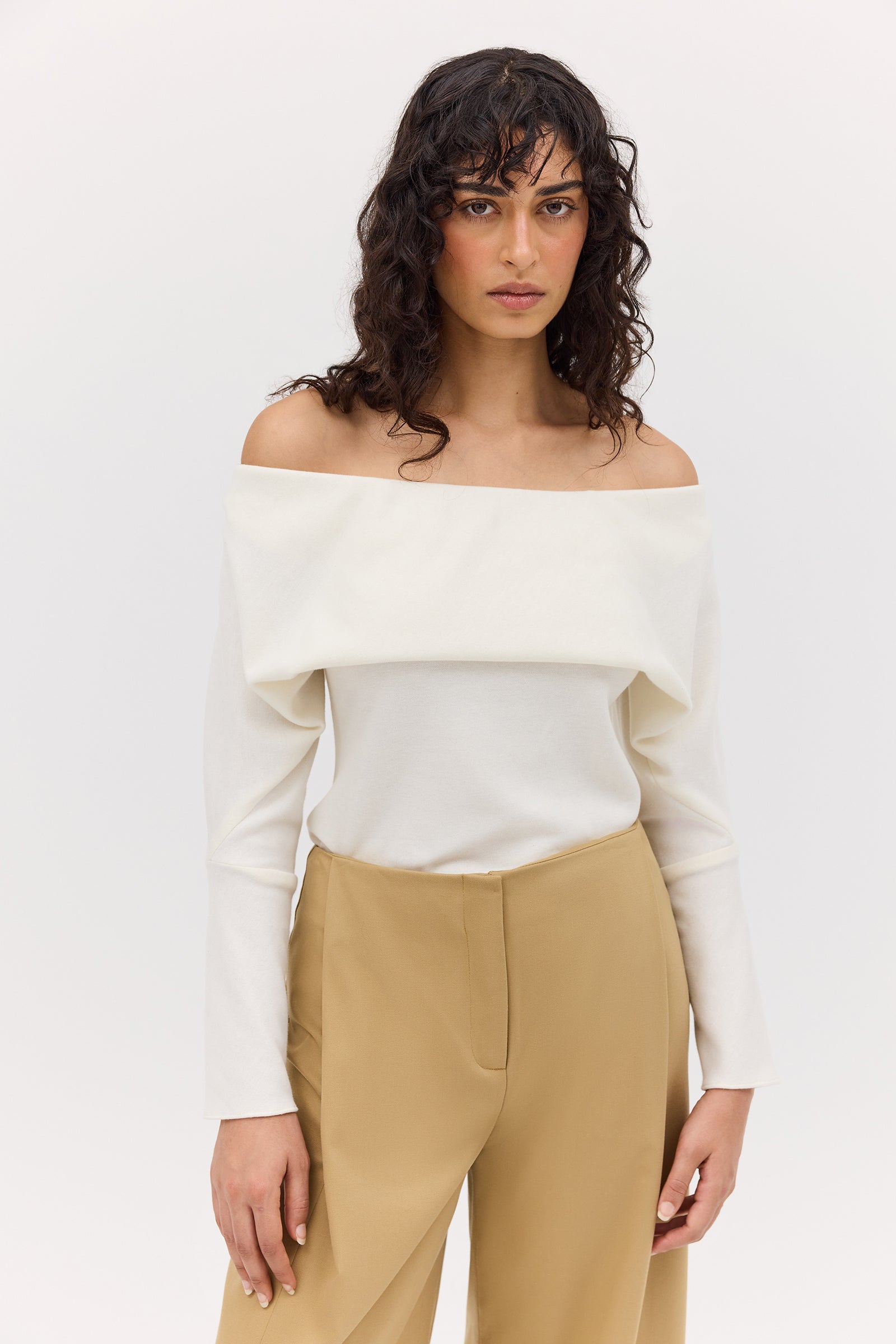 Our best-selling Bijou Top returns, reimagined for a new season. An off-shoulder top, cascading into a dropped sleeve, finishing in a fitted sleeve. It is a long style with a zipper fastening at the back, designed to sit on the hip so it can be tucked in or worn out. Crafted from a super-soft Wool jersey fabrication, designed with comfort and ease of movement top of mind.