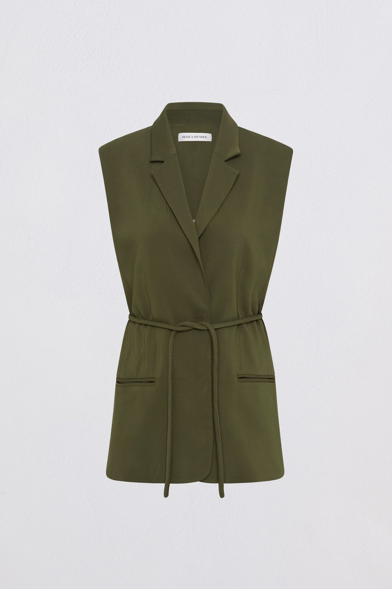 Unrestricted tailoring for modern dressing. The Shifting Vest returns in a refined olive crepe suiting, inspired by Bianca Spender’s best-selling Shifting Jacket. Designed with a softly structured silhouette and an adjustable drawstring waist that nods to utility, it balances architectural shape with effortless wearability. The olive tone brings a fresh neutrality to the wardrobe - versatile, grounding, and endlessly wearable. Style it layered over relaxed separates or pair with the matching Rafael Skirt for a tonal statement in modern tailoring.