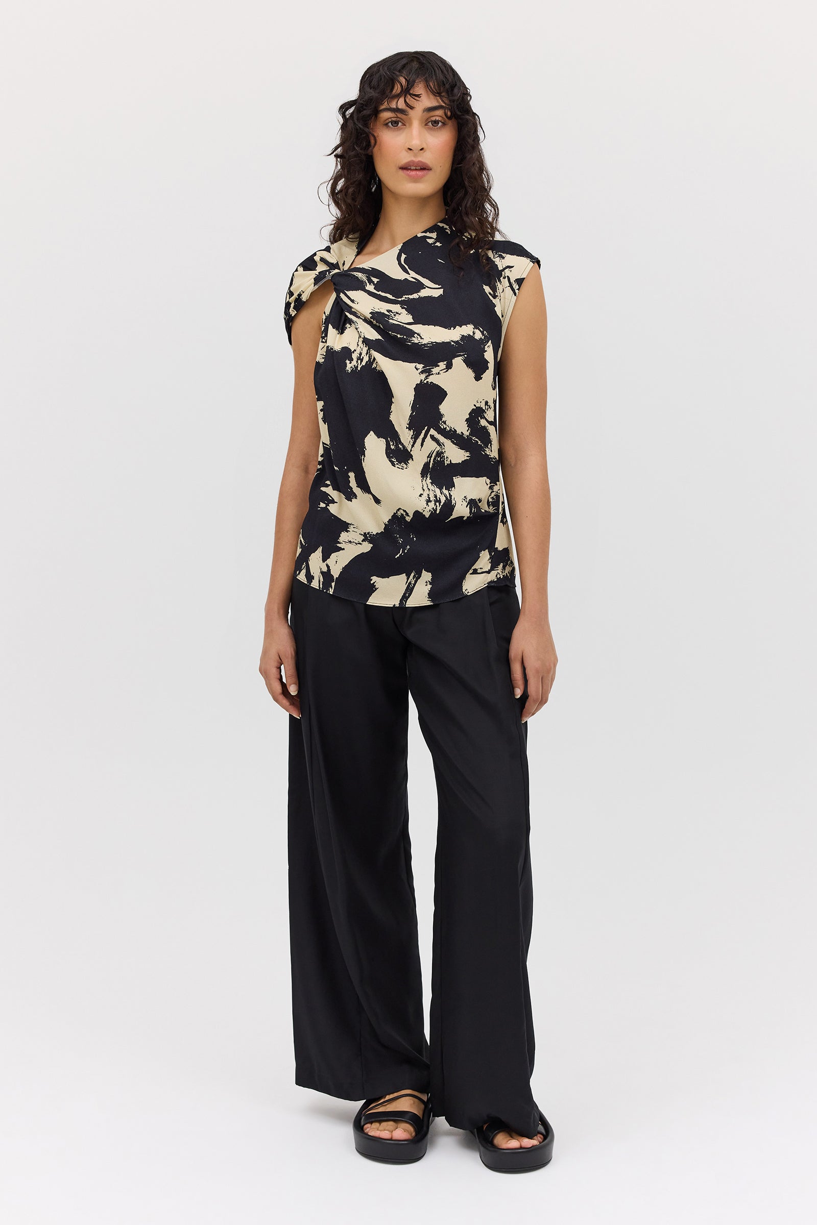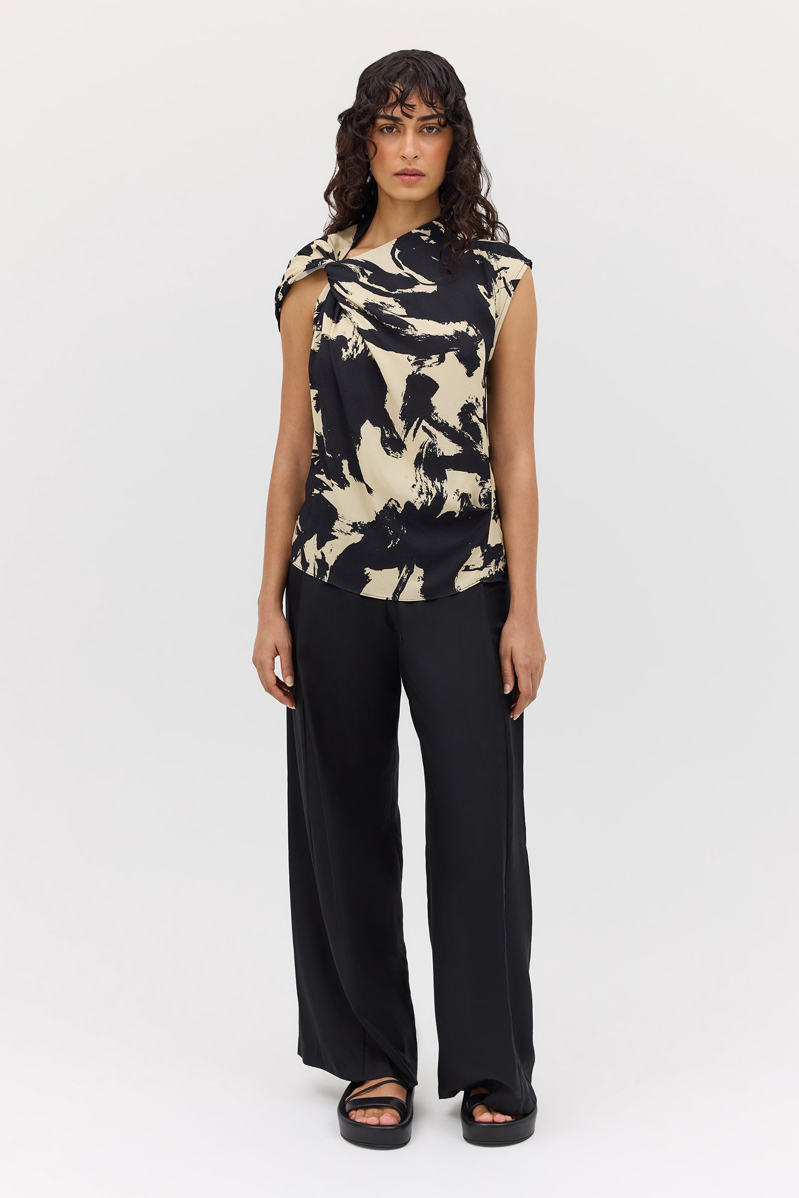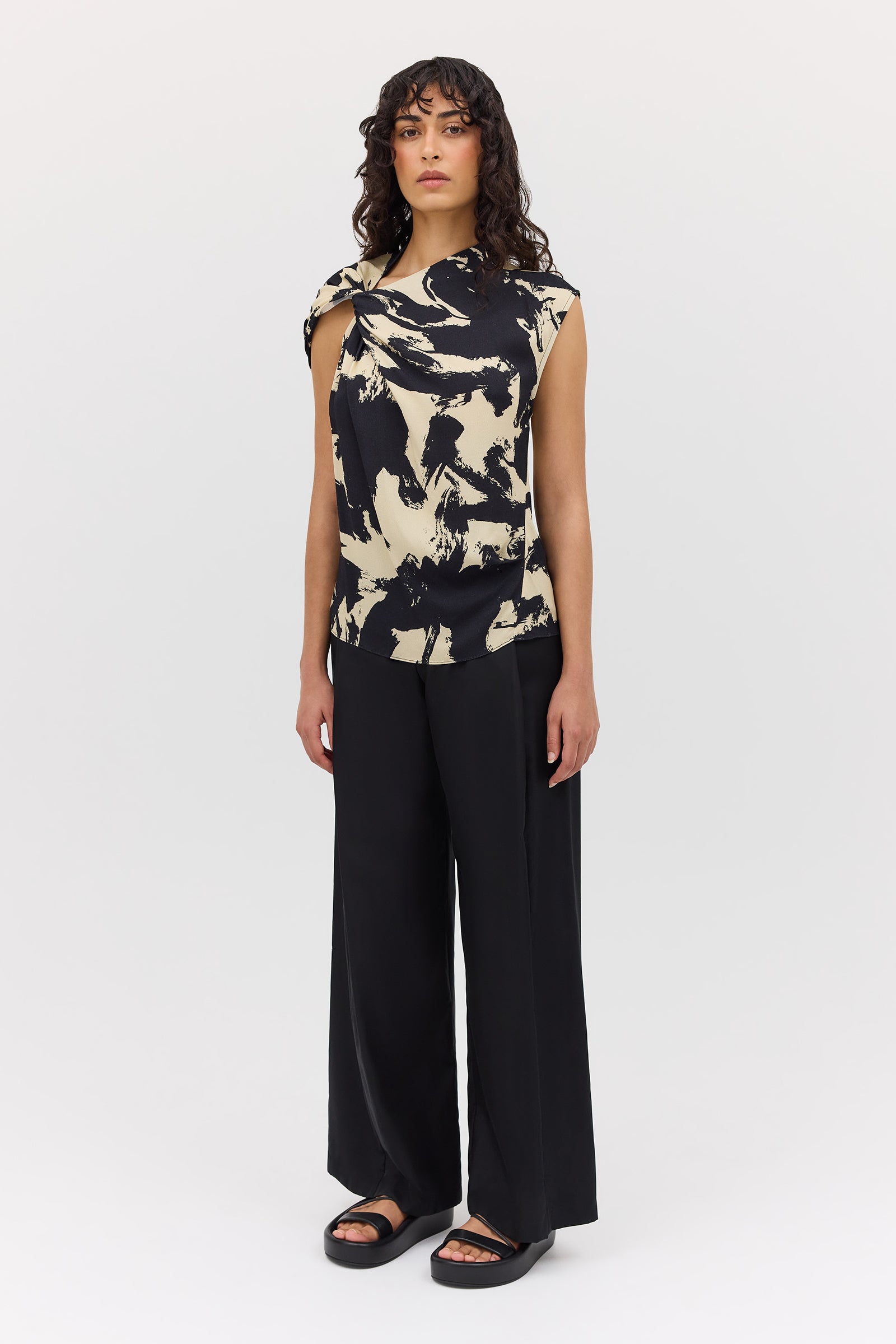 A signature silhouette returns- reimagined for the season in the Black Bloom Crepe Yang Top. One of our most beloved styles, the Yang Top is known for its sculptural drape and asymmetrical neckline, now refreshed in a new floral print that brings modern romanticism into focus.