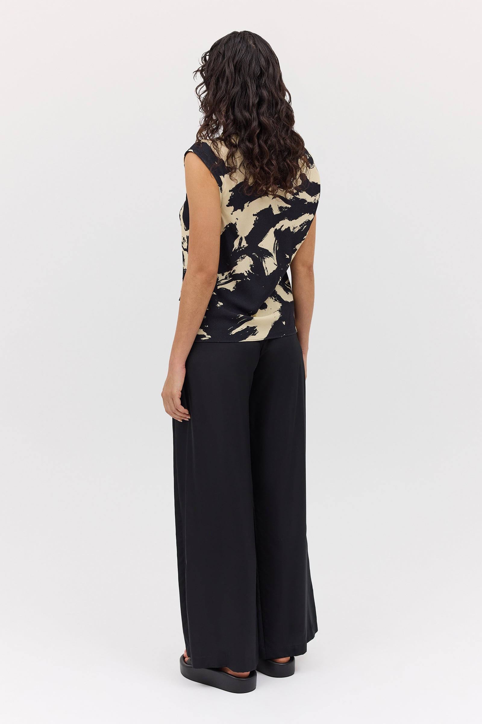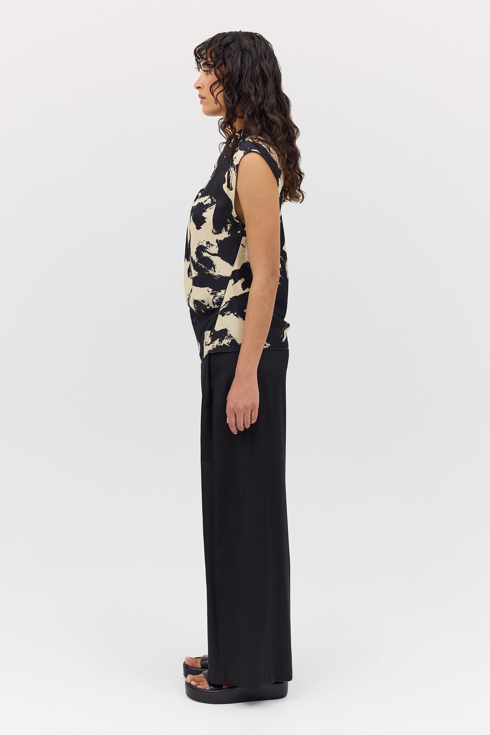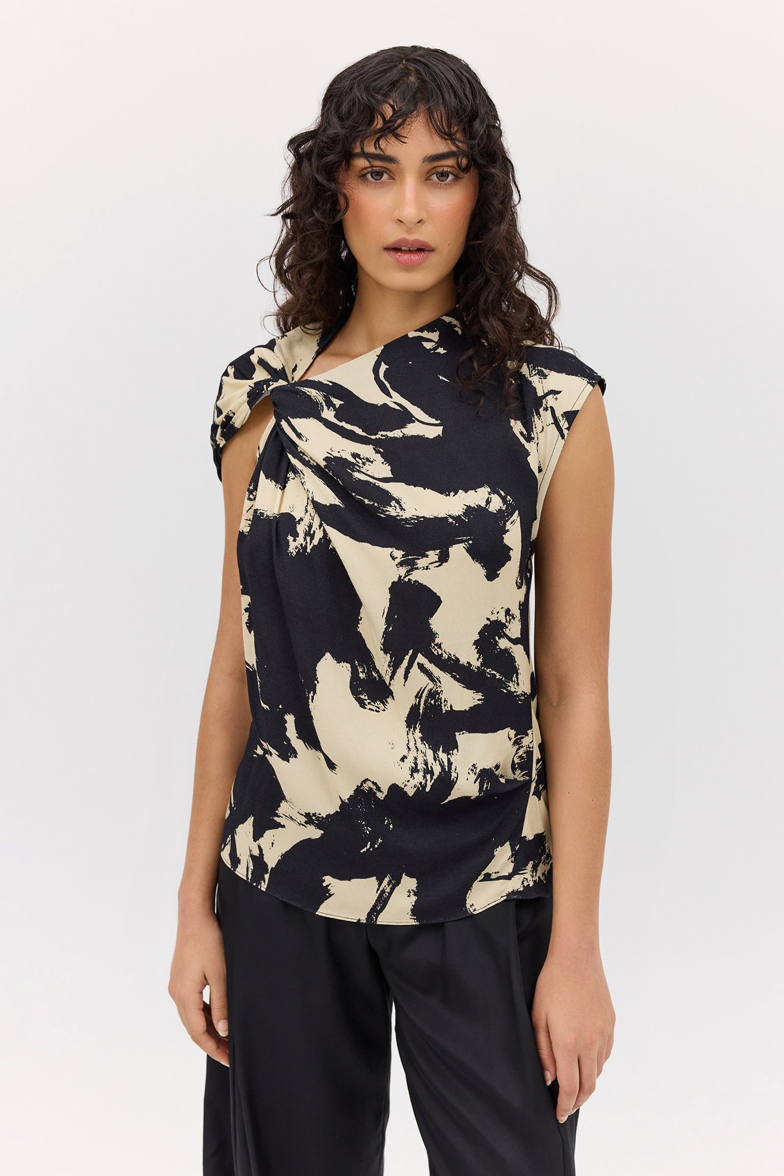 Crafted in soft crepe, the top curves gently across the body, folding and wrapping with quiet precision. The custom, in-house black bloom print evokes painterly movement, lending depth and dimension to the clean lines of the cut. A versatile foundation for both tailoring and fluid skirts, this piece distills the brand’s enduring codes—ease, elegance, and expressive form.