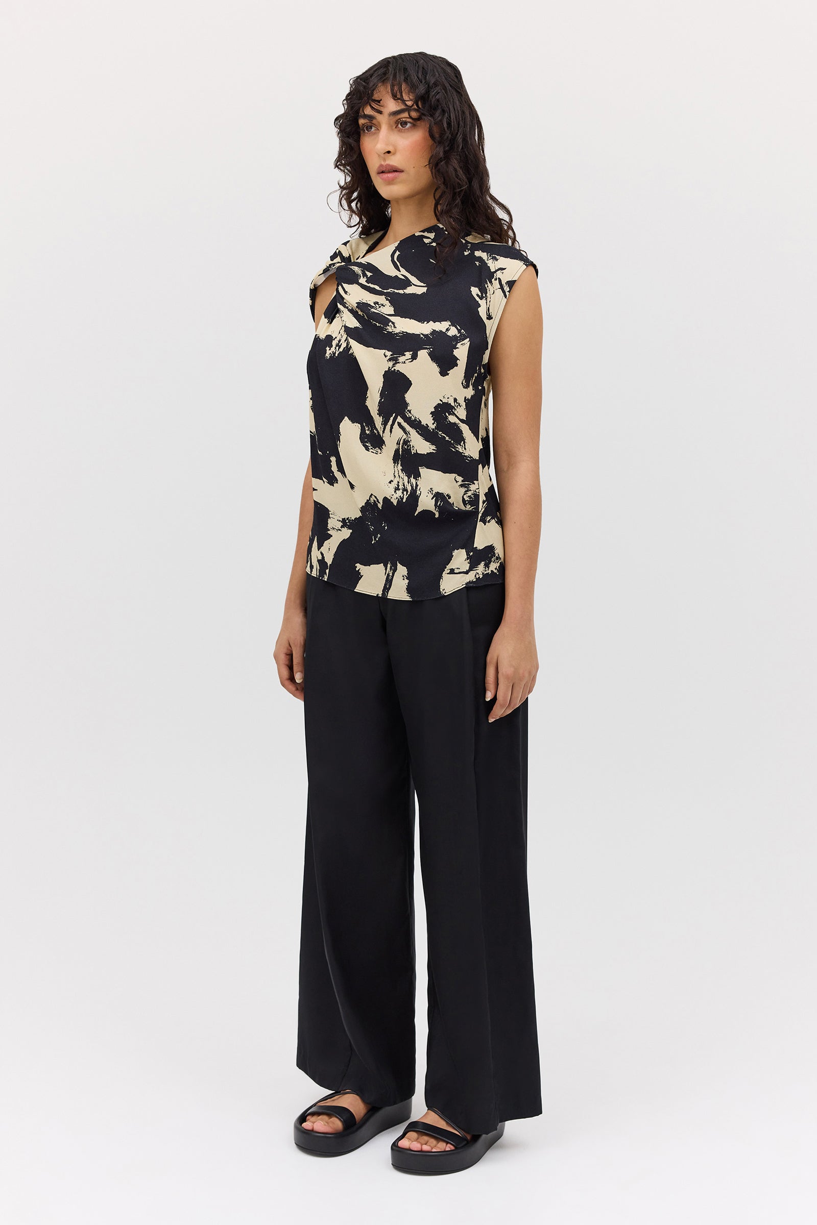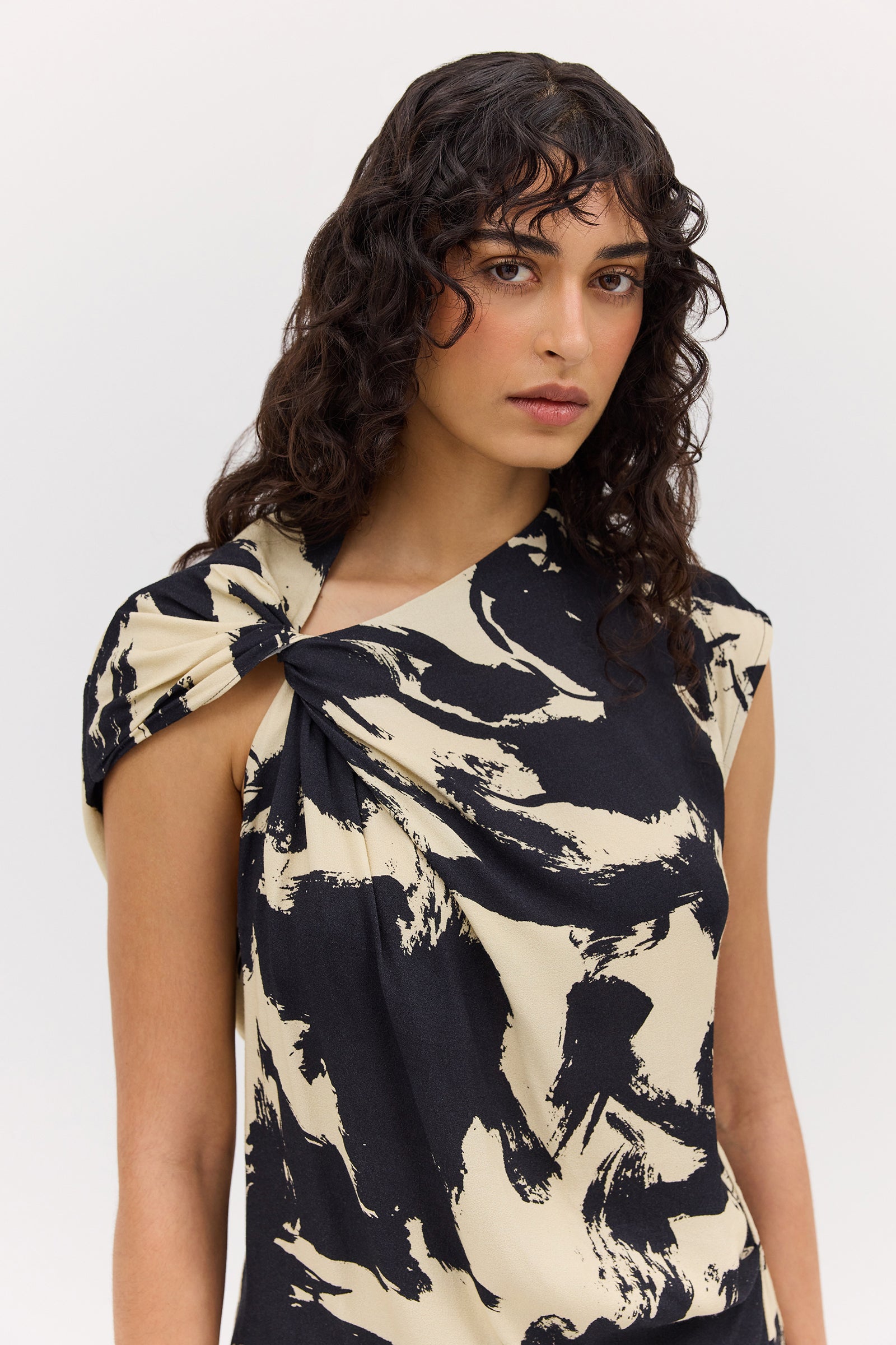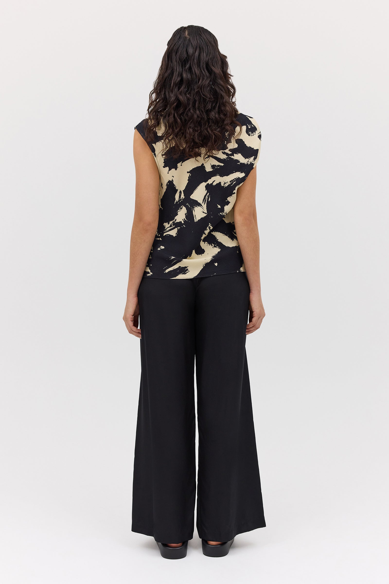 Crafted in soft crepe, the top curves gently across the body, folding and wrapping with quiet precision. The custom, in-house black bloom print evokes painterly movement, lending depth and dimension to the clean lines of the cut. A versatile foundation for both tailoring and fluid skirts, this piece distills the brand’s enduring codes—ease, elegance, and expressive form.