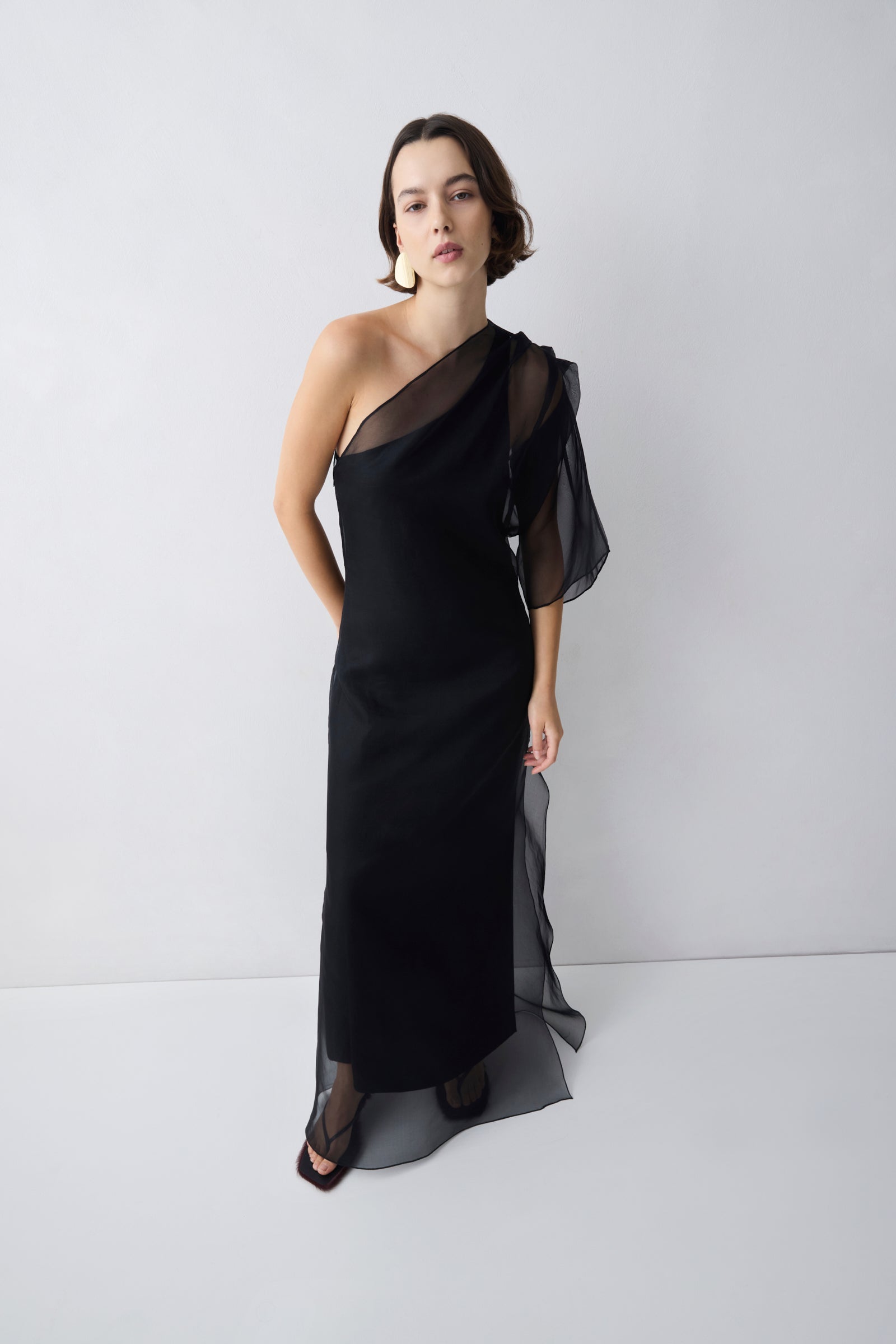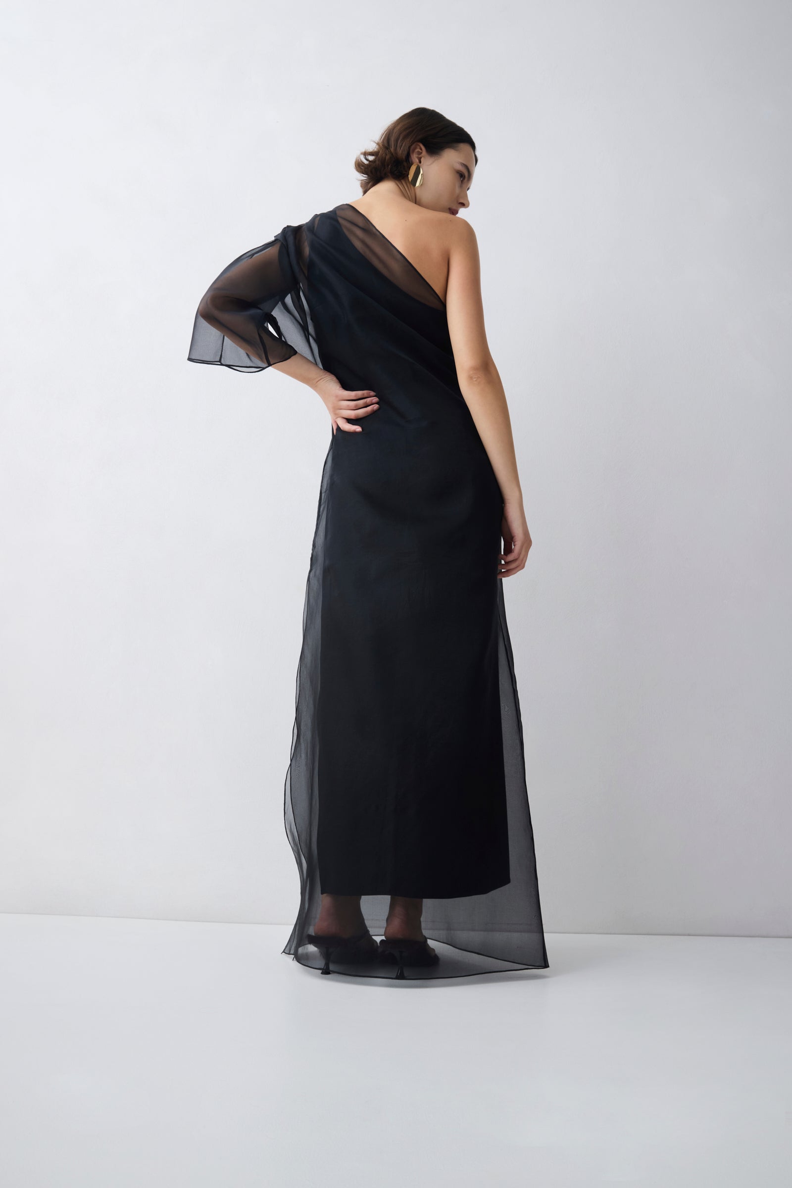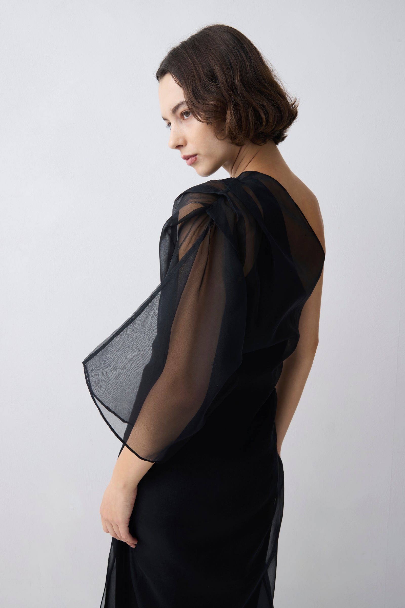Introducing the Valencia Gown. Leaning into the idea of intimacy and sensuality, glimpses of skin are gleaned through the veiled sheerness of the organza fabric. The asymmetrical shoulder design, amplifying the intimate notion of revelation and concealment. This one-shouldered design is free-slowing and fluid throughout the body, with subtle side splits to the knee allowing ease of movement. Origami-like folds add an intricacy to the voluminous sleeve detailing.