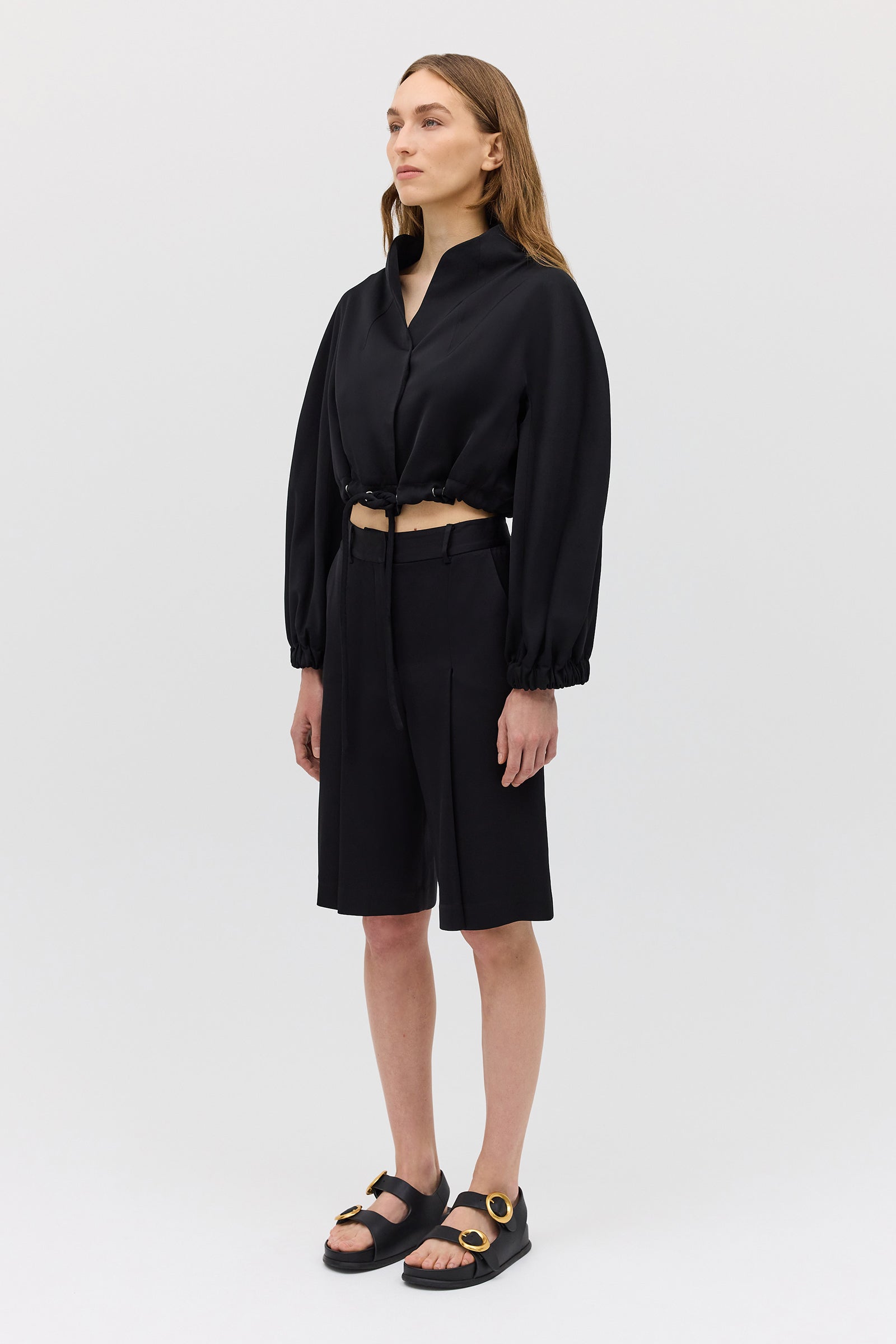 A study in precision and proportion. The Surges Short in Black Satin Suiting is crafted in a fluid yet structured fabrication that elevates classic tailoring. Designed to sit high on the waist, the short features sharp front pleats, side pockets, and a tailored fit that flares softly through the leg. The subtle sheen of the satin finish introduces an elegant contrast, ideal for both directional daywear and refined evening styling. A modern wardrobe essential with architectural ease.
