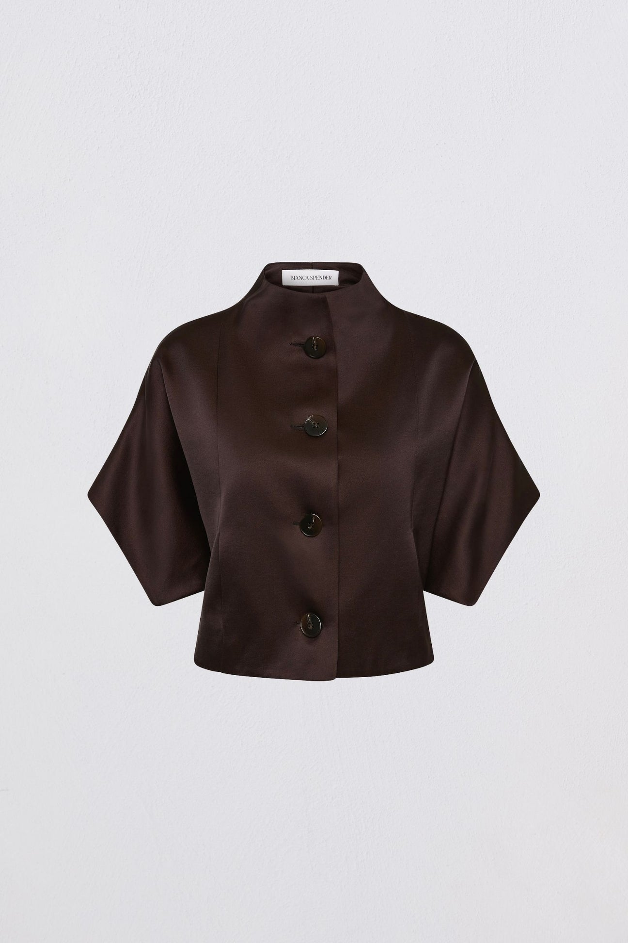 A modern silhouette softened by fluid tailoring, the Chocolate Satin Suiting Mutual Jacket is crafted in a lustrous satin suiting fabrication that catches the light with quiet strength. Featuring wide drop sleeves and a sculpted, cropped fit, this piece fastens with oversized tonal shell buttons through the front. Designed to be worn open or closed, layered or alone — a versatile piece that balances ease with refinement. We recommend sizing up for a more oversized fit.