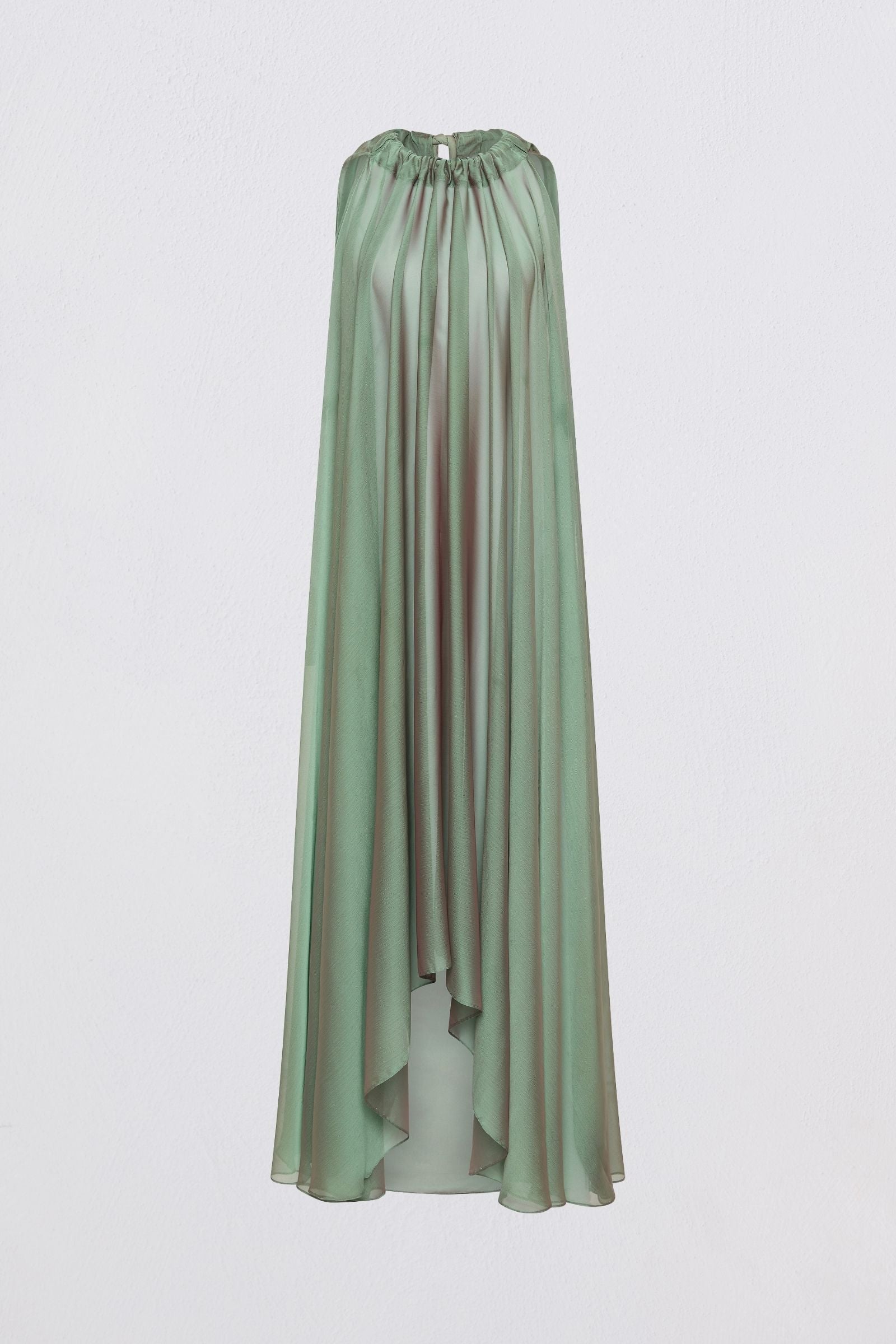 Ethereal, fluid, and deeply romantic, the Fern Effuse Dress captures the essence of light in motion. Crafted from whisper-weight chiffon with a soft, liquid-like sheen, the gown falls from a gathered halter neckline into a cascade of diaphanous layers that float with every movement.