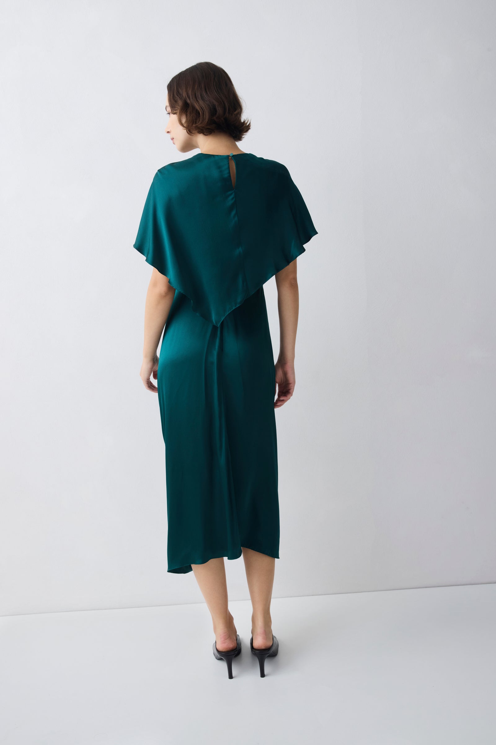 Serene femininity in petrol silk satin. The Illusionist Dress is a masterclass in craftsmanship, with a gorgeous central gathering through a semi-fitted body, a subtle slit and a classic, rounded neck. This dress finishes mid-calf and fastens through the center back with an invisible zip through the back skirt which is concealed under the back cape. A subtle split through the back neck fastens with a covered button.