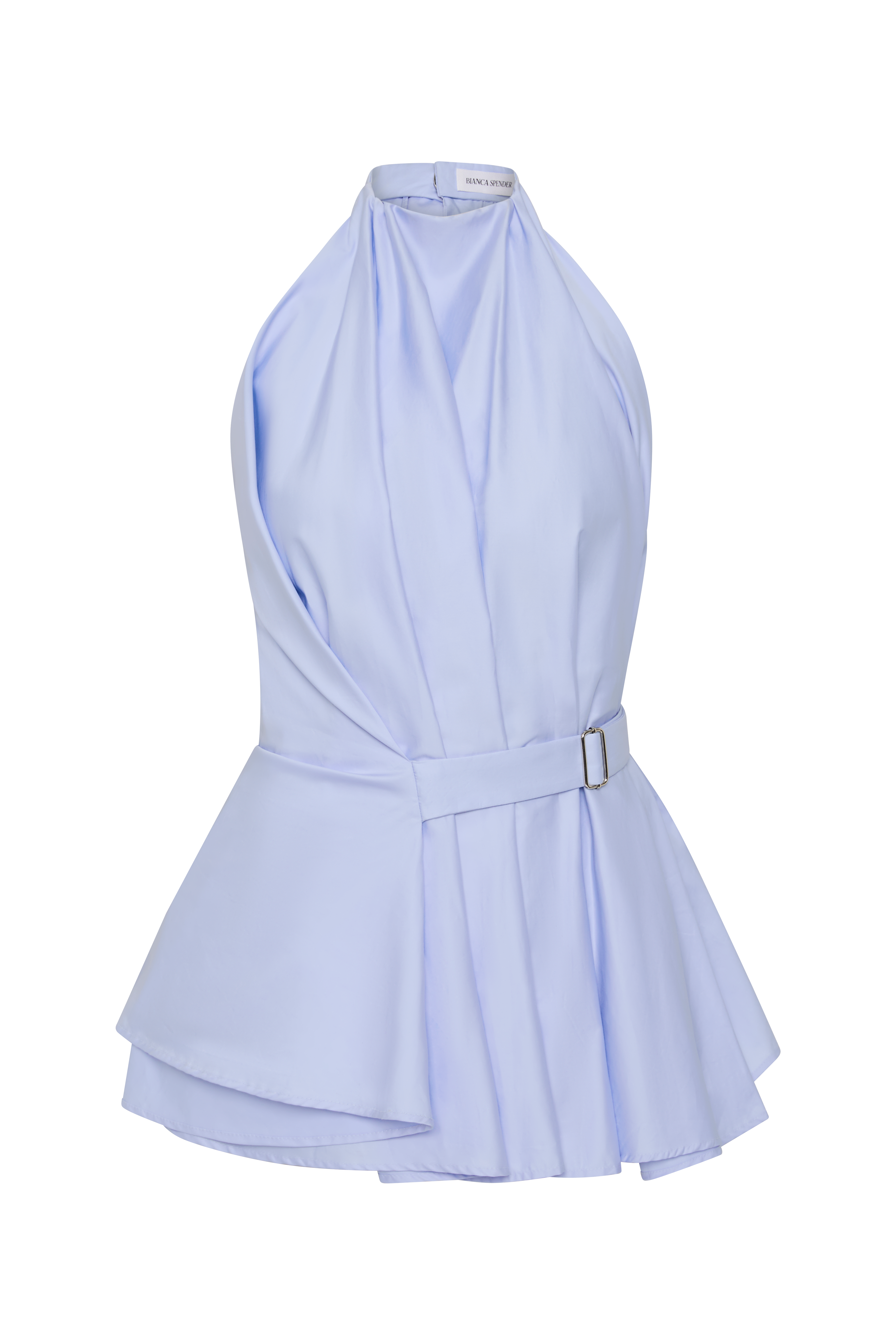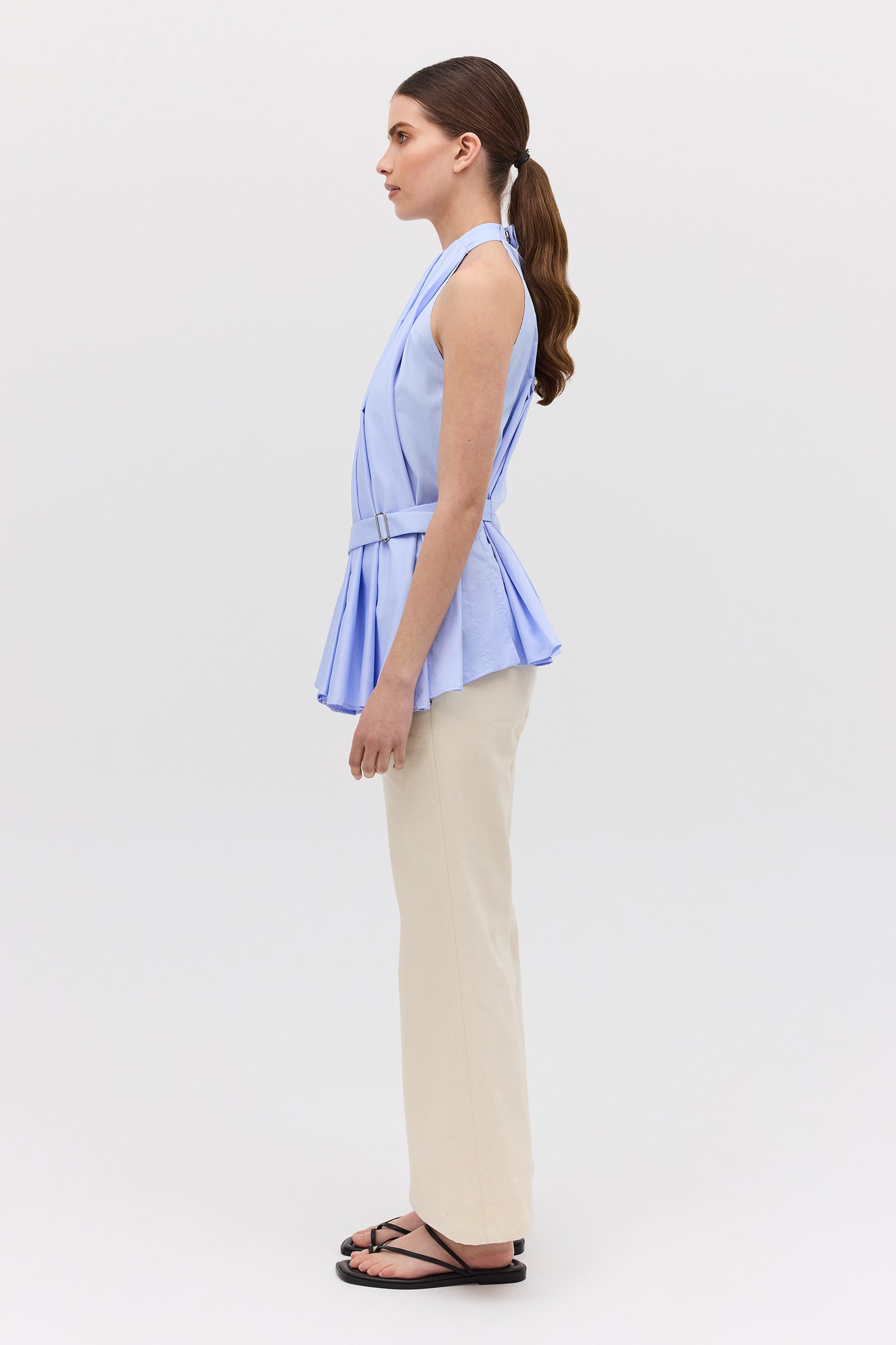 A new interpretation of a Bianca Spender signature. The Isabella Top reimagines the elegance of the bestselling gown in crisp sky cotton, balancing structure and softness through architectural folds and clean lines. Featuring a high neckline and adjustable belted waist, the silhouette cinches gently through the body to create a sculpted yet relaxed form. The result is both refined and effortless, evoking quiet strength and modern femininity.