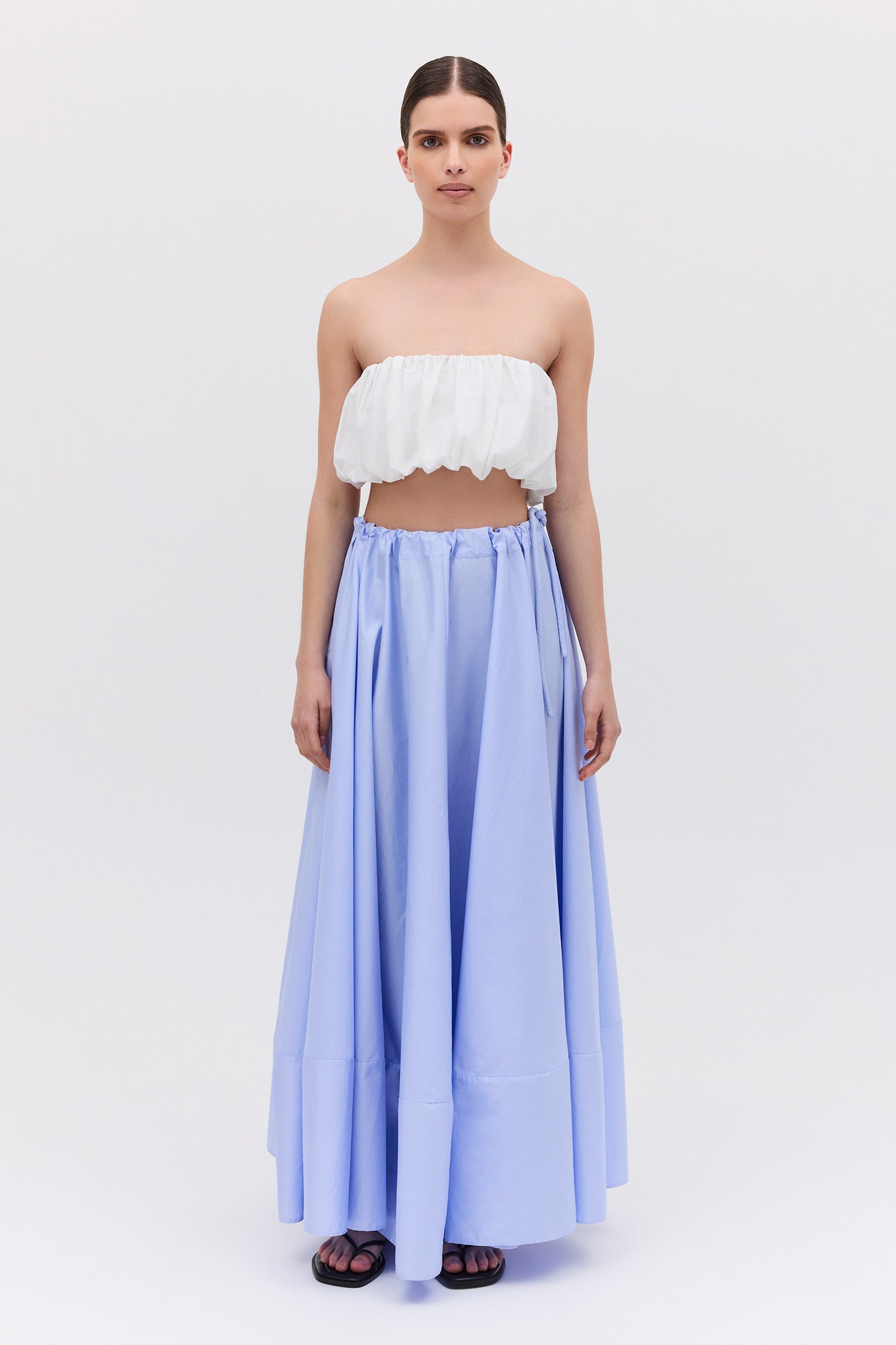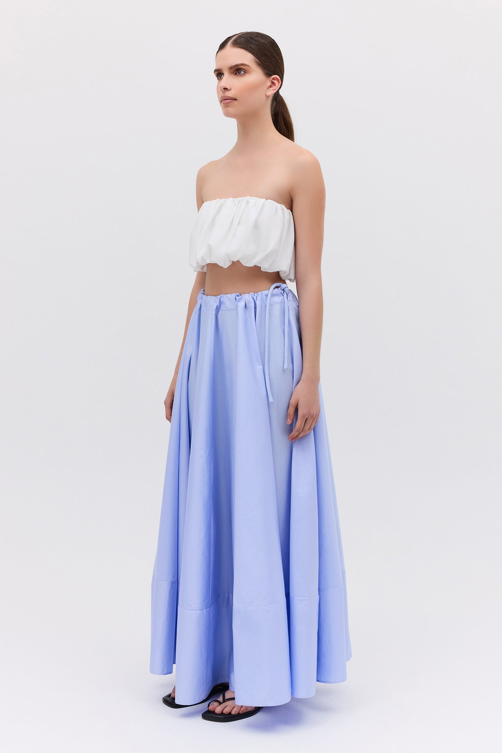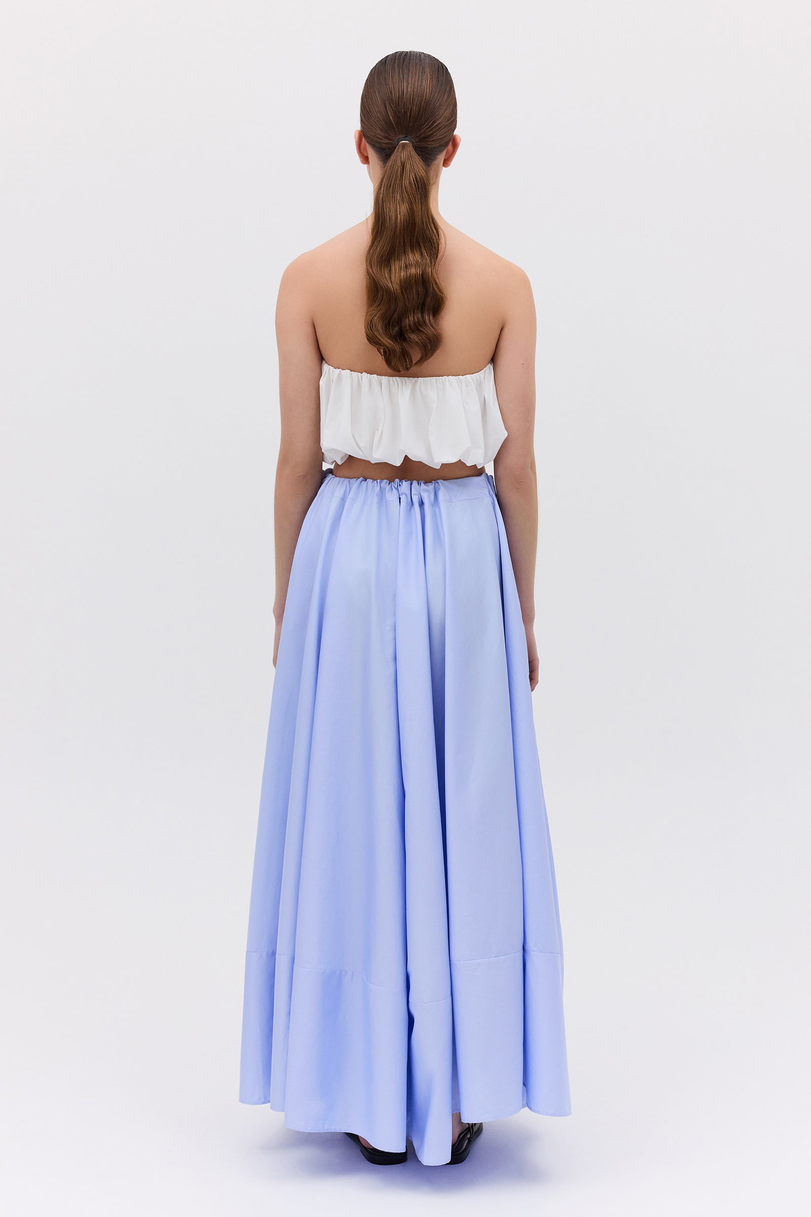 An evolution of the beloved Effuse Skirt, the Santana Skirt reinterprets its fluid silhouette in crisp sky cotton. The result is a voluminous yet grounded piece that captures movement through form rather than fabric. Falling from a soft, gathered drawstring waist, the skirt creates effortless volume and gentle structure, offering an elevated take on summer ease. The cotton fabrication lends a sense of polish and wearability, perfect for both day and evening moments.