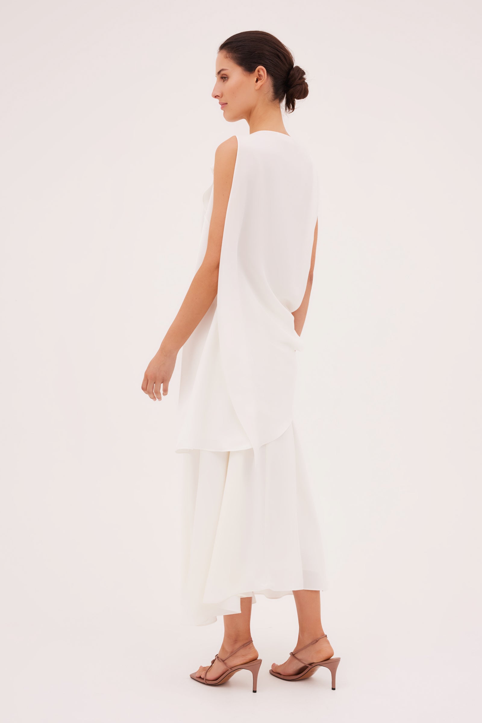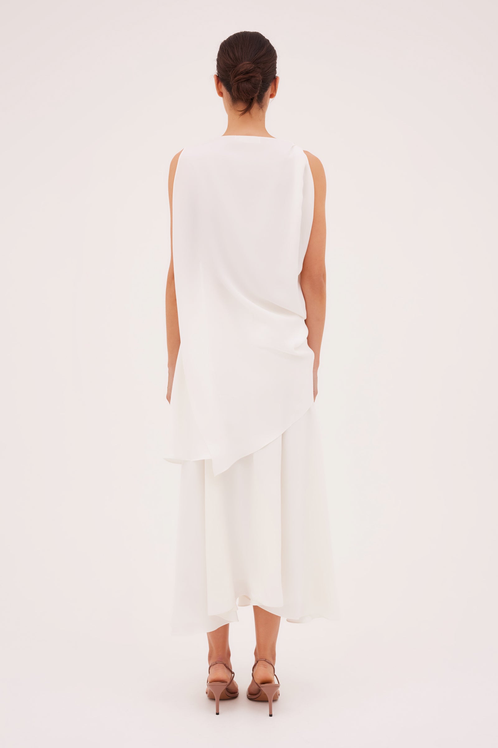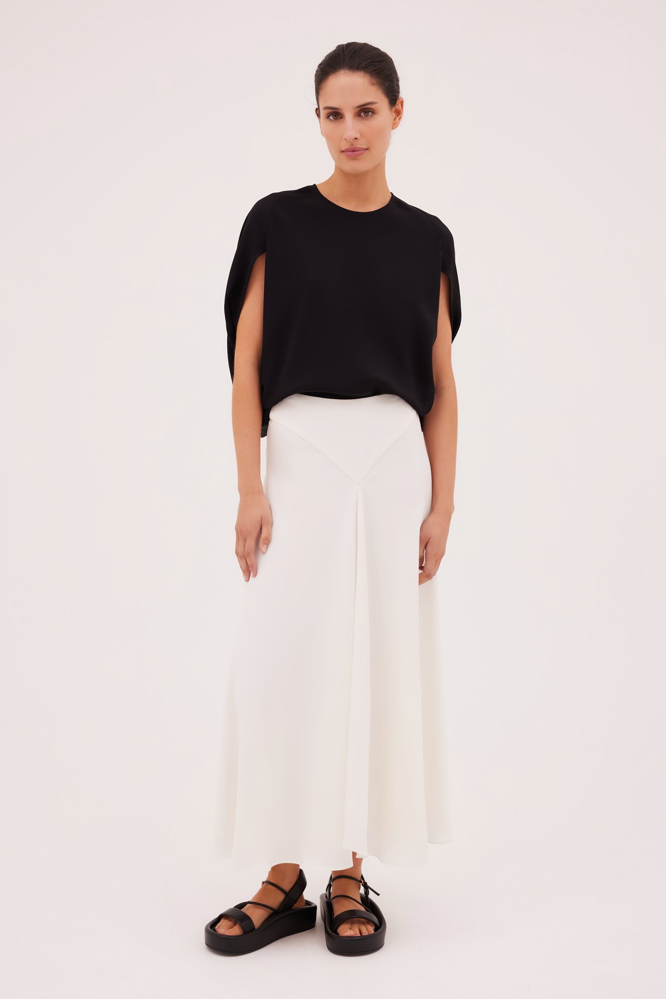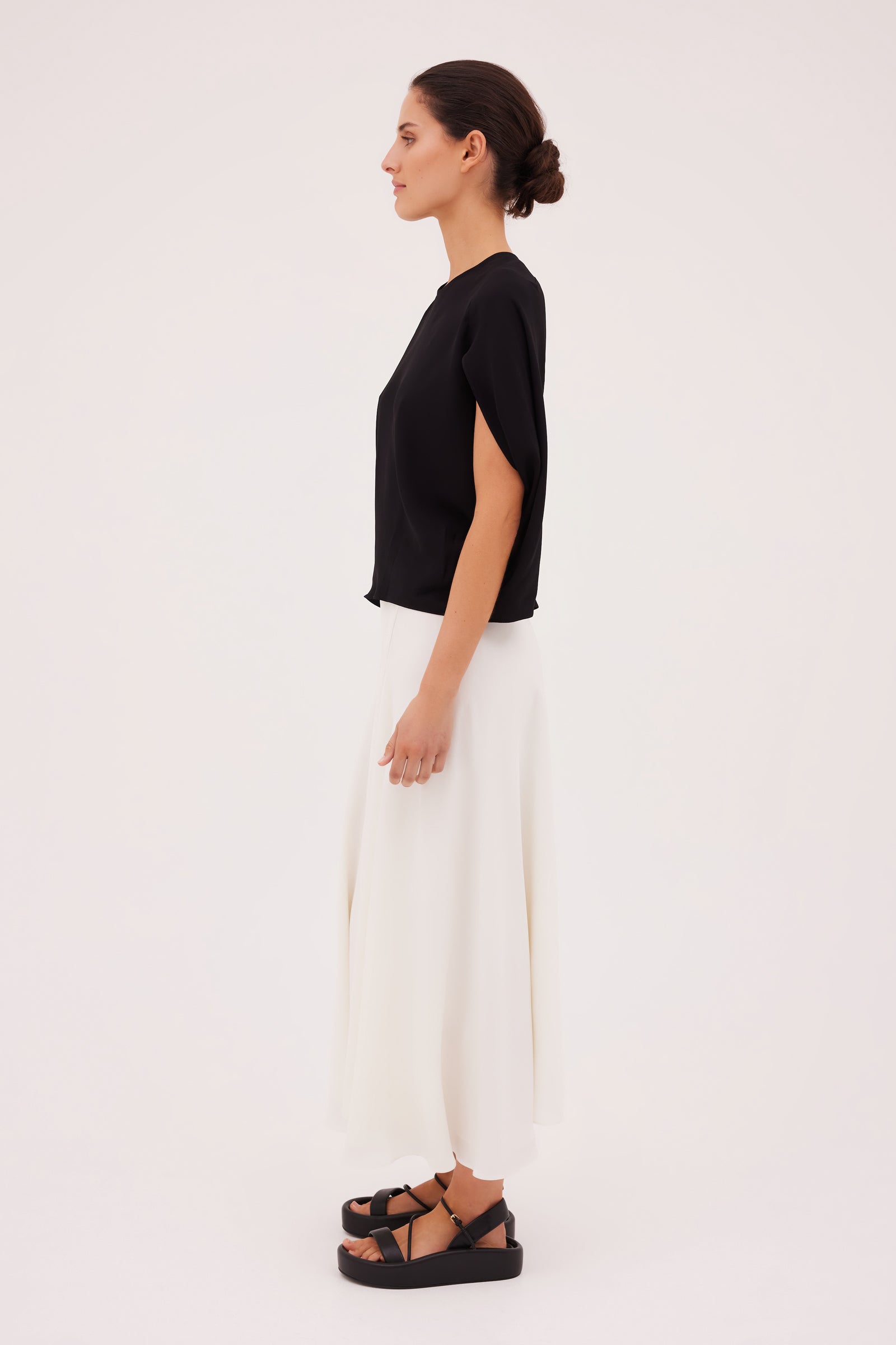 Evoke a sense of nostalgia with this Ivory Crepe Skirt. The Lennon Skirt sits high on the waist, with a seam that sits below the hip which flares into soft drapery at the top of the leg. A perfect midi skirt for any occasion.