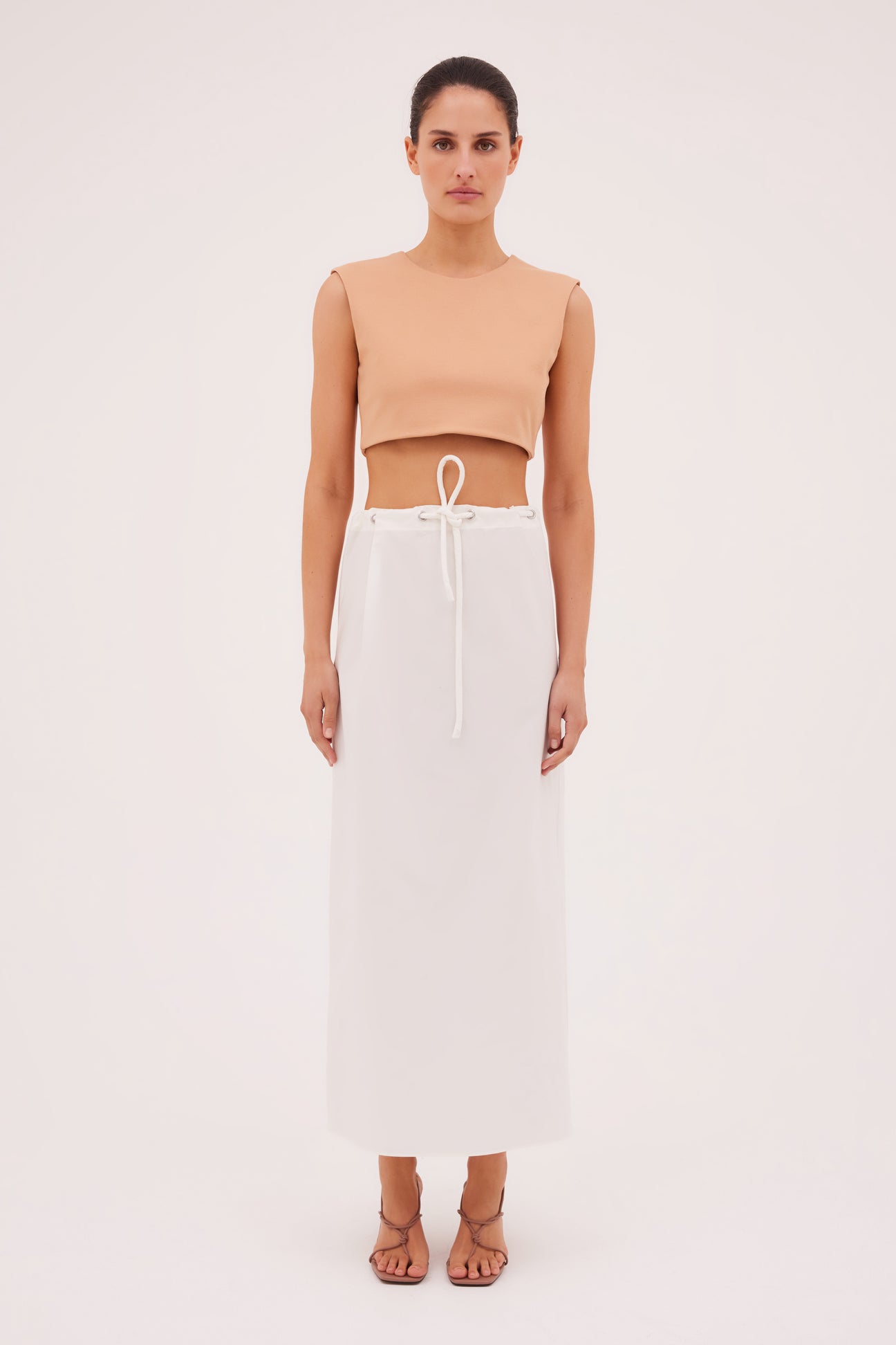 The Apricot Ponte Crop Top is the perfect Summer staple. Designed in Apricot Ponte, the crop top plays on feminine proportions. Sitting on the ribs, fastened with a centre-back zipper.