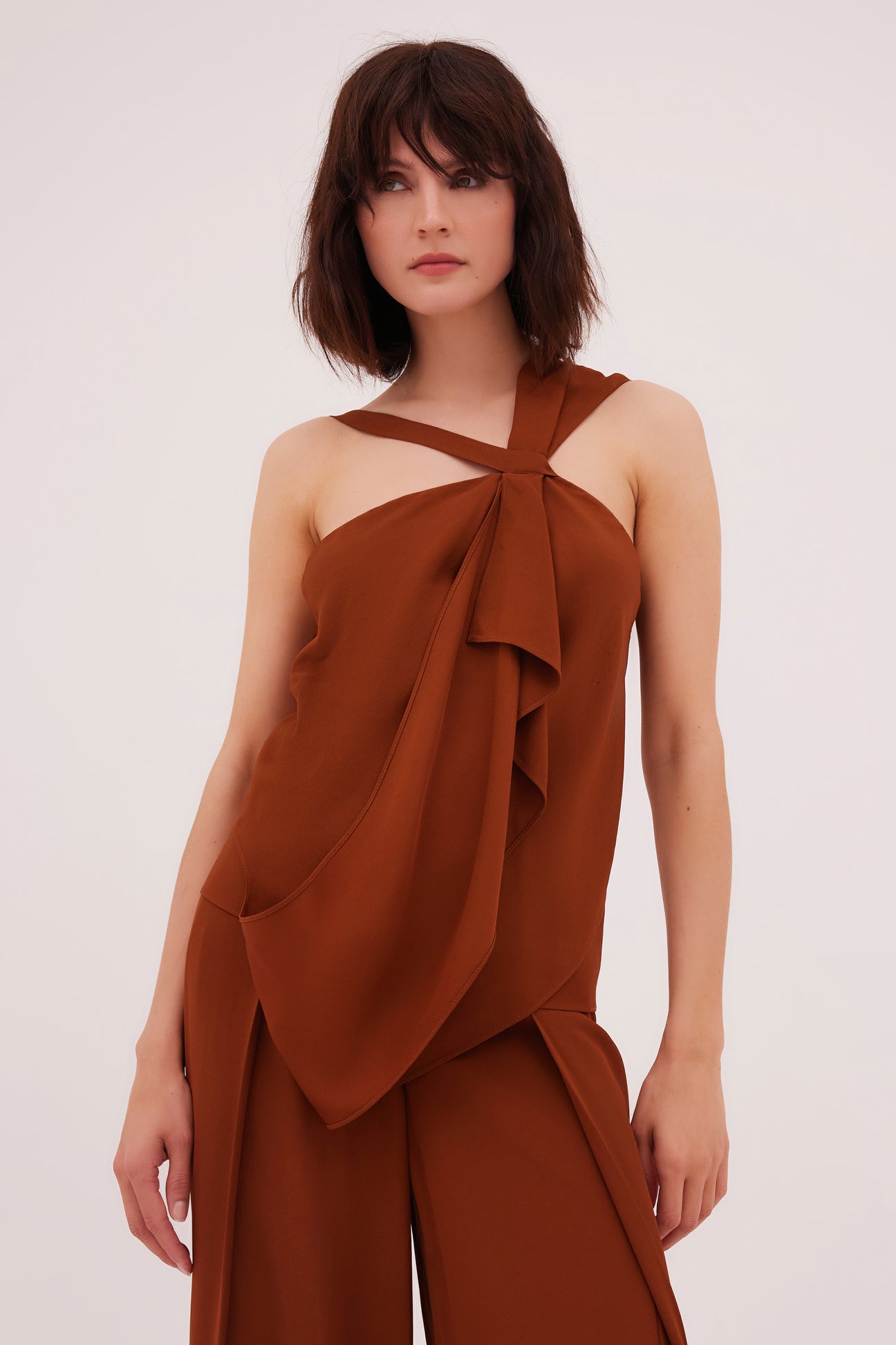 The Converging Top explores softness. Graphic cutouts and a central twist create strong modernity. Asymmetry plays on dimensions and proportions constructed from cinnamon crepe.
