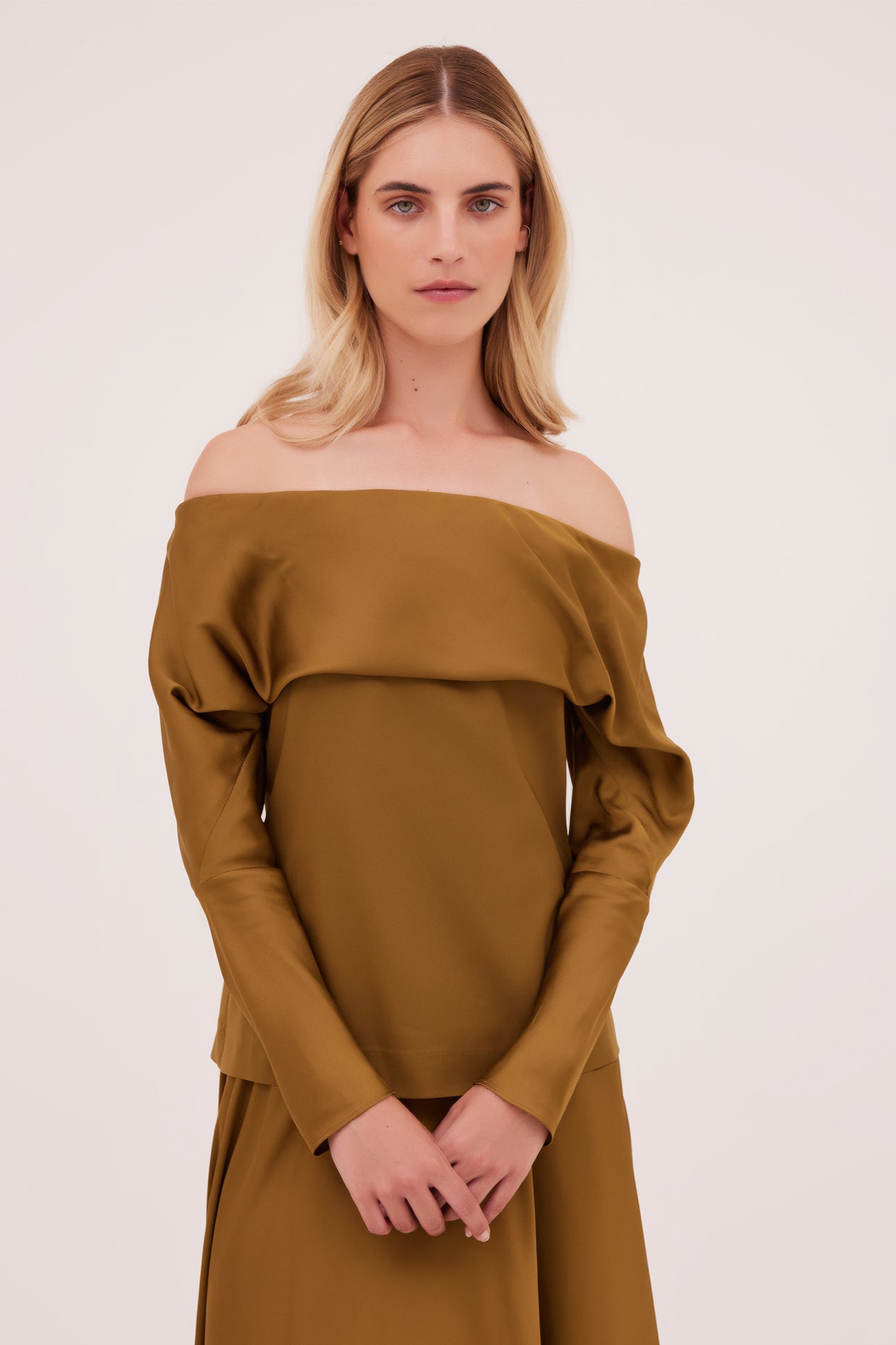 The Bijou Top is the evolution of our Maurits top and putting it was a relaxed longer silhouette. An off-shoulder top cascading into a dropped sleeve, finishing in a fitted sleeve. It is a long style with a zipper fastening at the back, designed to sit on the hip so it can be tucked in or worn out.