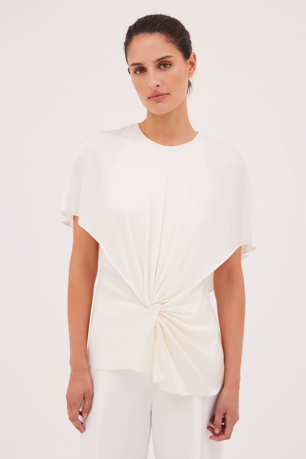 One of our favourite tops, synonymous with Bianca's hand in cutting elegant silhouettes. The Helena covers the arms with a soft cape sleeve and highlights the waist with a twist falling from a clean shoulder and cut in a luxe Ivory Cher. The crew neck fastens at the centre back neck with a button and loop. Finishing on the low hip, this style is great worn over pants or skirts. This style looks best sitting over a pant or skirt.