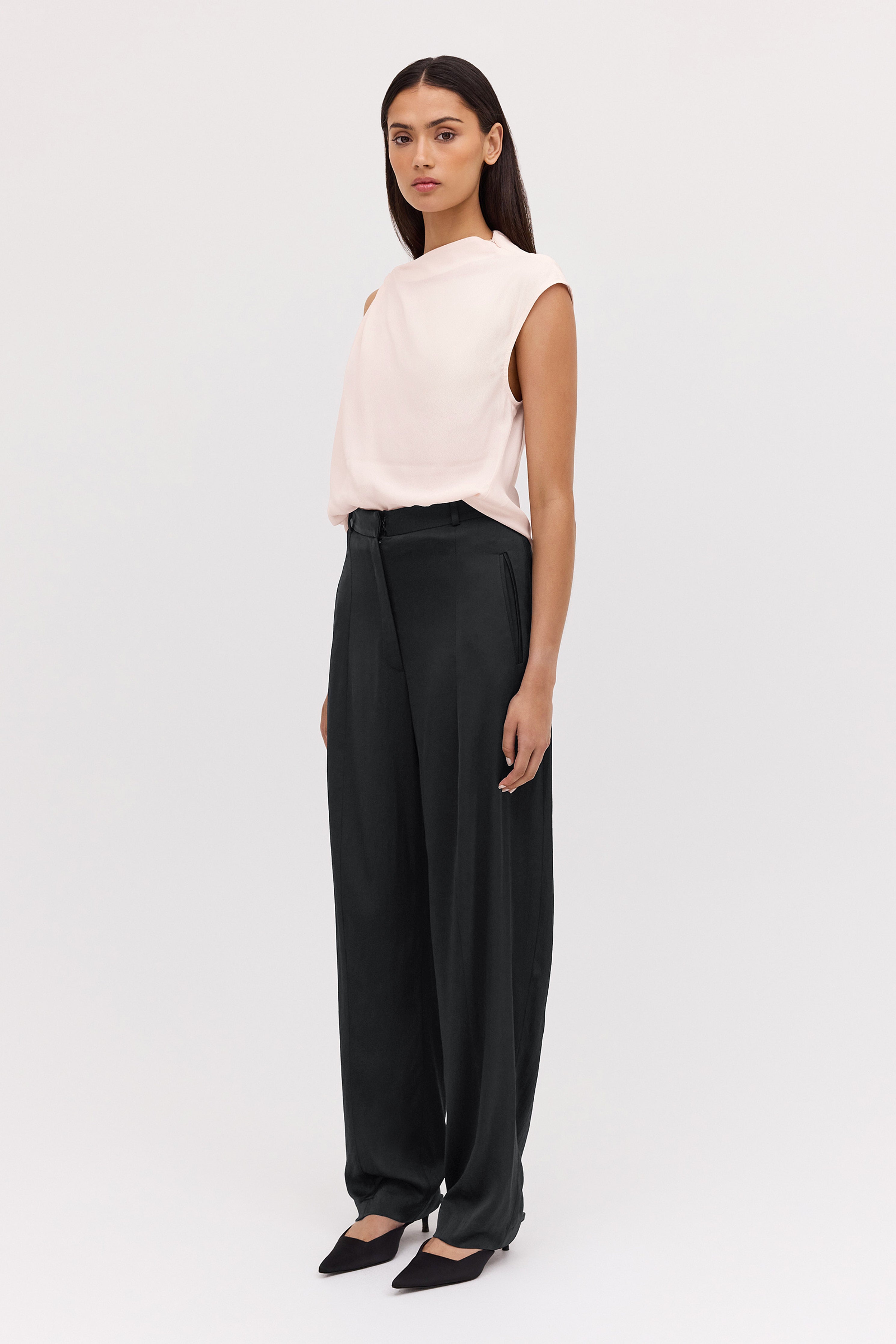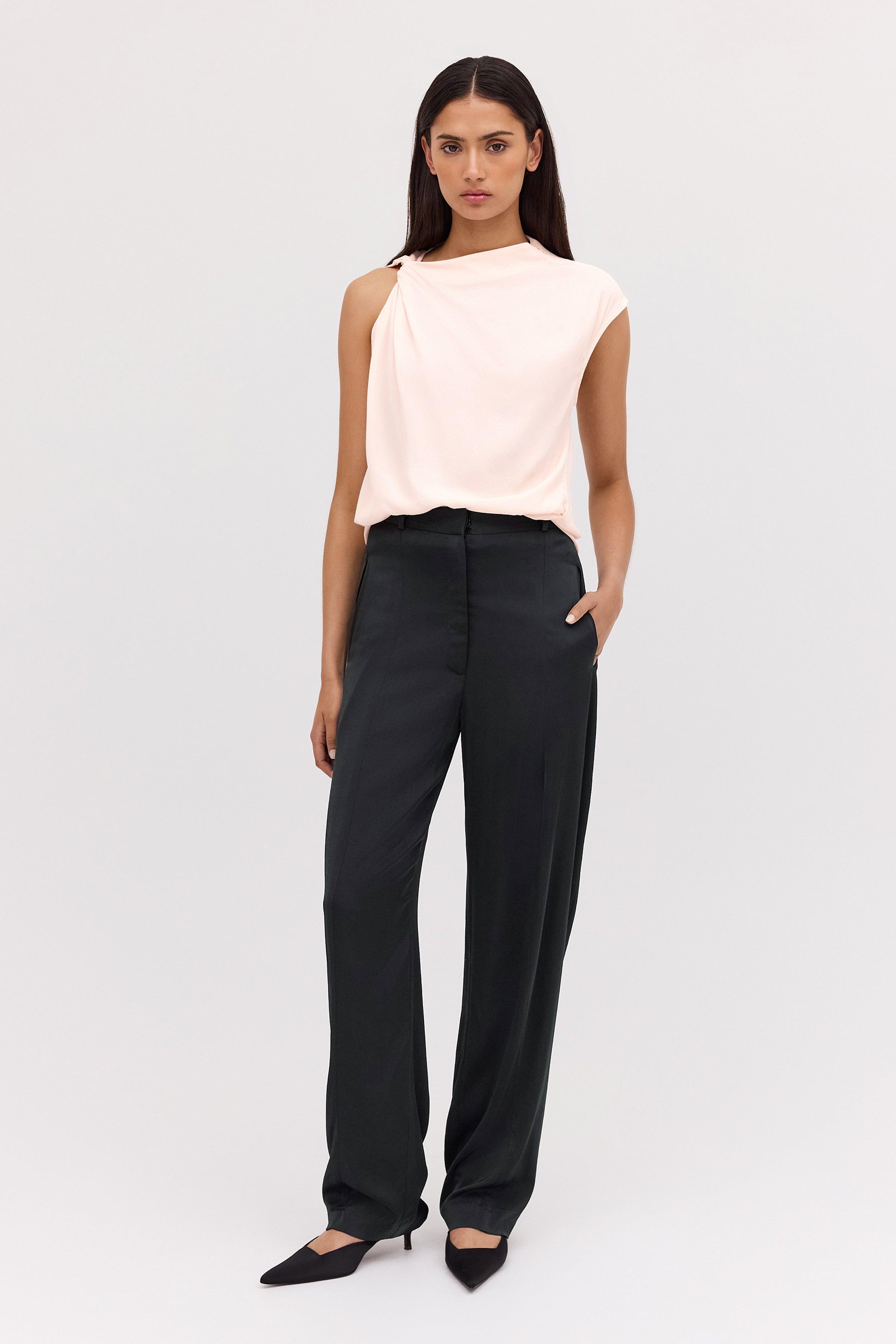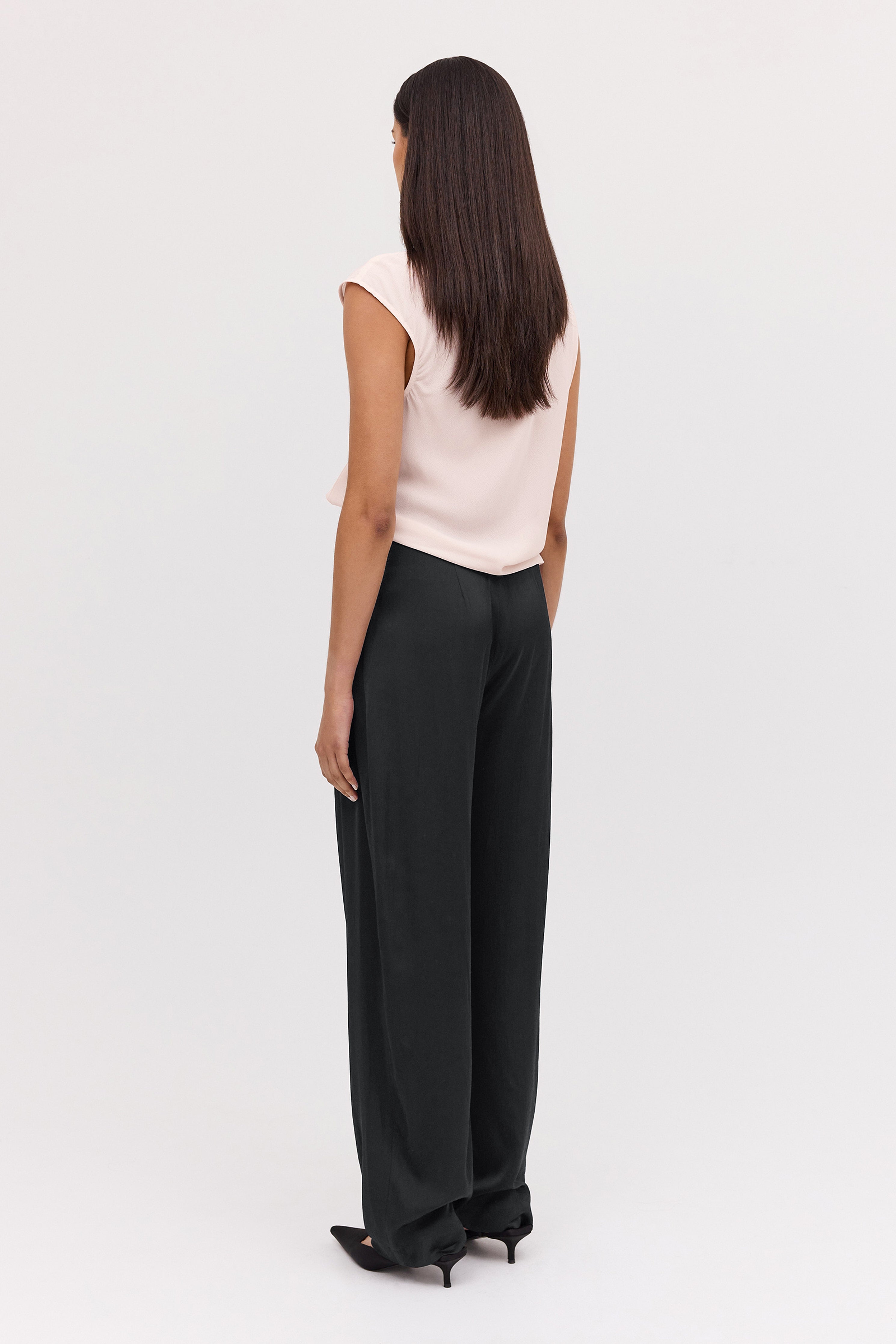 No one cuts a trouser quite like Bianca Spender, known for refined comfort and a modern twist on power suiting. Introducing the Black Satin Crepe Tondo Pant, featuring a curved leg cut, relaxed fit and mid-rise, to give a sense of air around the form of the body and allow ease of movement. Crafted from a low-maintenance viscose with Bianca's signature drape.