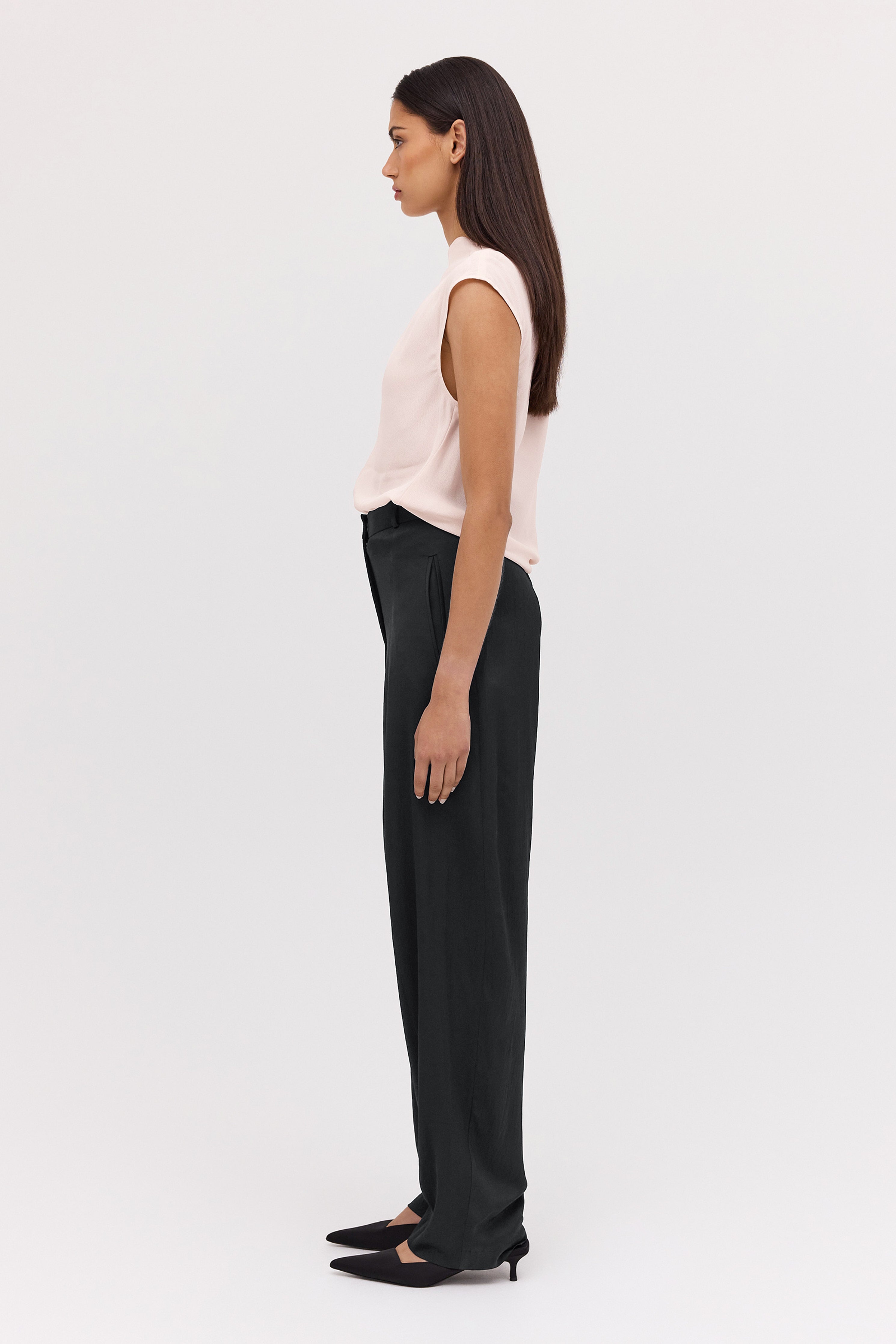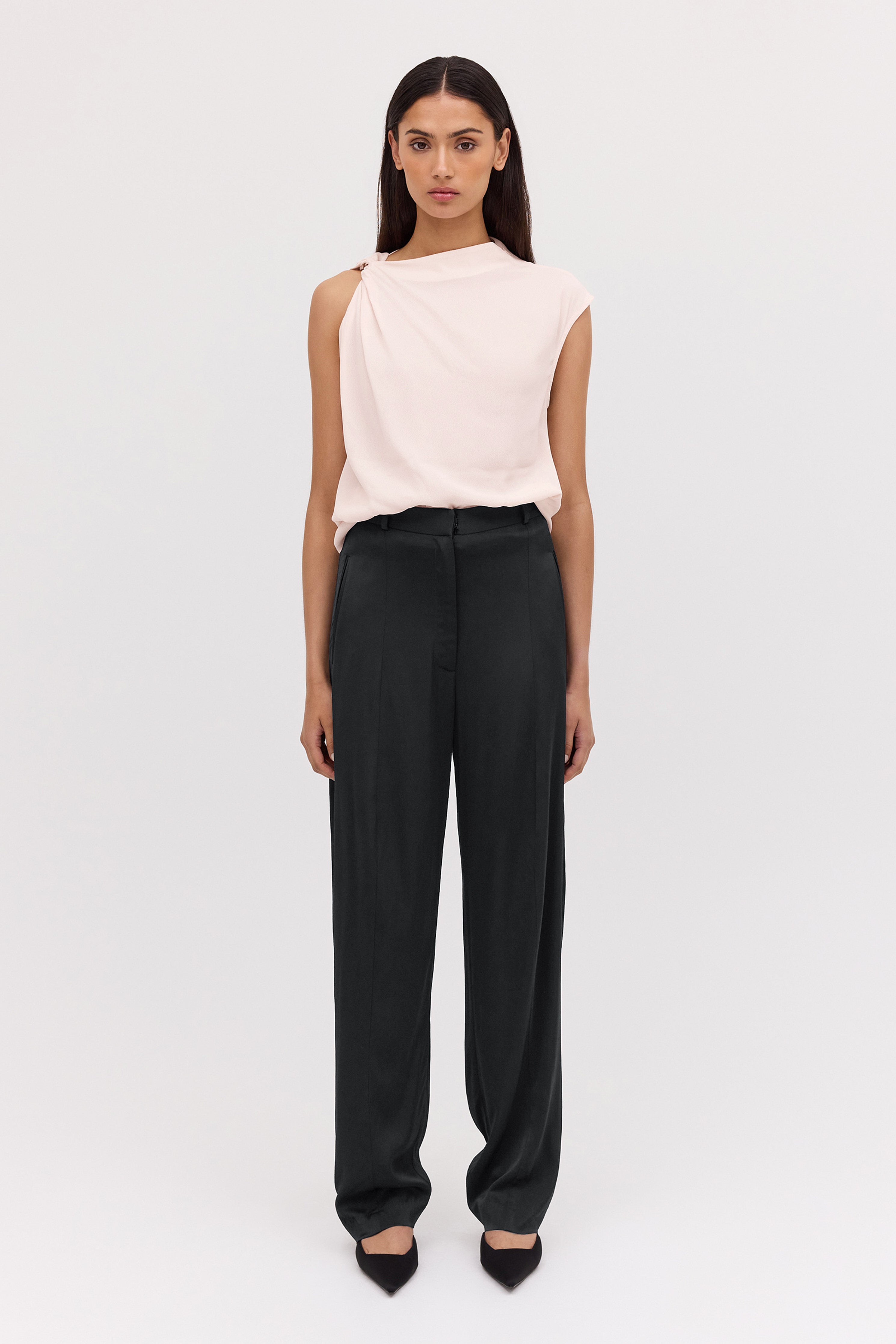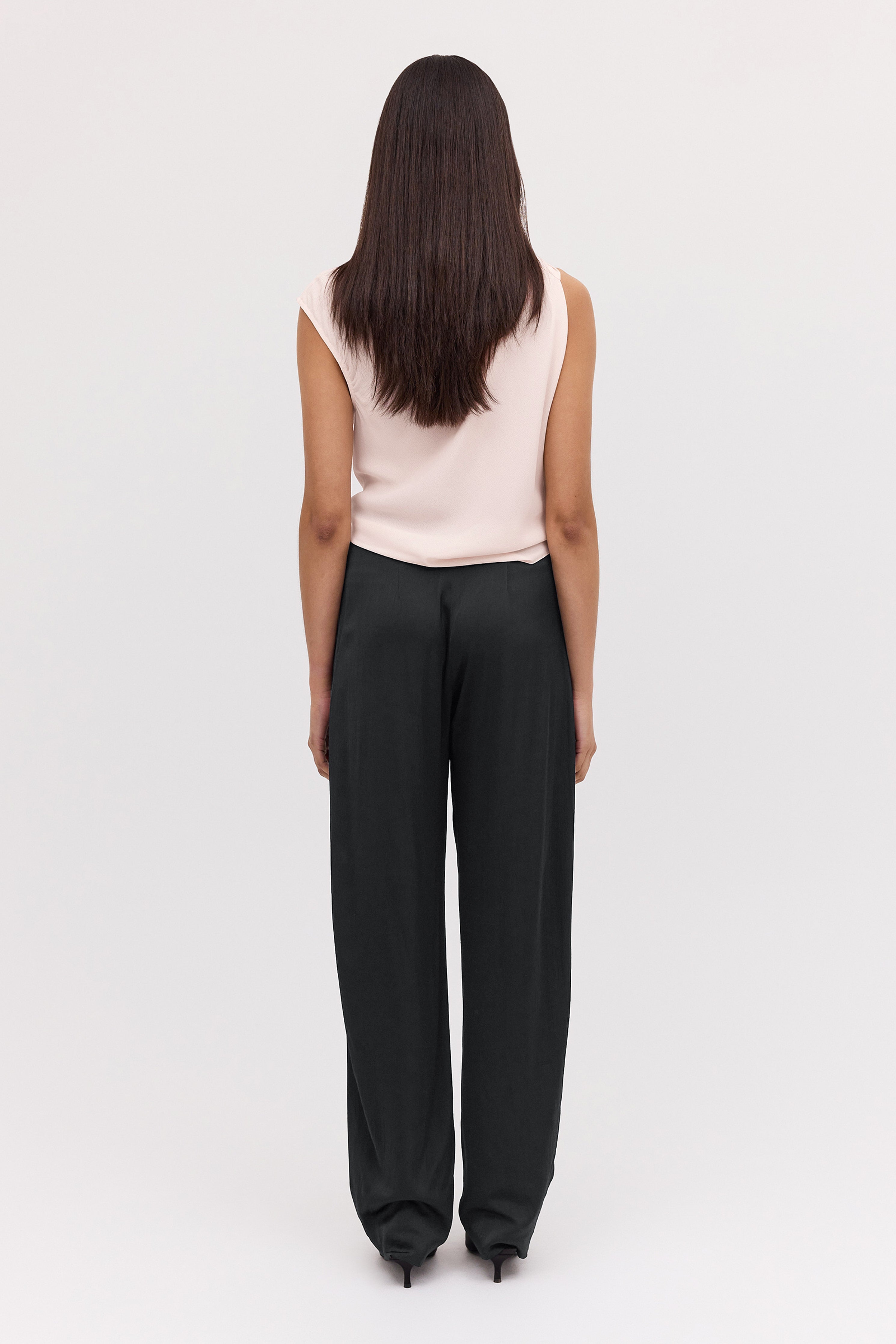 No one cuts a trouser quite like Bianca Spender, known for refined comfort and a modern twist on power suiting. Introducing the Black Satin Crepe Tondo Pant, featuring a curved leg cut, relaxed fit and mid-rise, to give a sense of air around the form of the body and allow ease of movement. Crafted from a low-maintenance viscose with Bianca's signature drape.