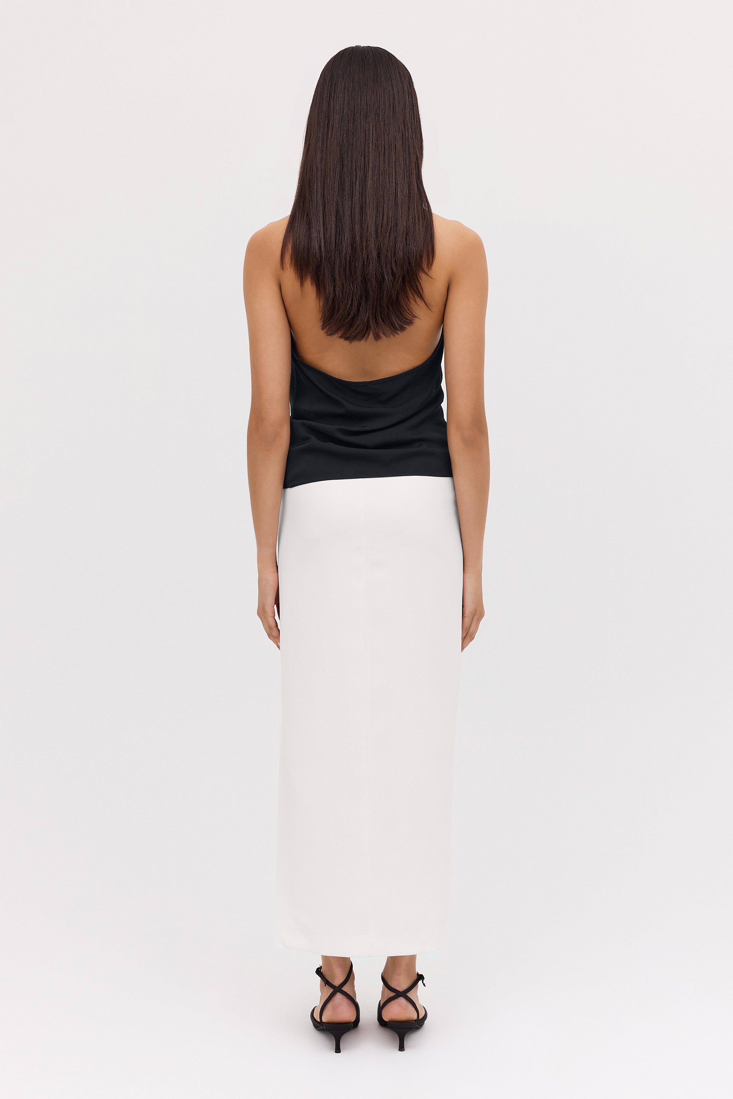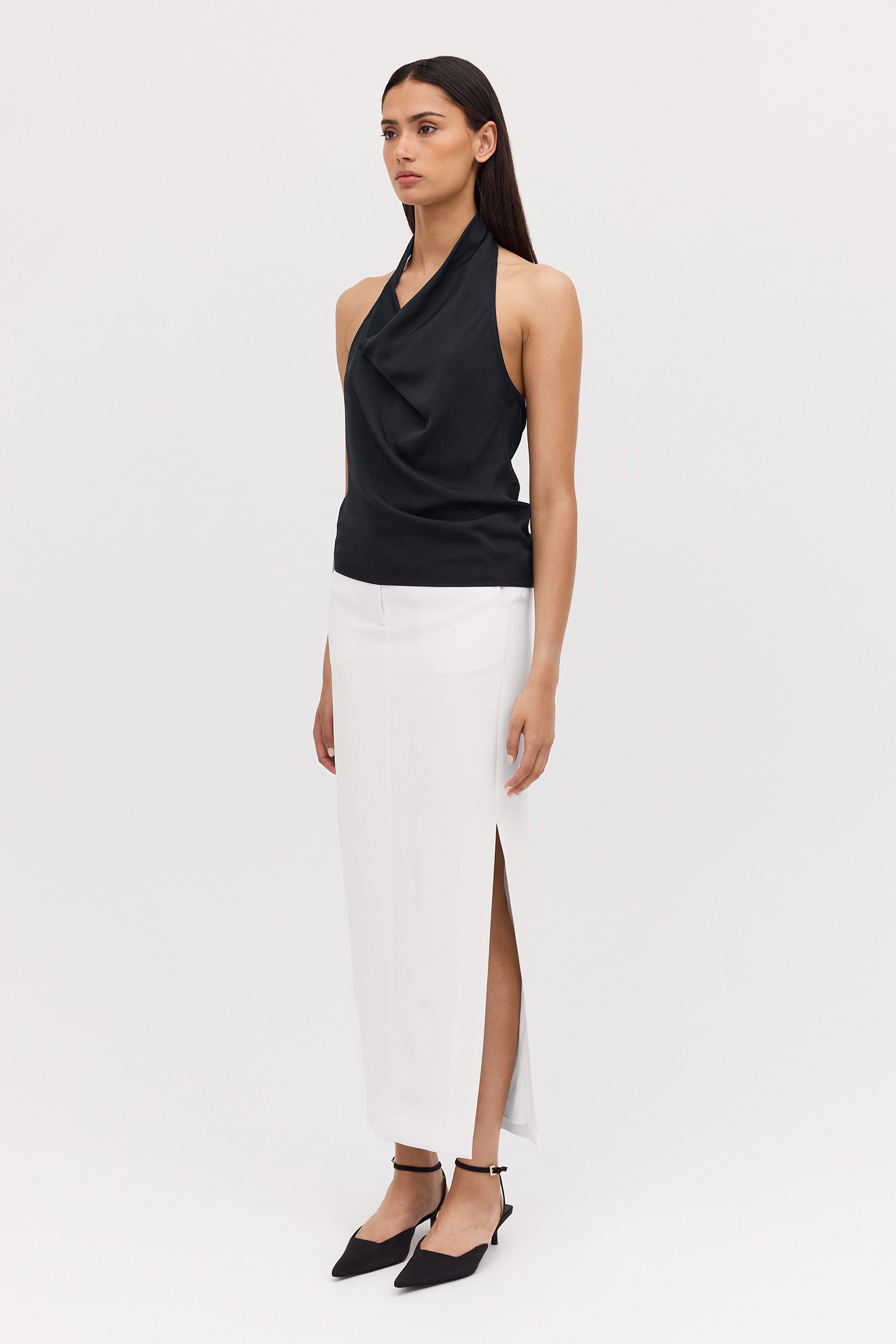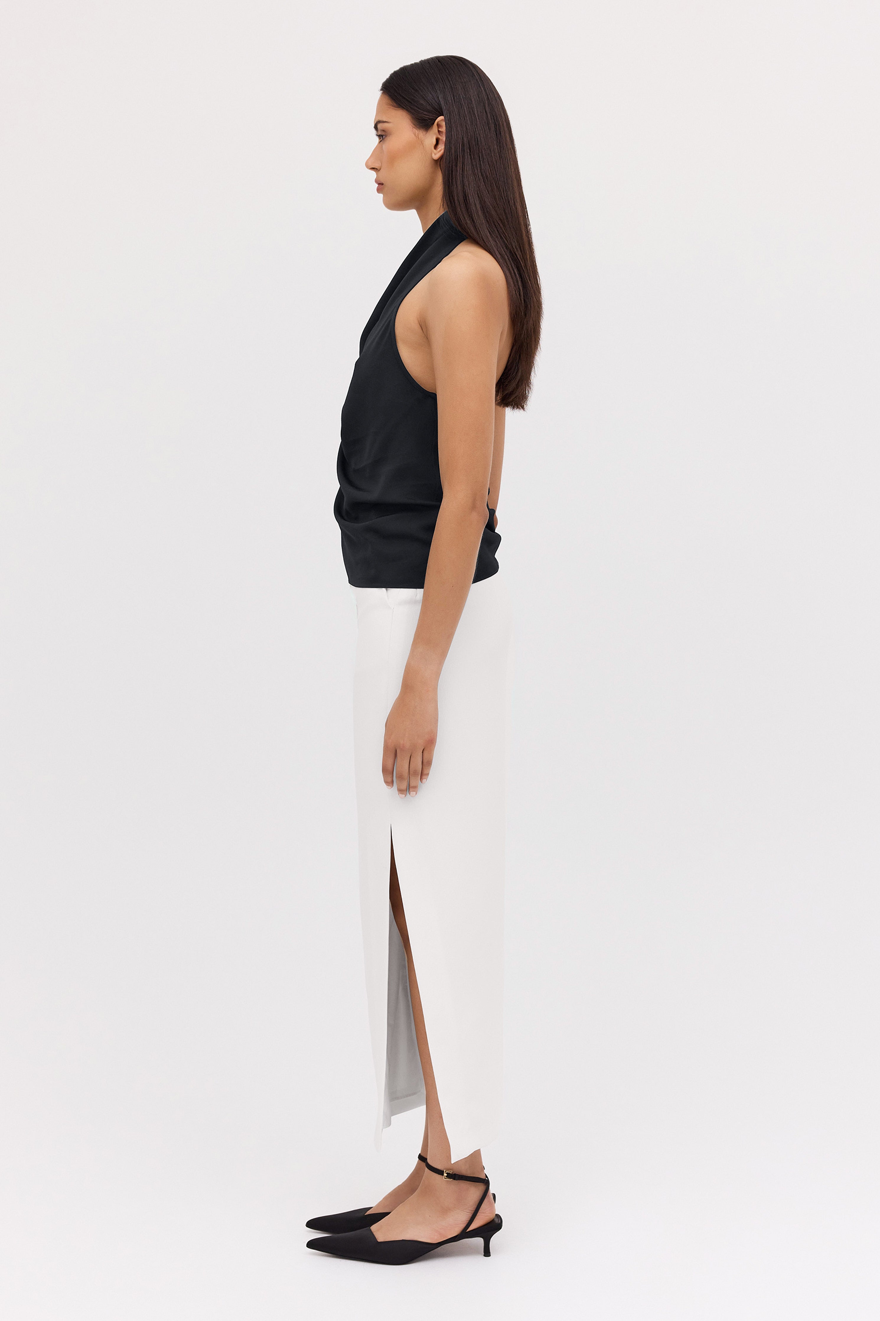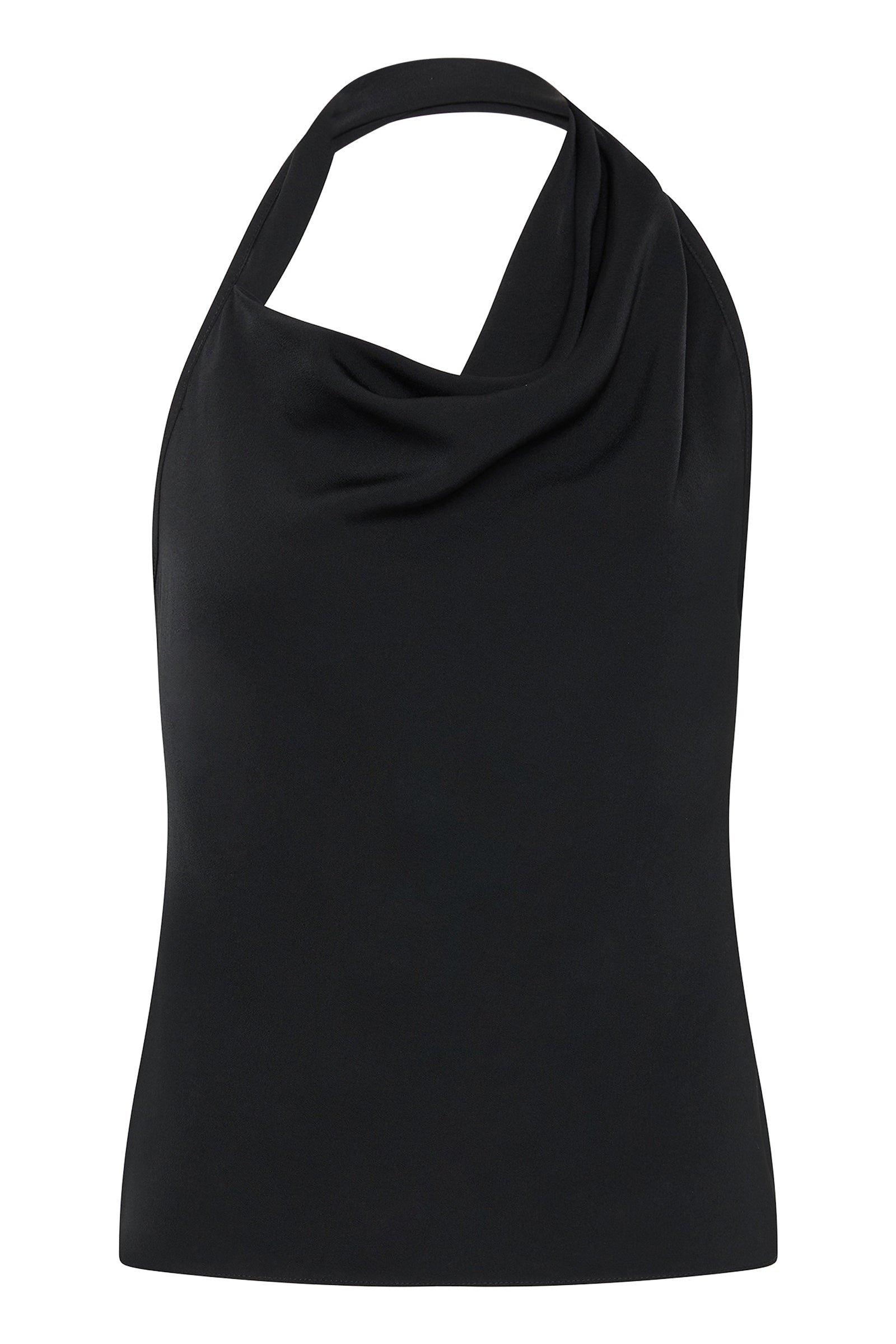 The Sync Top, cut from fluid black satin, features Bianca's signature liquid drape and a modern asymmetrical cowl neckline. Designed to be worn with the Black Satin Tondo Pant, this versatile piece may also be worn separately. We love this styled back with a crisp white trouser or linen skirt.