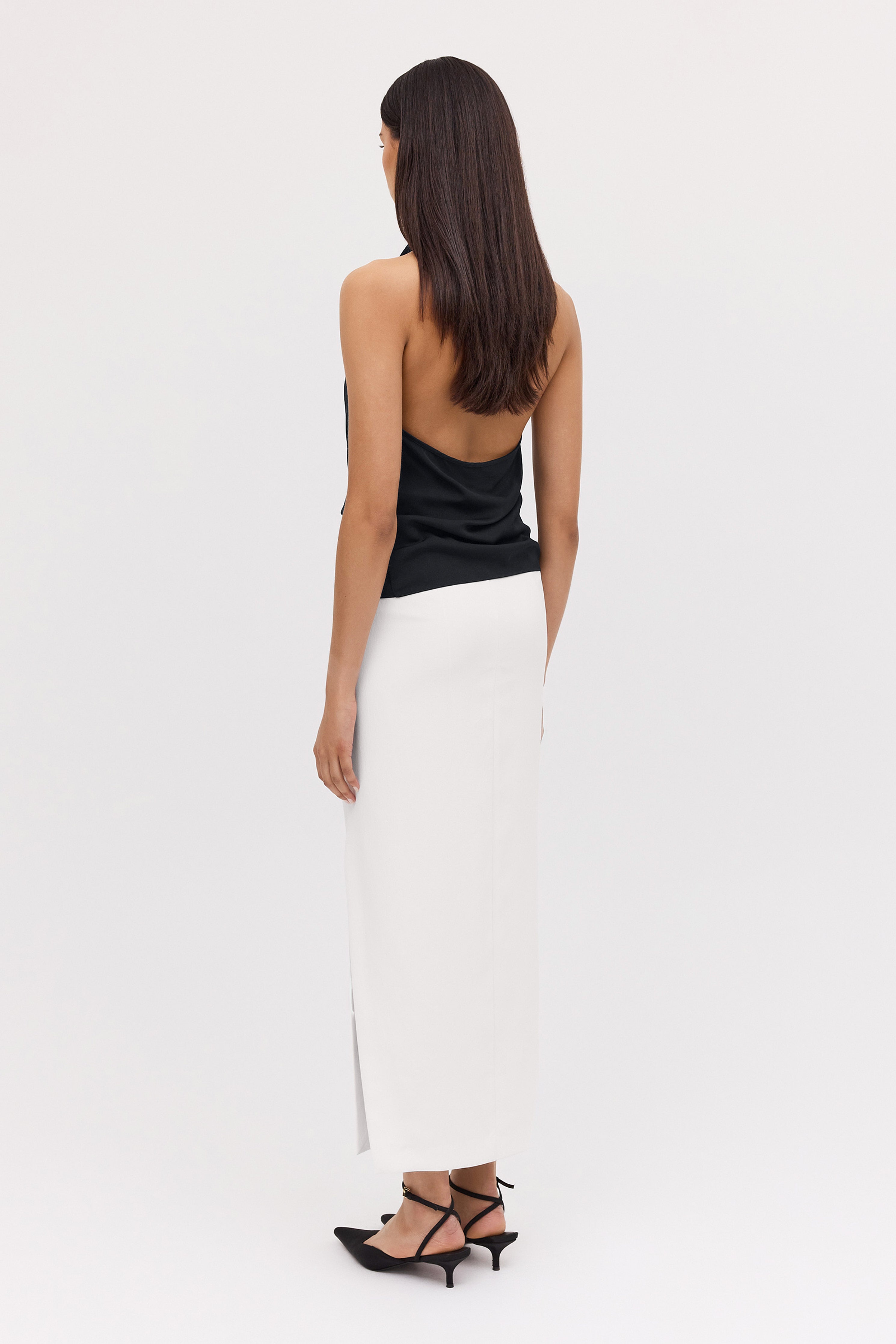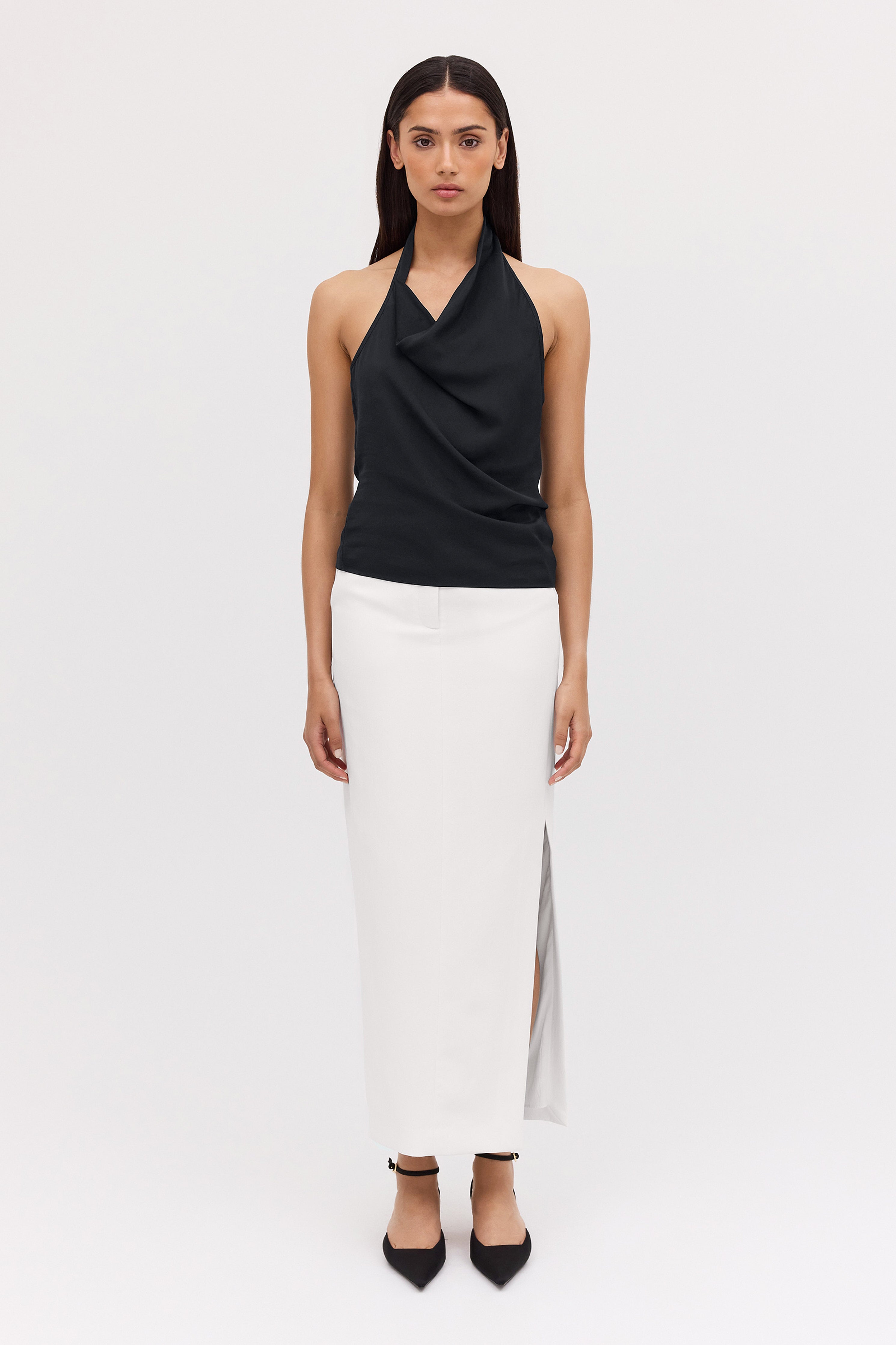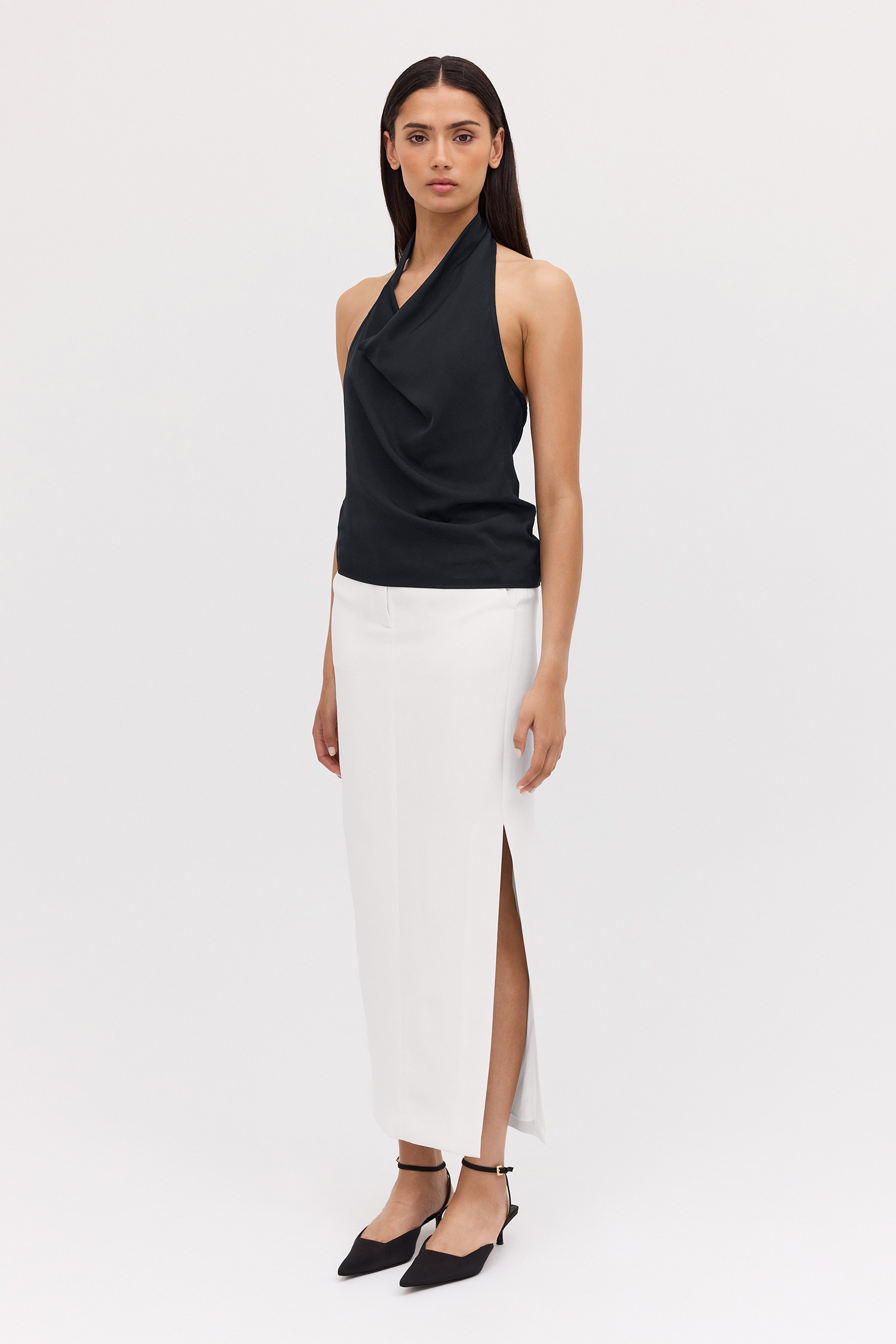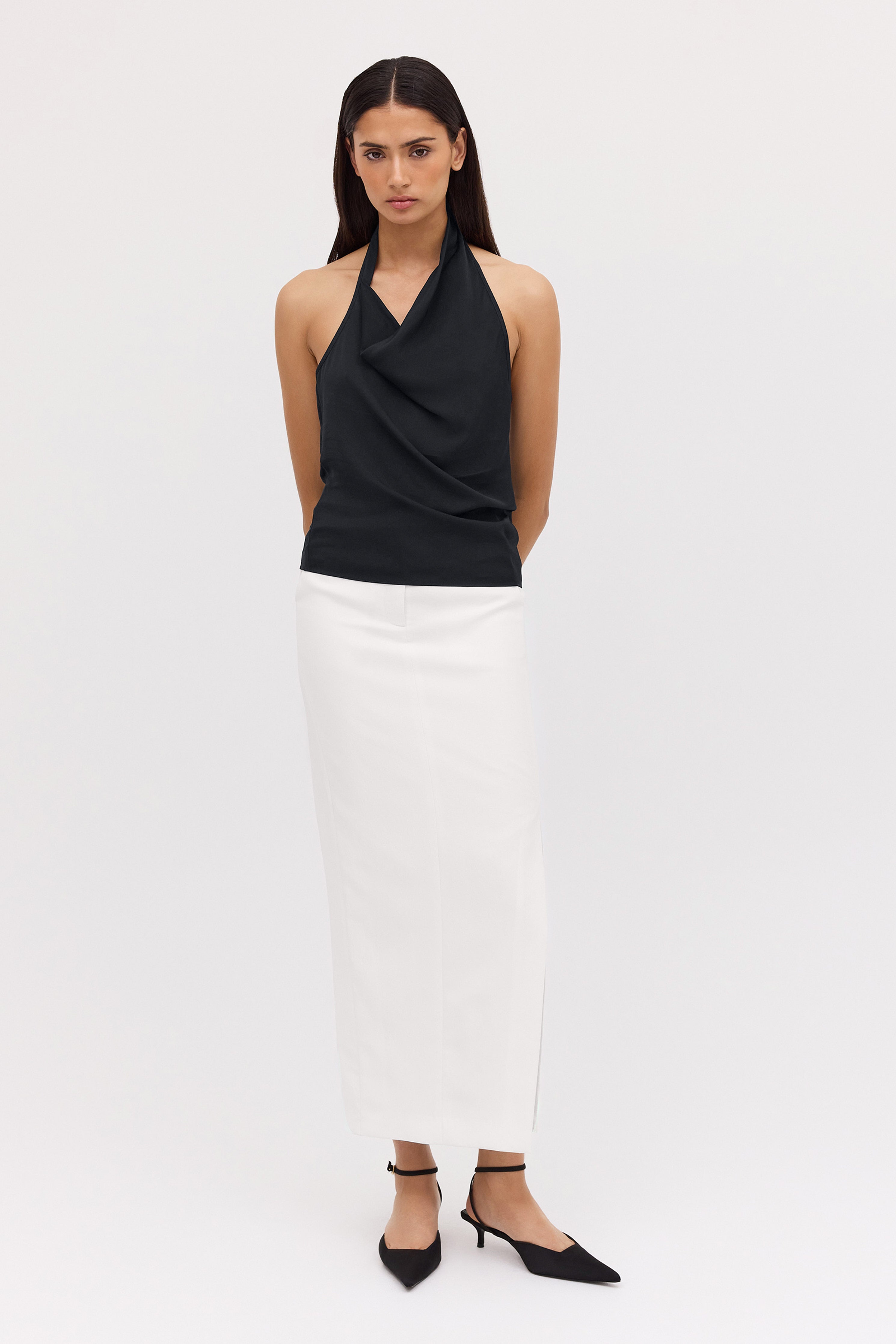 The Sync Top, cut from fluid black satin, features Bianca's signature liquid drape and a modern asymmetrical cowl neckline. Designed to be worn with the Black Satin Tondo Pant, this versatile piece may also be worn separately. We love this styled back with a crisp white trouser or linen skirt.