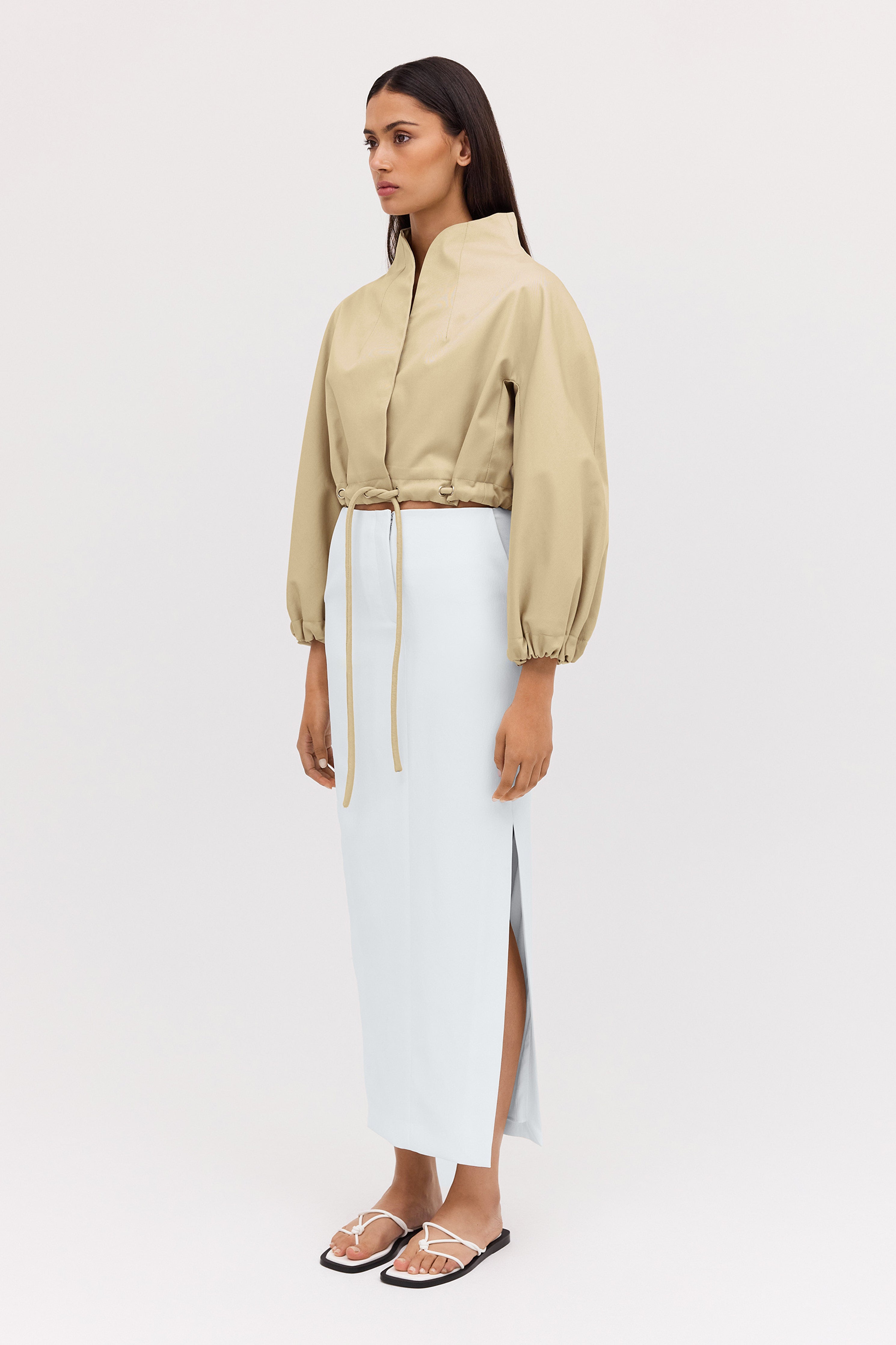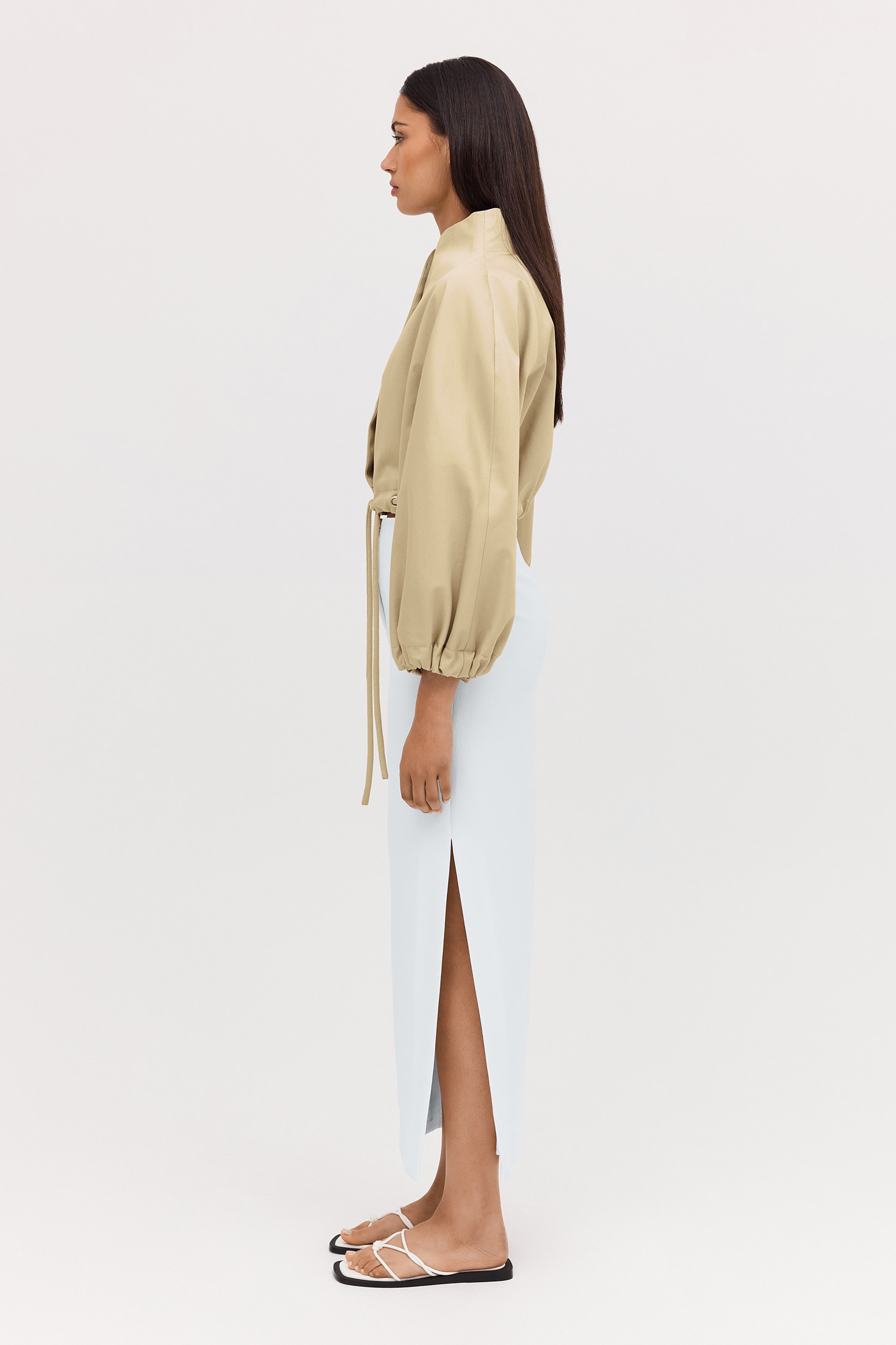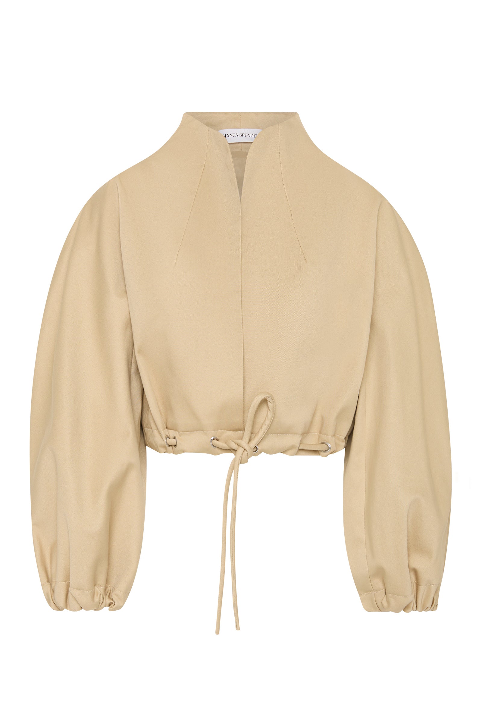 Playing with volume, true to the aviation styles that inspired it, this relaxed, soft-silhouette bomber jacket is made from 100% Cotton fabric, featuring eyelets and a drawstring waist - synonymous with our Bianca Spender, and has statement puffed sleeves.