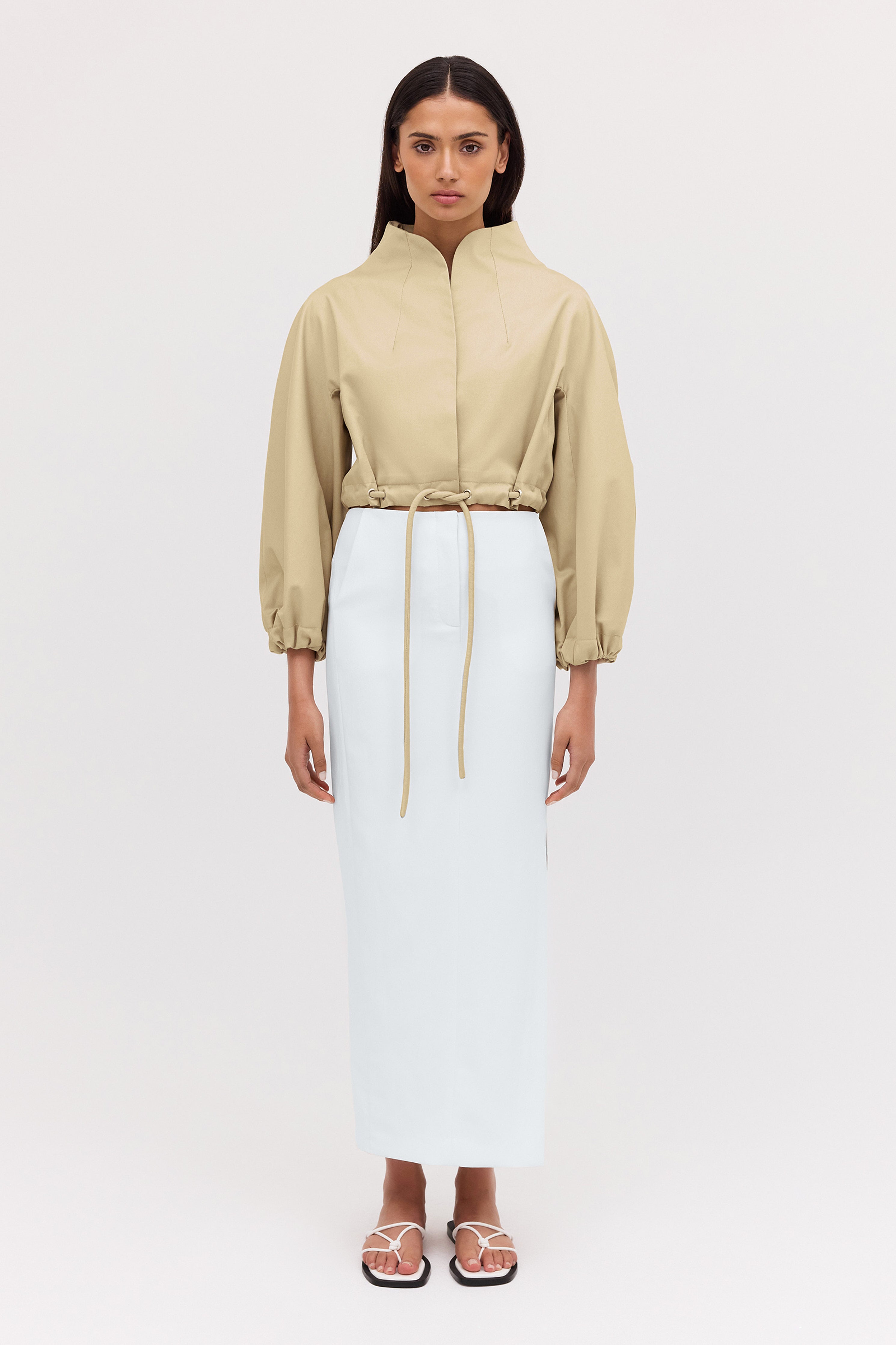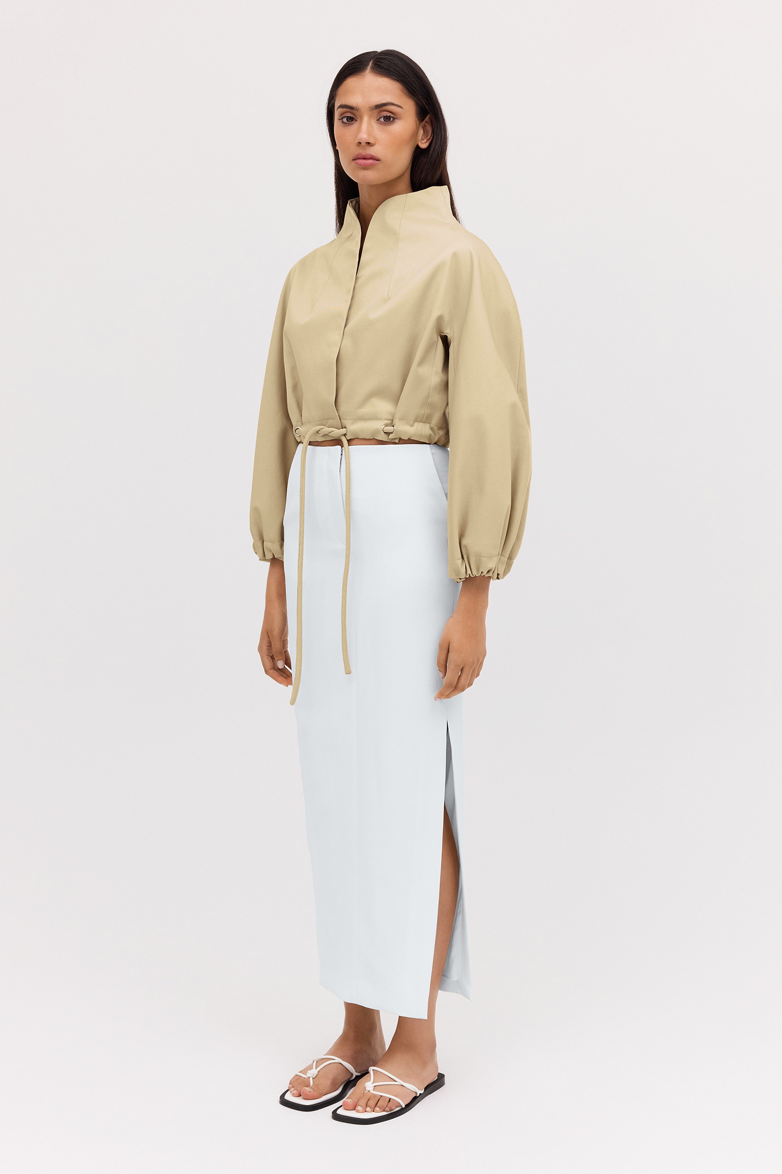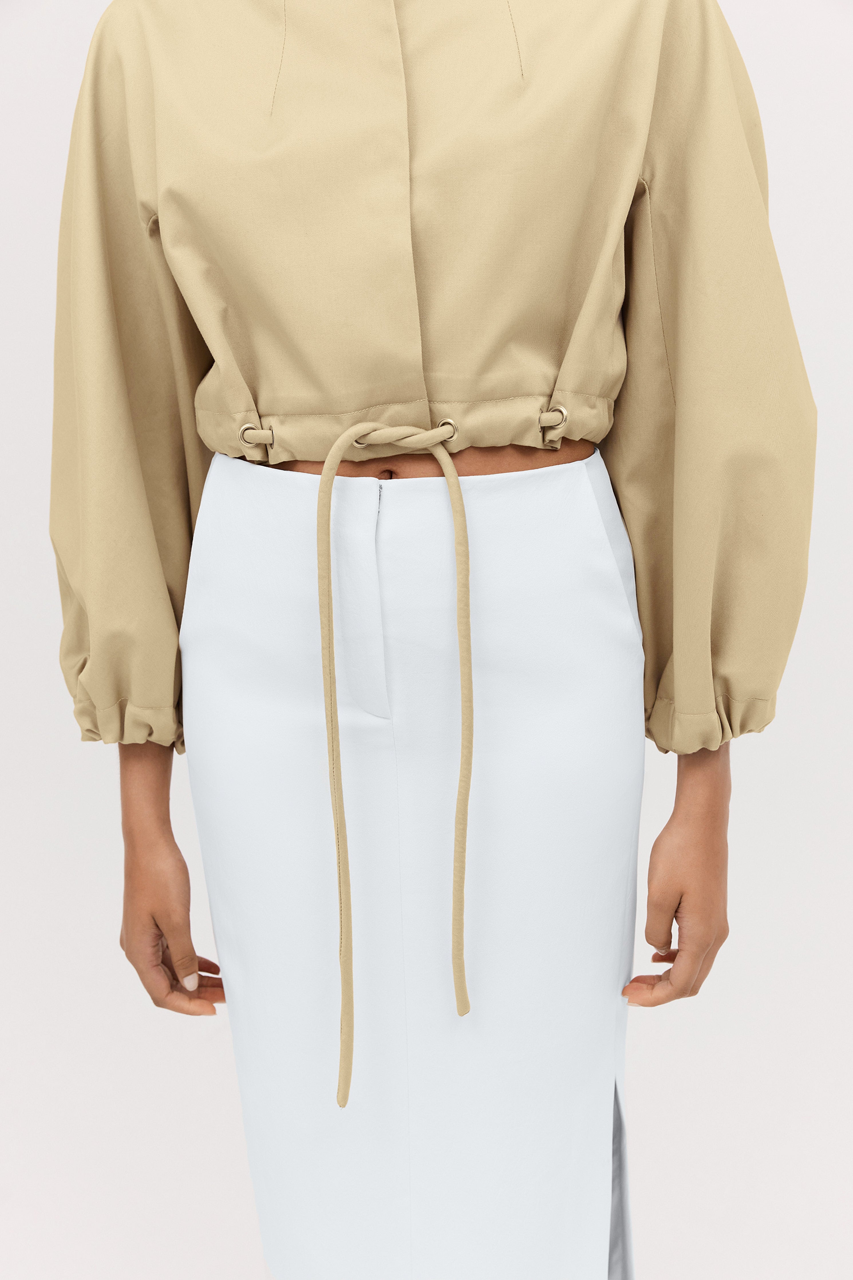 Playing with volume, true to the aviation styles that inspired it, this relaxed, soft-silhouette bomber jacket is made from 100% Cotton fabric, featuring eyelets and a drawstring waist - synonymous with our Bianca Spender, and has statement puffed sleeves.