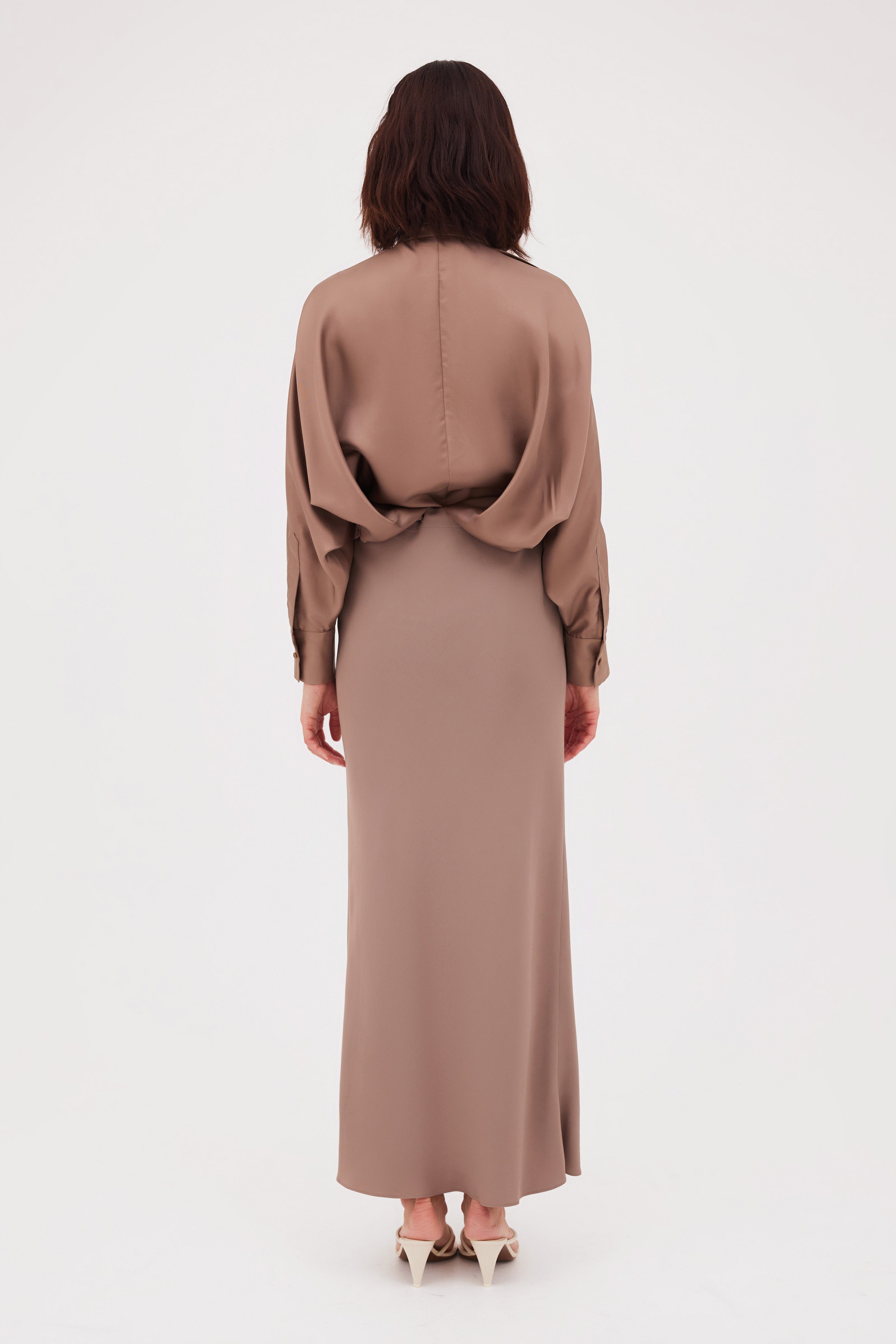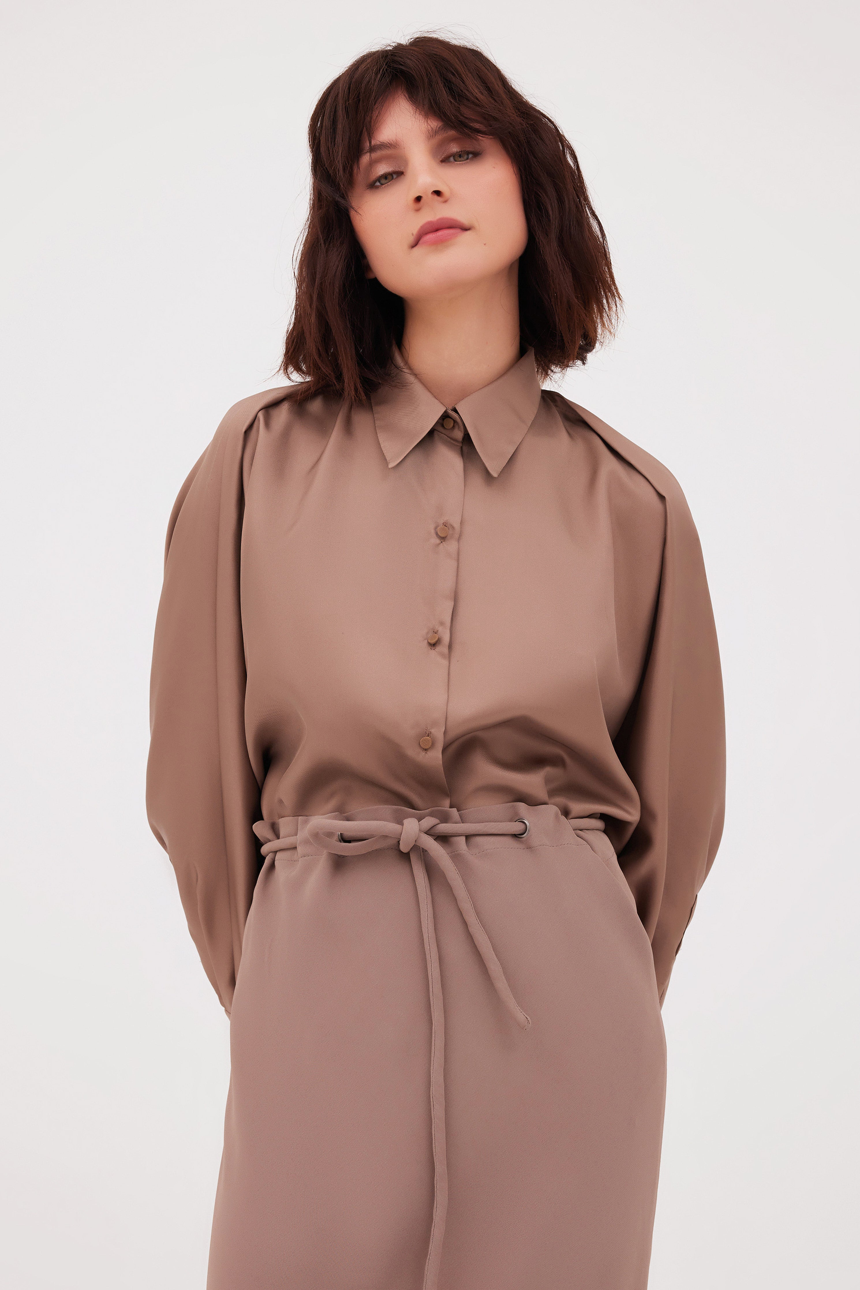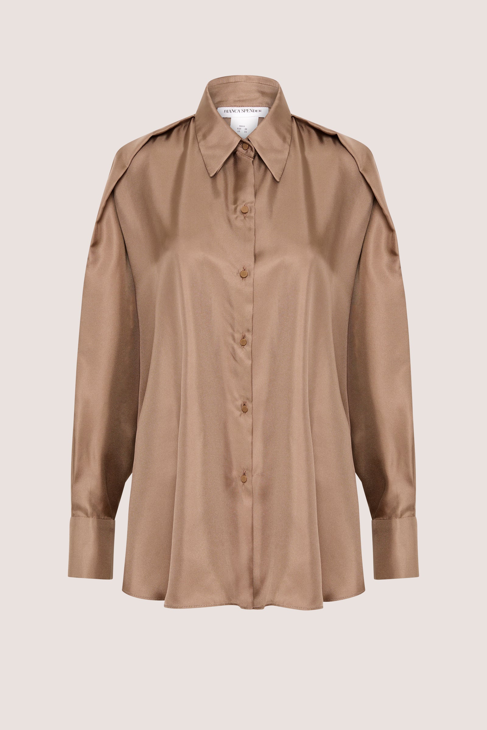 Effortless volume, drape and unexpected fold details bring ease and modernity to the typical tailored shirt. The Epitome Shirt in our deadstock (remnant) Taupe Silk fabric highlights relaxed tailoring, suitable to be dressed up or down.