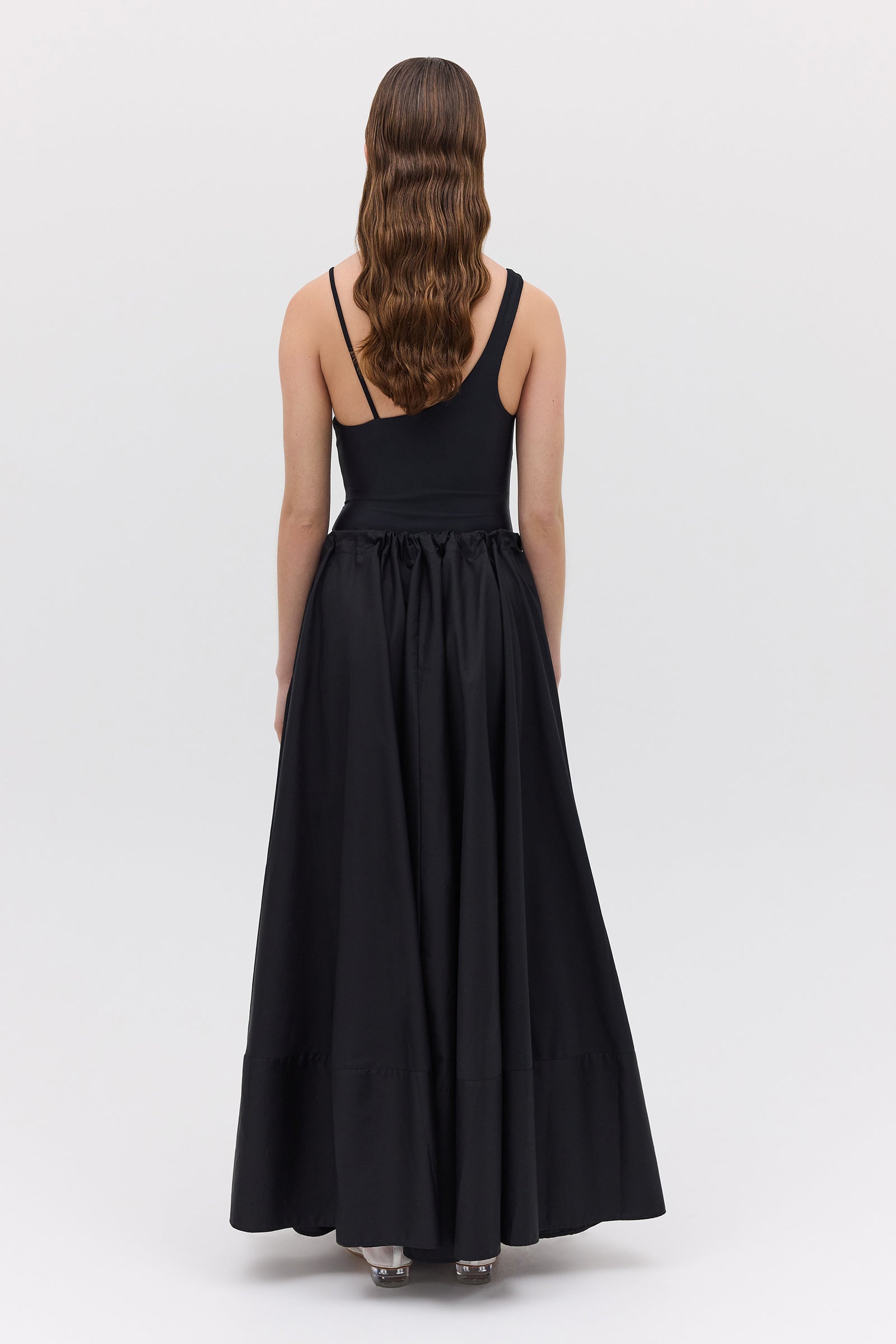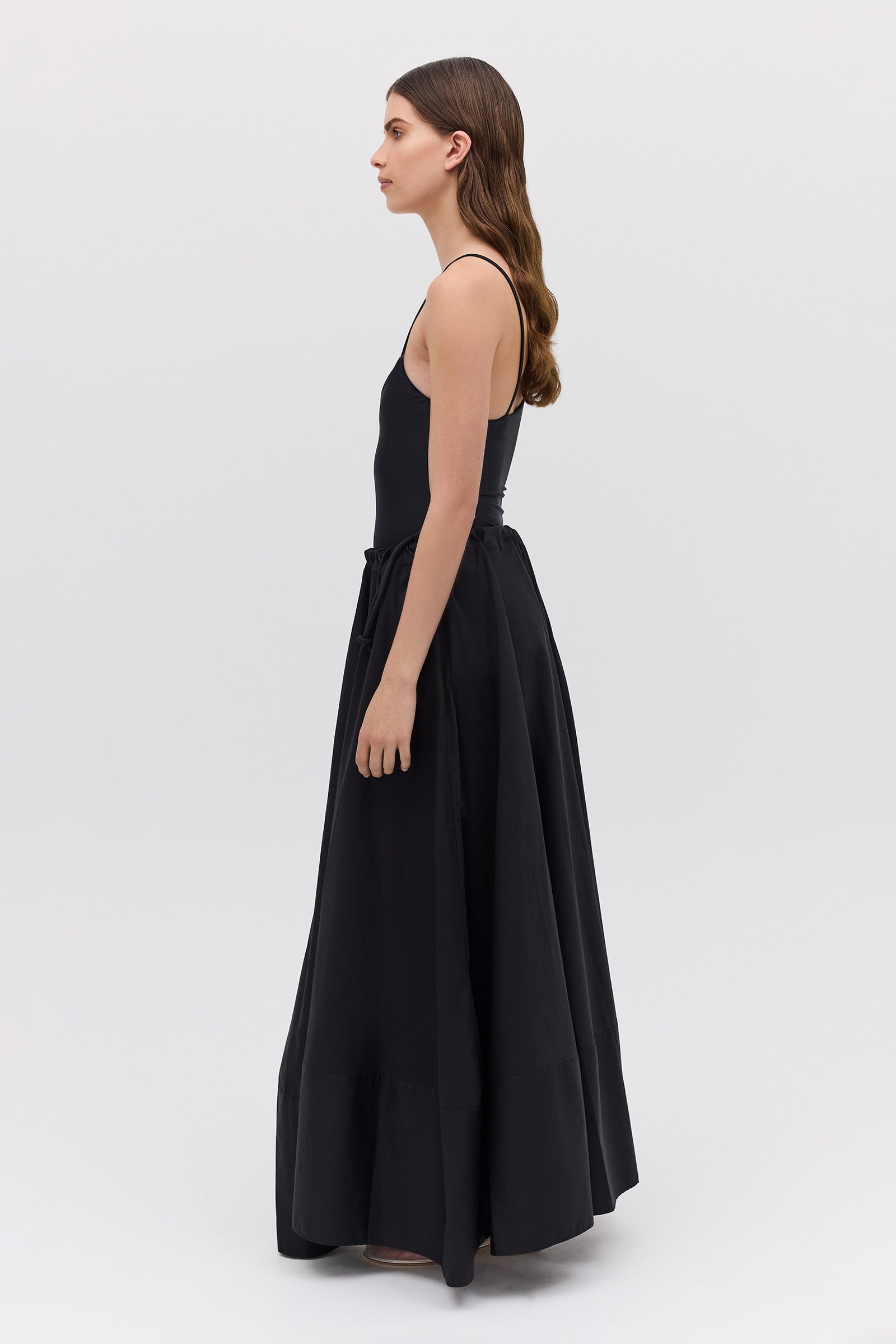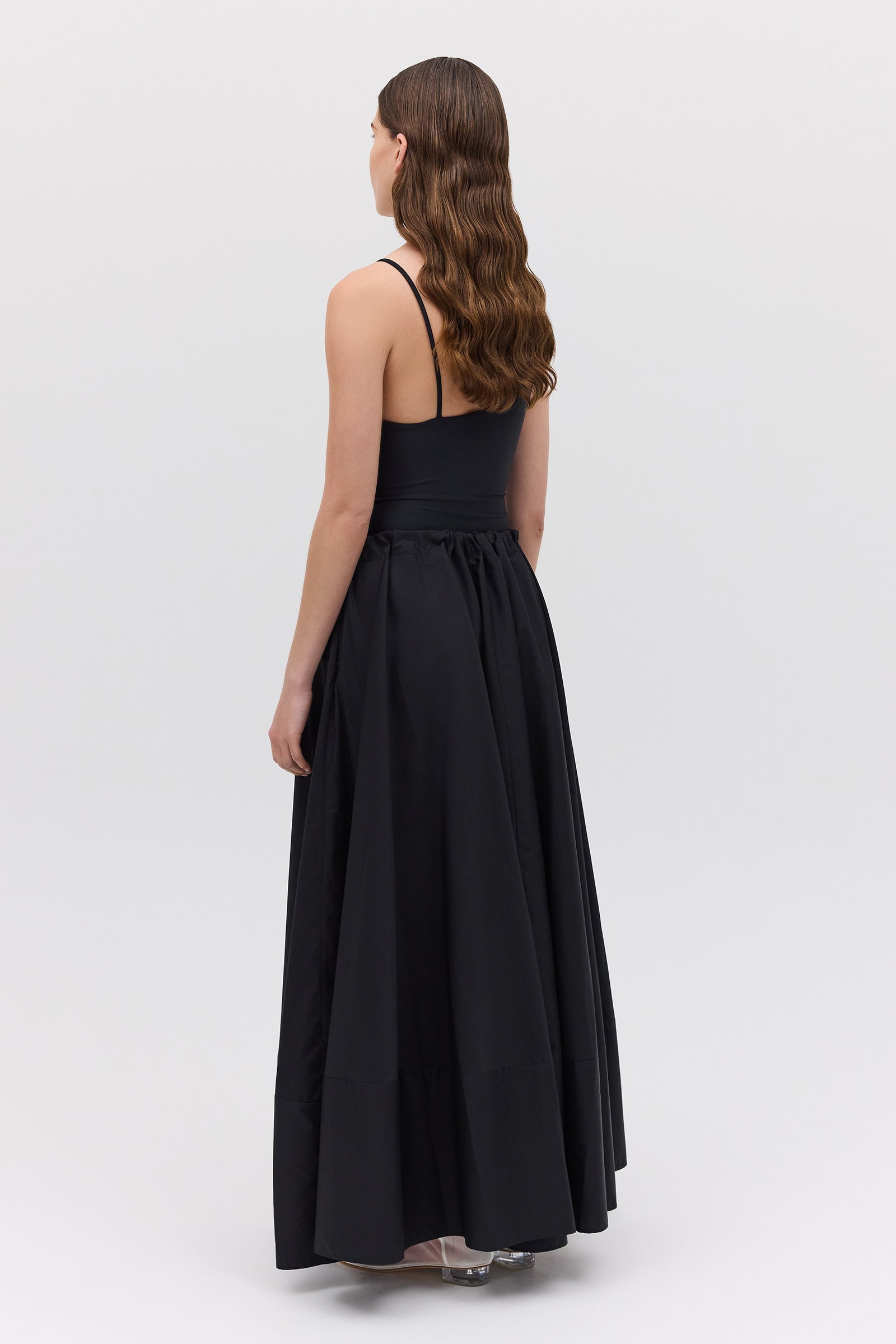 An evolution of the beloved Effuse Skirt, the Santana Skirt reinterprets its fluid silhouette in crisp black cotton. The result is a voluminous yet grounded piece that captures movement through form rather than fabric. Falling from a soft, gathered drawstring waist, the skirt creates effortless volume and gentle structure, offering an elevated take on summer ease. The cotton fabrication lends a sense of polish and wearability, perfect for both day and evening moments.