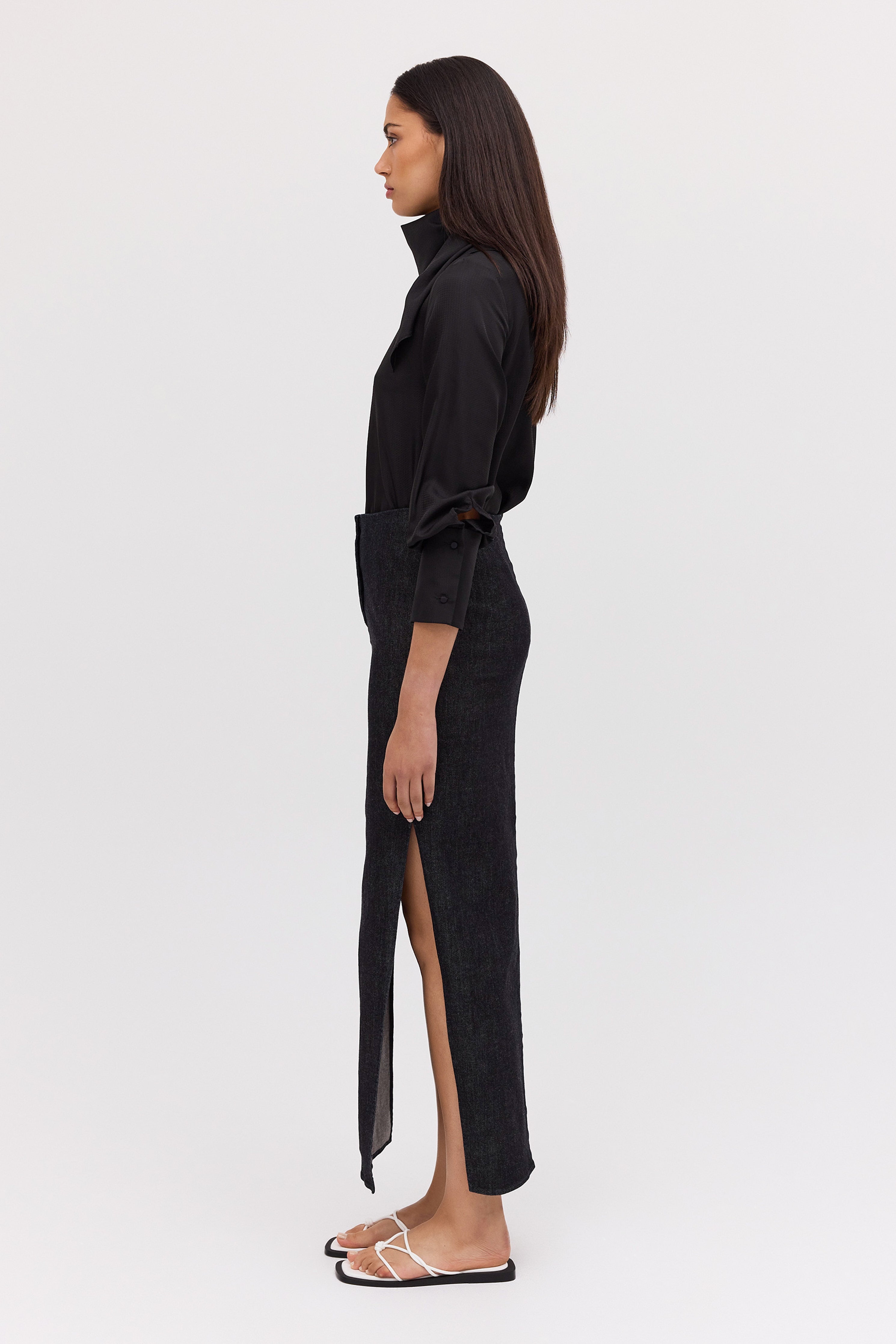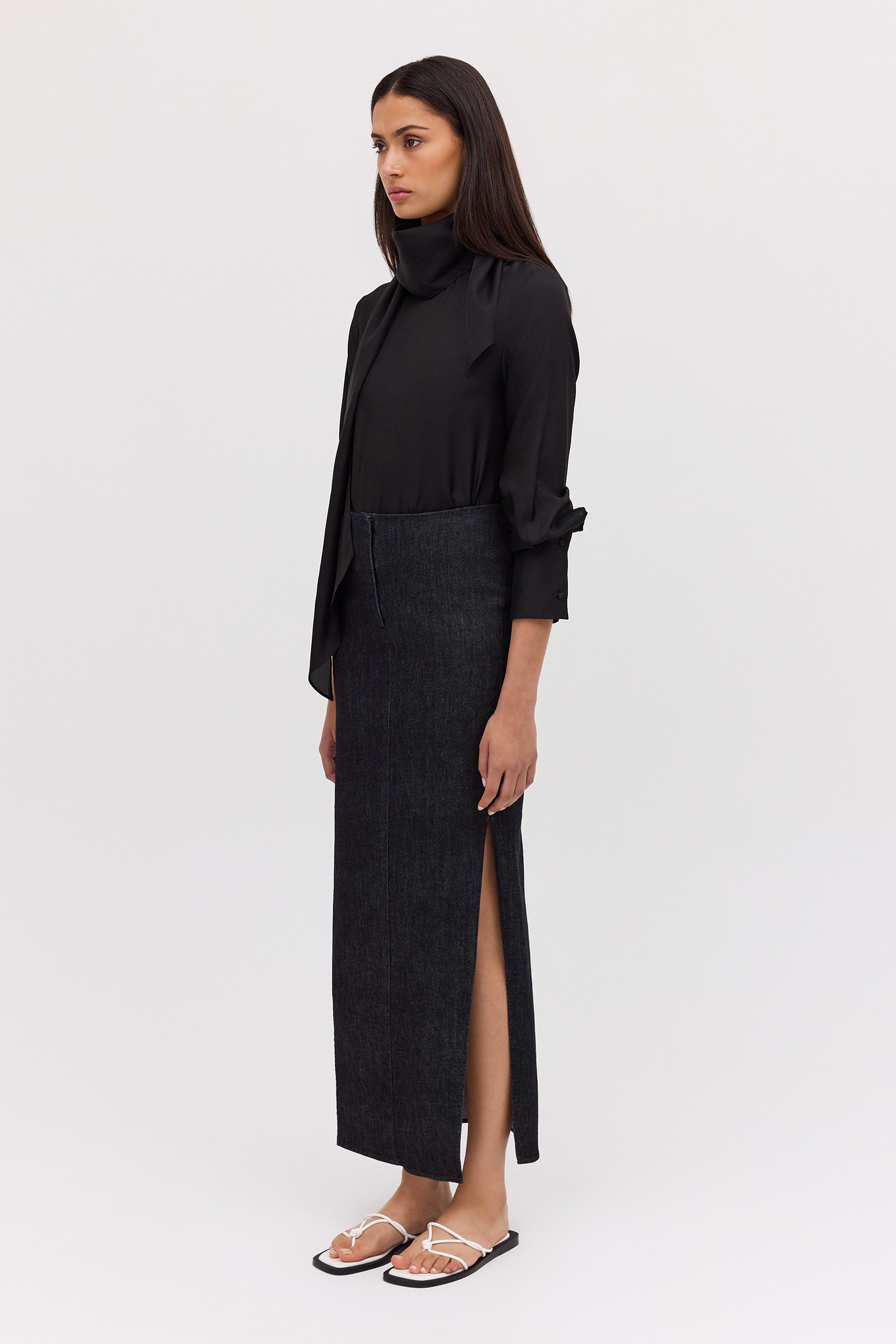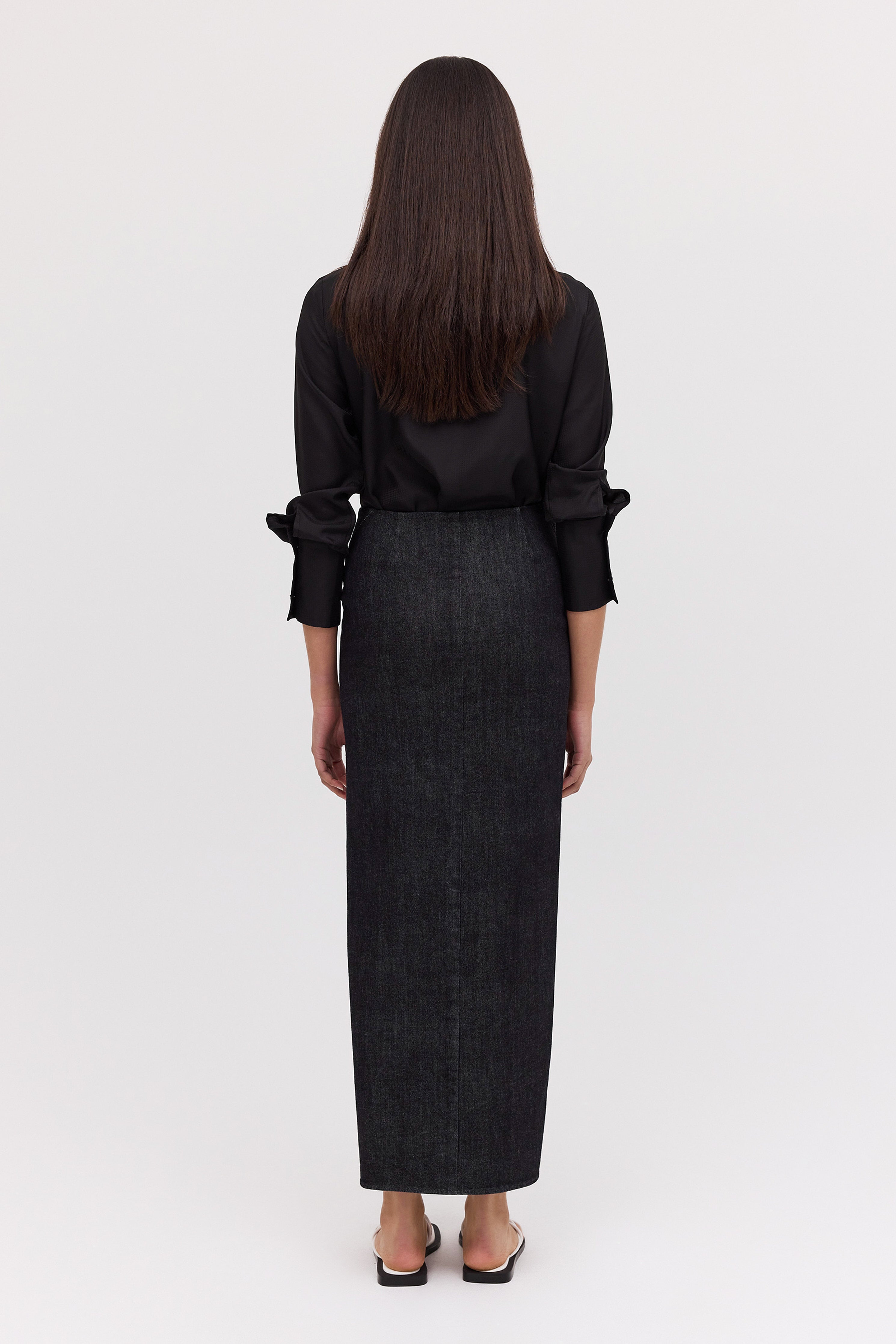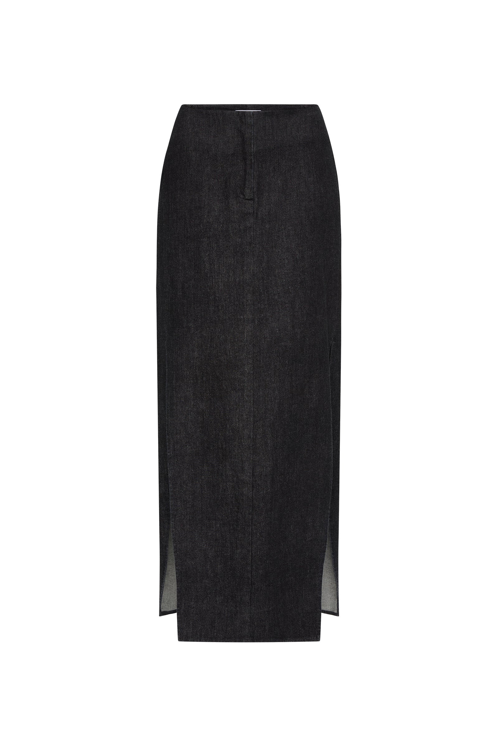 Elevate your everyday with the Black Denim Basis Skirt. Crafted from a luxurious mid-weight denim, featuring slight stretch to allow ease of movement. This versatile piece can easily take you from the 9 - 5 and beyond.