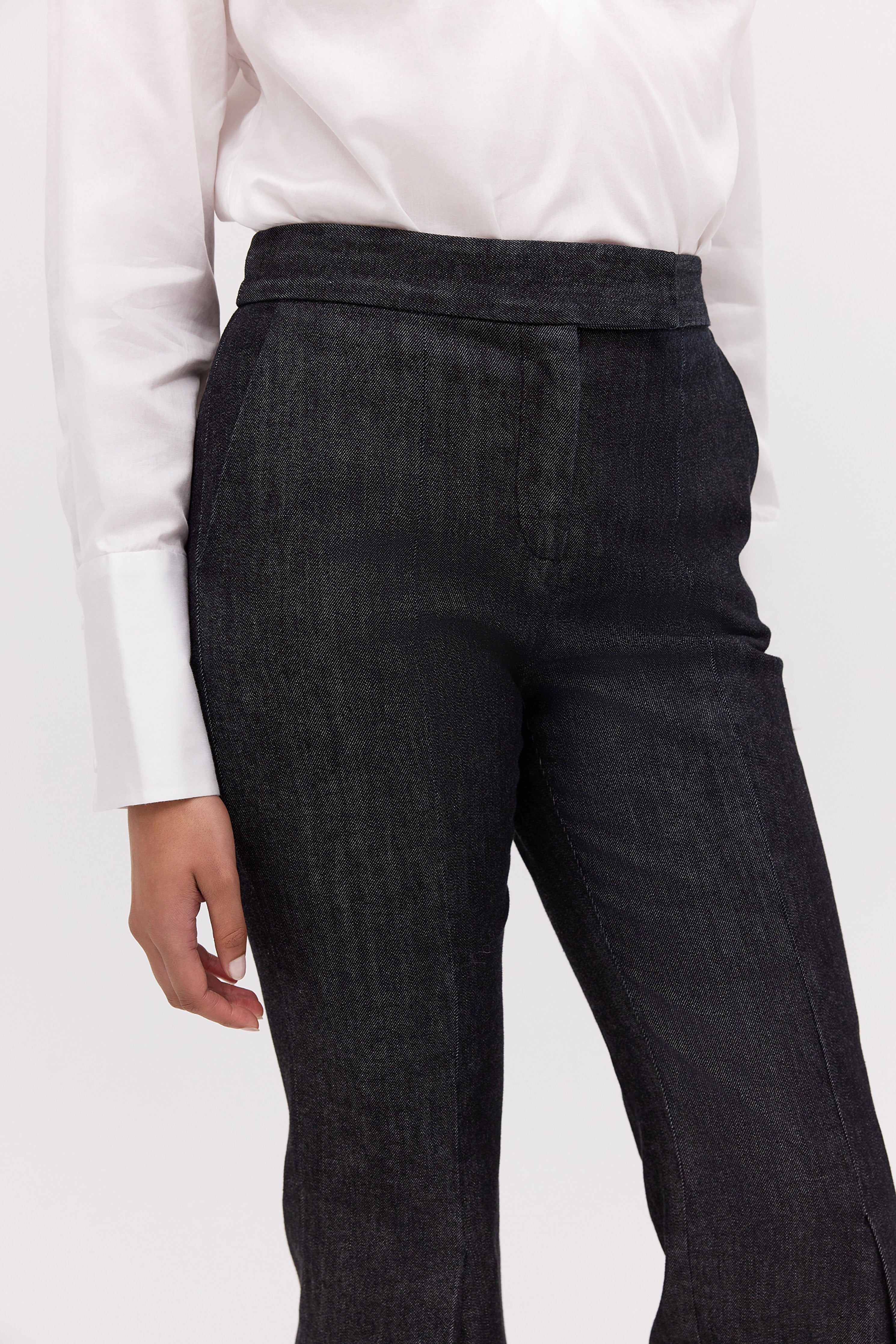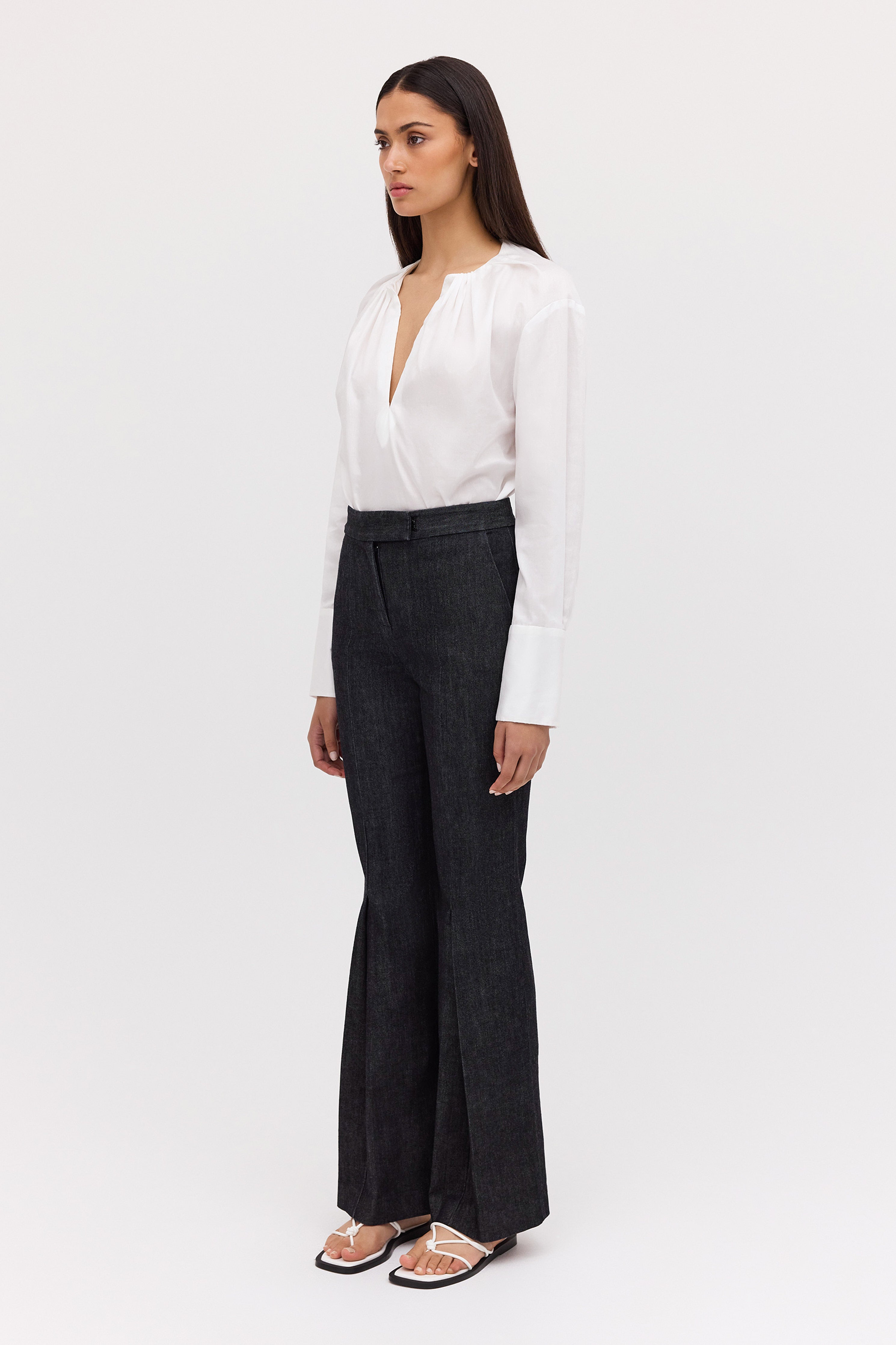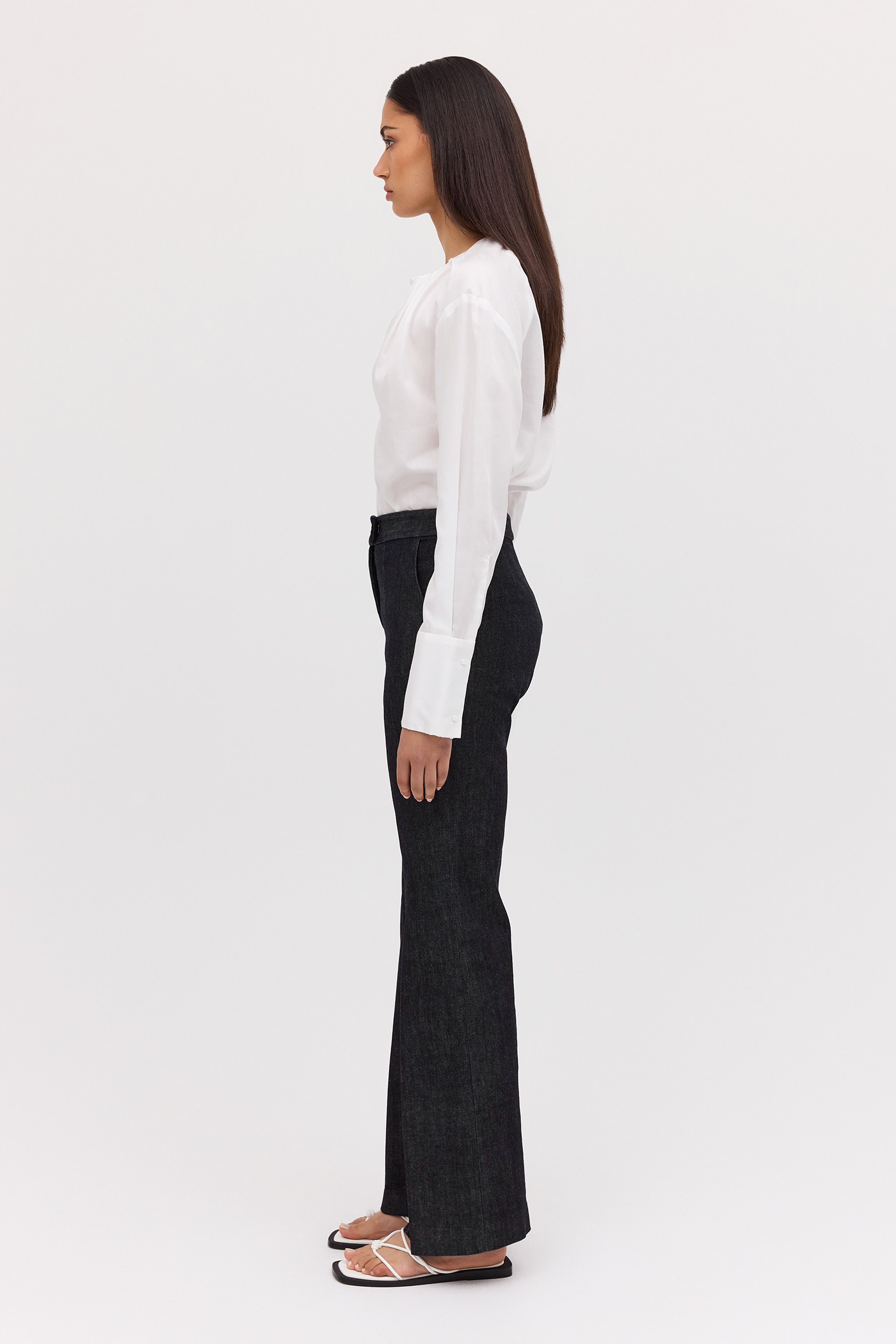 No one cuts a trouser like Bianca Spender, and this longline number is no exception. Our best-selling Celina Pant, is now available in new season black denim. Most-loved for their slick, longline fit, the Celina Pant features a centre pressed leg and inside hem split to draw the eye downward and elongate the frame, falling on top of the shoe. The waistband has a tab extension that fastens with a hidden hook and eye.
