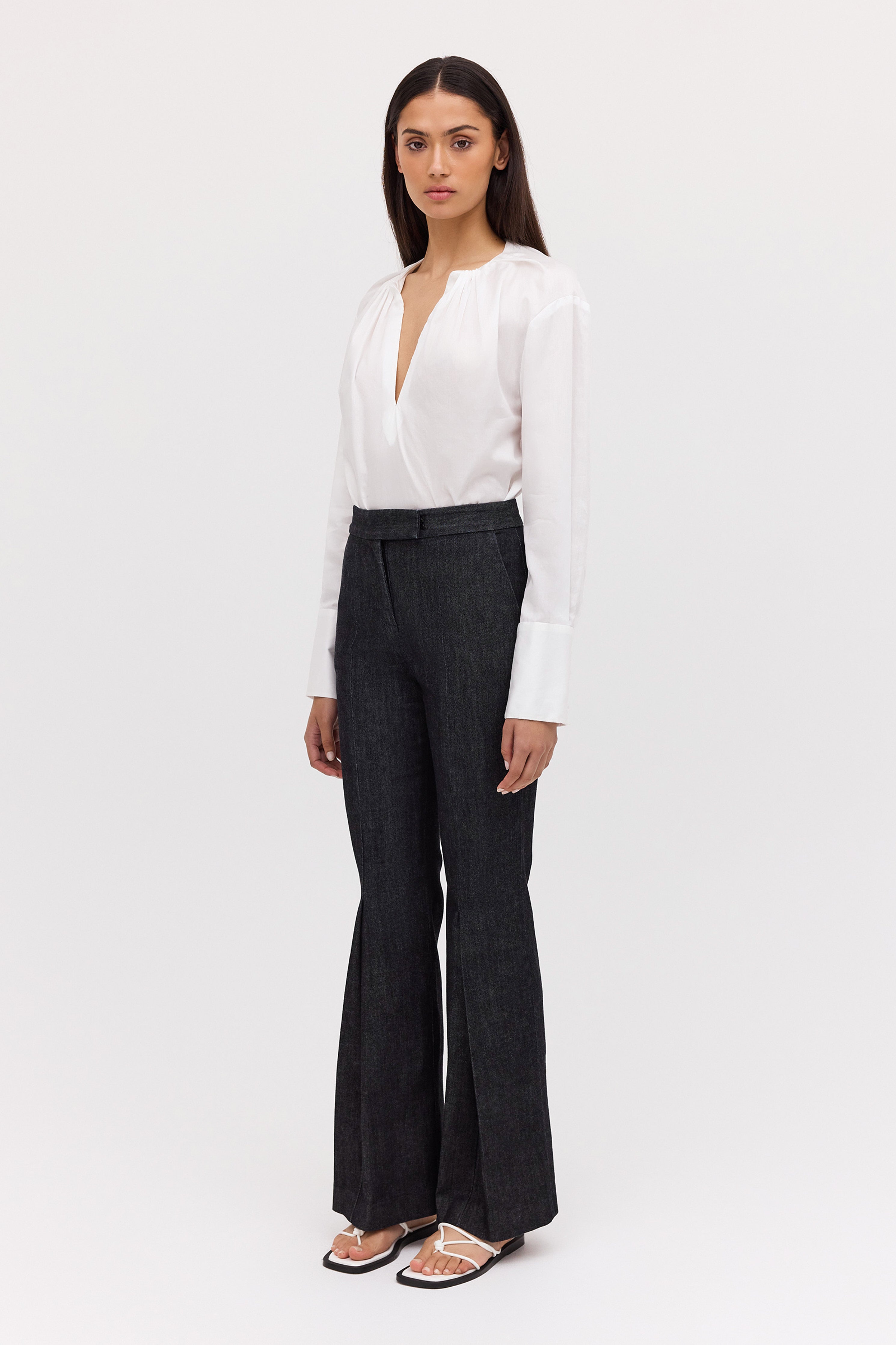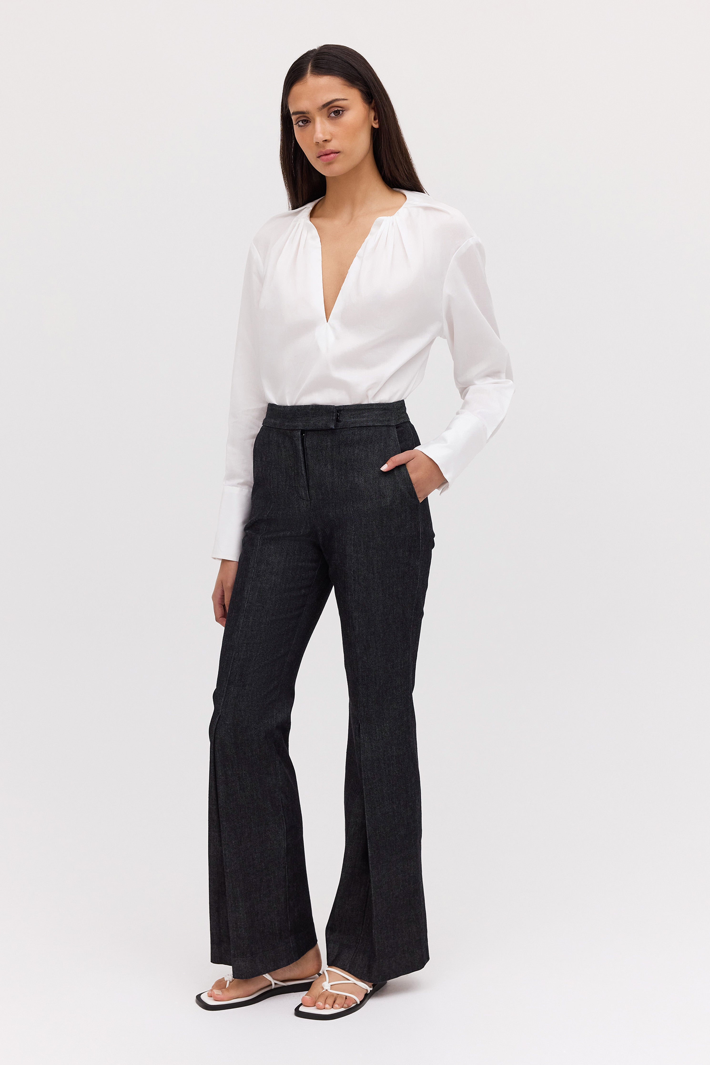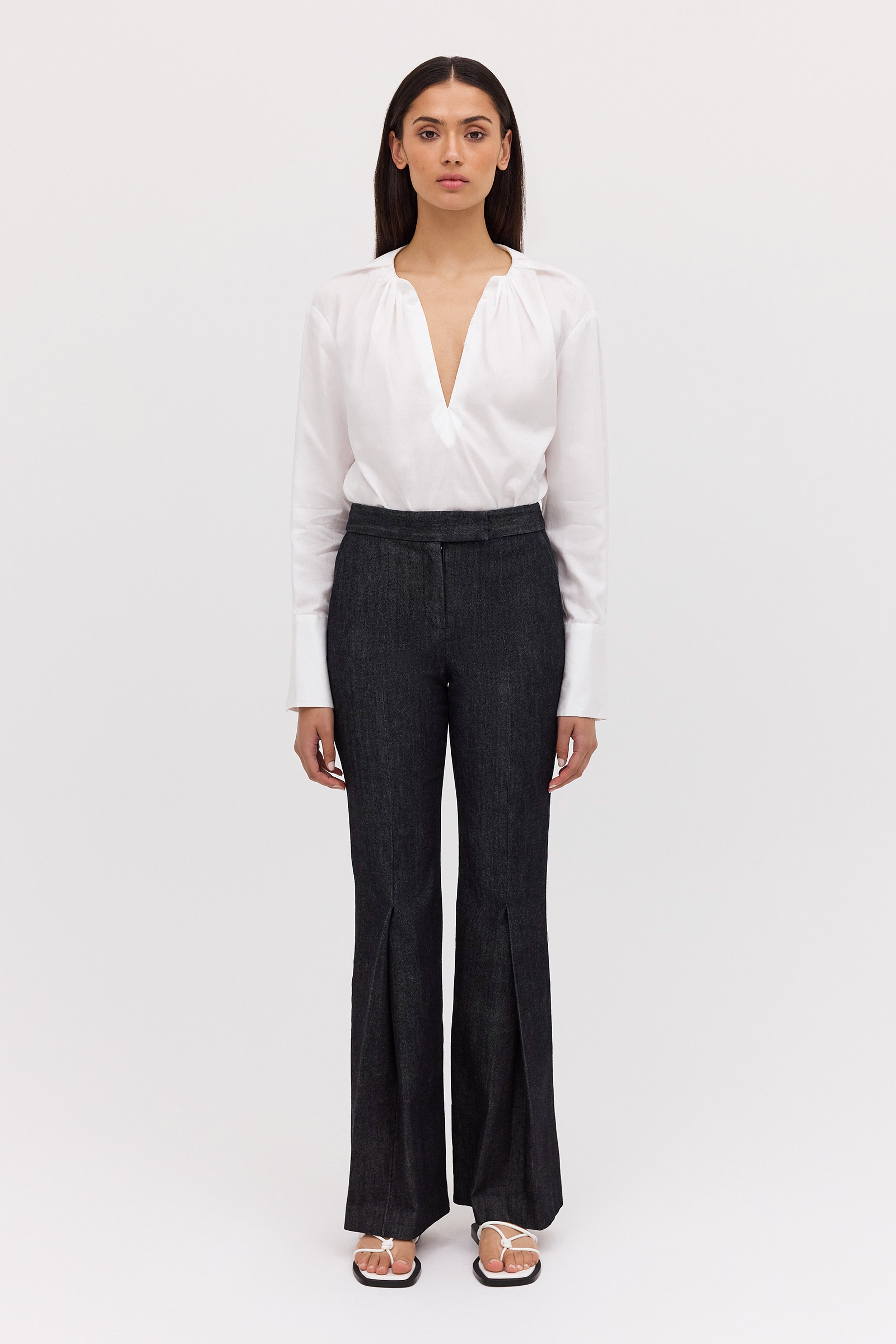 No one cuts a trouser like Bianca Spender, and this longline number is no exception. Our best-selling Celina Pant, is now available in new season black denim. Most-loved for their slick, longline fit, the Celina Pant features a centre pressed leg and inside hem split to draw the eye downward and elongate the frame, falling on top of the shoe. The waistband has a tab extension that fastens with a hidden hook and eye.
