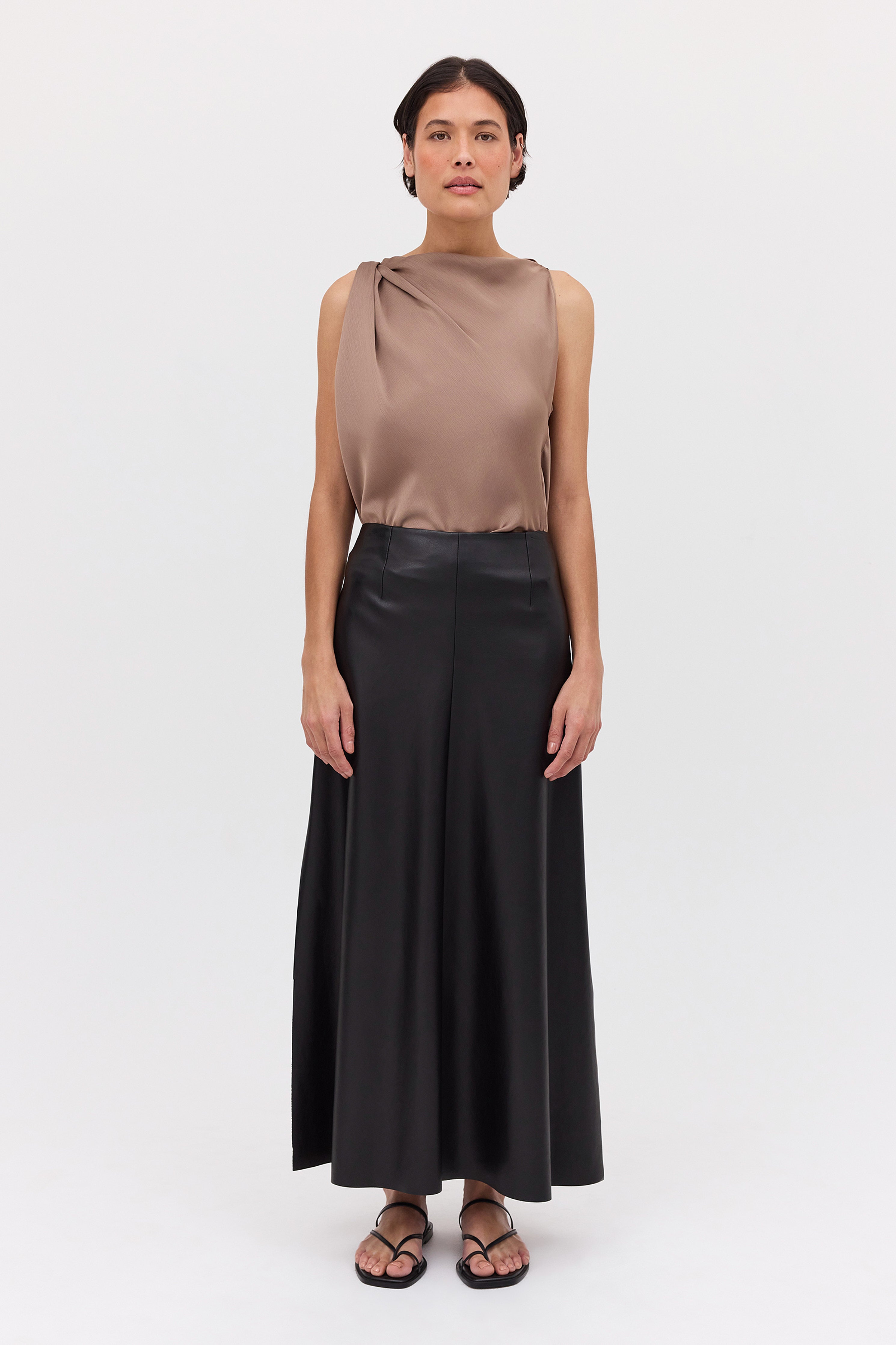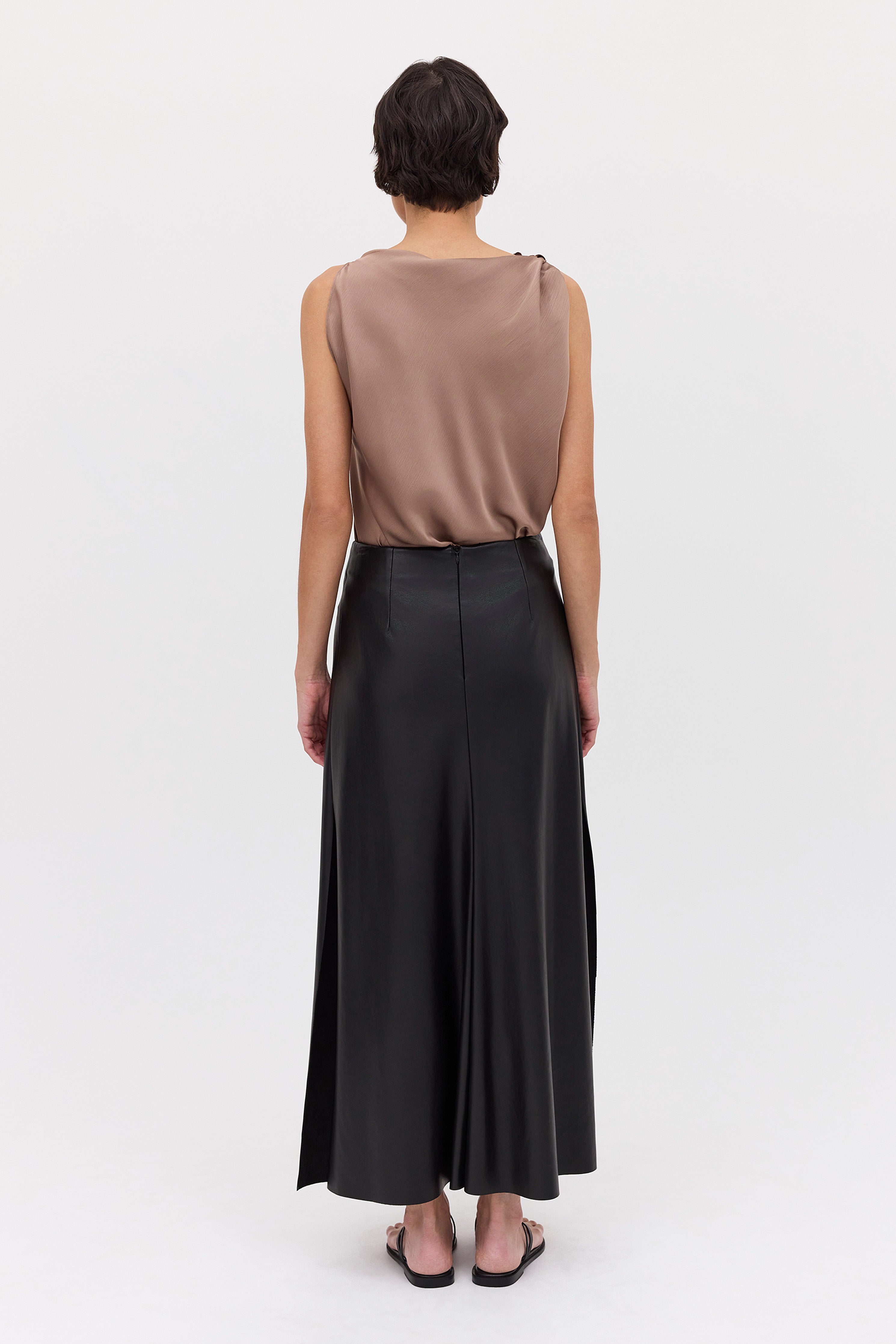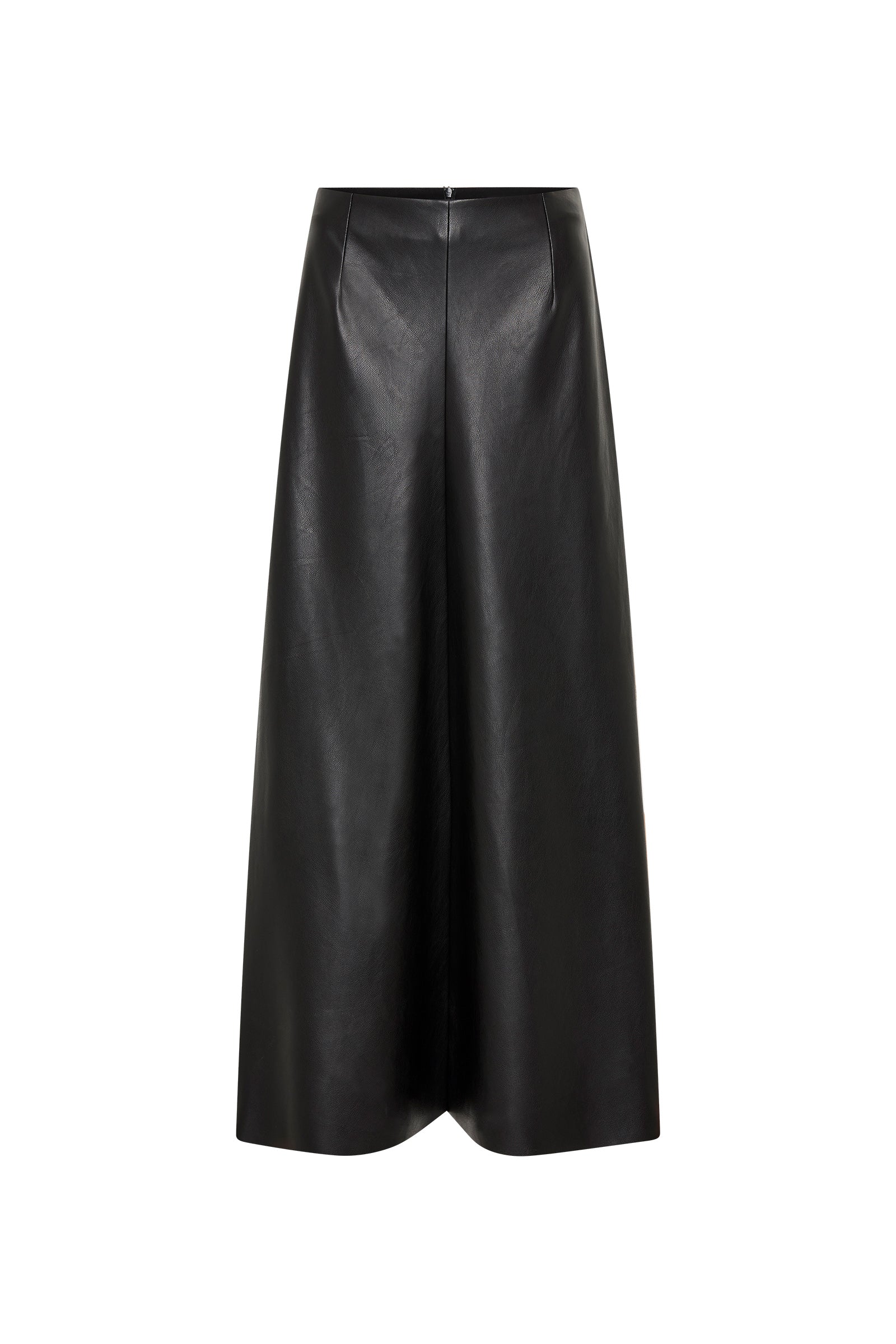 The Black Leatherette Stephanie Skirt is the perfect foundational piece for your wardrobe. Crafted from a lightweight yet sculptural cruelty-free leatherette, the Stephanie Skirt features a fixed waistband, with a skirt that flows from the hip, draping the body in gentle folds. A subtle split at the front allows your body to move freely.