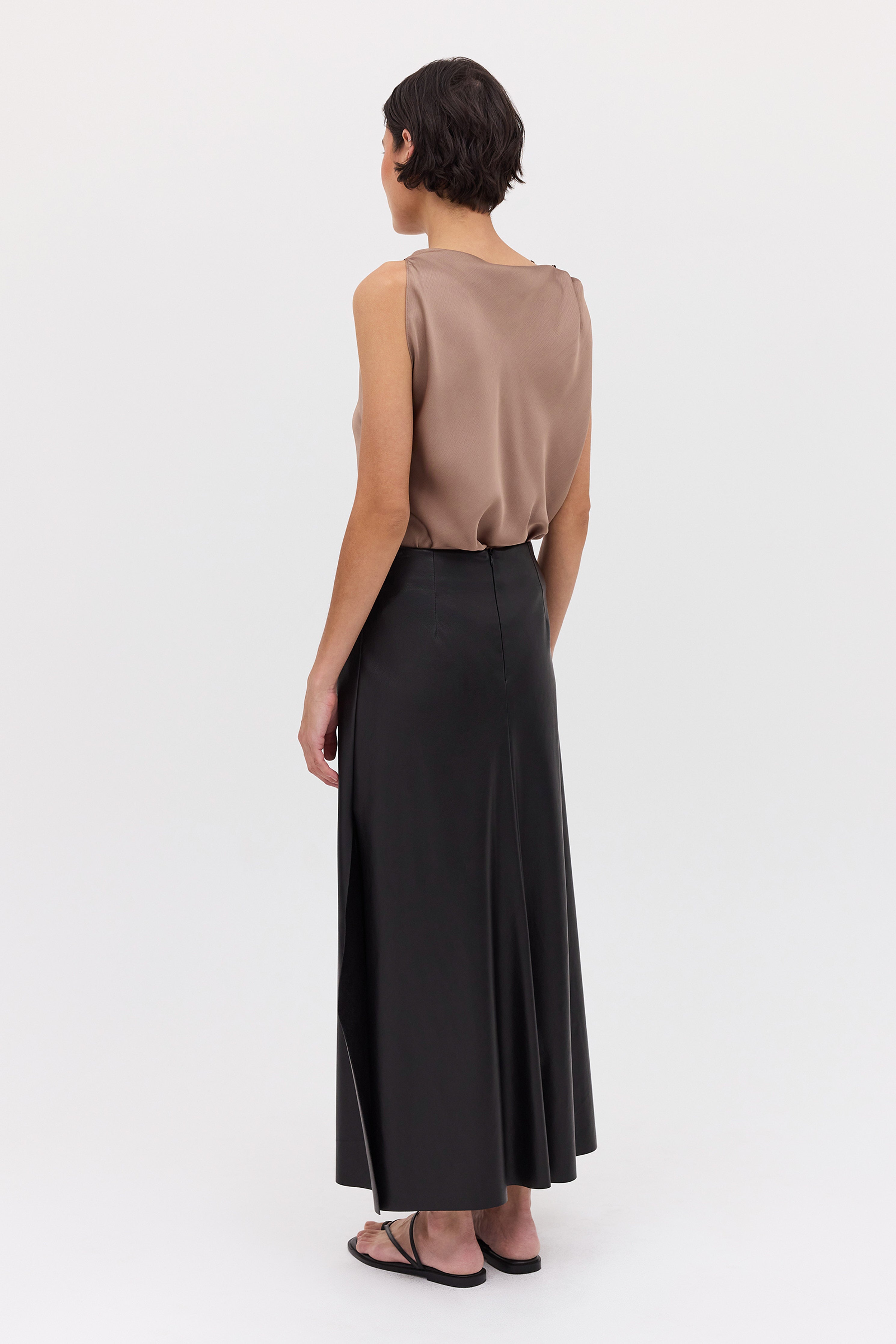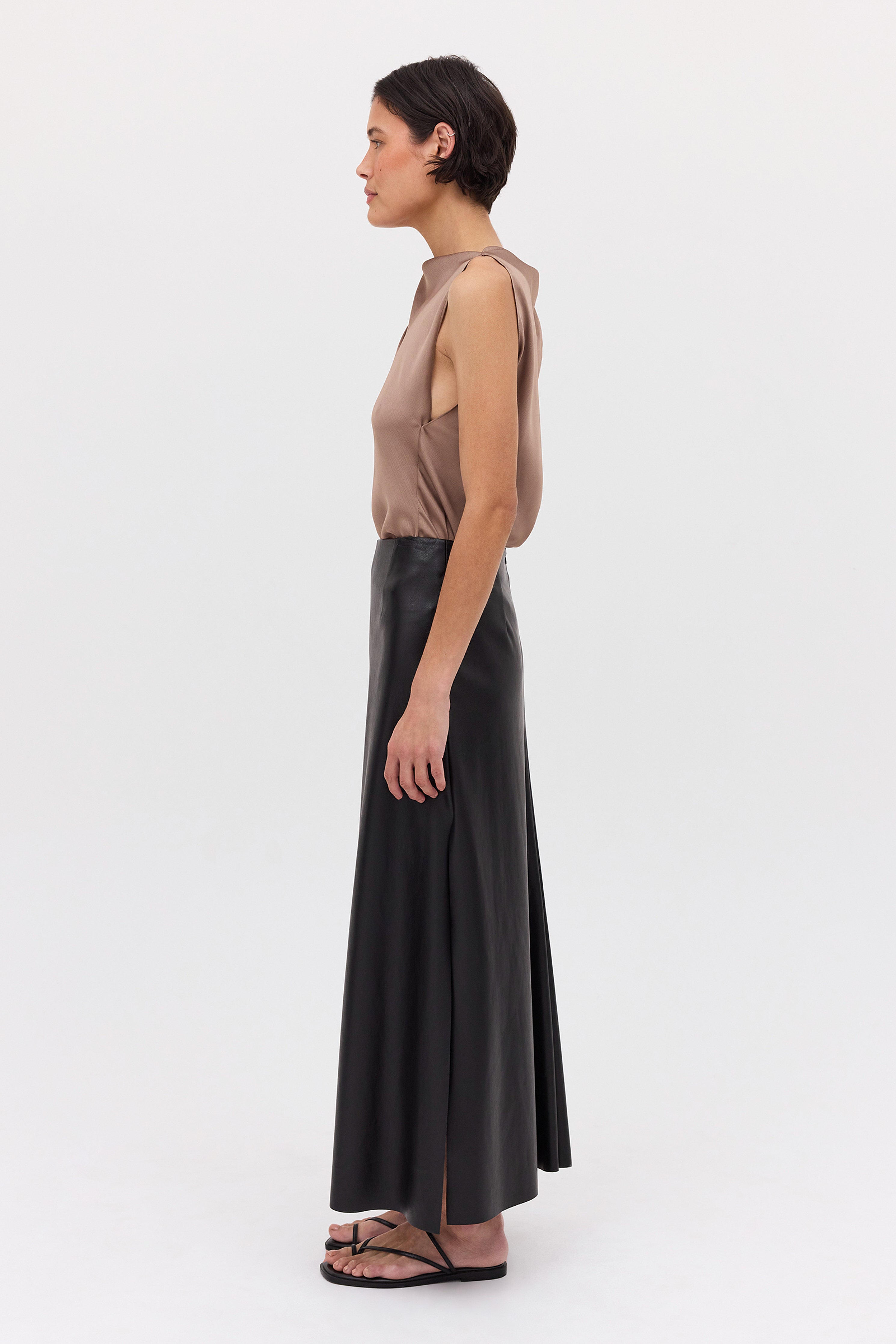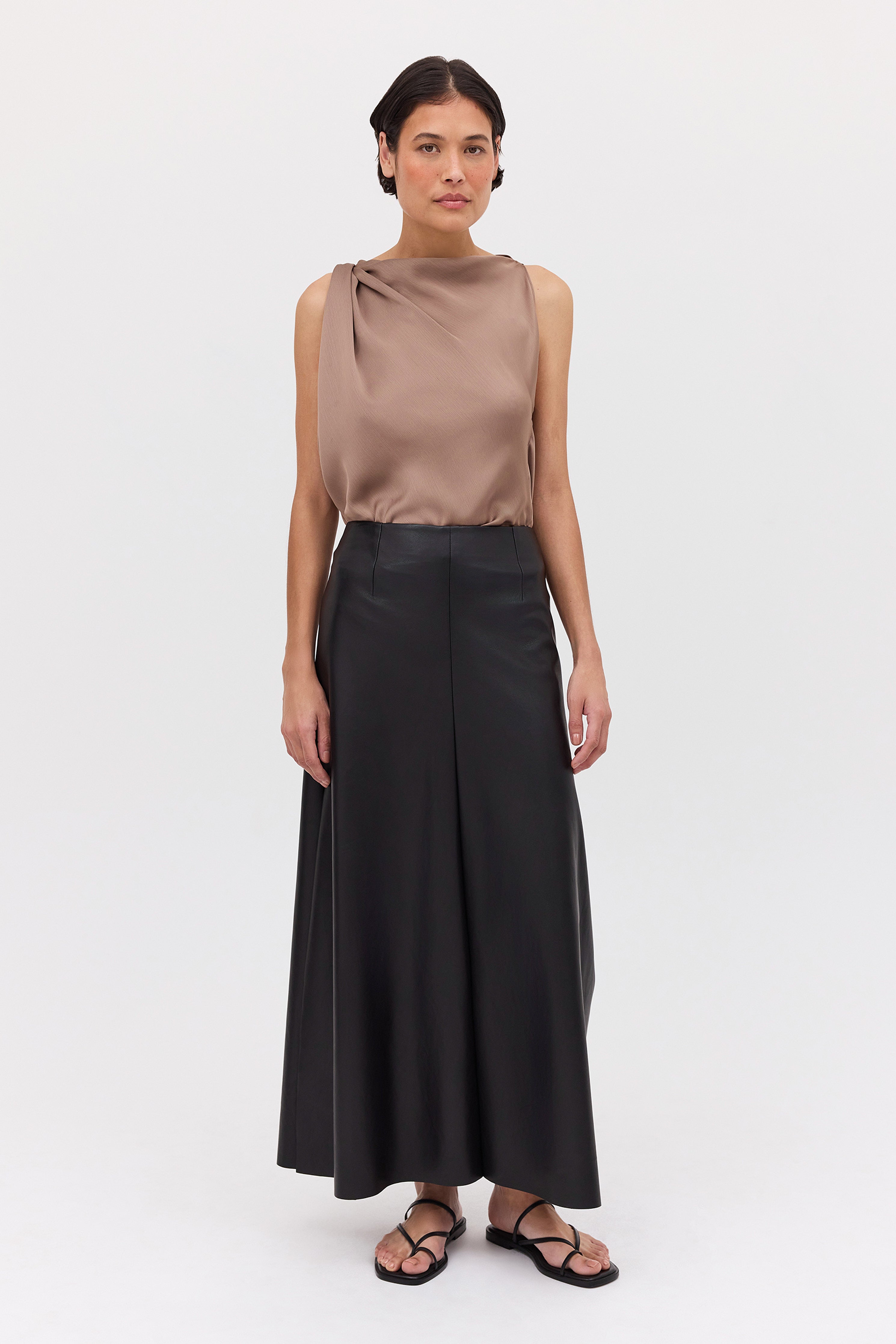 The Black Leatherette Stephanie Skirt is the perfect foundational piece for your wardrobe. Crafted from a lightweight yet sculptural cruelty-free leatherette, the Stephanie Skirt features a fixed waistband, with a skirt that flows from the hip, draping the body in gentle folds. A subtle split at the front allows your body to move freely.