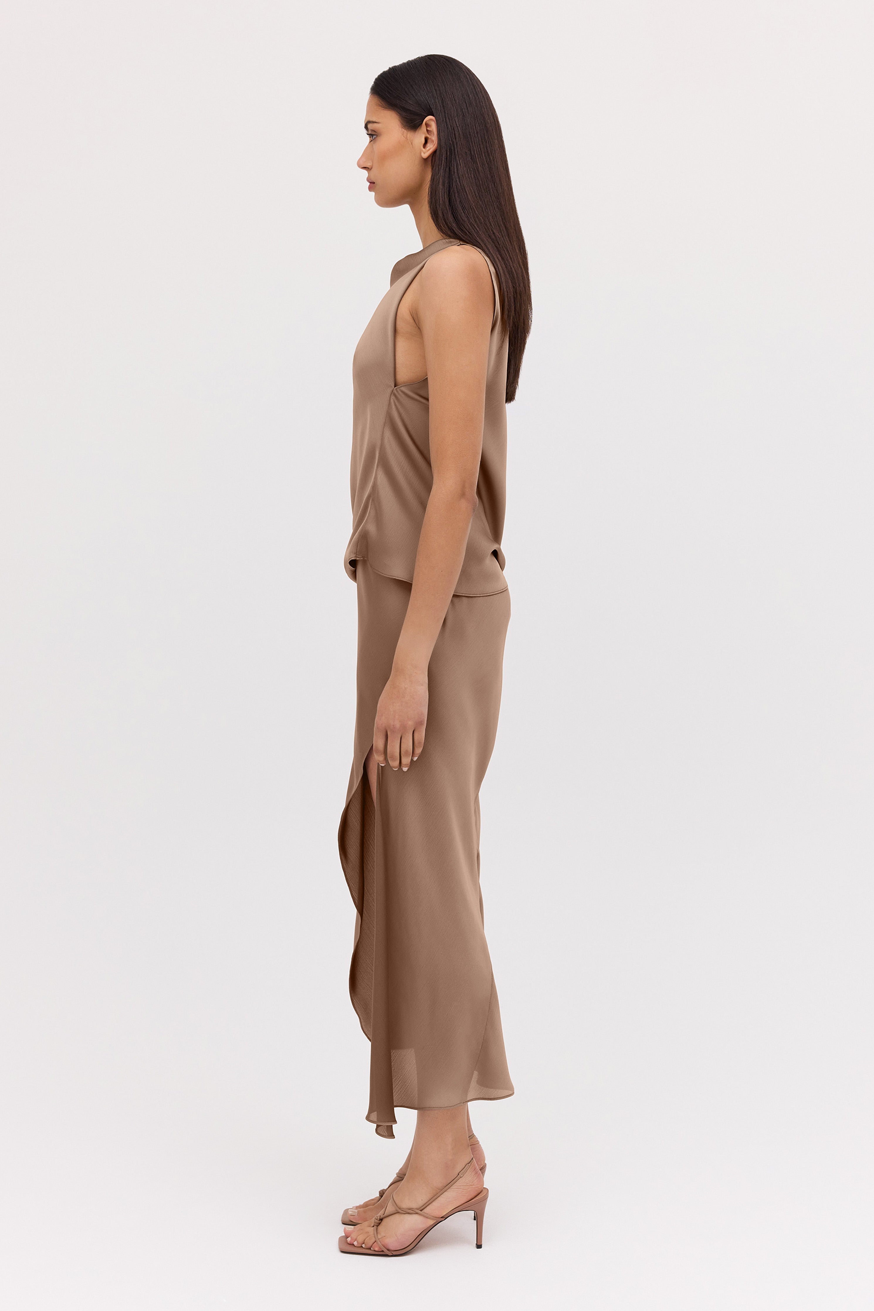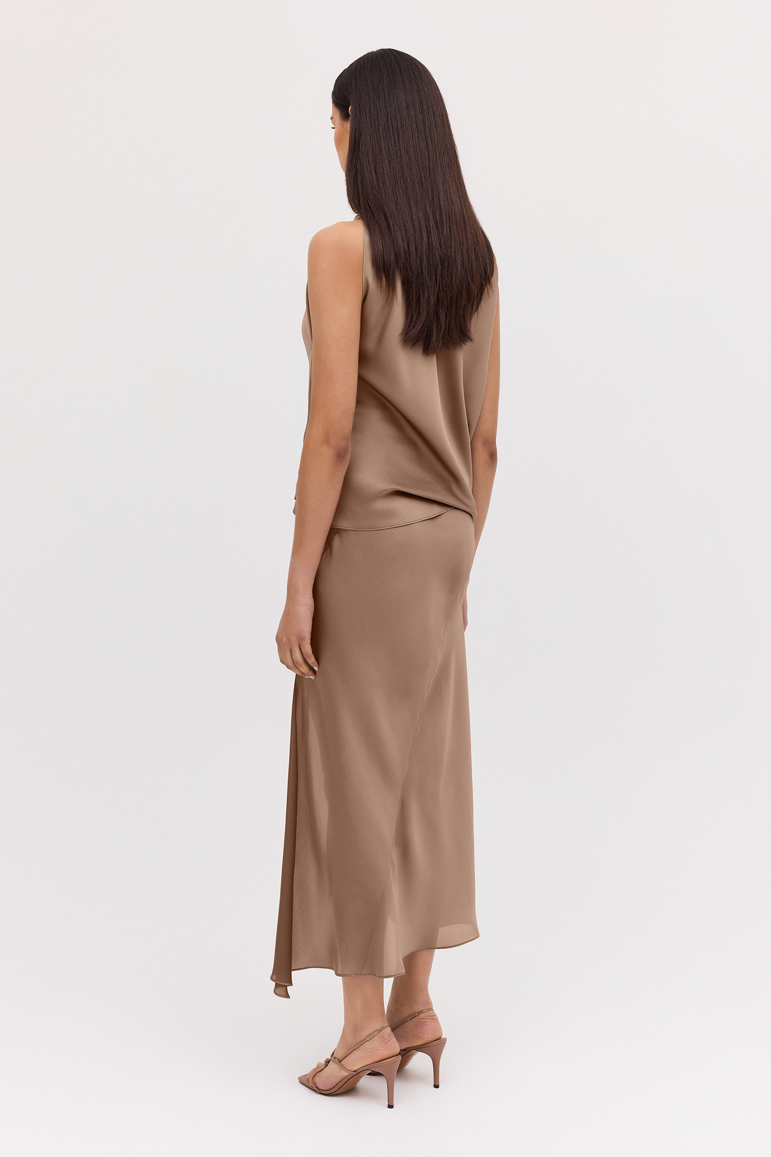 The Oblique pairs back effortlessly with the matching Mushroom Chiffon Roma Top, and would work well with a sharply tailored blazer. The Betty Knot Heel adds the final detail.