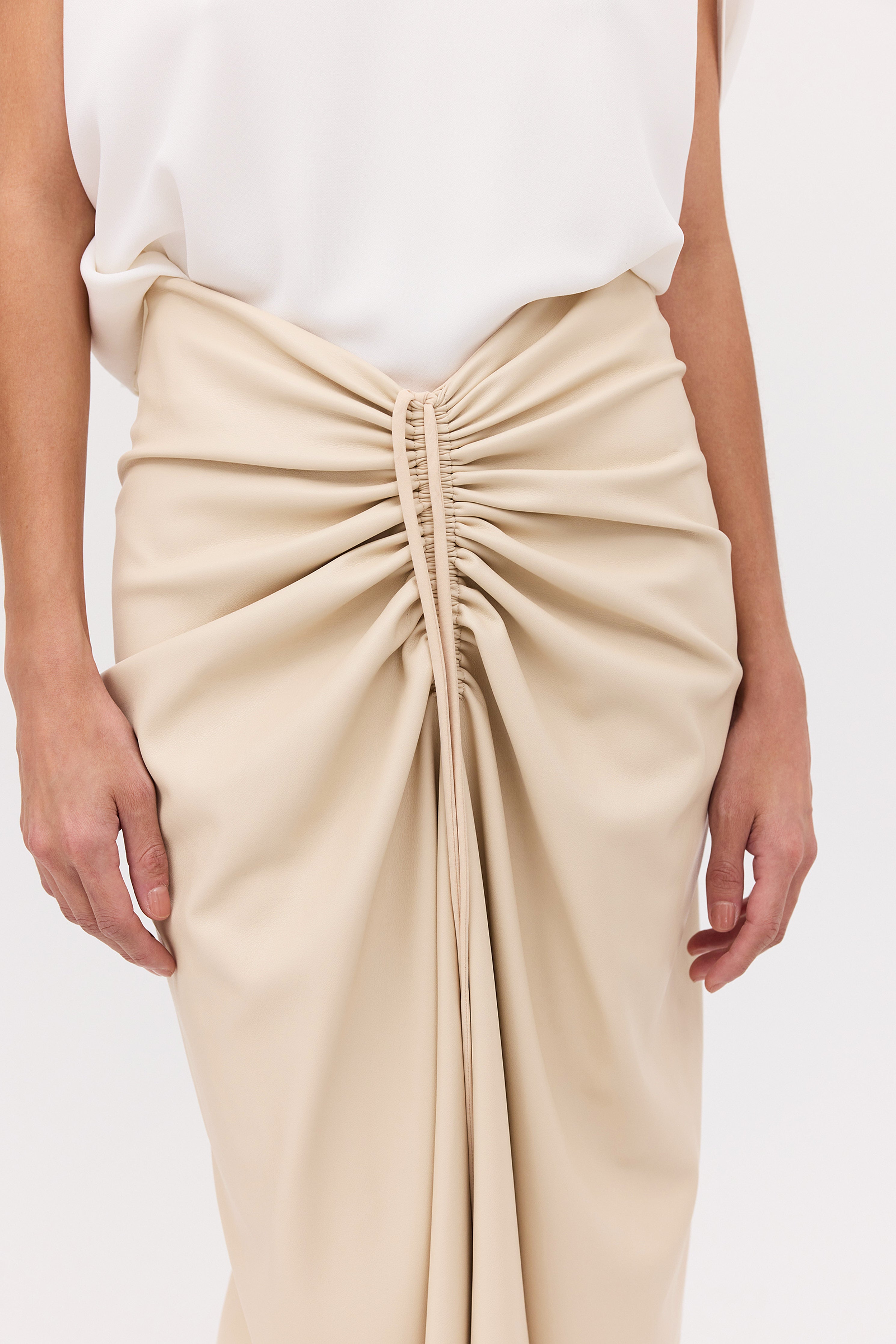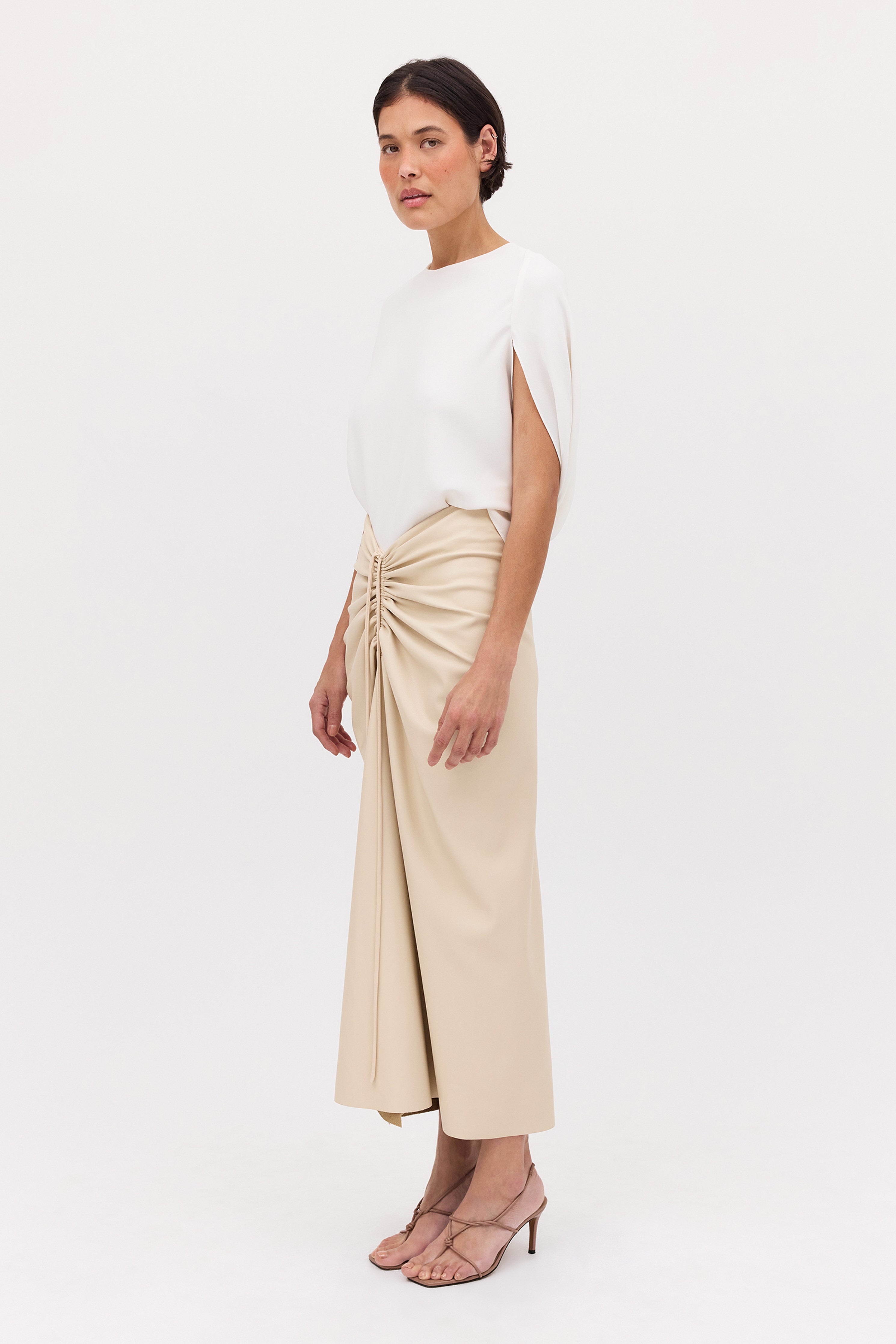 A styling favourite, the Banksia Skirt has received a new season update in a neutral Putty colourway. Flattering Bias cut, Chic and care-free. A relaxed midi-length pencil skirt features a side front drawstring gather. It sits mid to high waist and can be styled back with print or a plain top for any occasion. Perfect with a slide or heel.