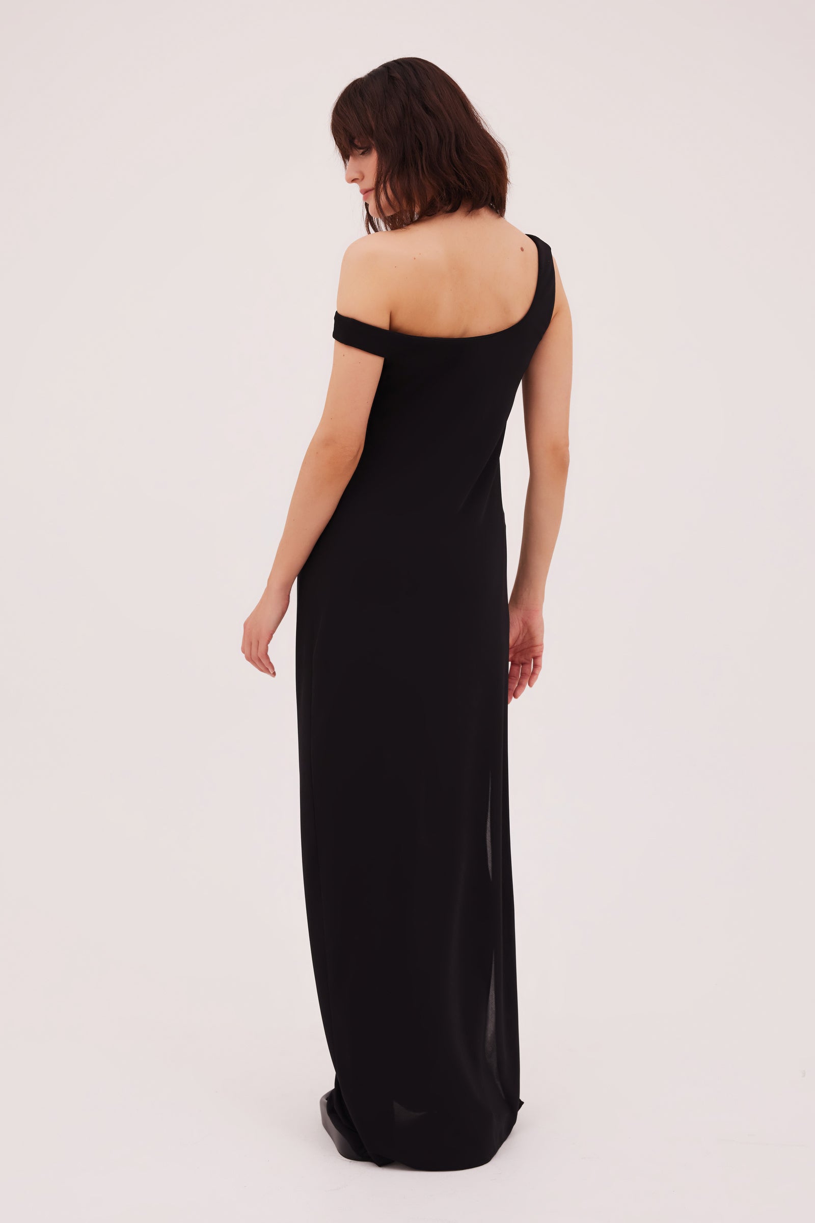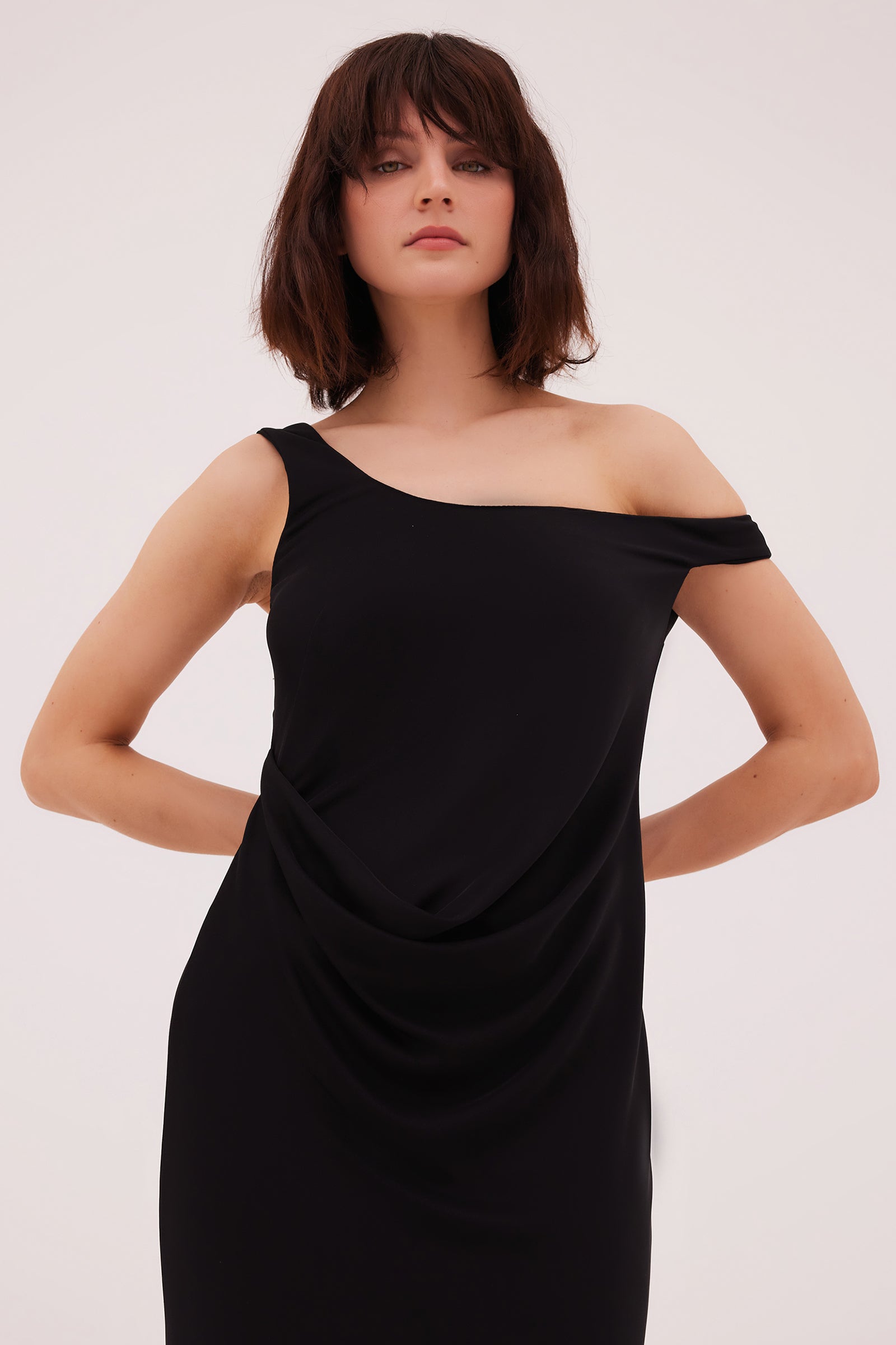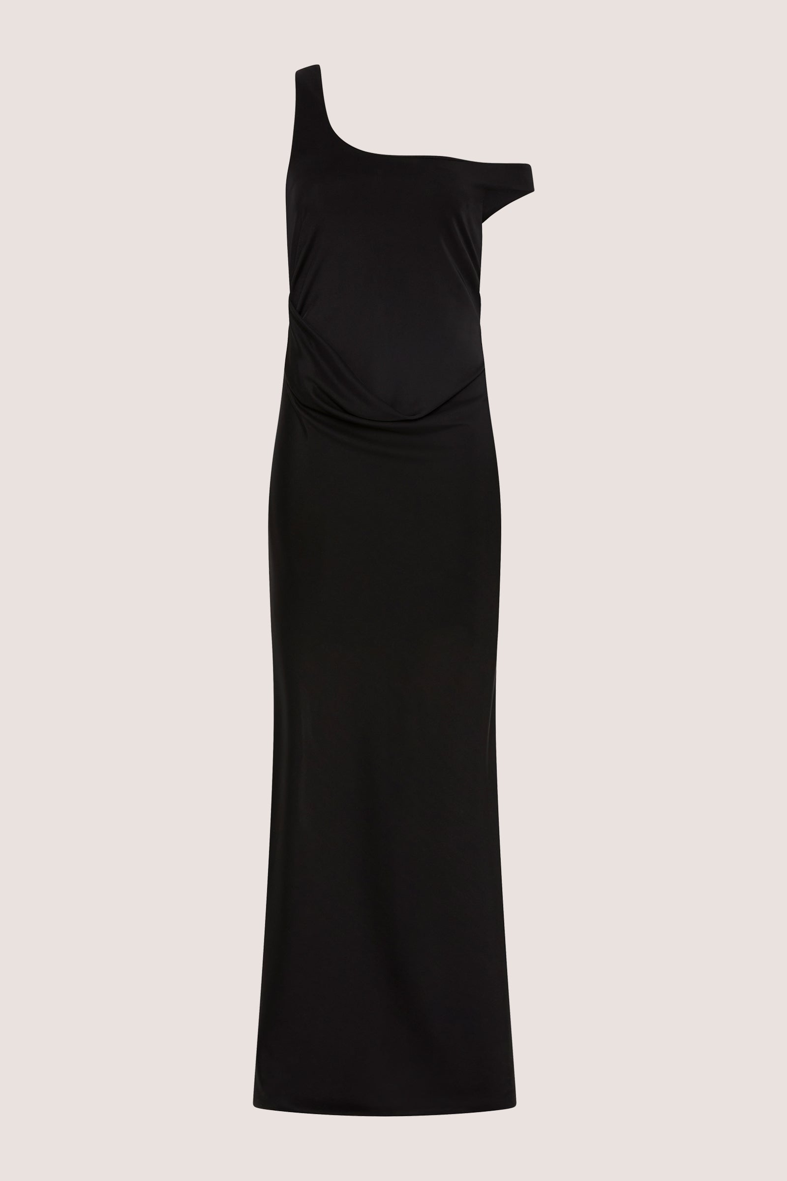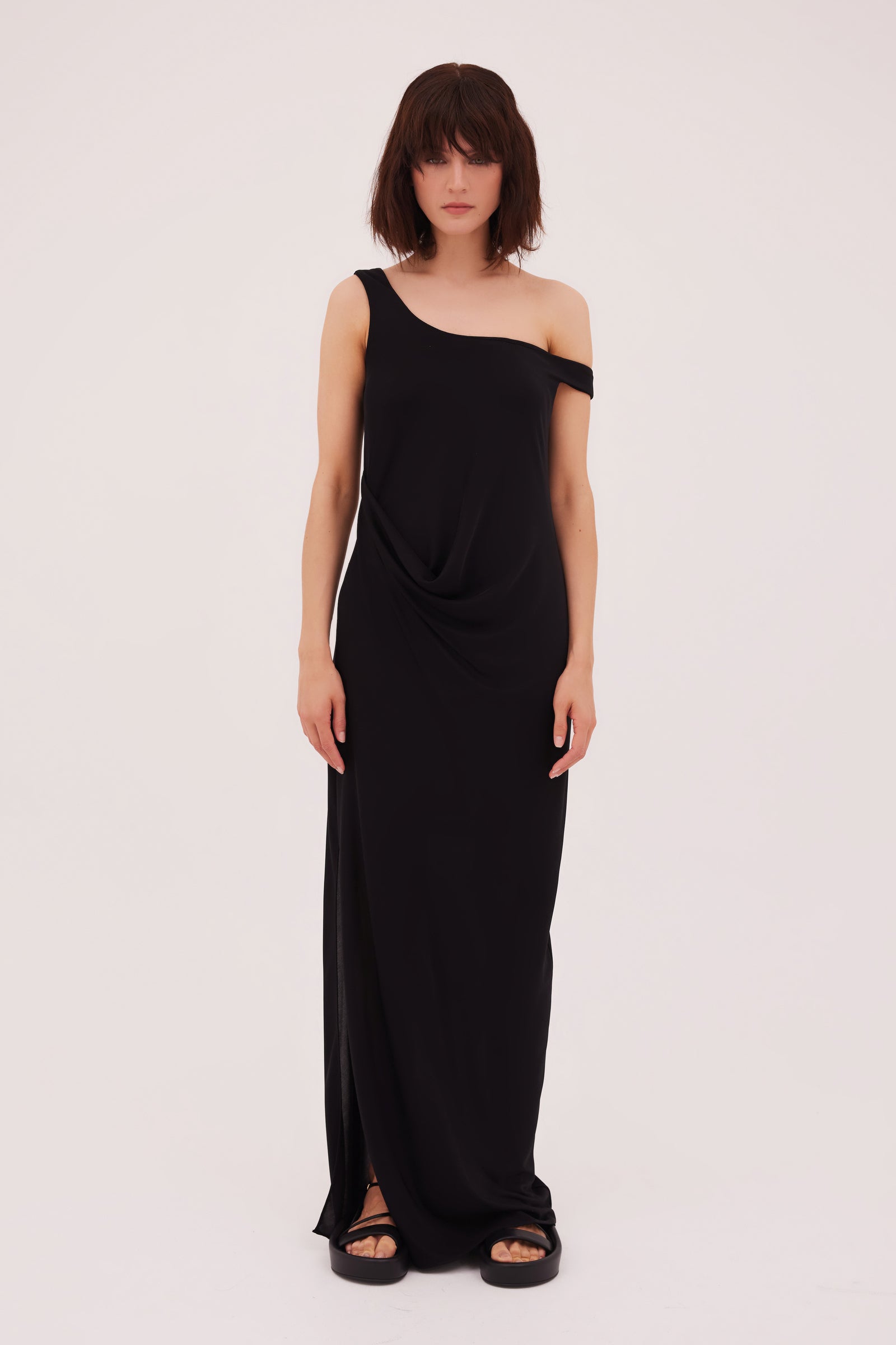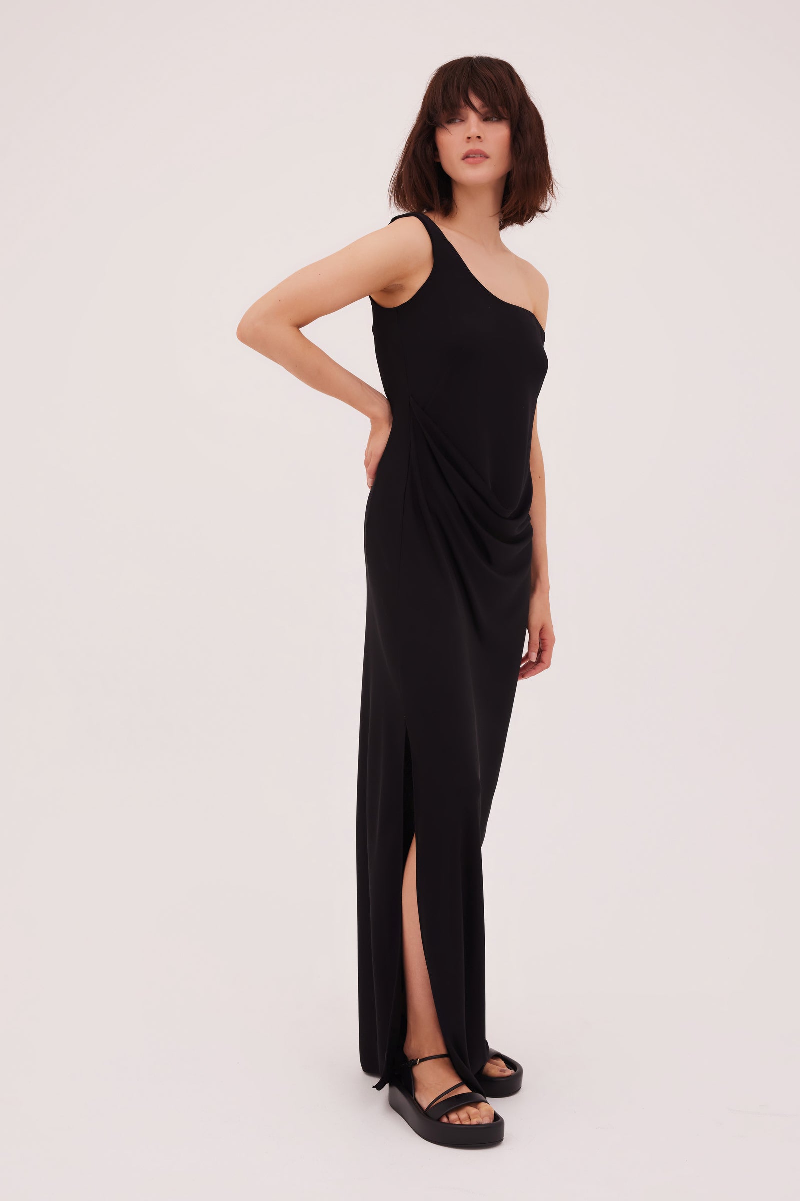 The Leonora Dress is a relaxed style gown with one arm designed to be worn off the shoulder, flattering front drapery, fabricated in a buttery soft Black Jersey.