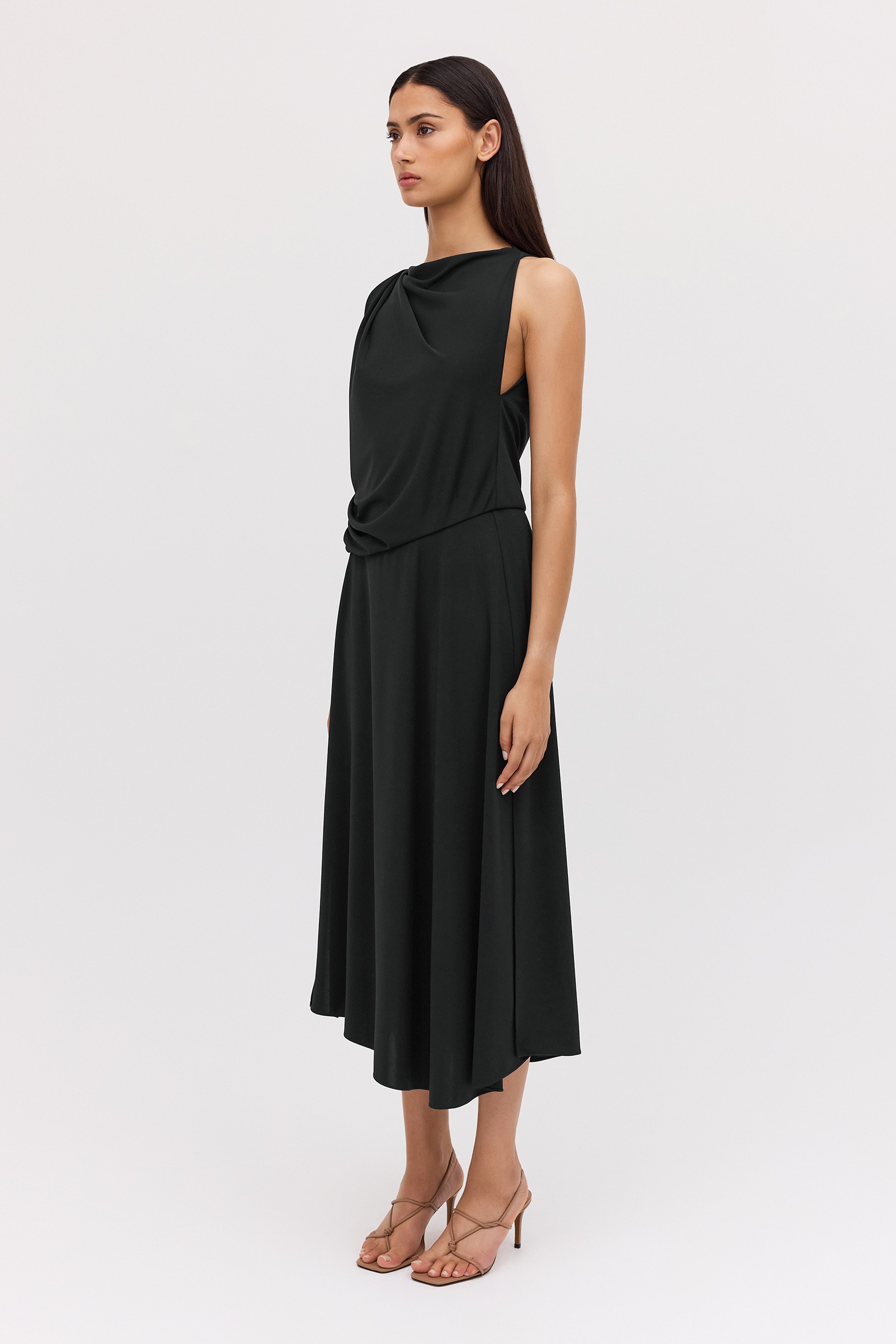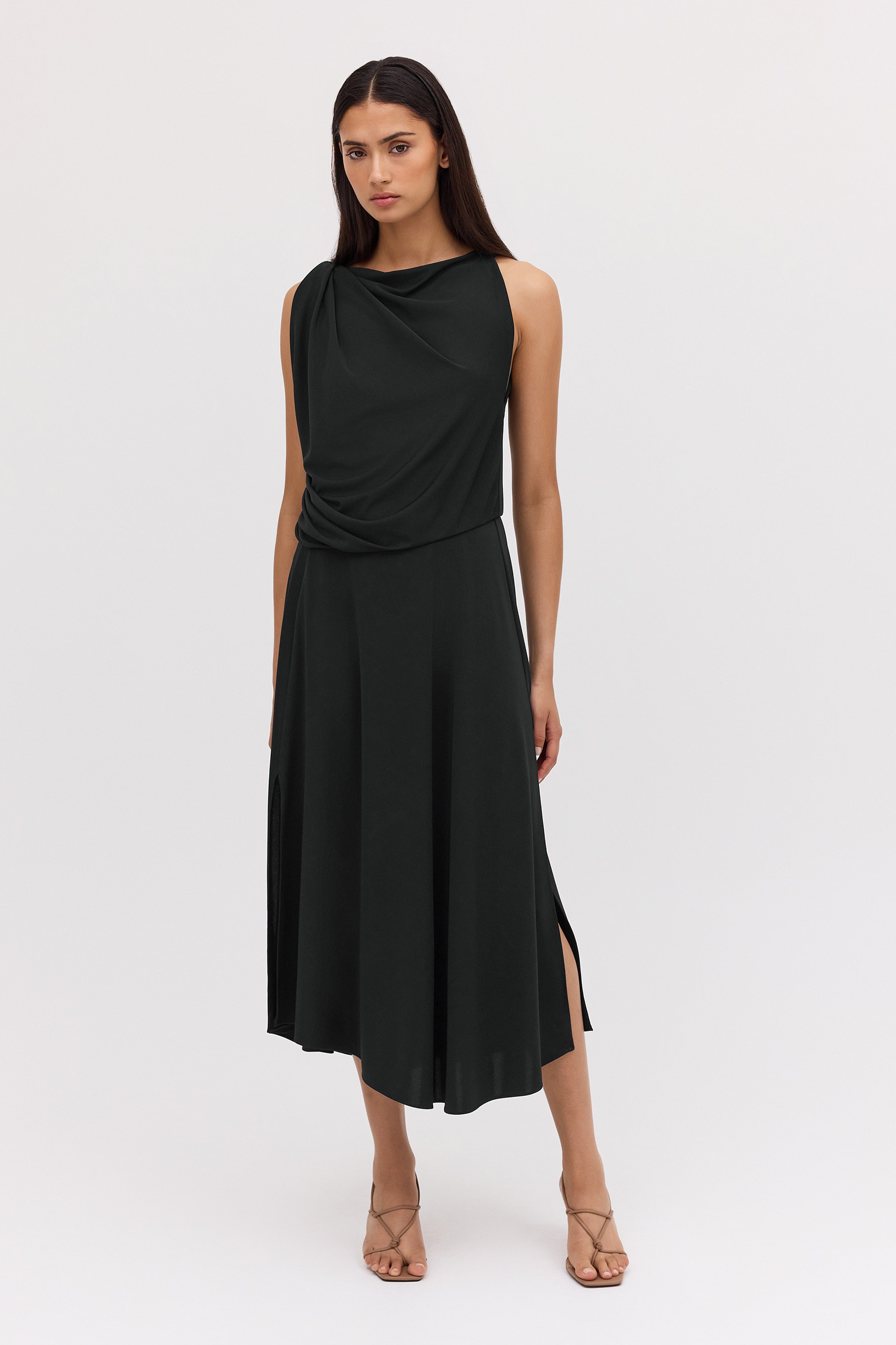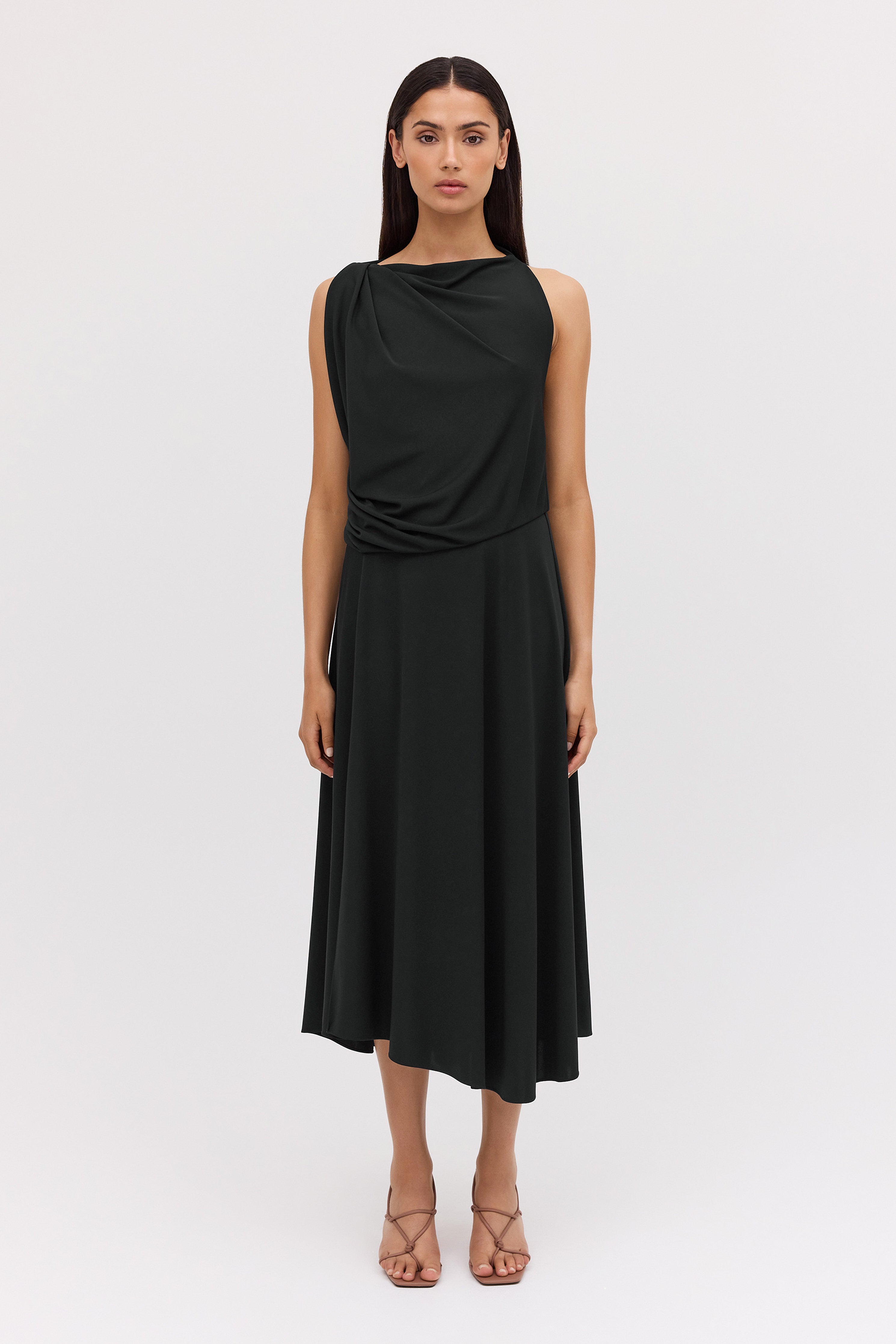 One of our favourites! The Mandala Dress suits many body shapes and can be styled up or down, depending on your accessories. Inspired by our most-loved Roma shape, the Mandala dress is designed to drape and skim the body with ease. Australian-made luxe jersey in classic black, trans-seasonal, easy wear and care. Travel-friendly, cool handle fluid drape. Fastens through the back neck with a zip.
