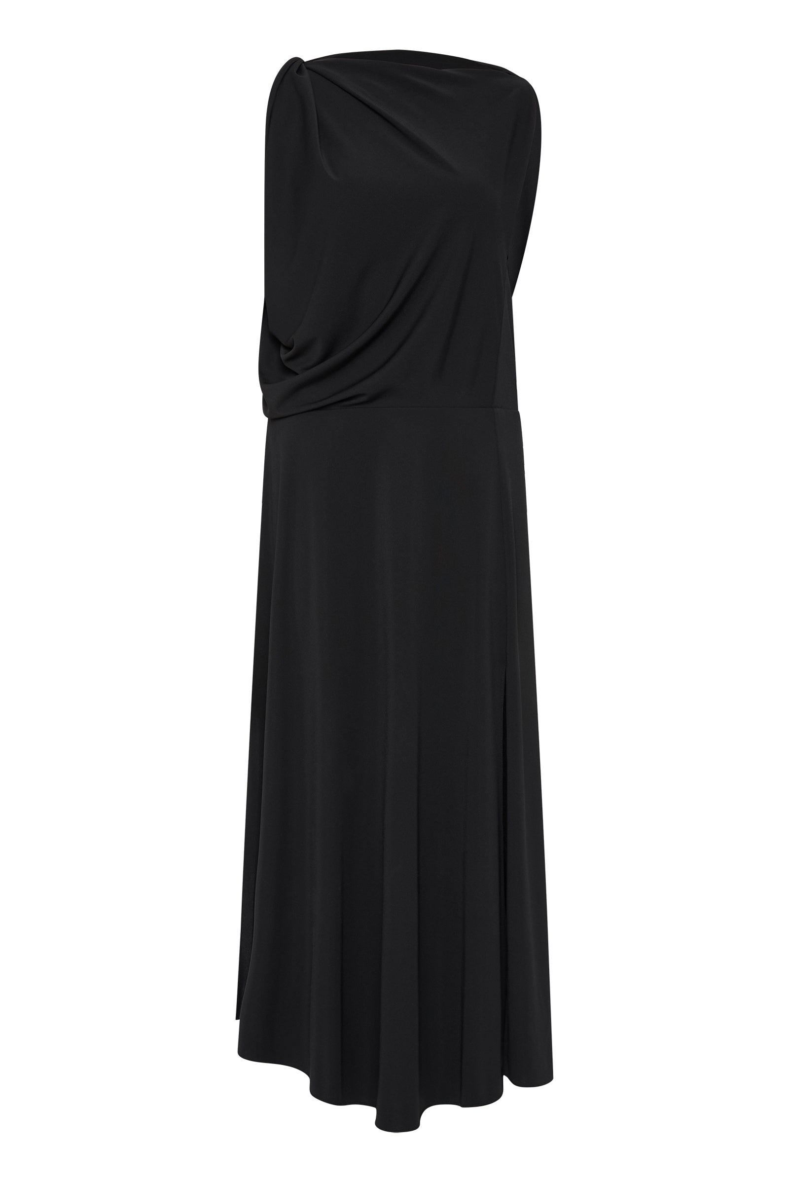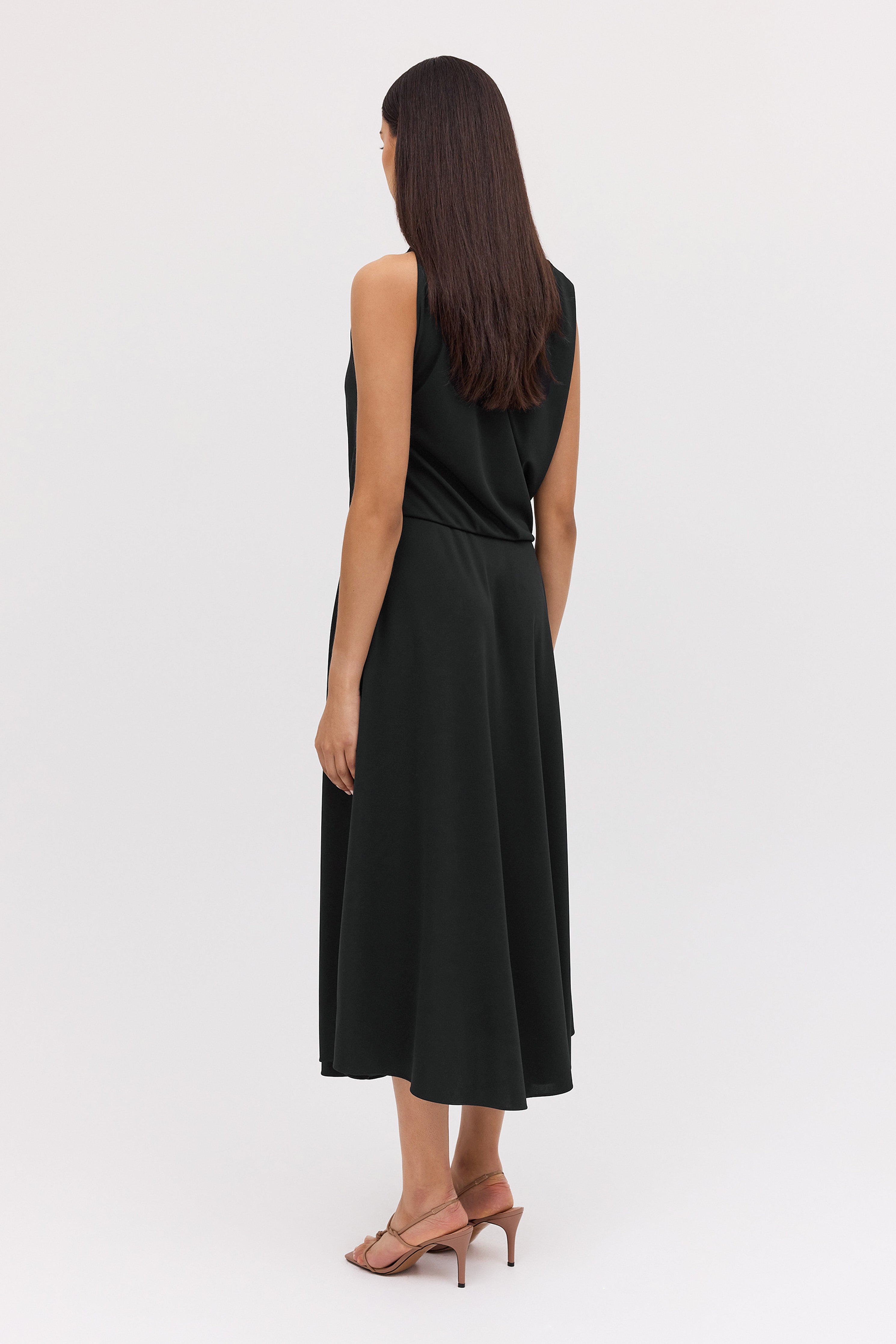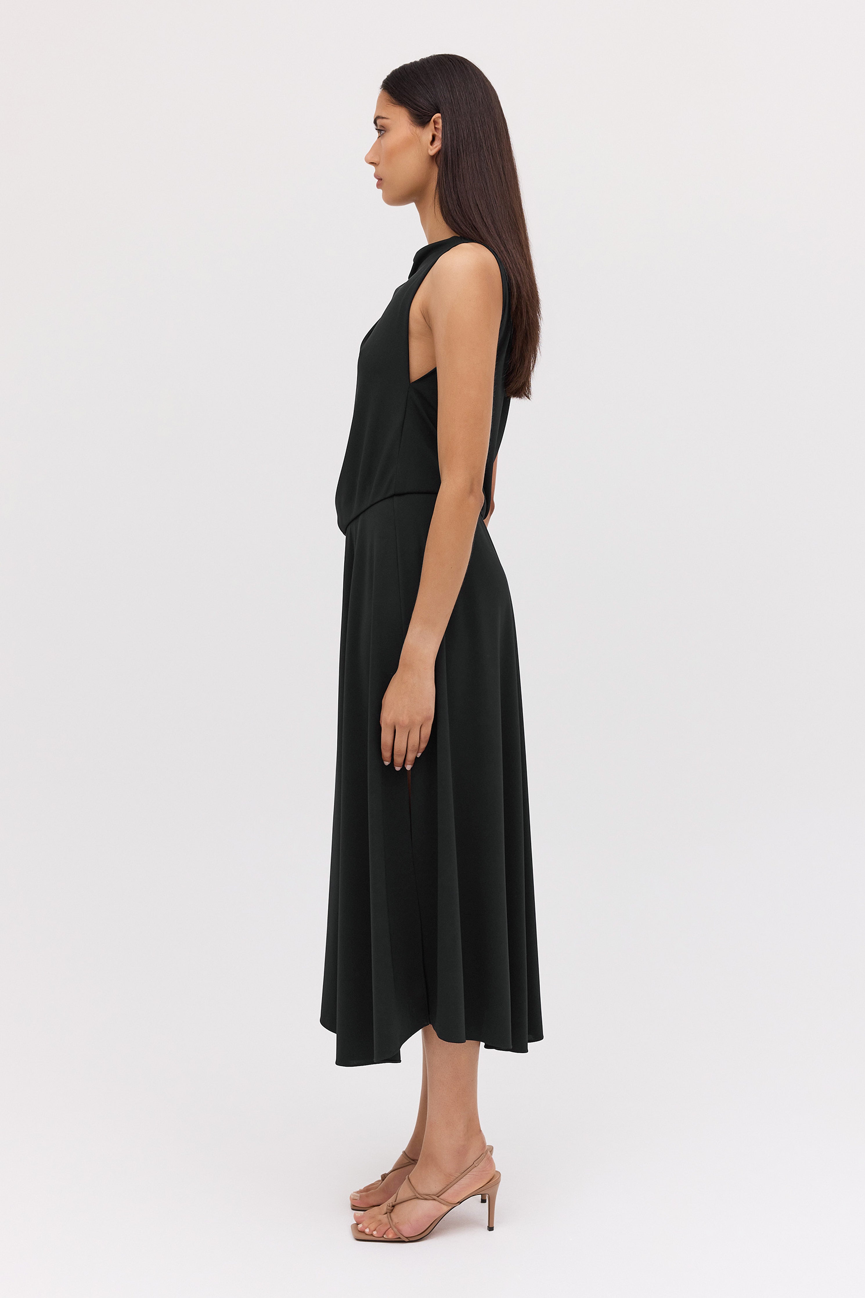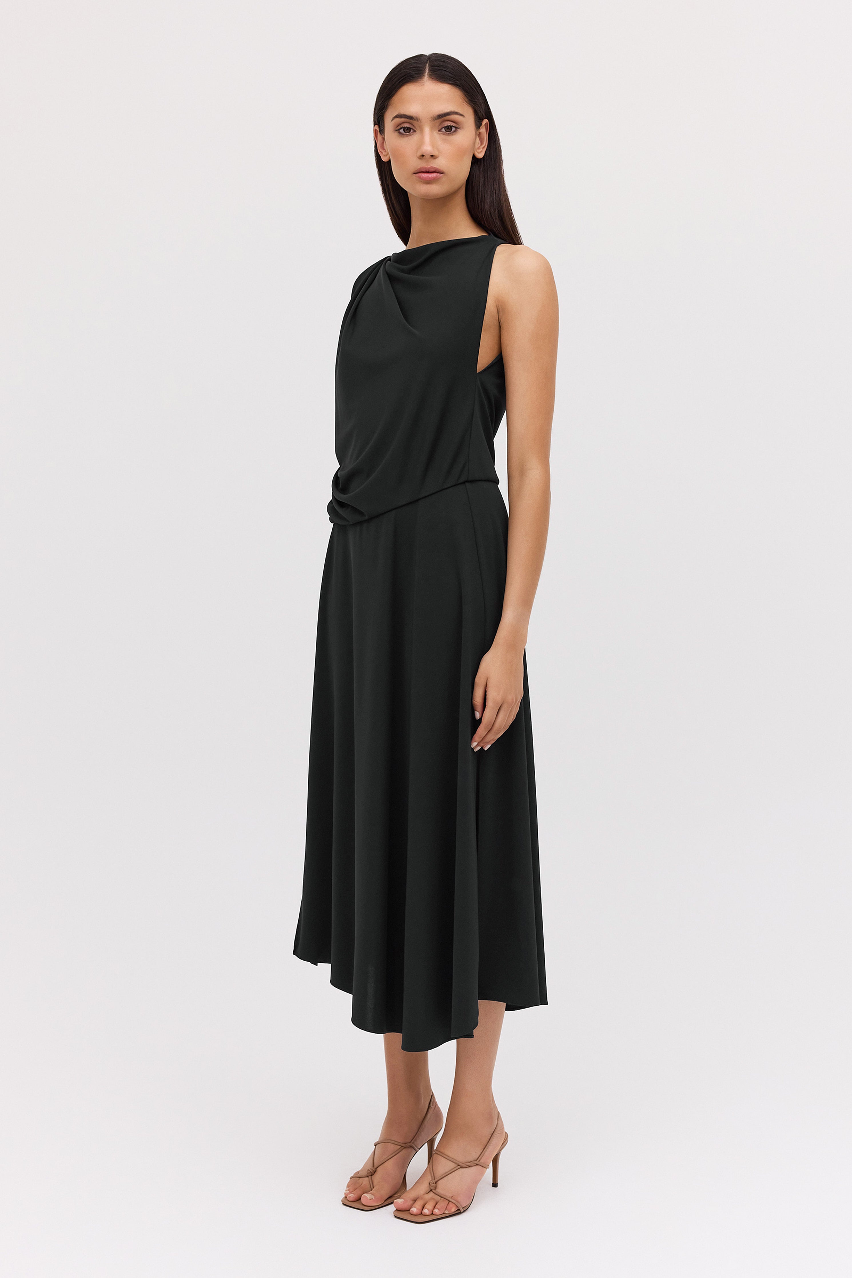 One of our favourites! The Mandala Dress suits many body shapes and can be styled up or down, depending on your accessories. Inspired by our most-loved Roma shape, the Mandala dress is designed to drape and skim the body with ease. Australian-made luxe jersey in classic black, trans-seasonal, easy wear and care. Travel-friendly, cool handle fluid drape. Fastens through the back neck with a zip.