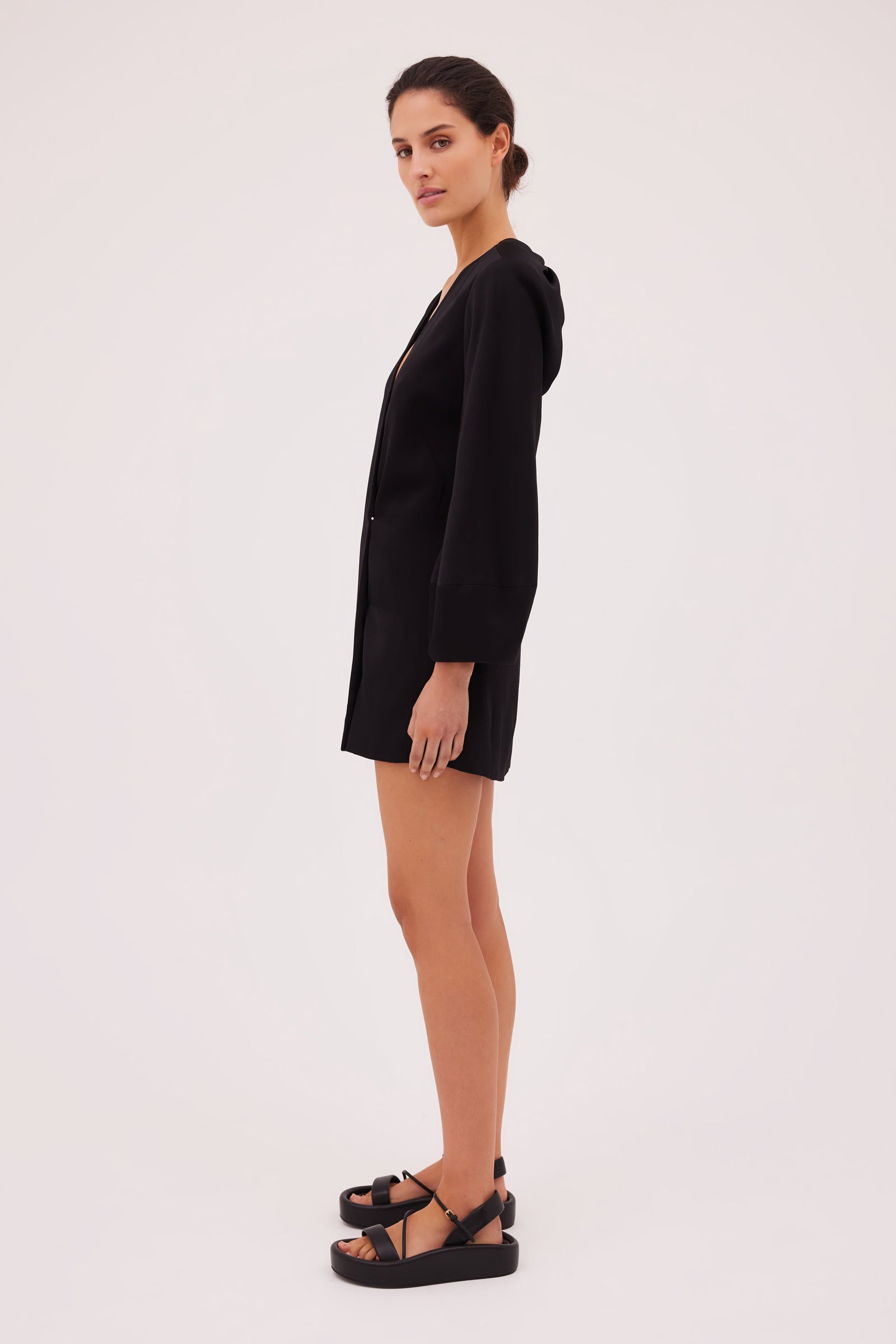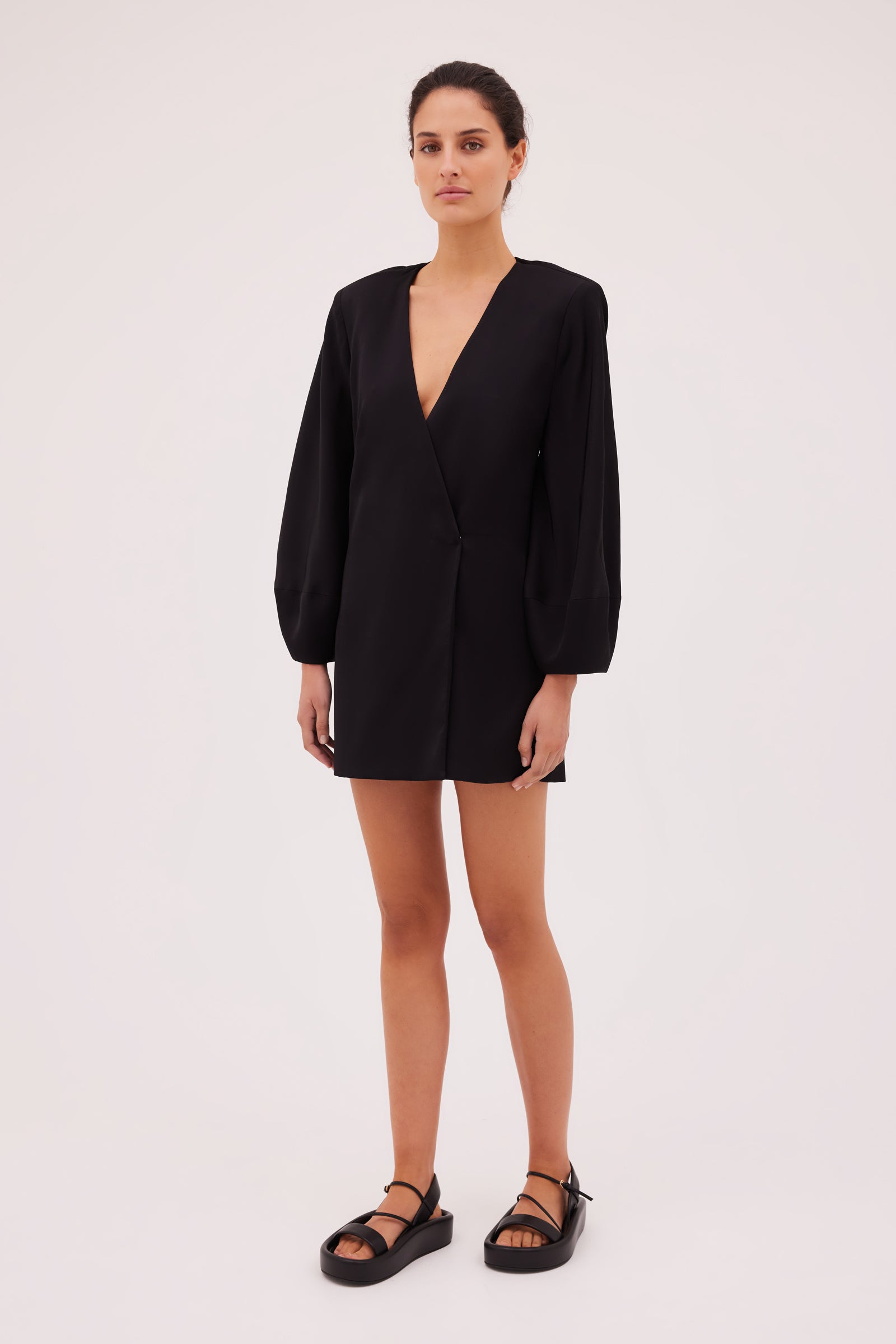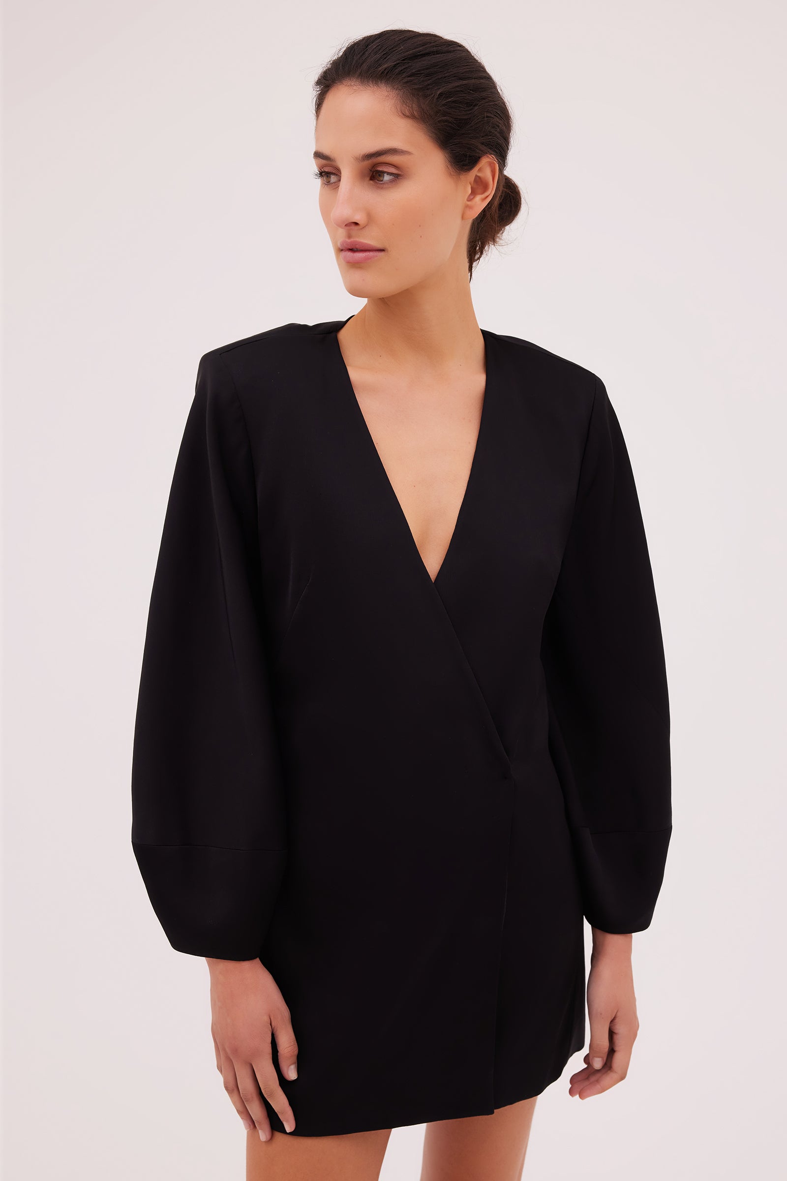 The versatile Black Satin Elixir dress may be worn on its own as a mini dress, or layered with pants or skirt to be styled as a long jacket. The twist and gather signature design feature across the shoulders transforms this simple, yet elegant piece.