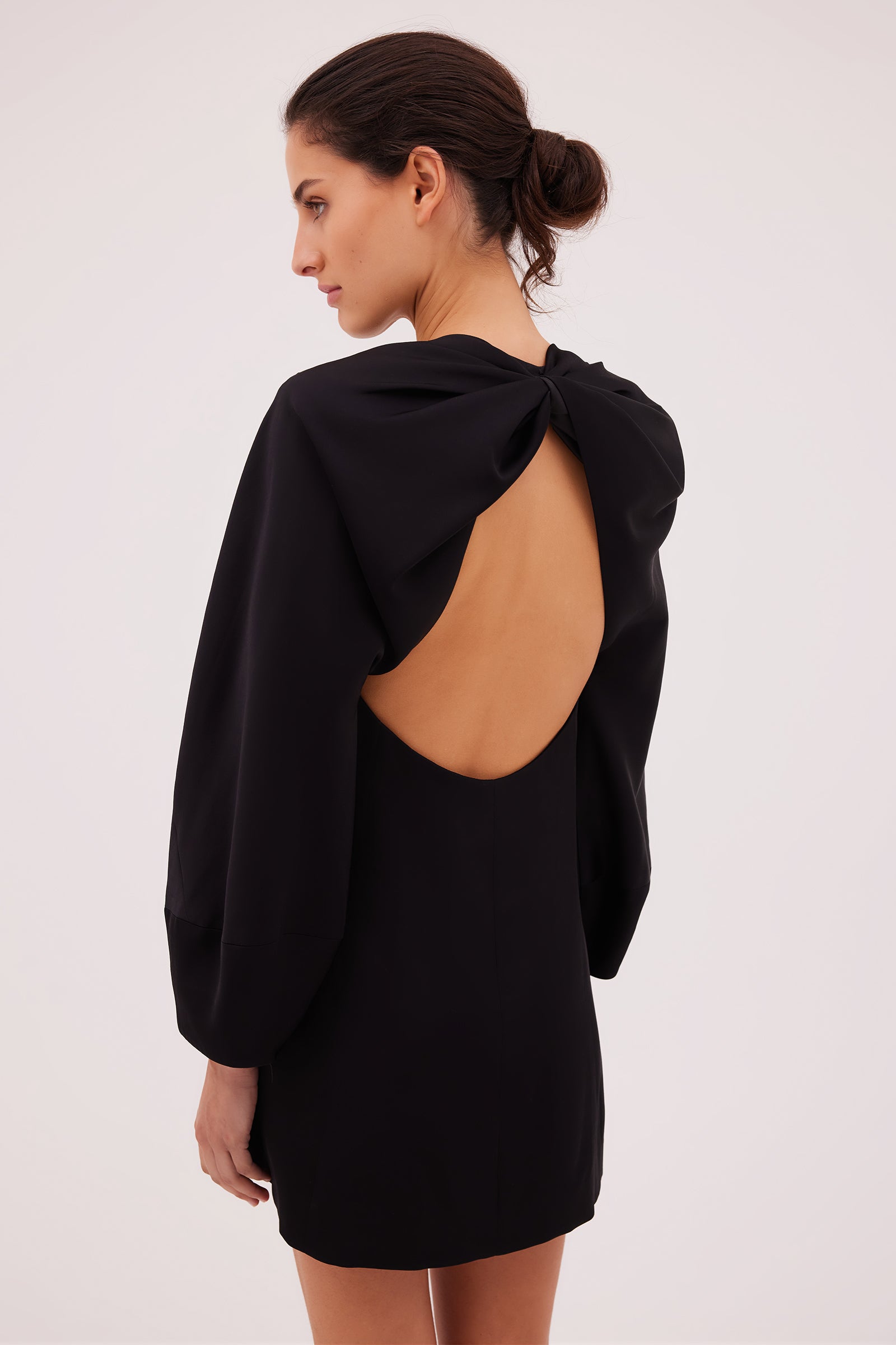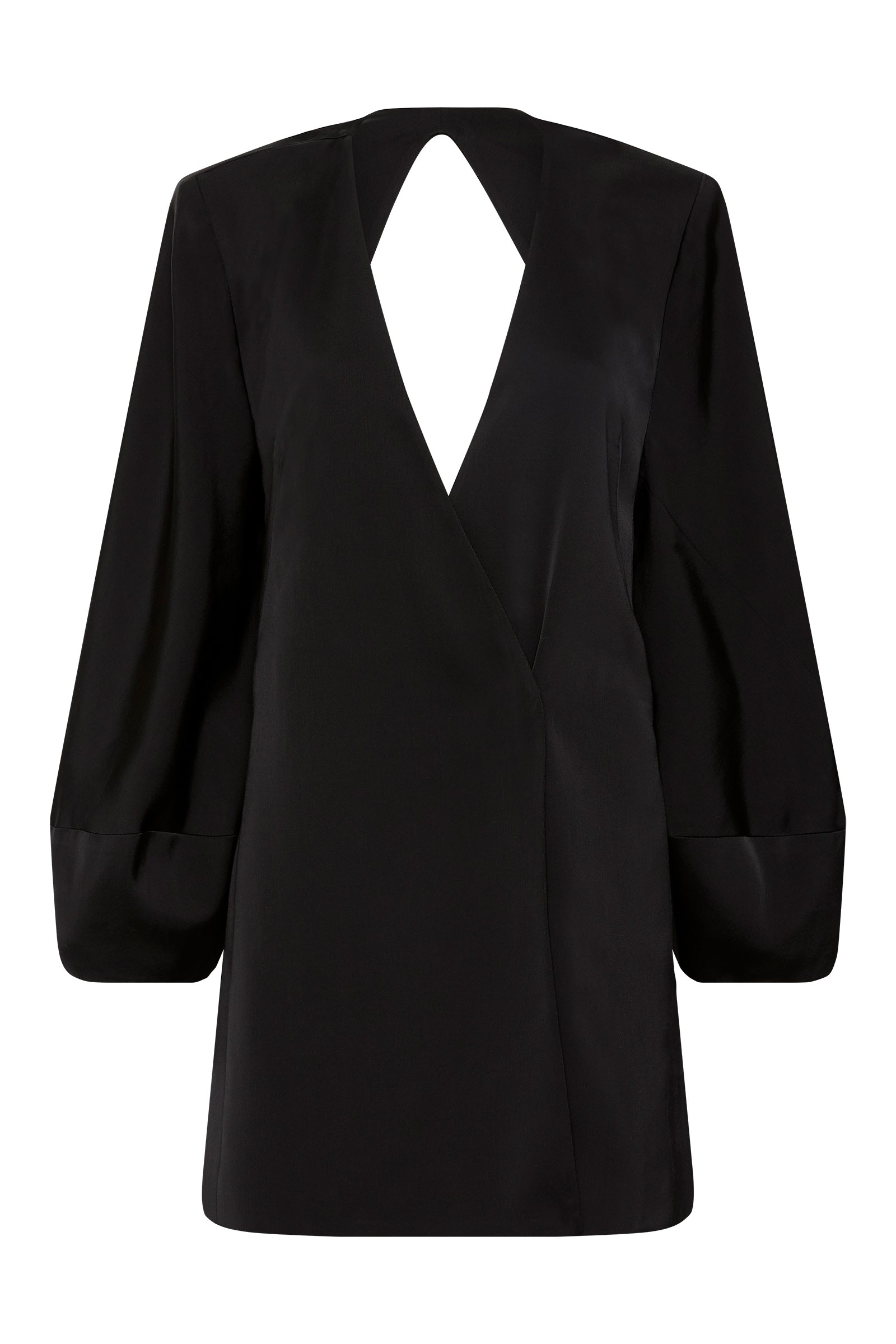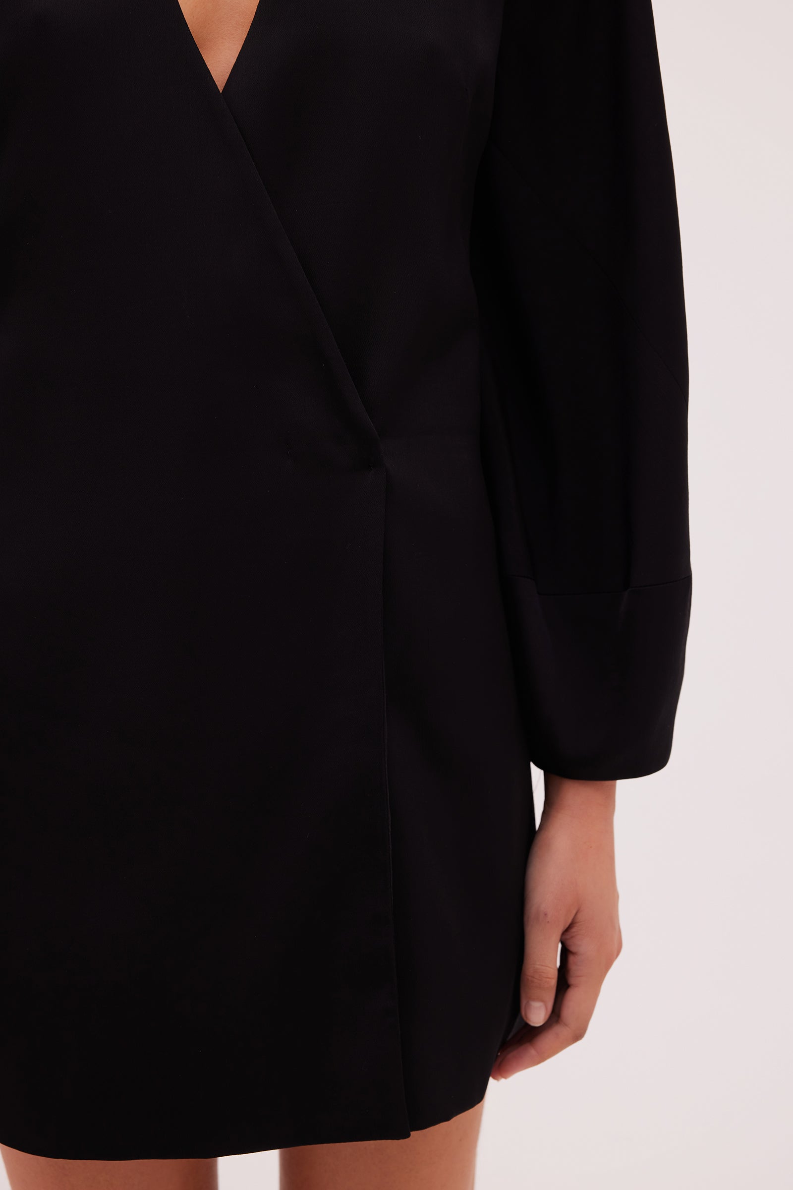The versatile Black Satin Elixir dress may be worn on its own as a mini dress, or layered with pants or skirt to be styled as a long jacket. The twist and gather signature design feature across the shoulders transforms this simple, yet elegant piece.