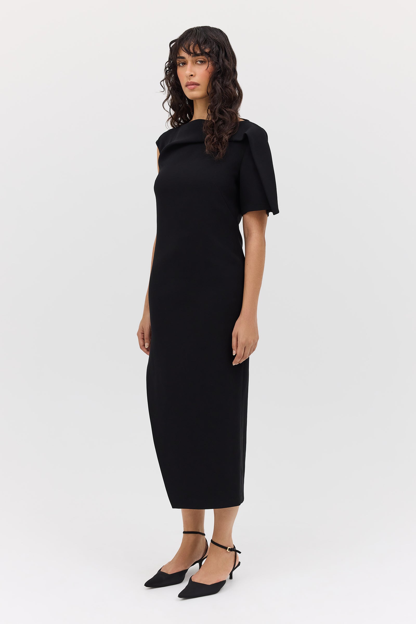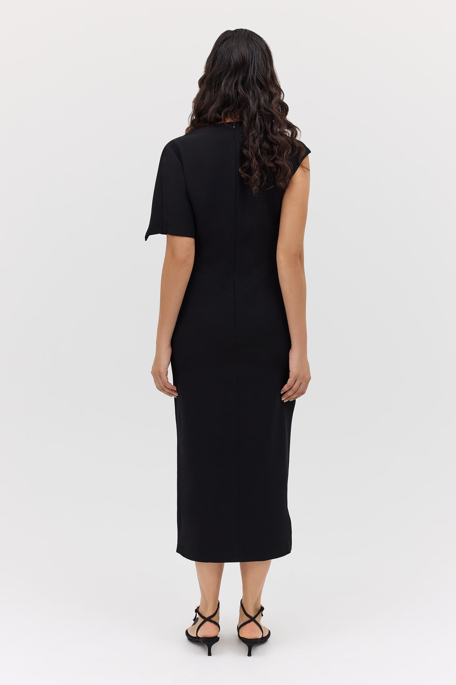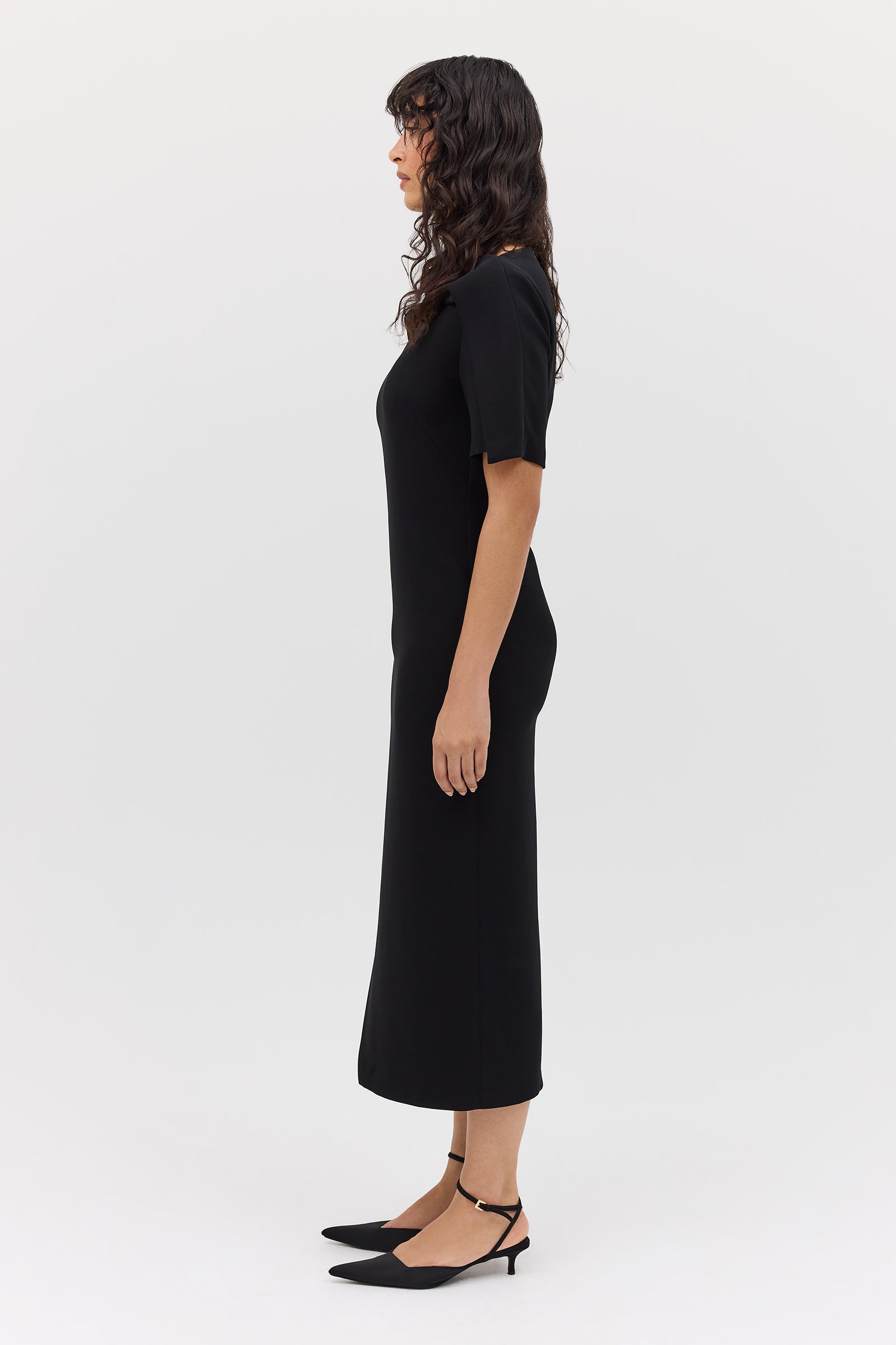 We loved the Annex shape so much, we designed a dress. Inspired by an elevated T-shirt, the Annex Dress features our signature design details- tucks and folds to add interest and elevation to a simple design. Cutting a sculptural silhouette, the Annex Dress is crafted from a mid-weight black suiting fabrication, that adds structure and hold. The perfect work dress, pair with your favourite mules and tote bag for a chic corporate look.