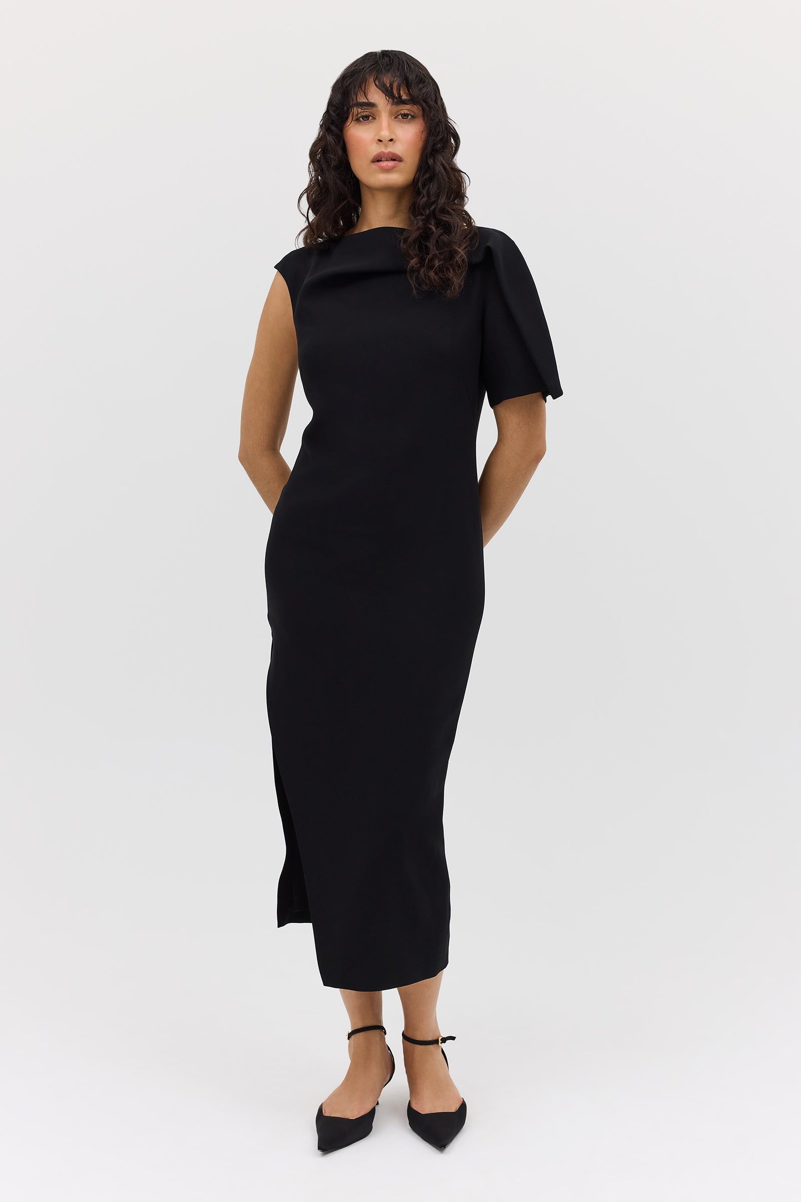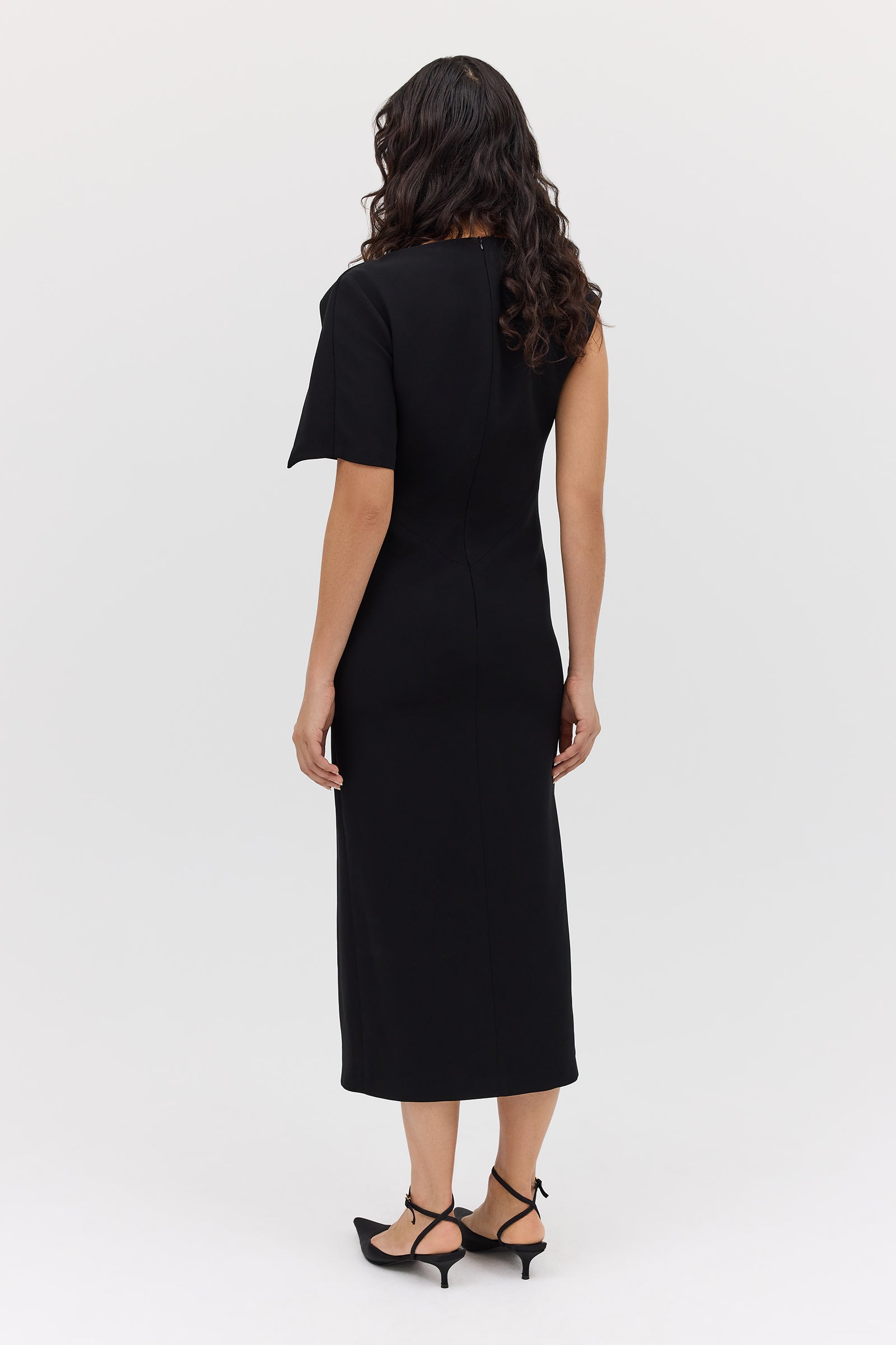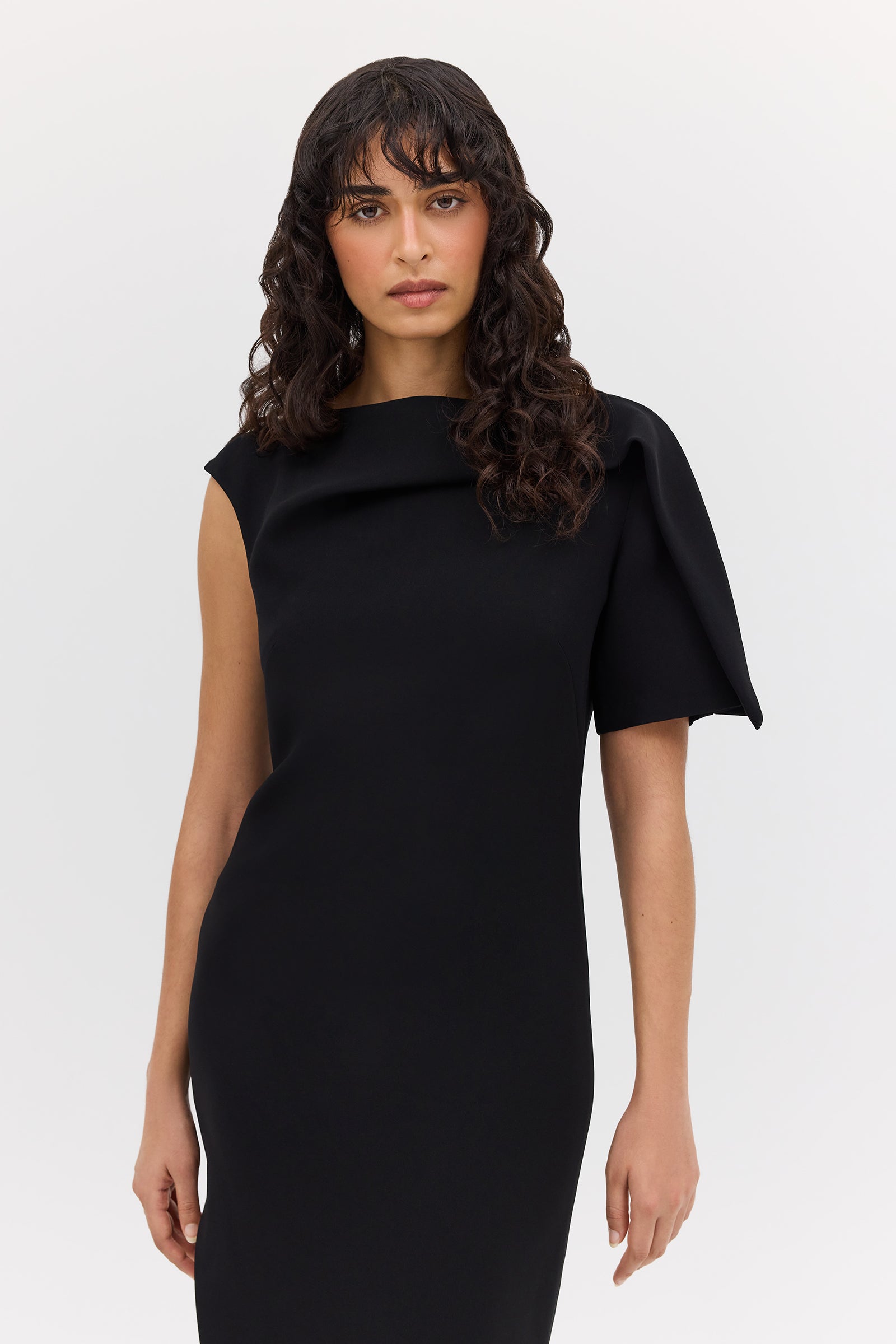 We loved the Annex shape so much, we designed a dress. Inspired by an elevated T-shirt, the Annex Dress features our signature design details- tucks and folds to add interest and elevation to a simple design. Cutting a sculptural silhouette, the Annex Dress is crafted from a mid-weight black suiting fabrication, that adds structure and hold. The perfect work dress, pair with your favourite mules and tote bag for a chic corporate look.