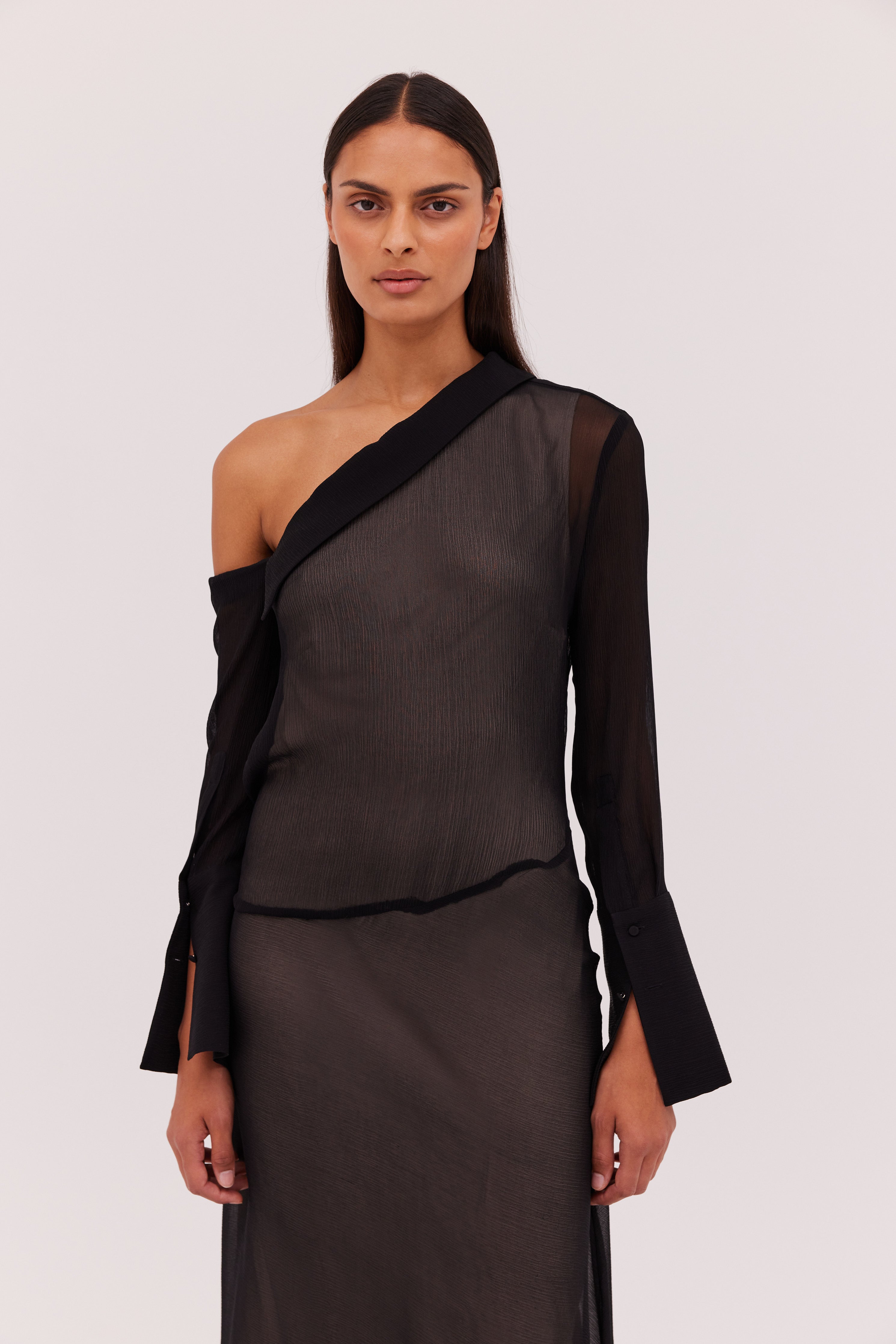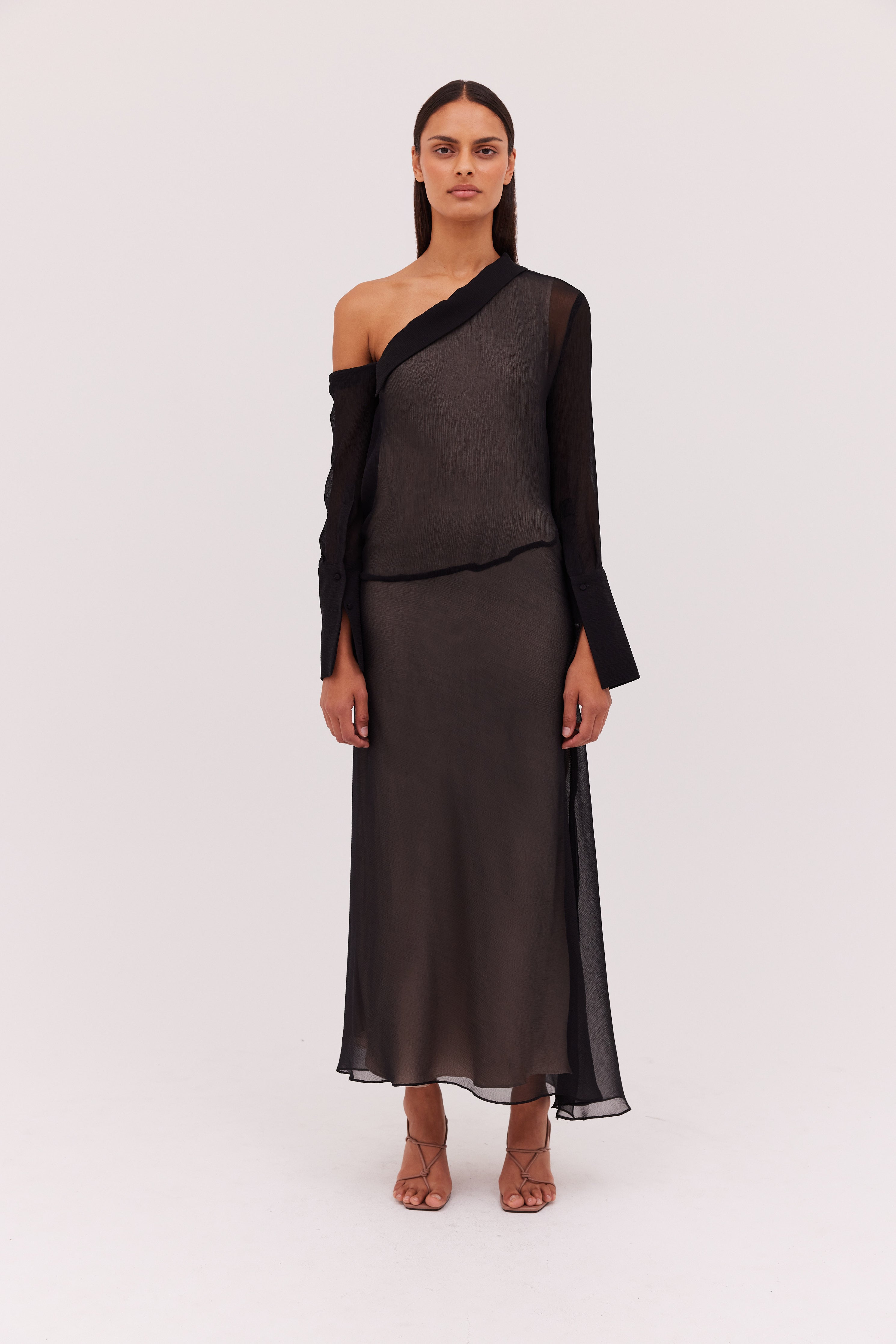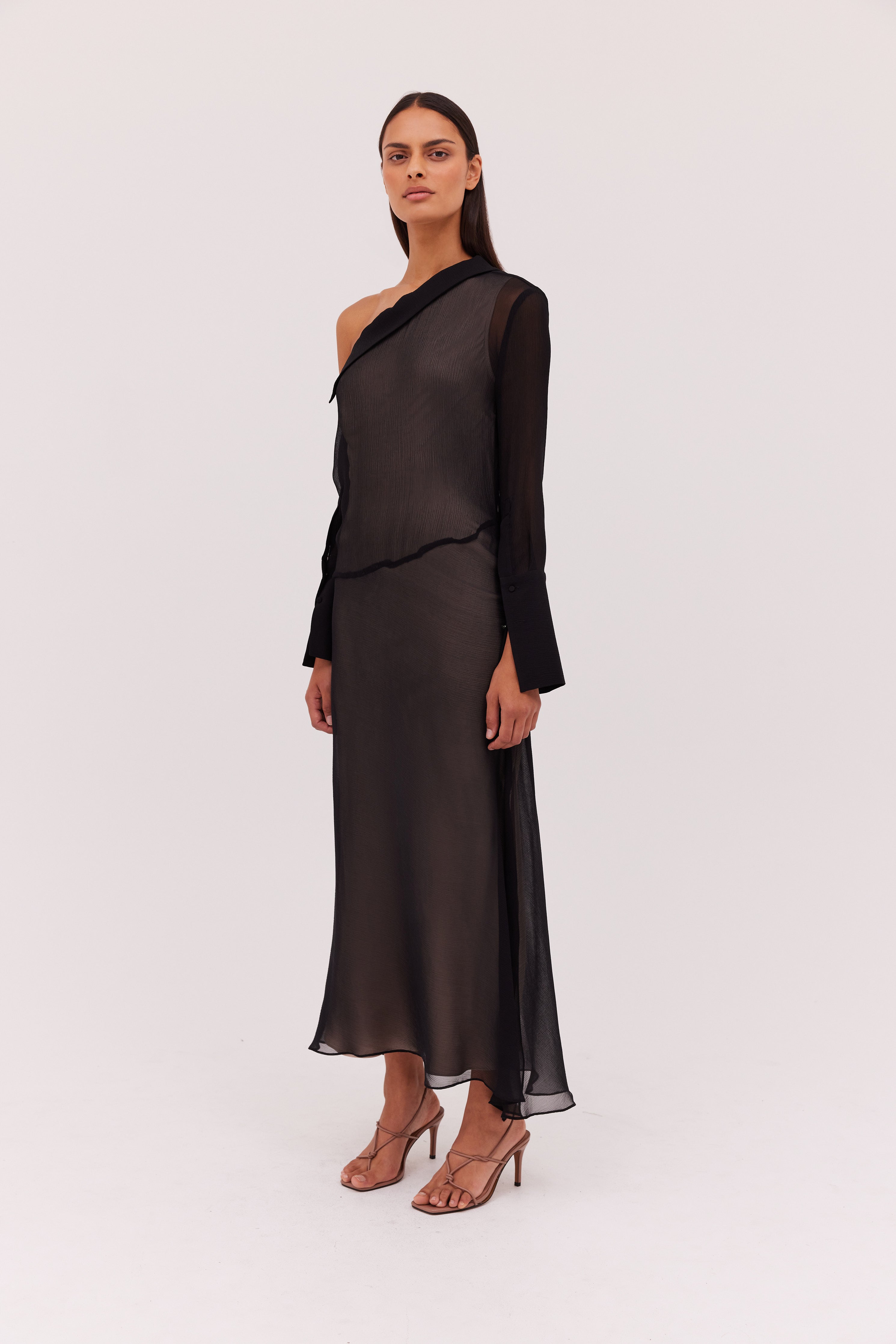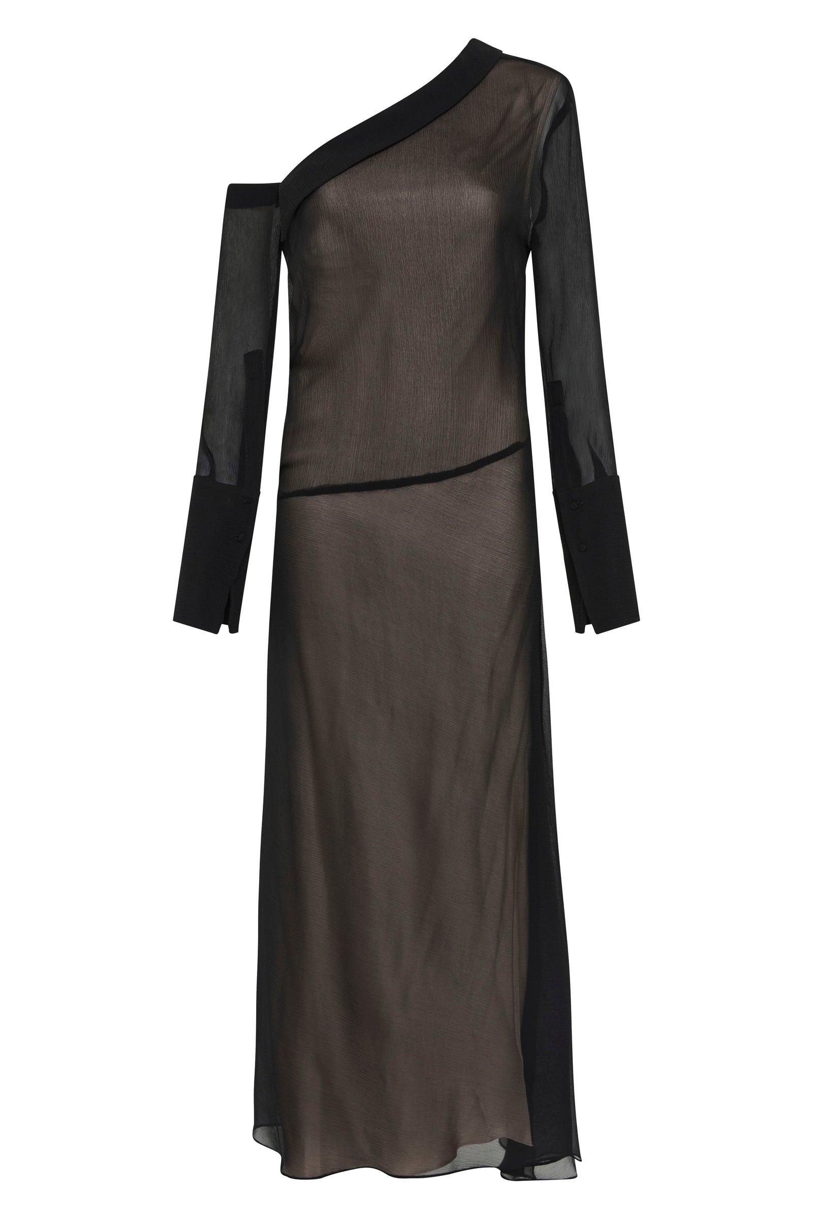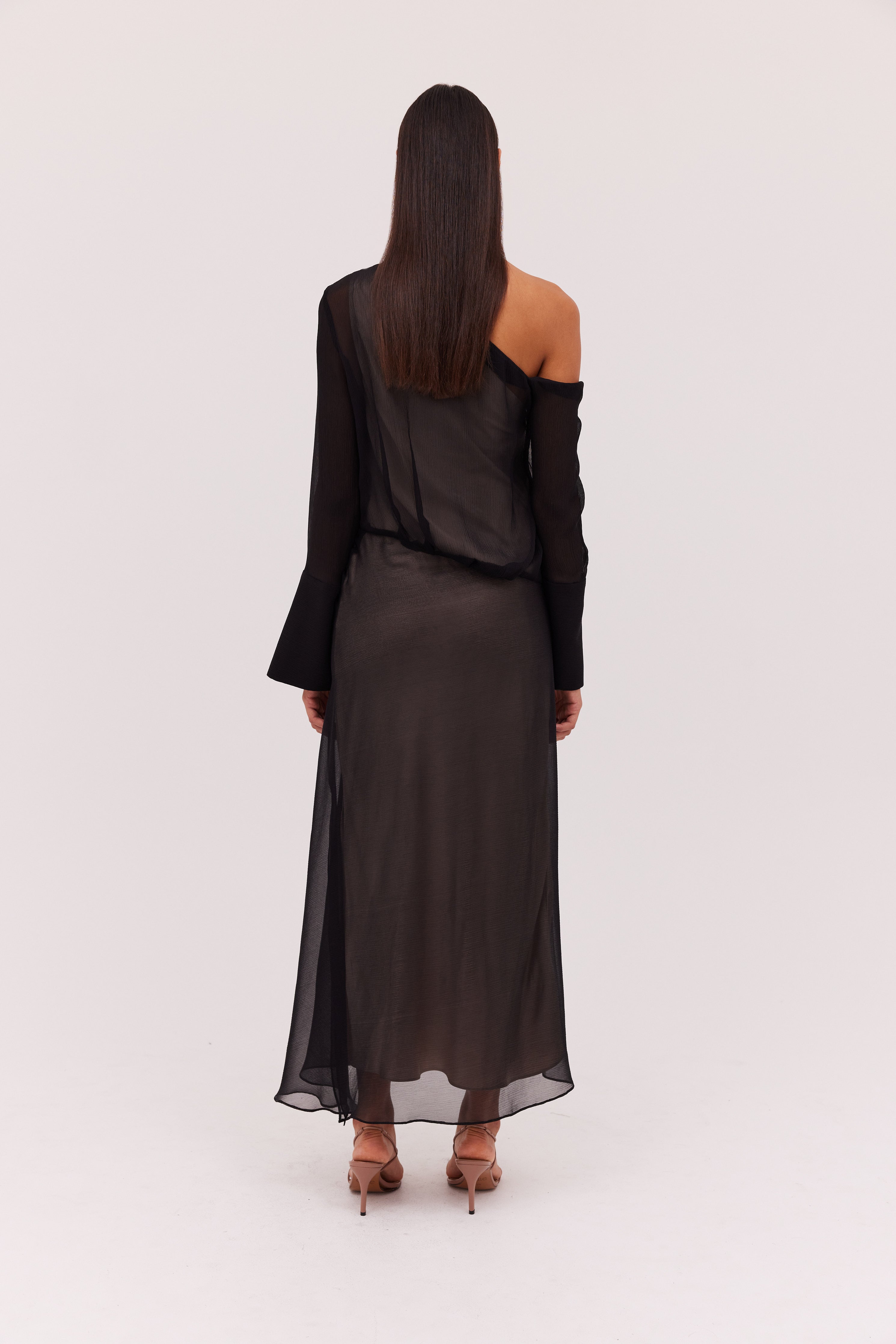 Chic and elevated, the Black Yoryu Georgette Savoir Dress is a chic and modern take on occasion dressing. Featuring long fluted sleeves and an elegant asymmetrical one-shoulder neckline. The Savoir dress is fashioned from a sheer Georgette that softly skims and drapes the body, allowing the dress to flow around the body for freedom of movement. Dress comes with a slip, to be worn underneath.
