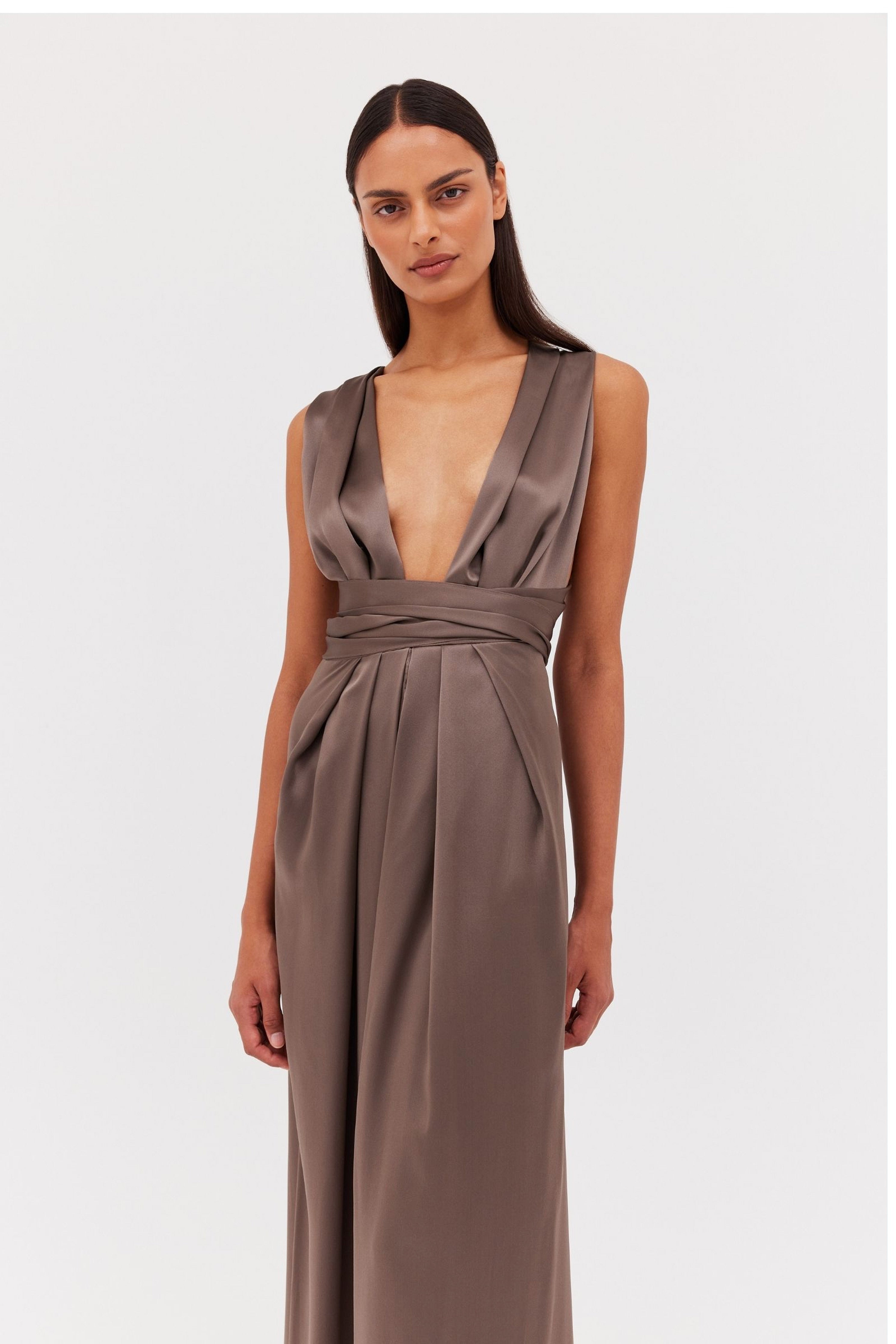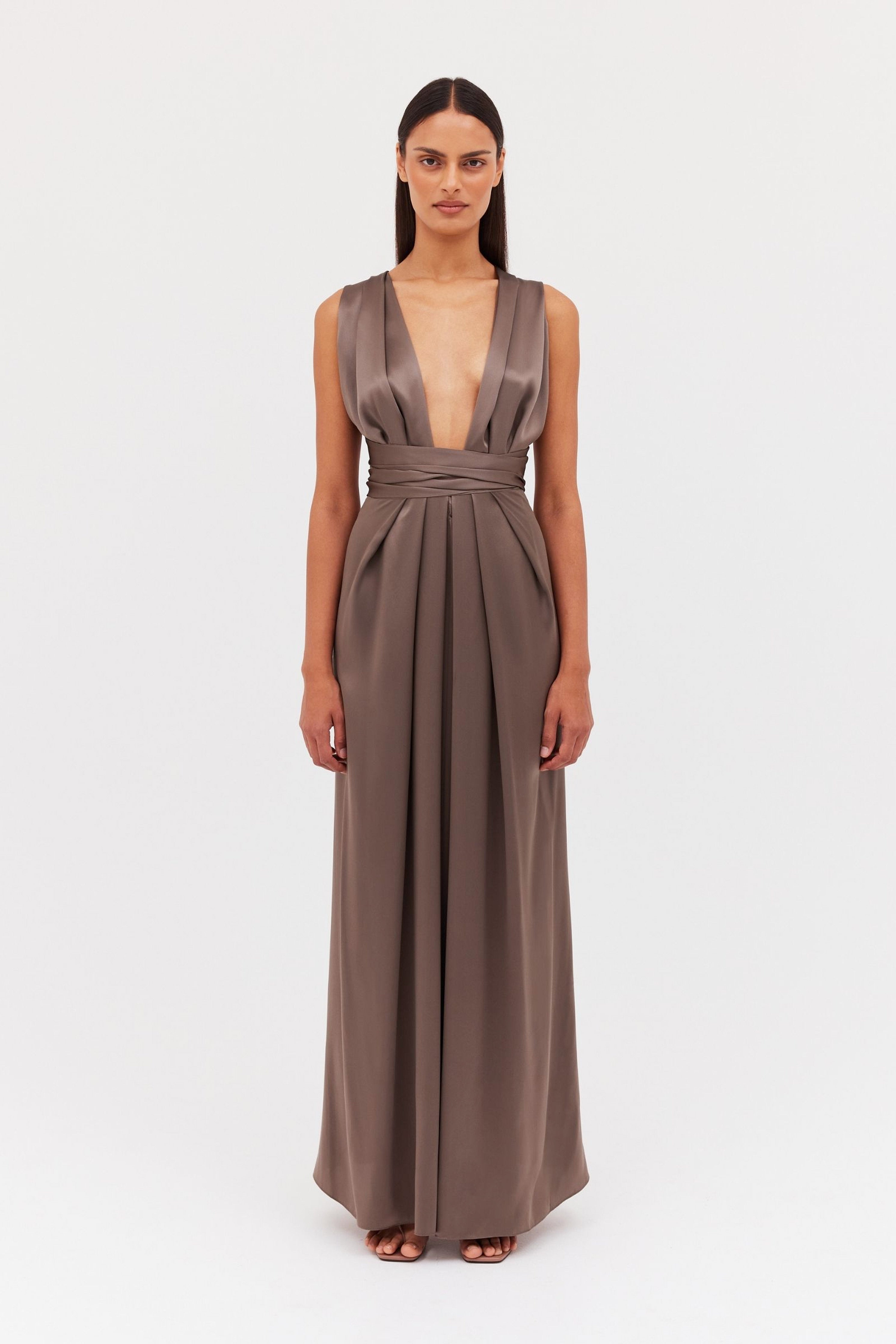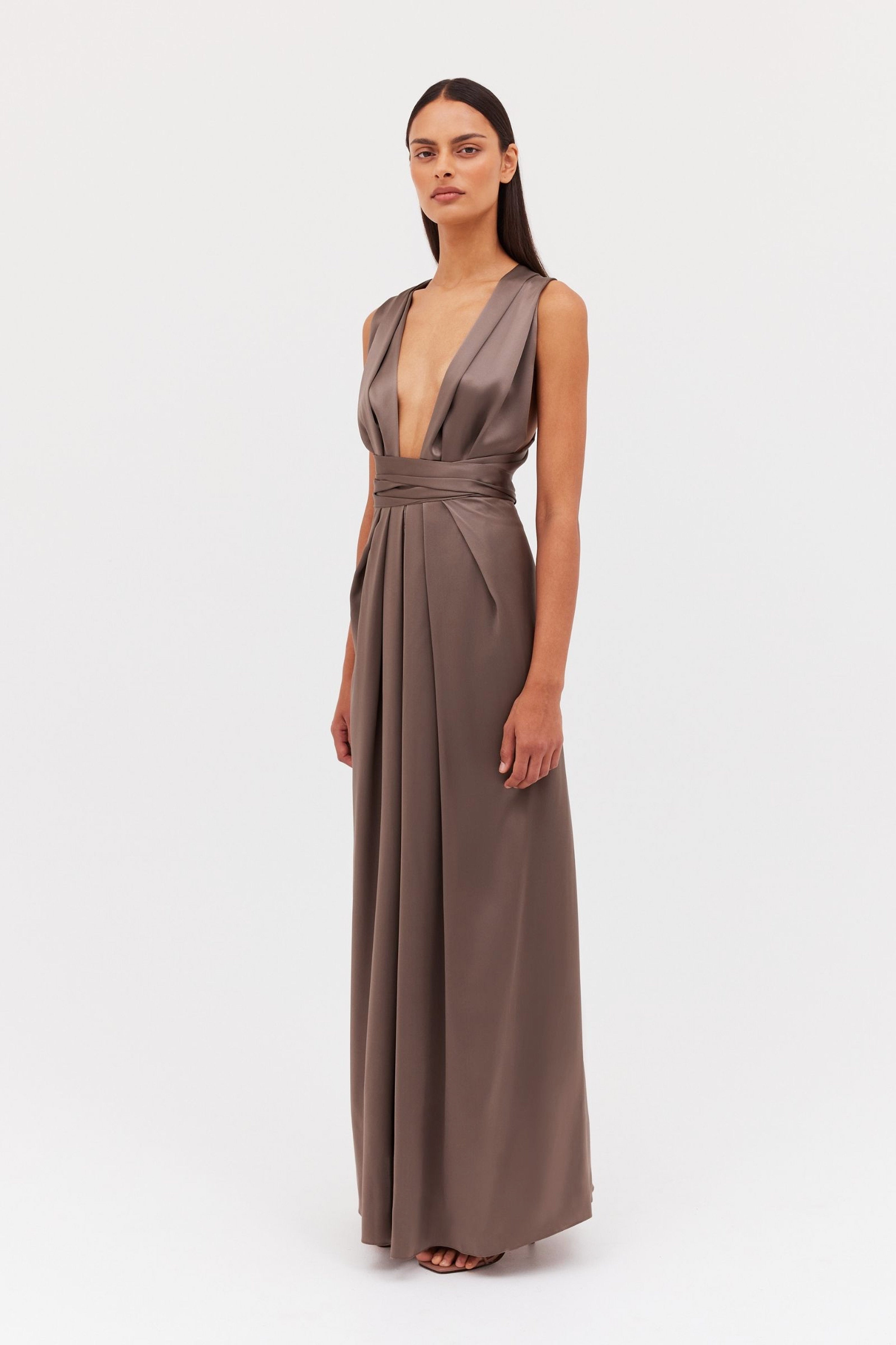 In sumptuous bronze satin this gown summons confidence with its deep plunge and luxurious silk that falls in the folds. A courageous, full-length piece with a carefully cinched waist that will leave you feeling empowered. Versatile and can be worn in a variety of ways.