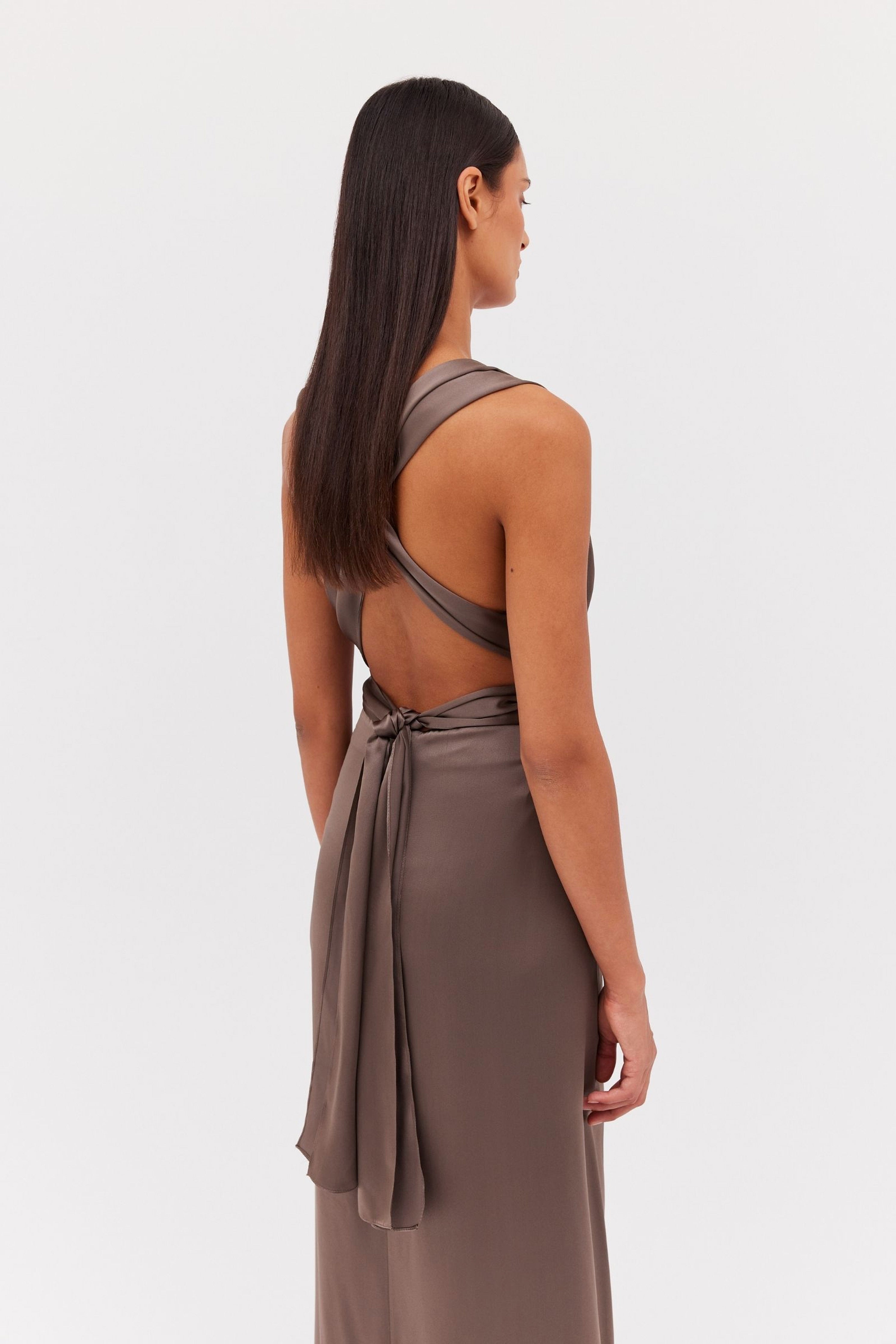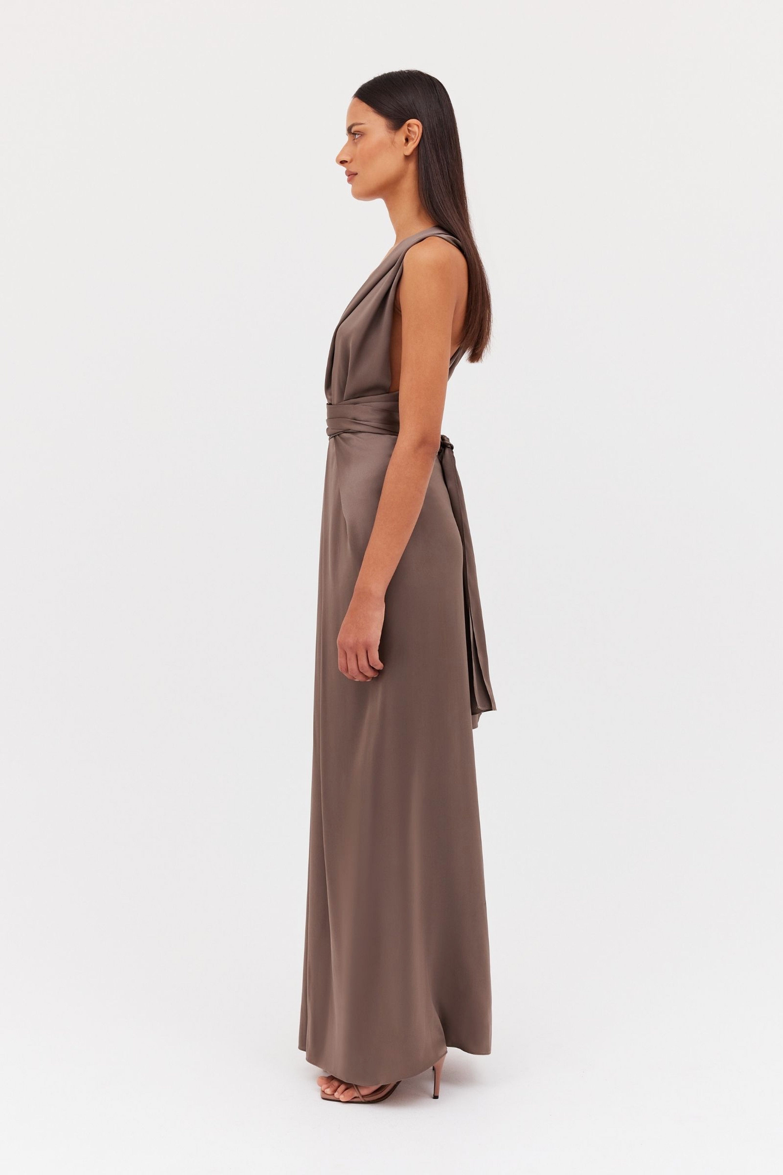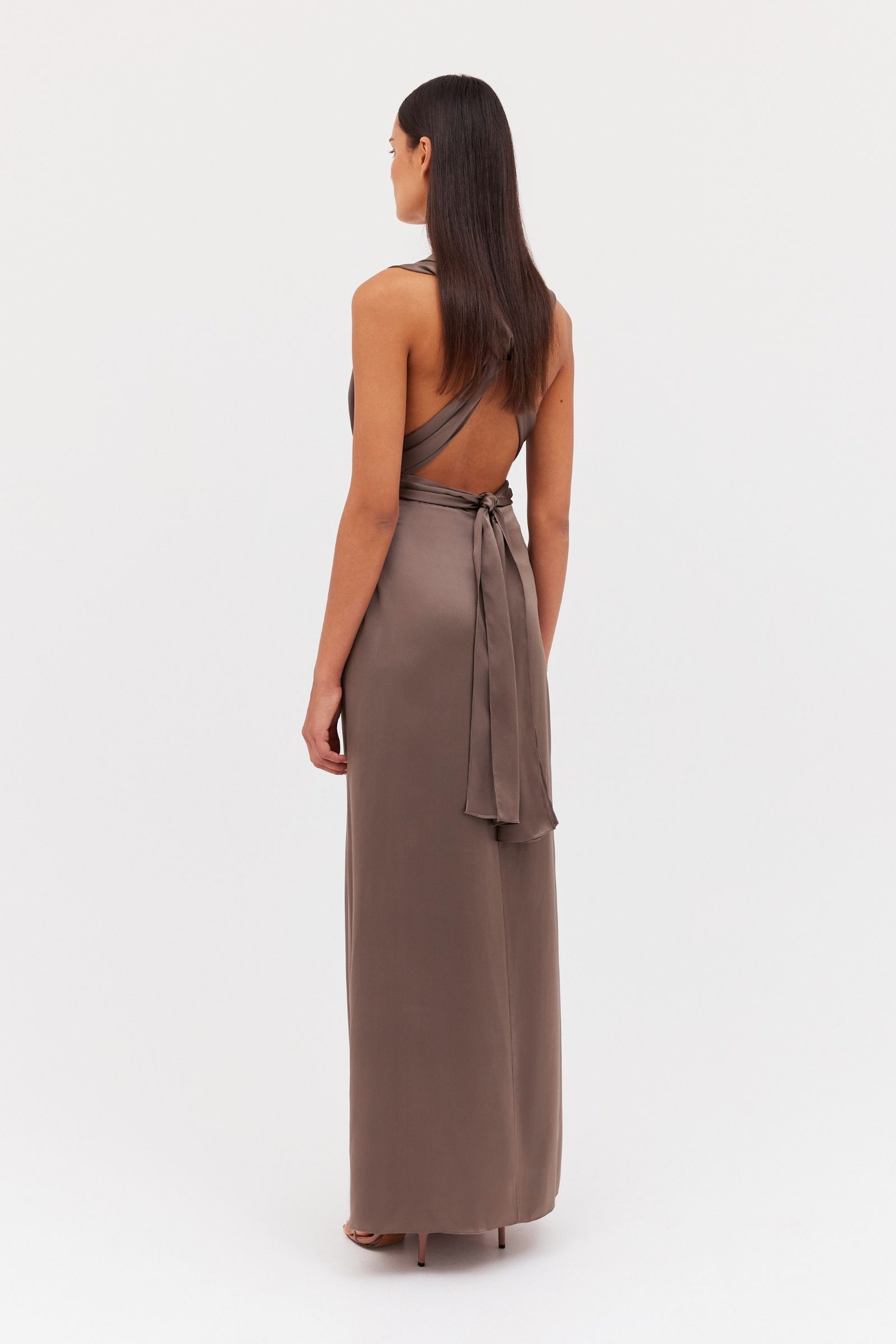 In sumptuous bronze satin this gown summons confidence with its deep plunge and luxurious silk that falls in the folds. A courageous, full-length piece with a carefully cinched waist that will leave you feeling empowered. Versatile and can be worn in a variety of ways.