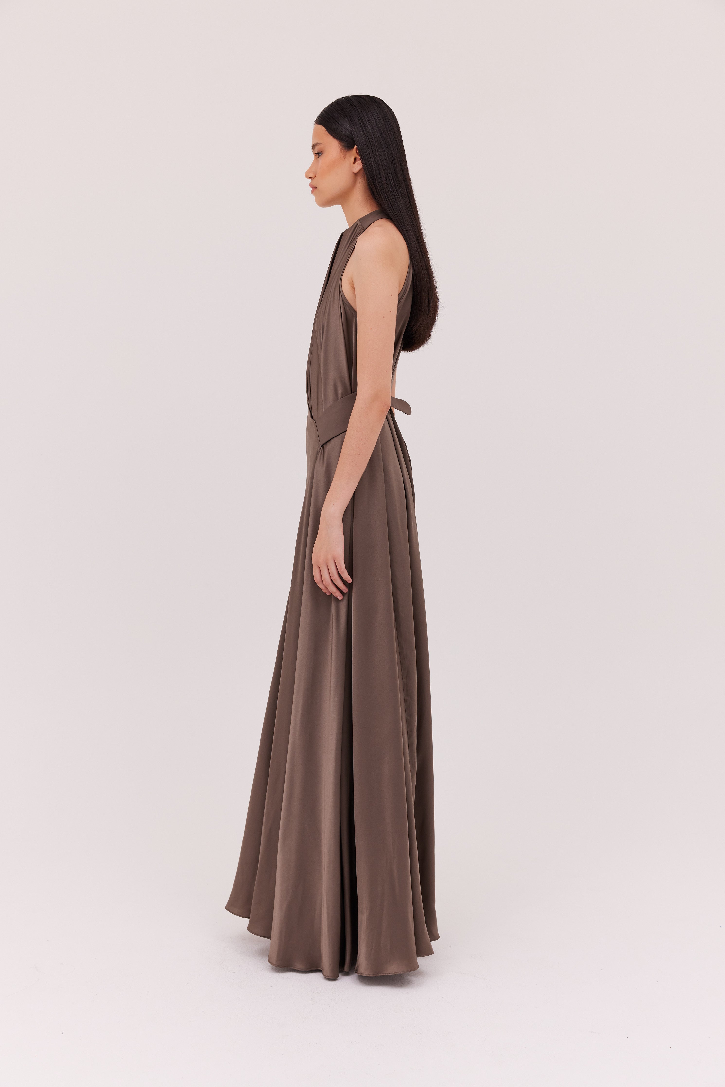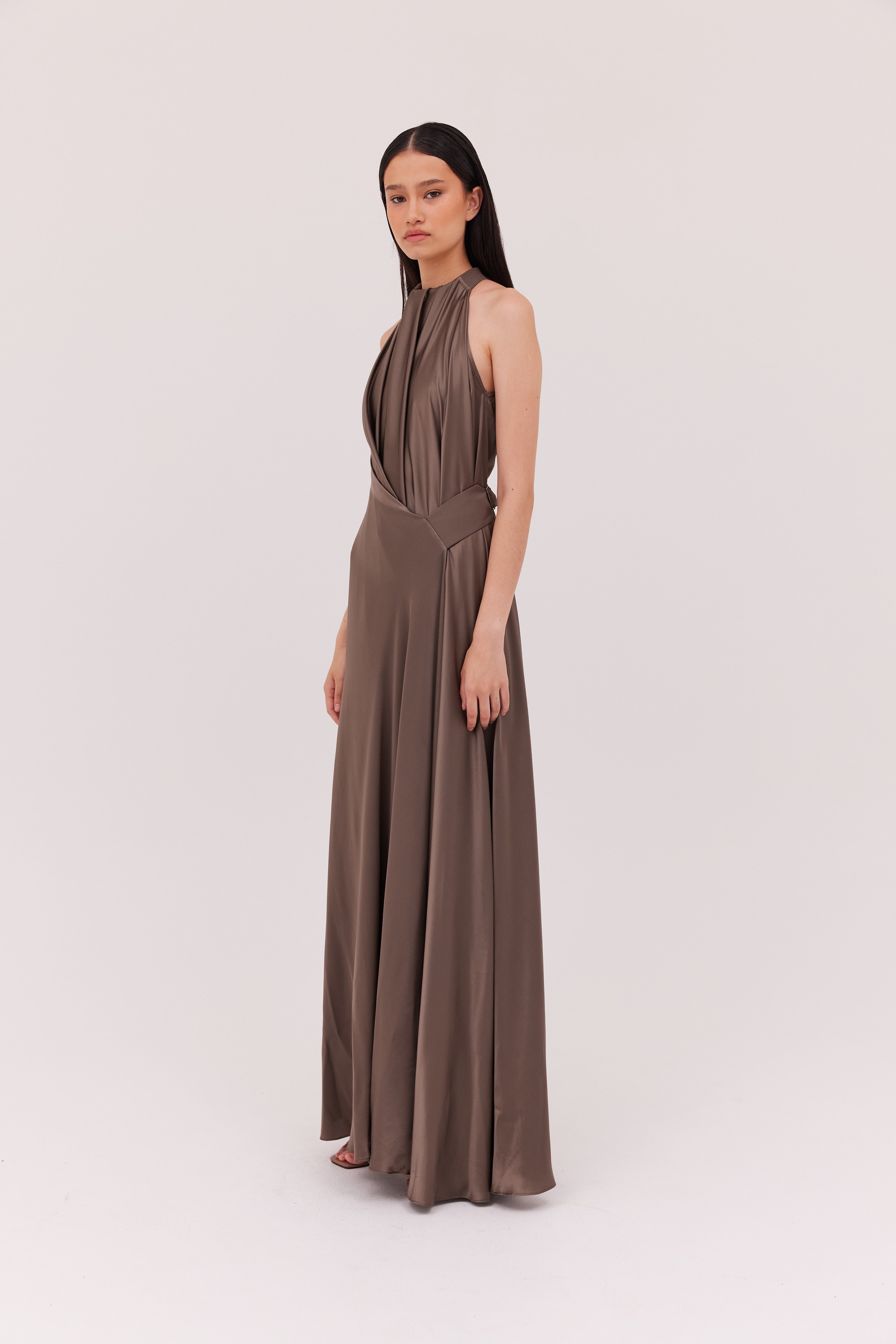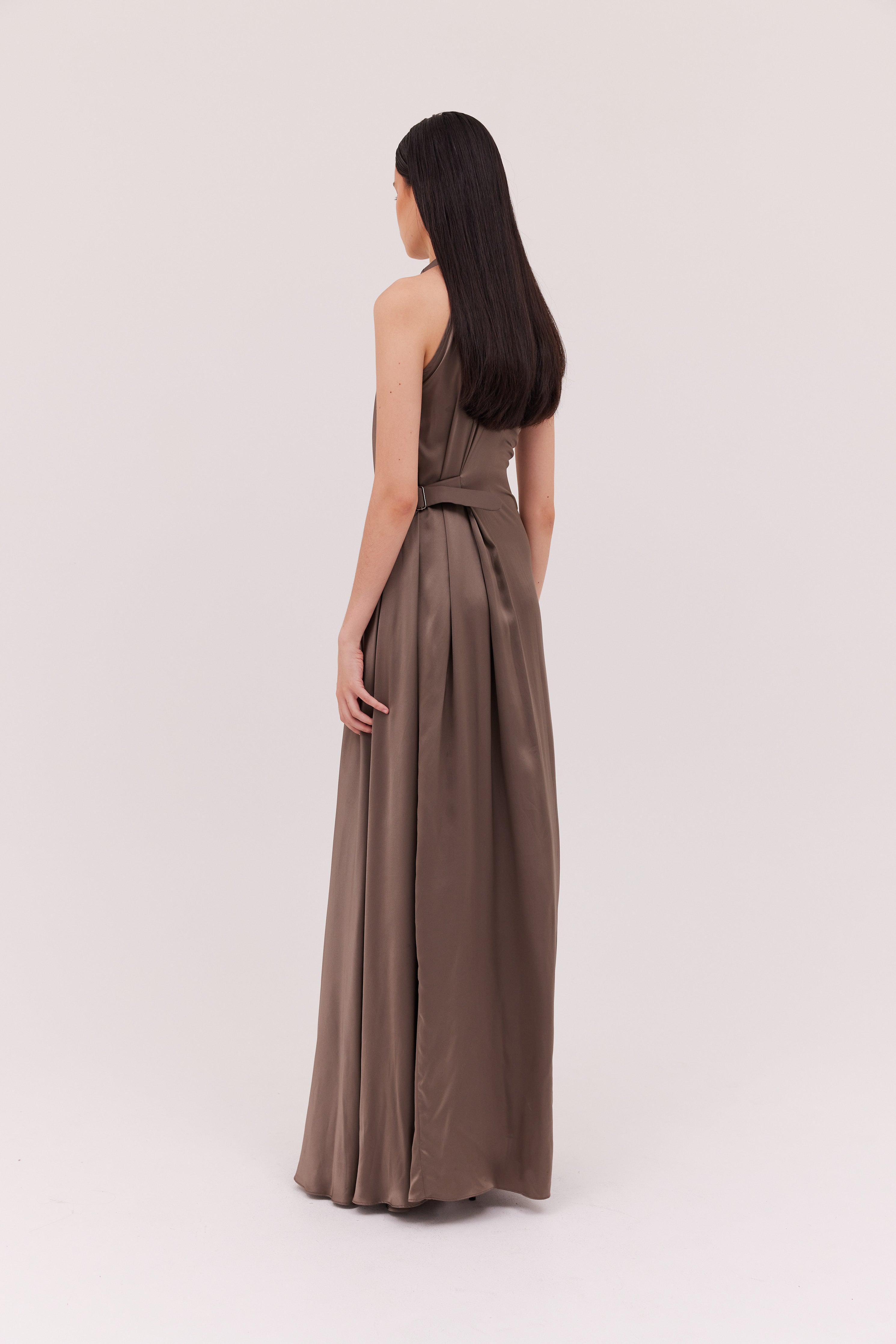 The Isabella Gown exudes glamour and sophistication. The gown is cut from lustrous Bronze silk satin and gracefully falls to the ground, skimming the body. It features a high neckline and a delicate side adjustable belt that cinches in at the waist, creating a stunning feminine silhouette.