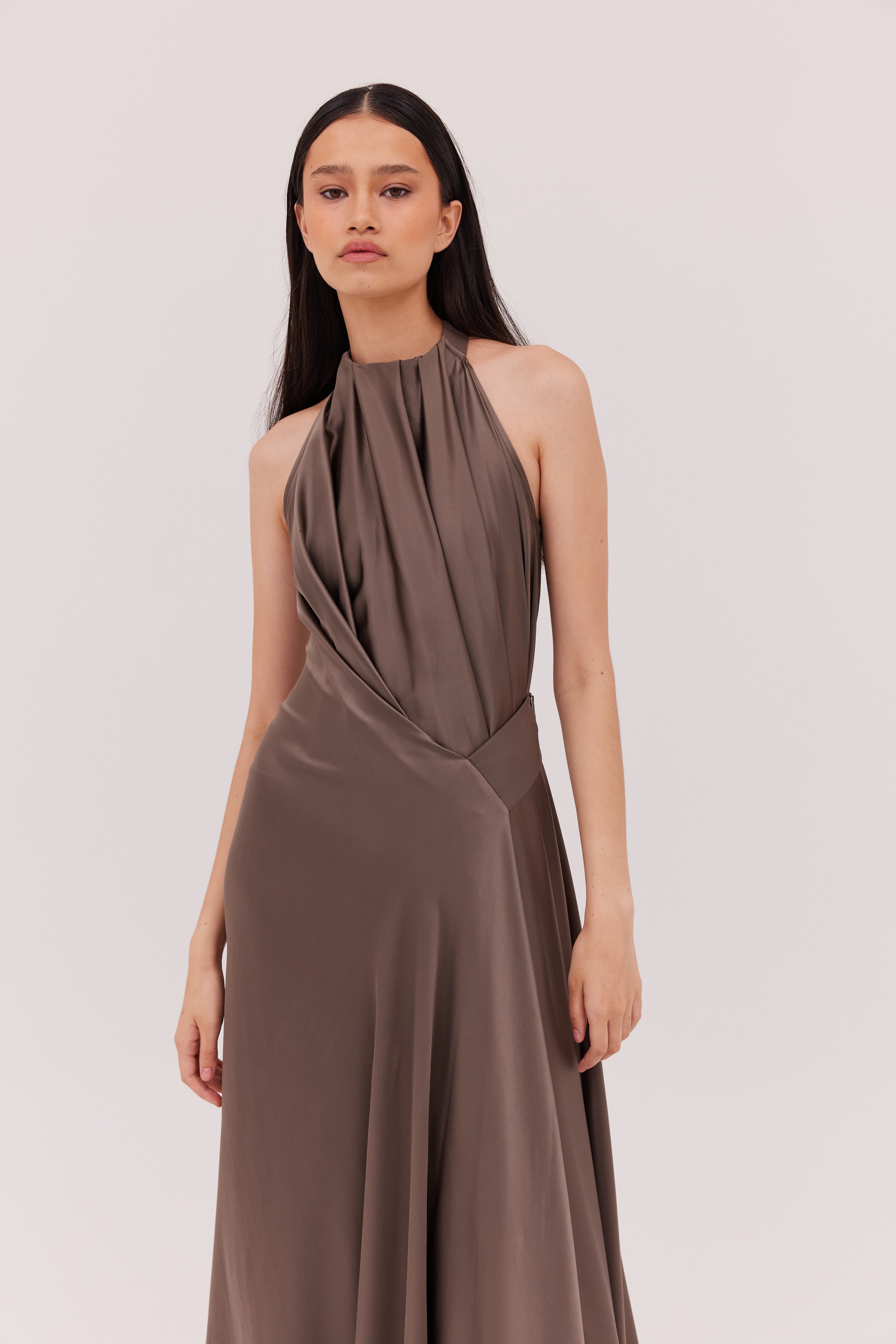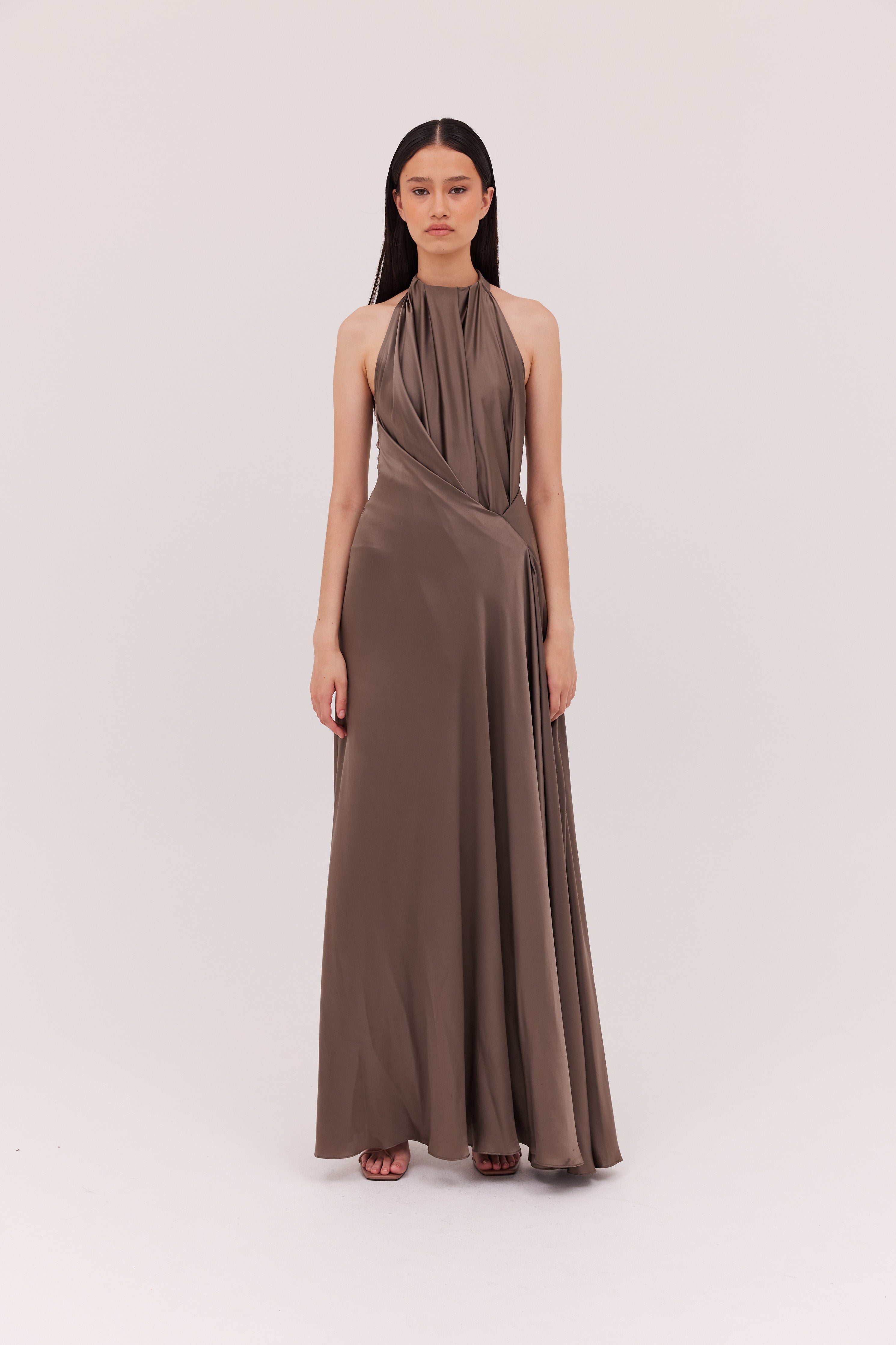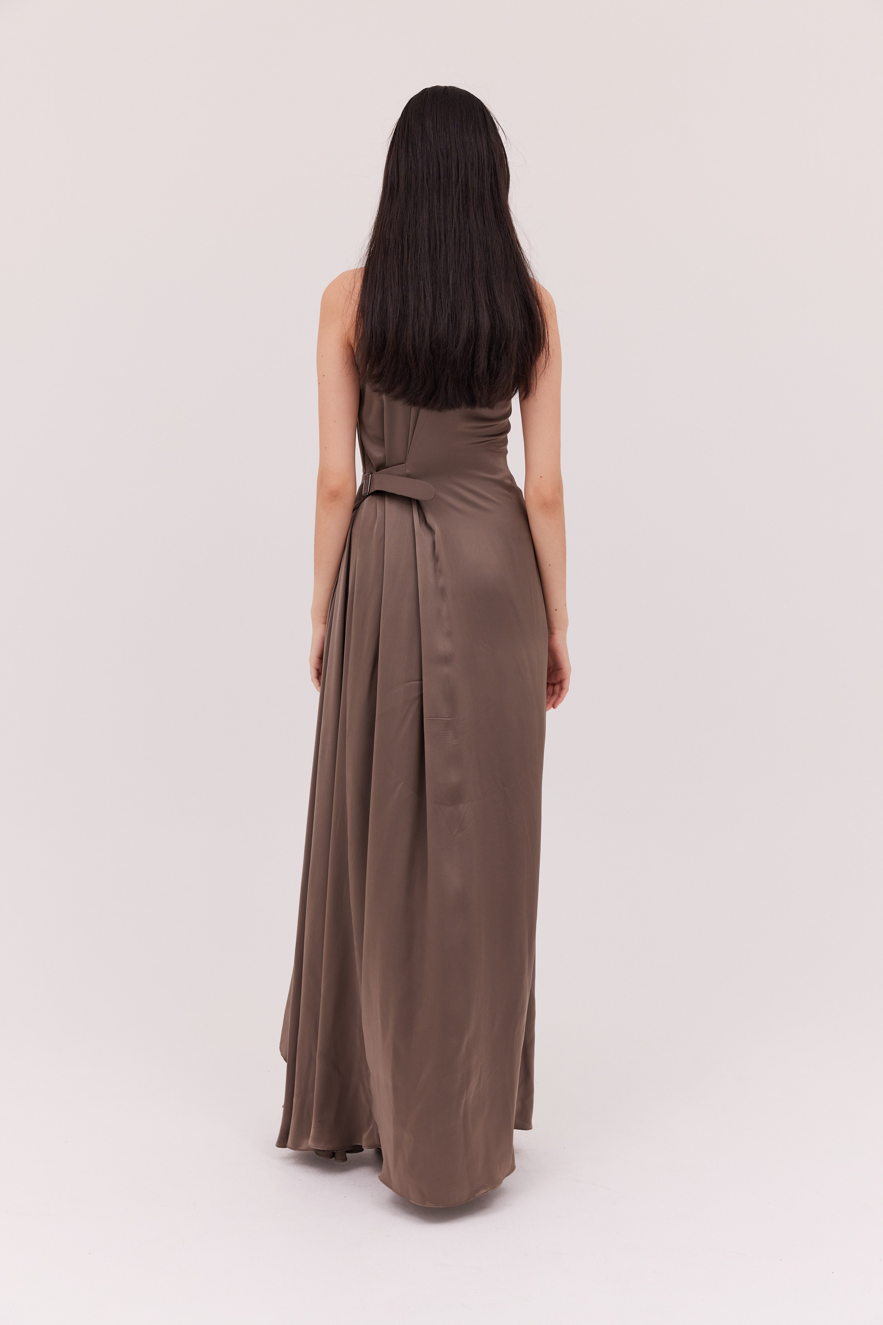 The Isabella Gown exudes glamour and sophistication. The gown is cut from lustrous Bronze silk satin and gracefully falls to the ground, skimming the body. It features a high neckline and a delicate side adjustable belt that cinches in at the waist, creating a stunning feminine silhouette.