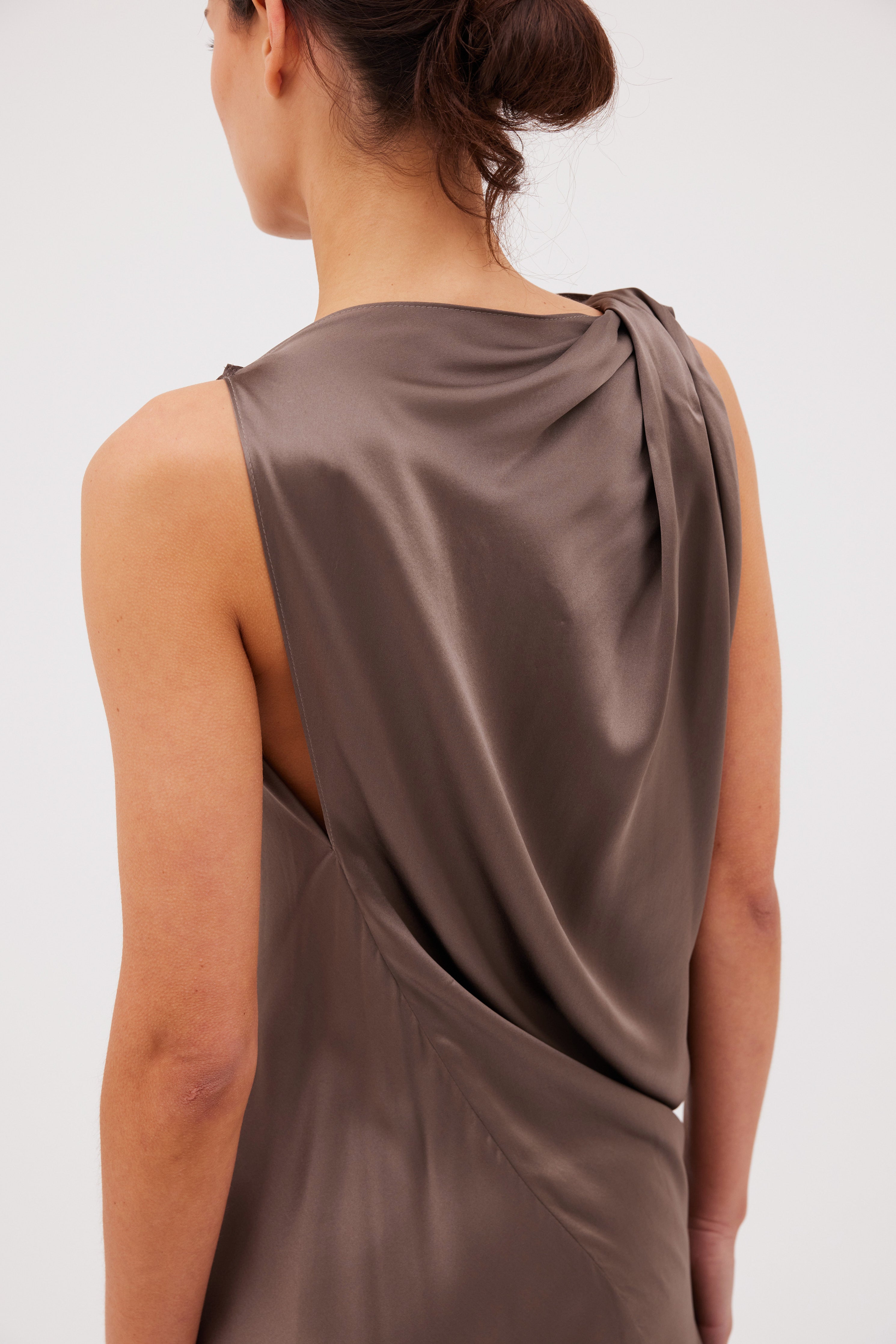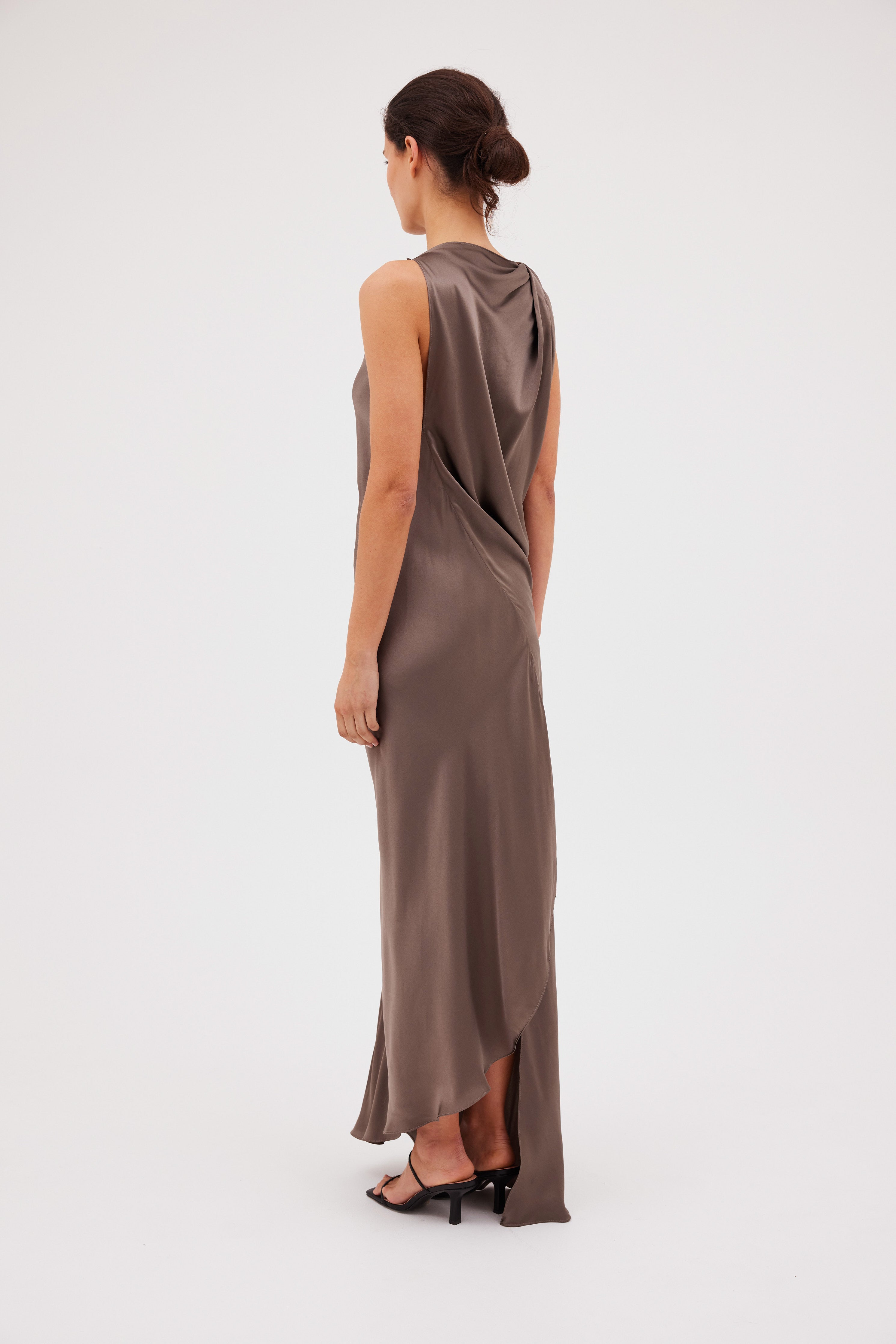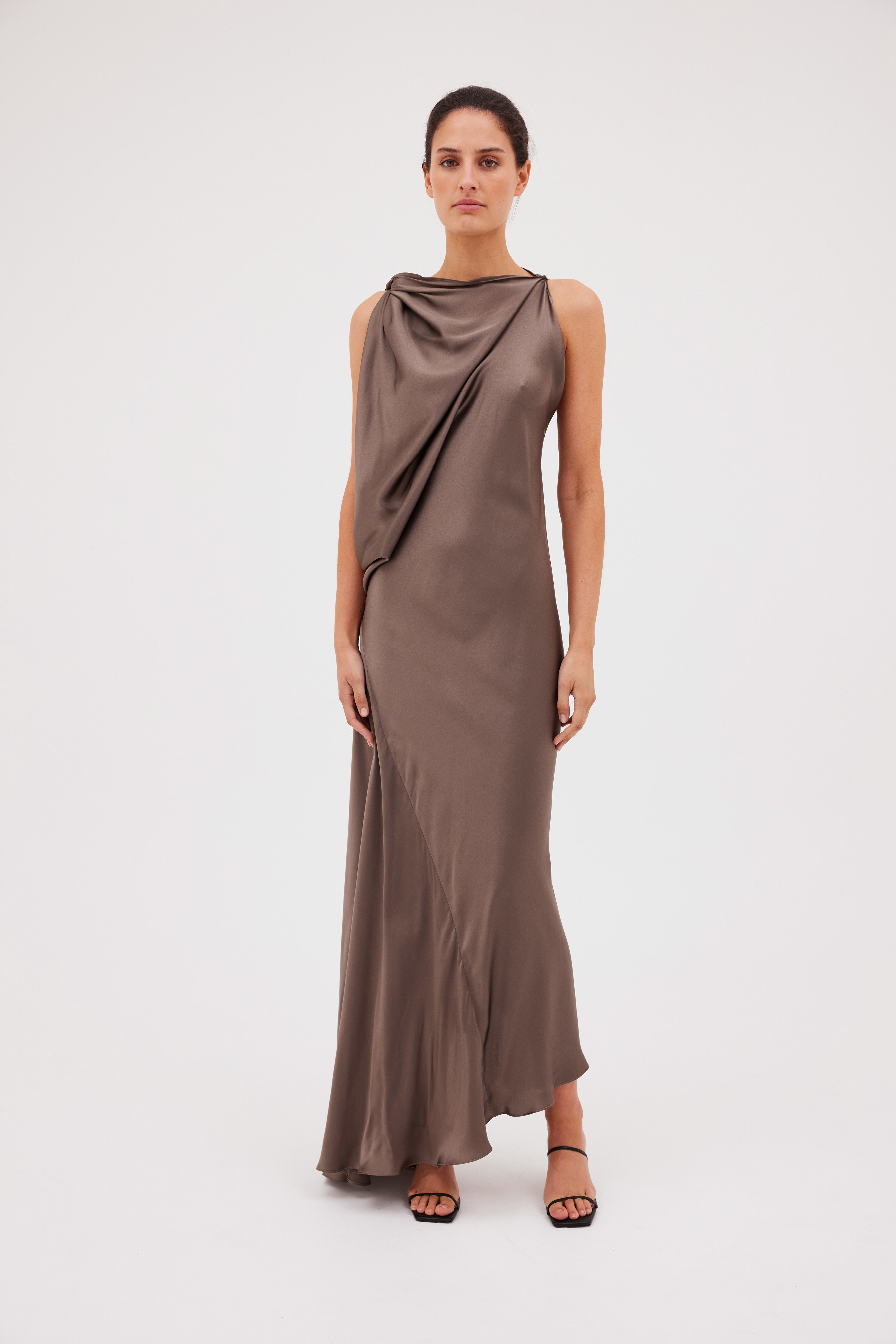 The Roma Gown is draped from a single length of cloth. Twisted and folded to accentuate and elongate the body, this stunning style is cut in our seasonless Bronze silk. With its draped bodice and contouring stitching across the skirt, the Roma Gown is an unforgettable piece. It is a reversible style that can be worn either way.