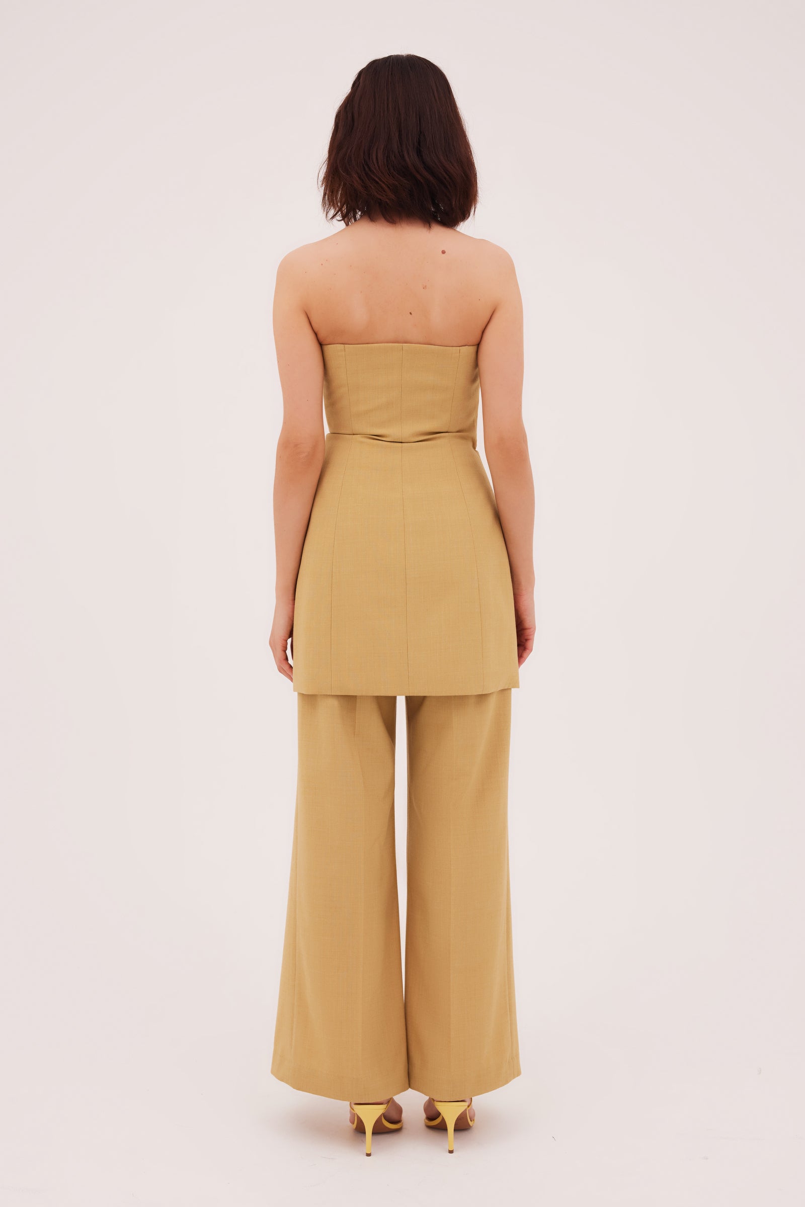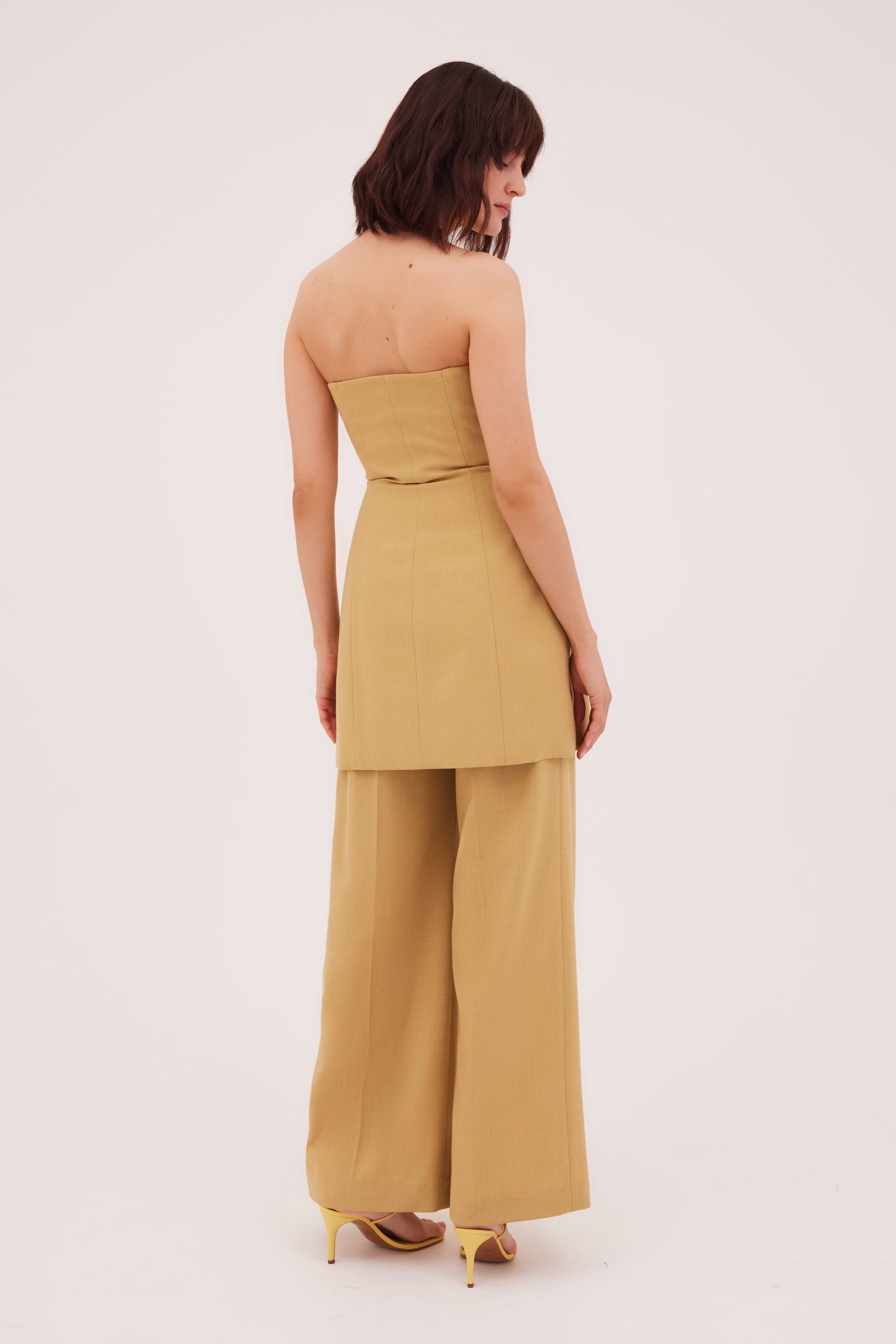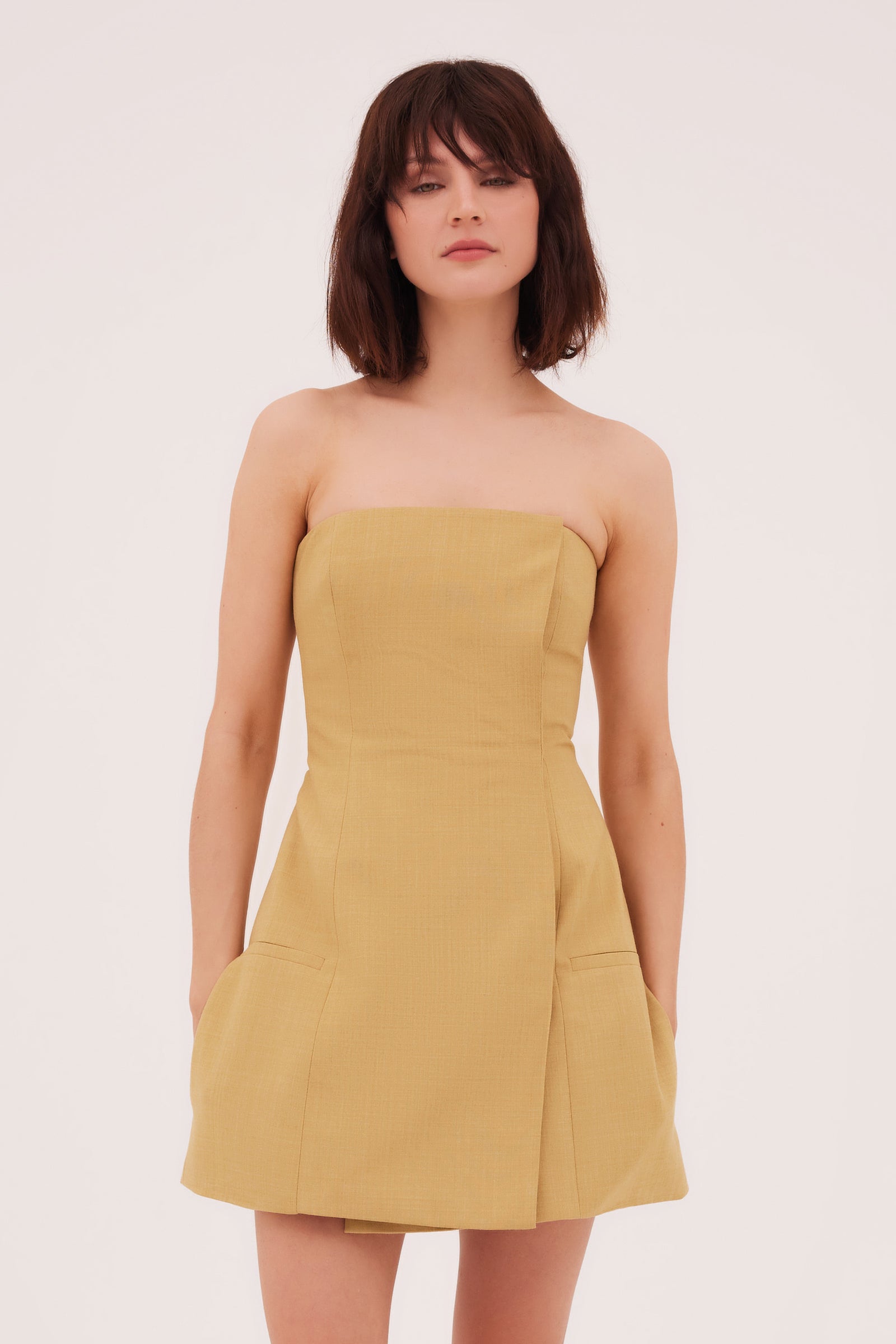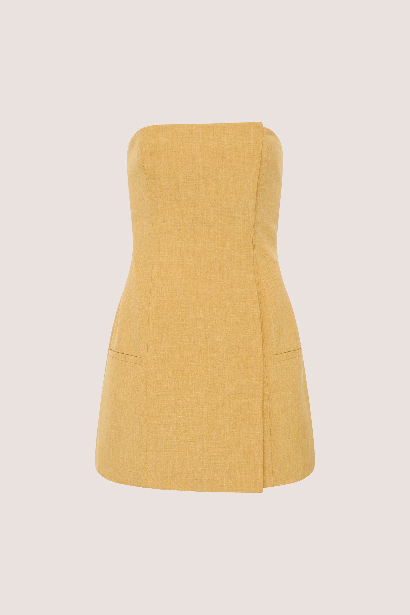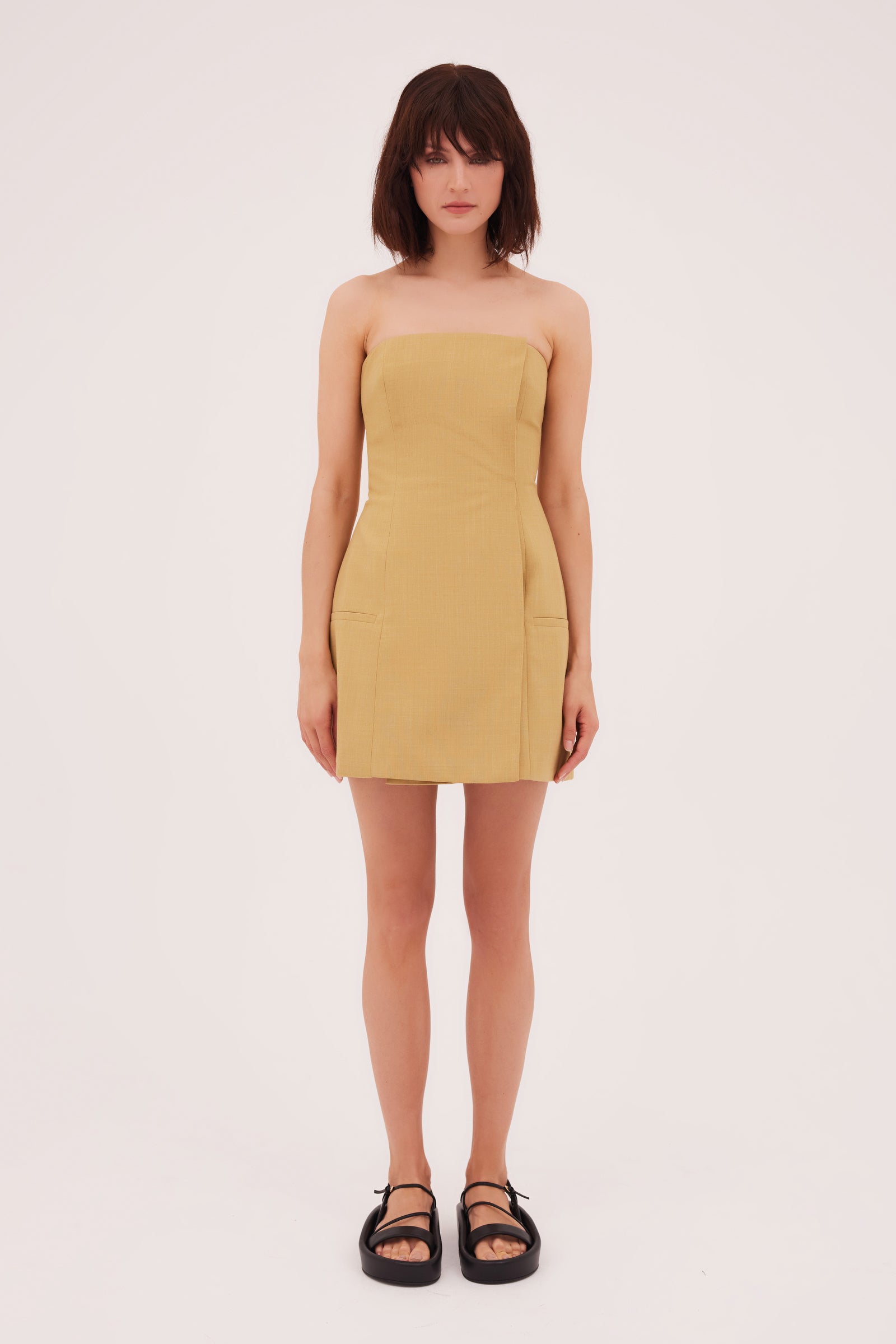 Simplistic Tailoring for the perfect strapless mini dress this Summer. The Moss Mini in Clay Suiting plays on proportions with the mini length, an overlap front panel fold creates dimension. Style down with flat sandals or pair with our matching Clay Suiting Procession Pant for an outfit.