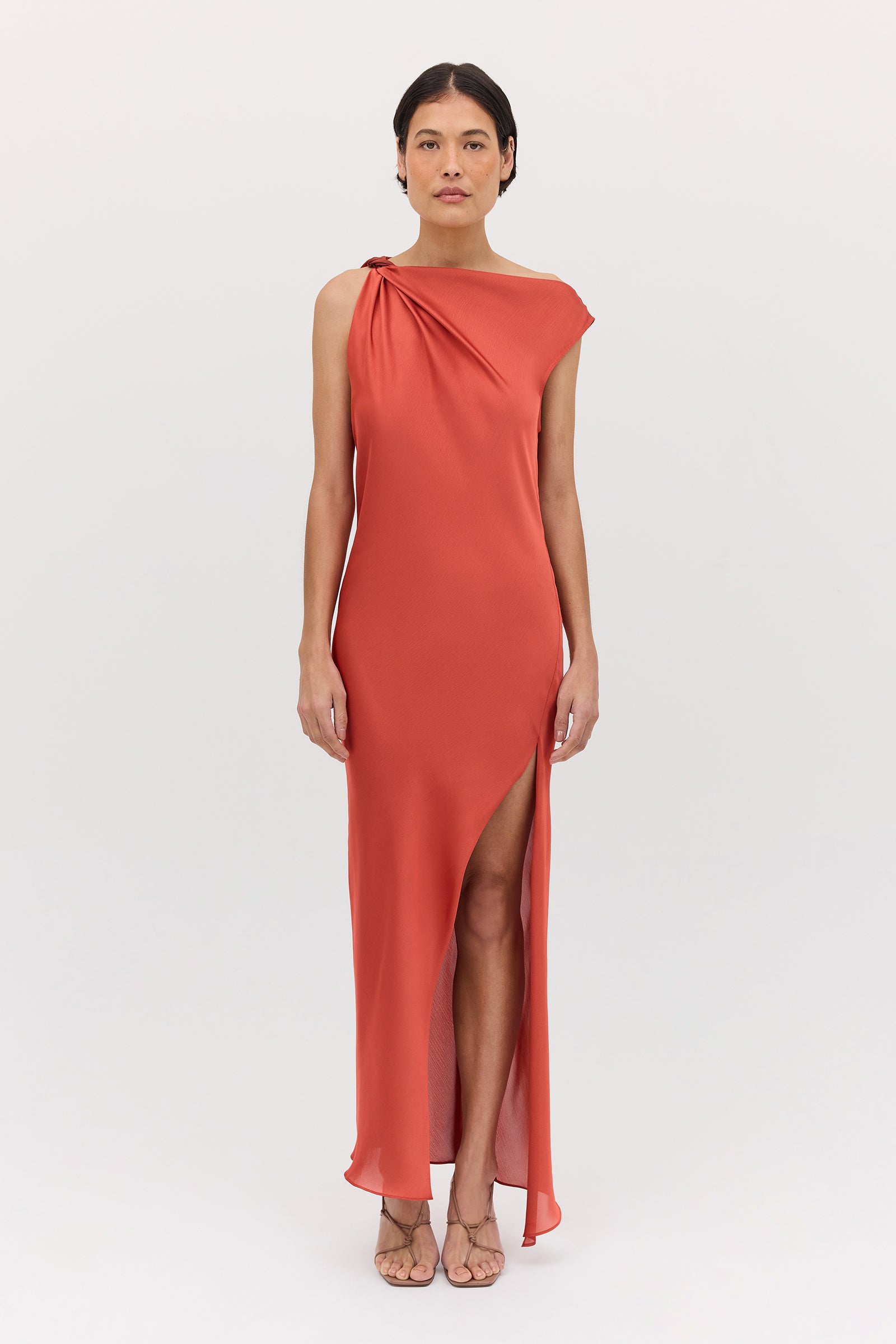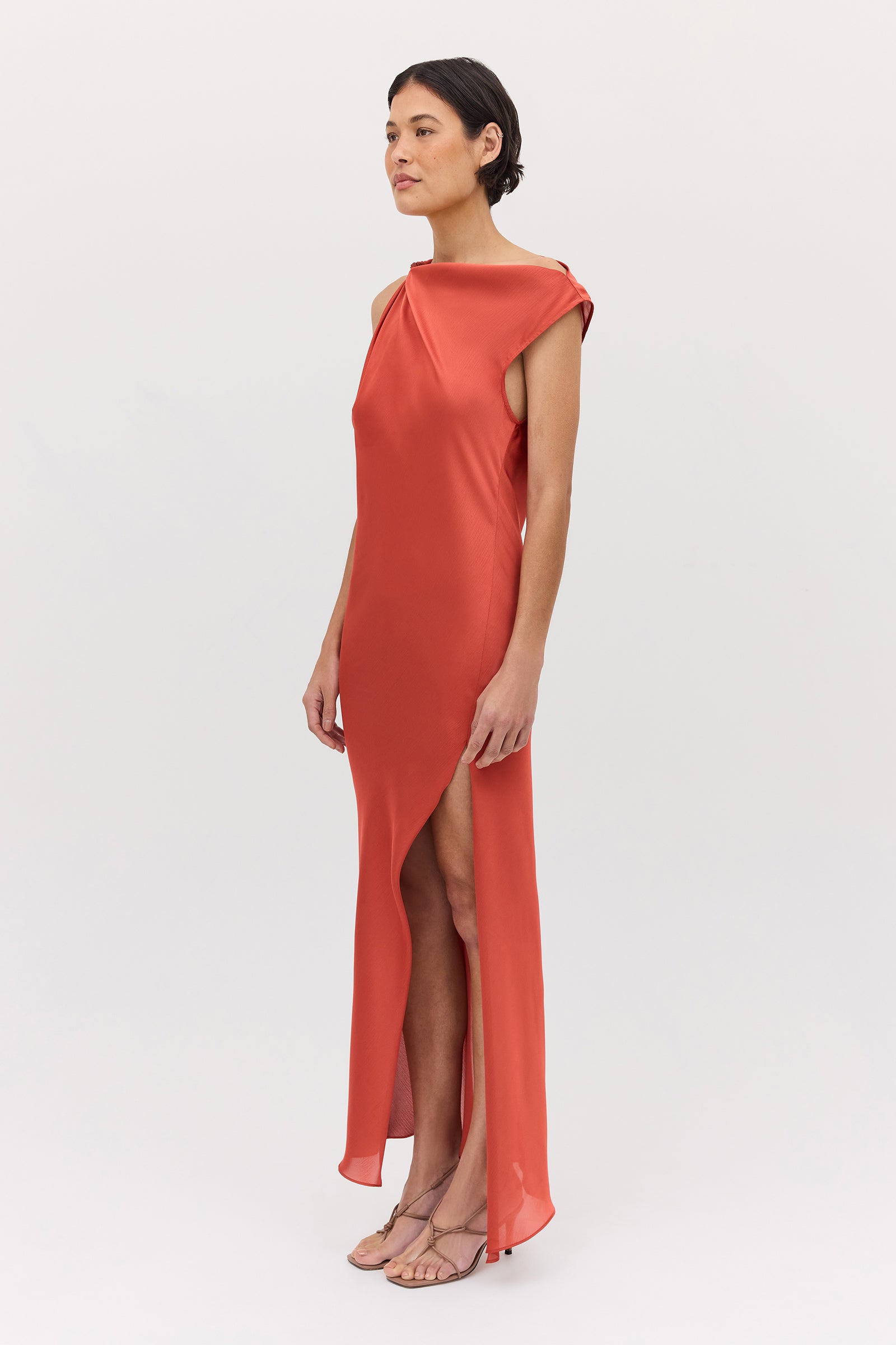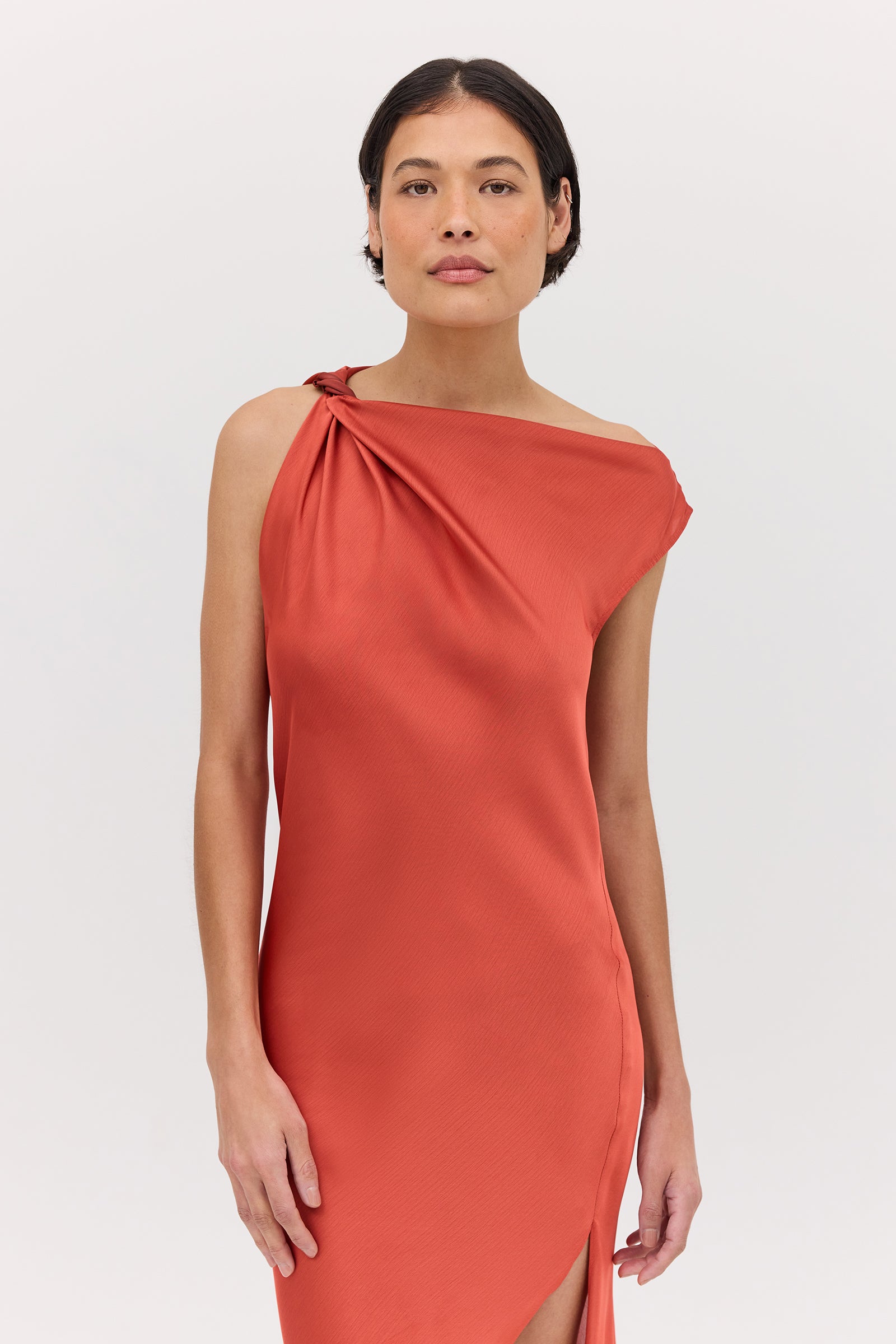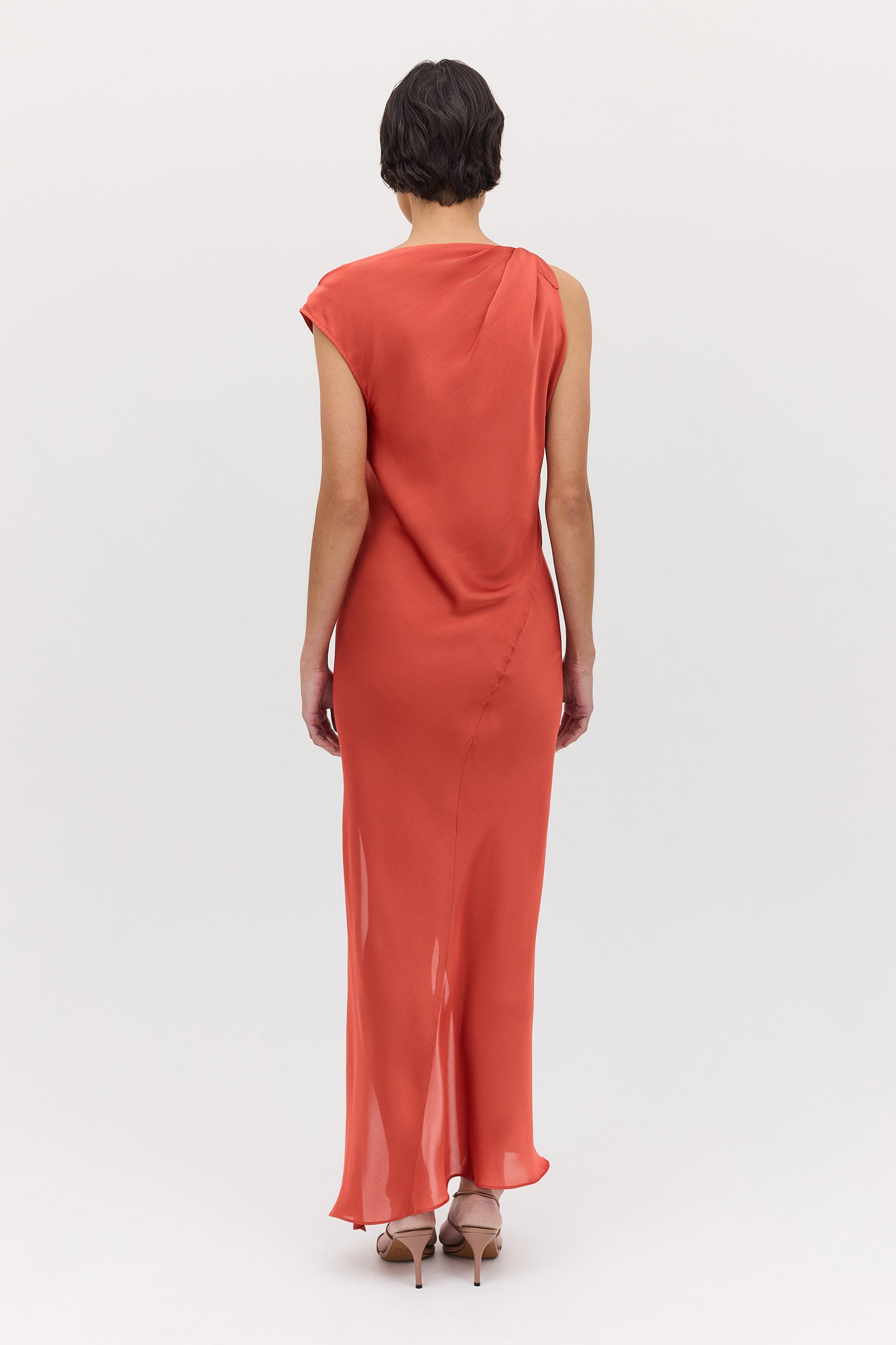 Introducing the Form Dress, inspired by our highly-coveted Yang Top. The Form Dress features a fluidly draped column silhouette, balanced by the structural yet delicate asymmetrical twist detailing at the shoulder. Cut to mid-thigh to allow ease of movement and a sense of air. Cut from a lightweight, vibrant Coral Chiffon that evokes the feeling of wearing a slip. The fabric has a soft-hand, silken feel and is machine washable for easy care.