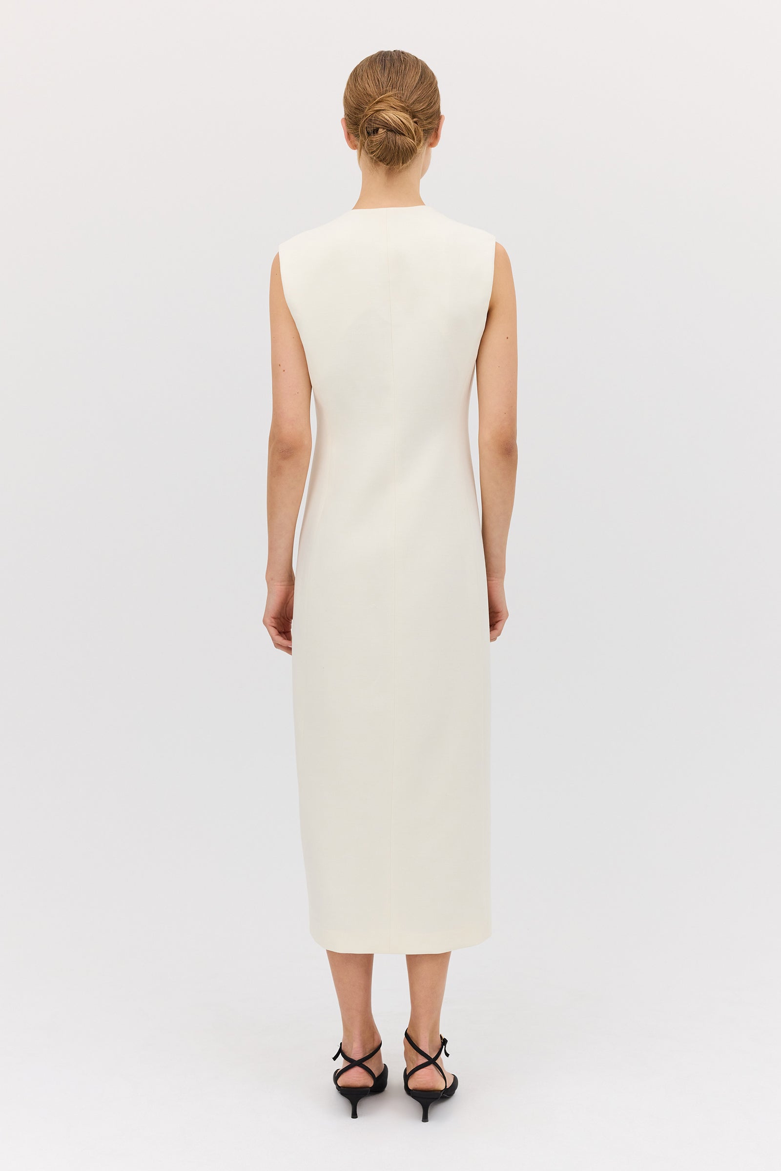 A languid sense of ease, balanced by sculptural tailoring. Introducing the Cream Wool Interlude Dress. Crafted from soft, lightweight wool suiting this midi-length, column dress subtly follows the form of the body, featuring precisely moulded tucks at the waist, echoing the soft touch of a hand. A delicate wrap front envelops, whlist an asymmetric tortoiseshell button secures, adding the final detail.