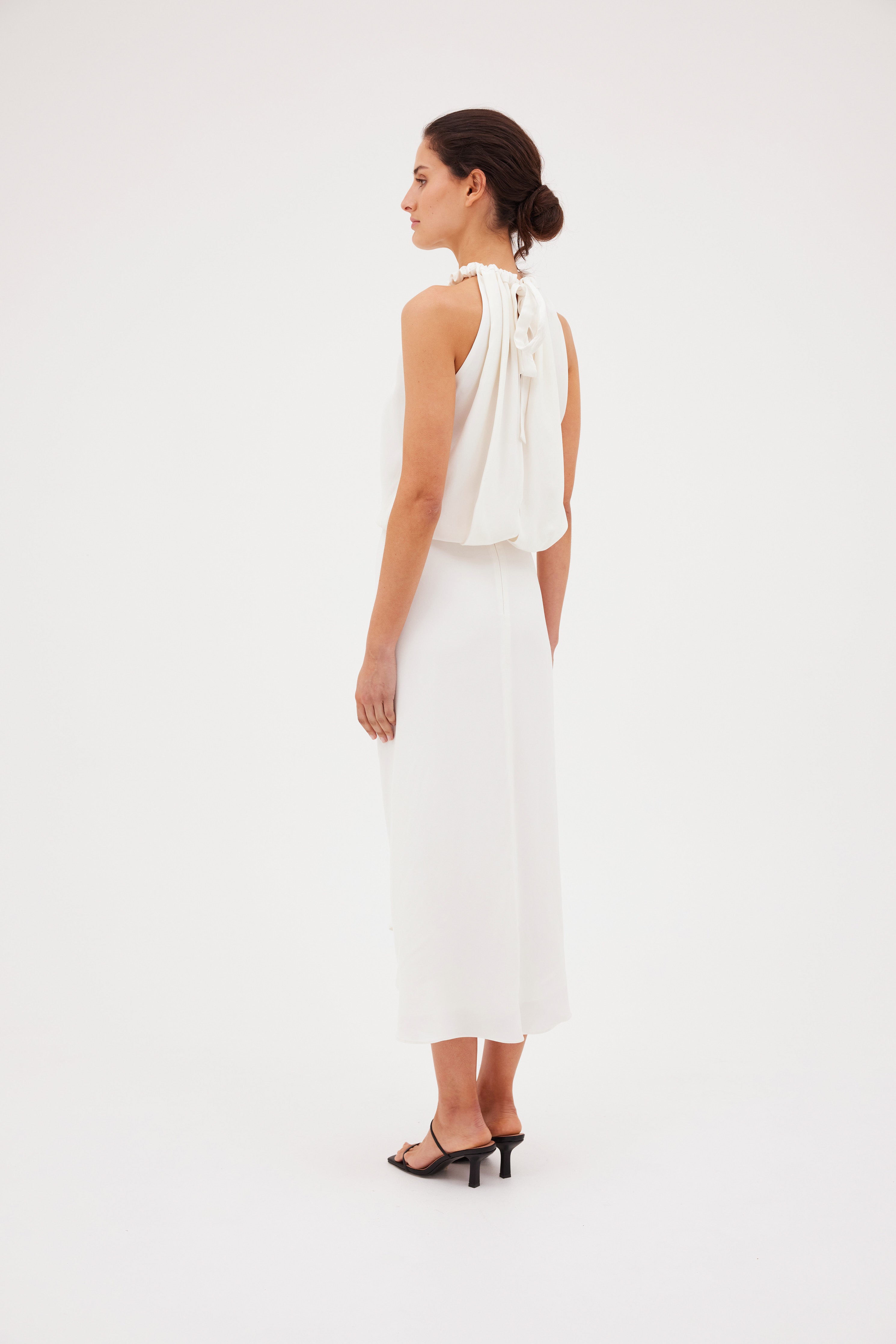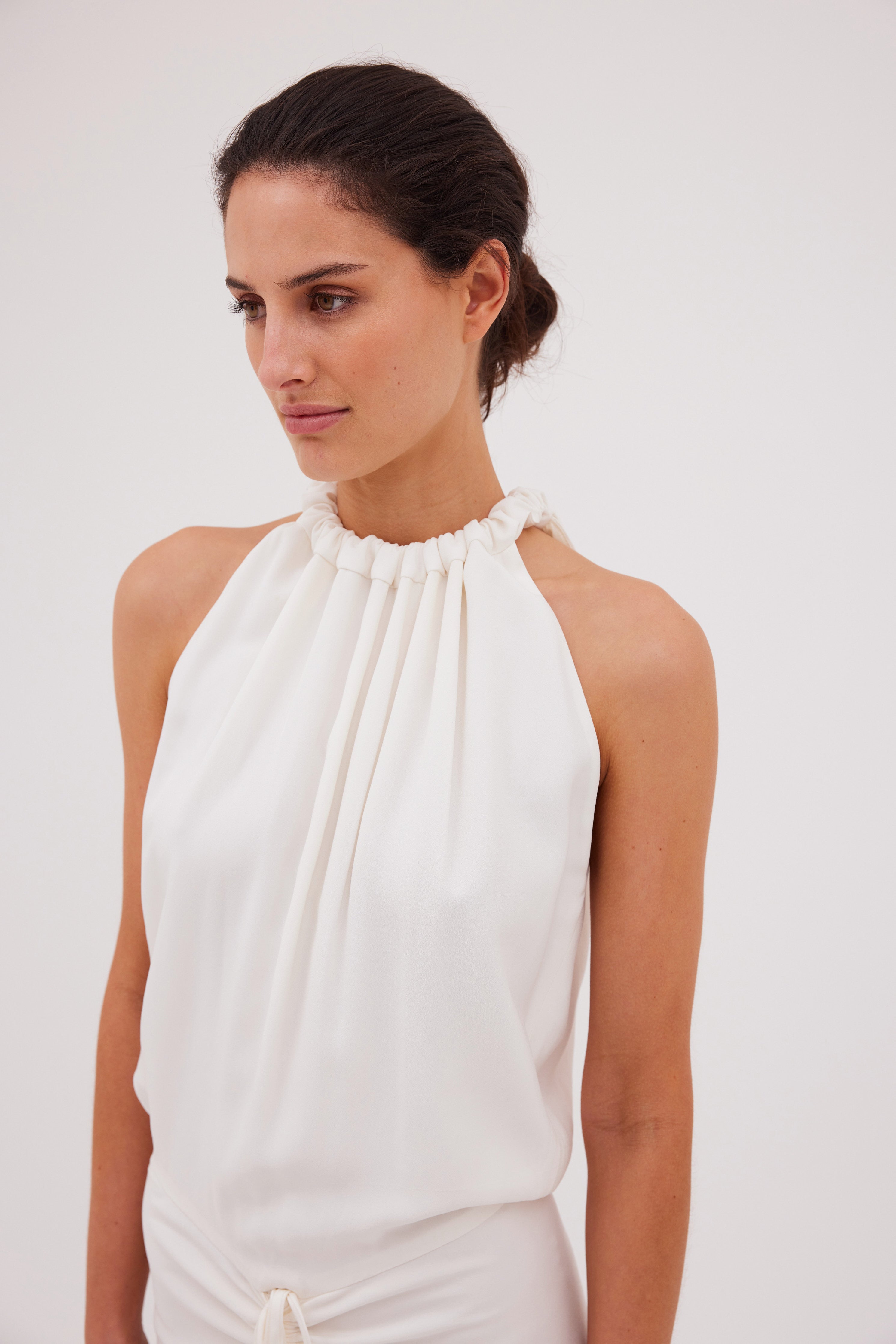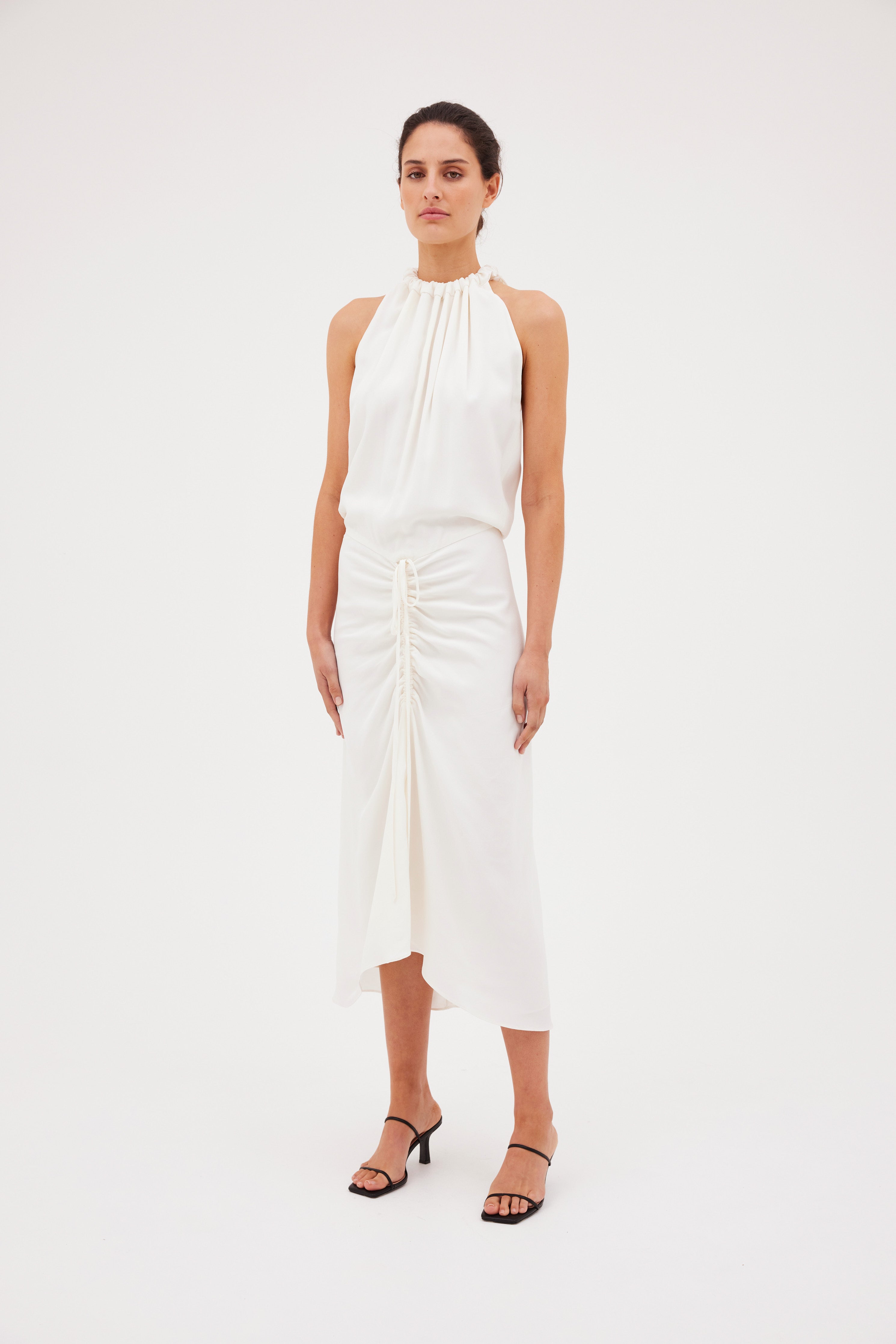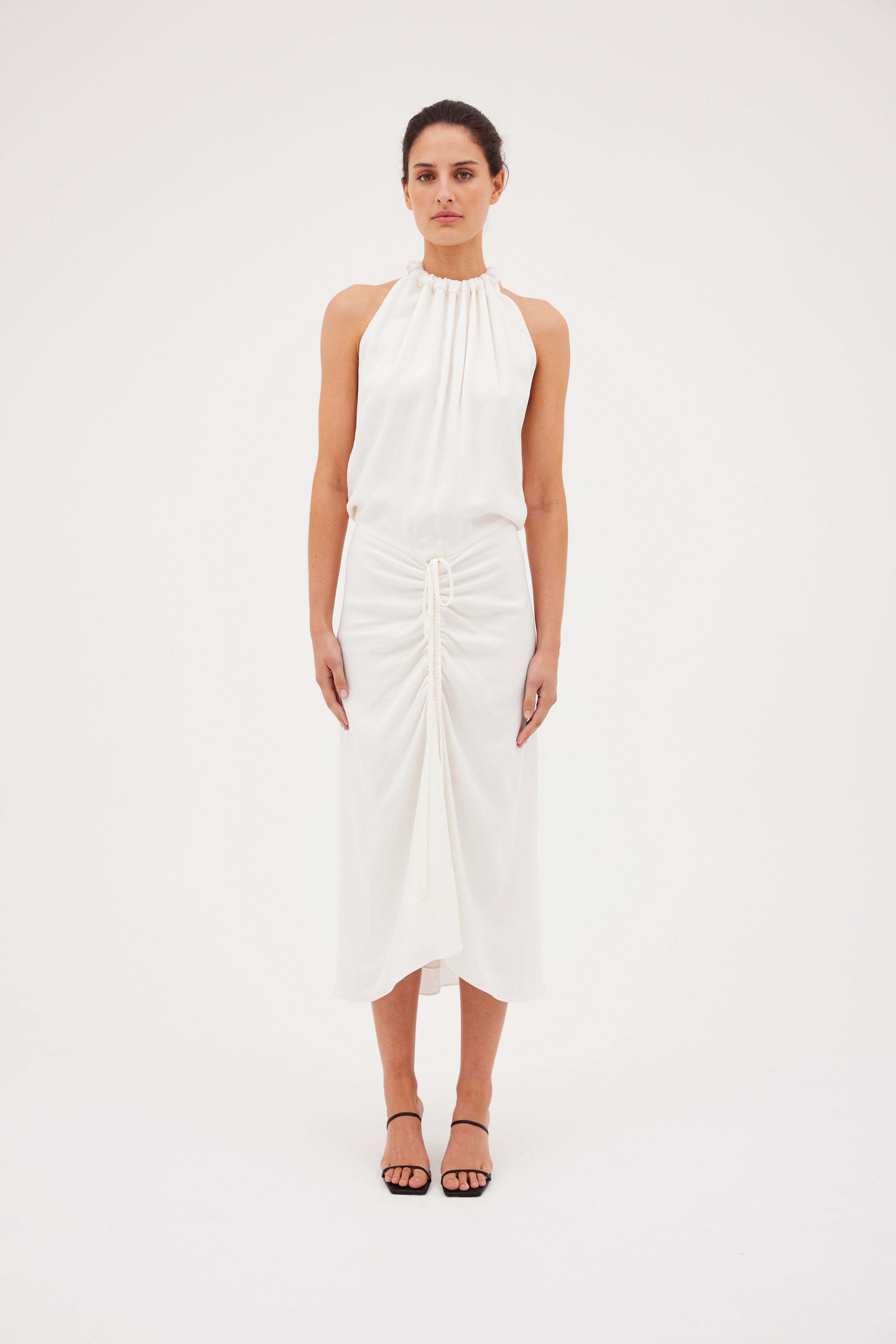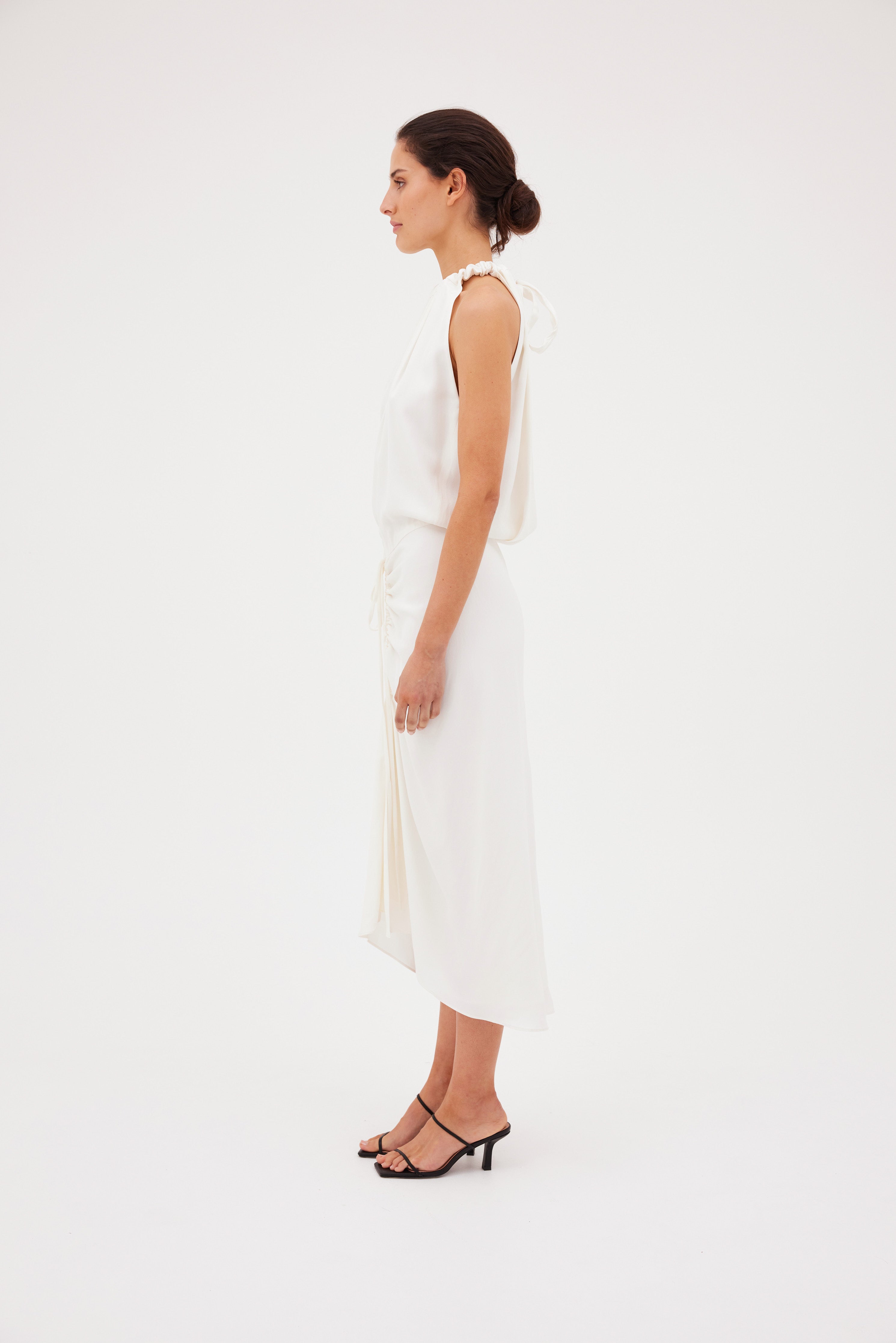 Carefree sophistication. The Majorca Dress - cut in gorgeous Ivory Satin Crepe - is a testament to gentle movement. Accentuated by a central gather and ruched halter neckline, the Majorca dress enthrals and captivates.