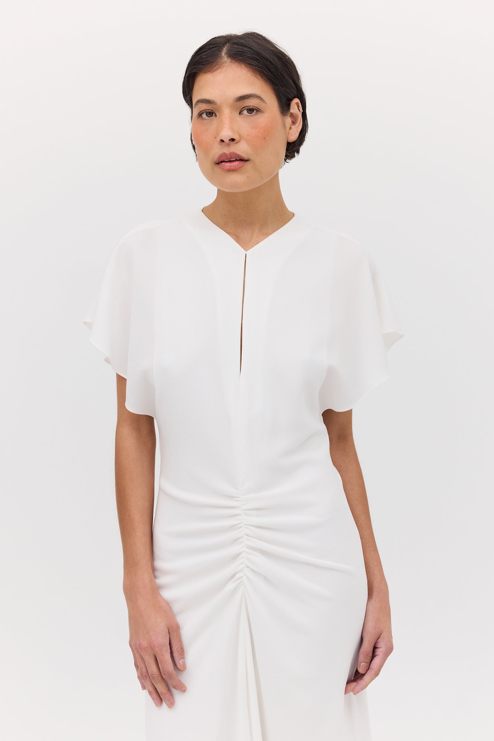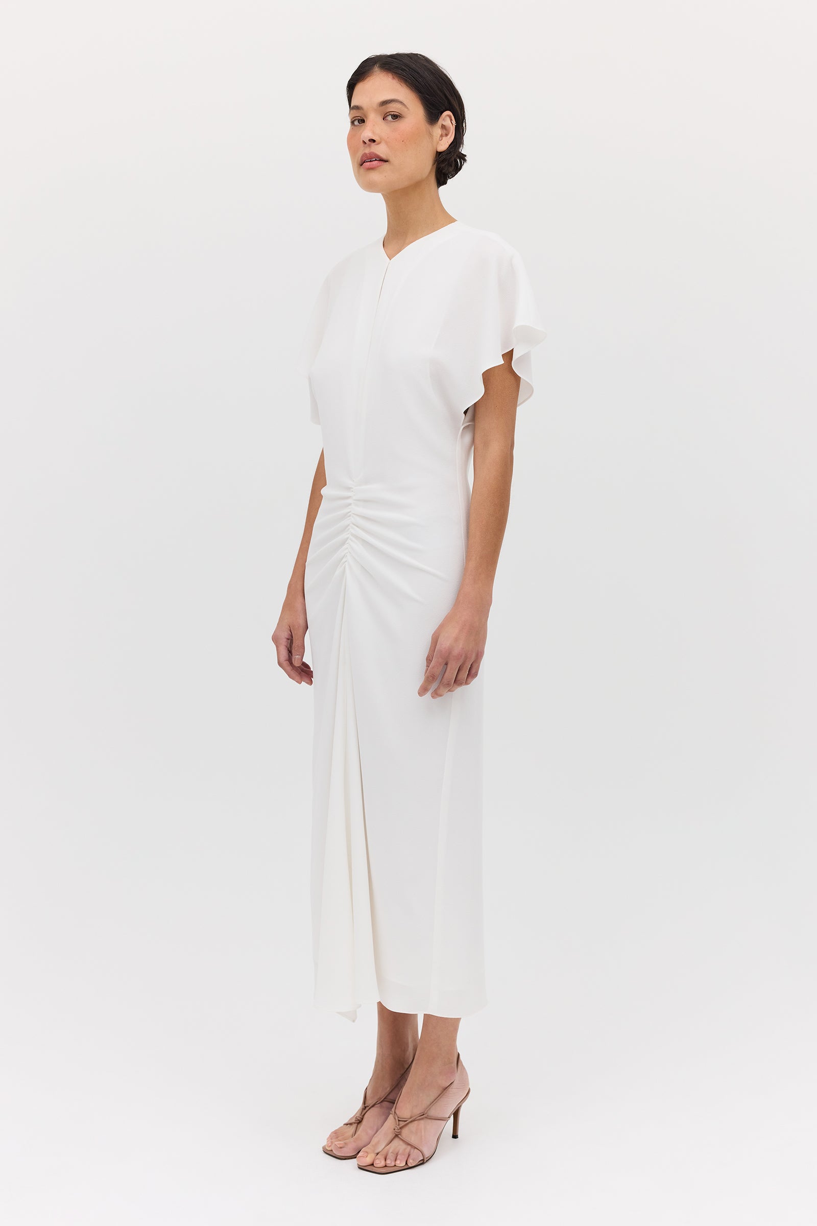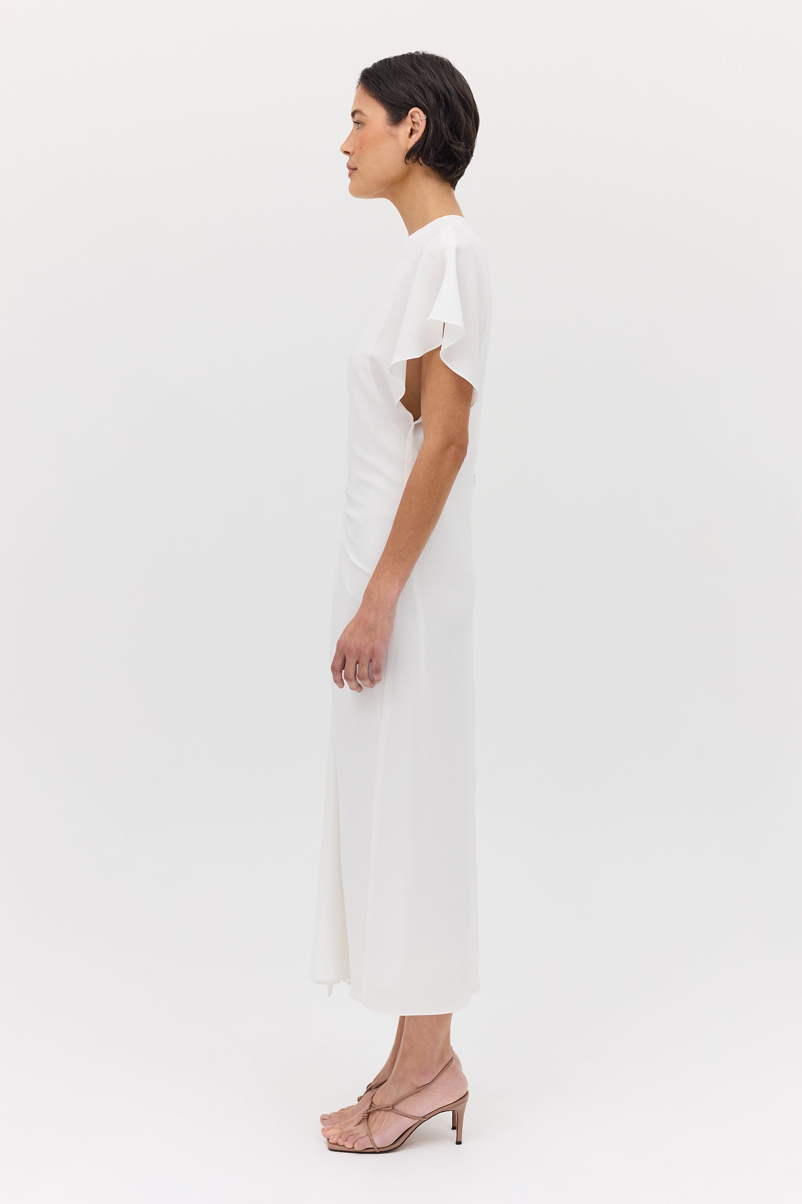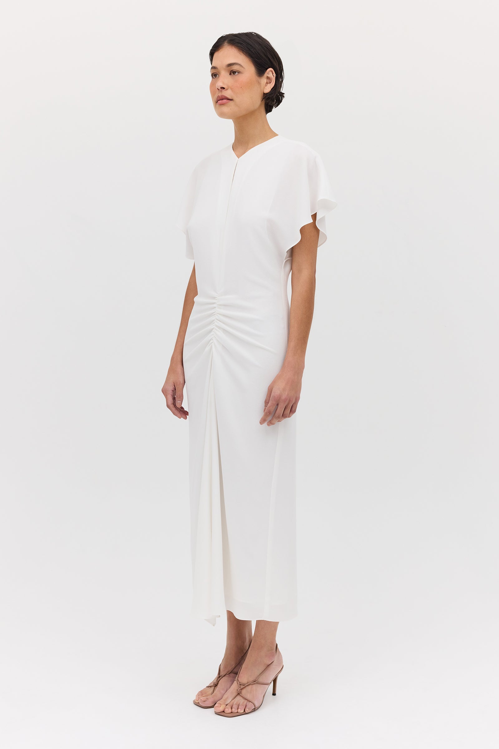 Introducing the Ivory Textured Yayoi Dress. Taking inspiration from design elements of some of our most-loved dresses and combining into one. The Yayoi Dress features a draped flutter sleeve similar to that of our Illusionist Dress, and a gathered, making it a chic and versatile addition to your wardrobe. Expertly hand-draped and fitted, with a focus on highlighting the form of the body.